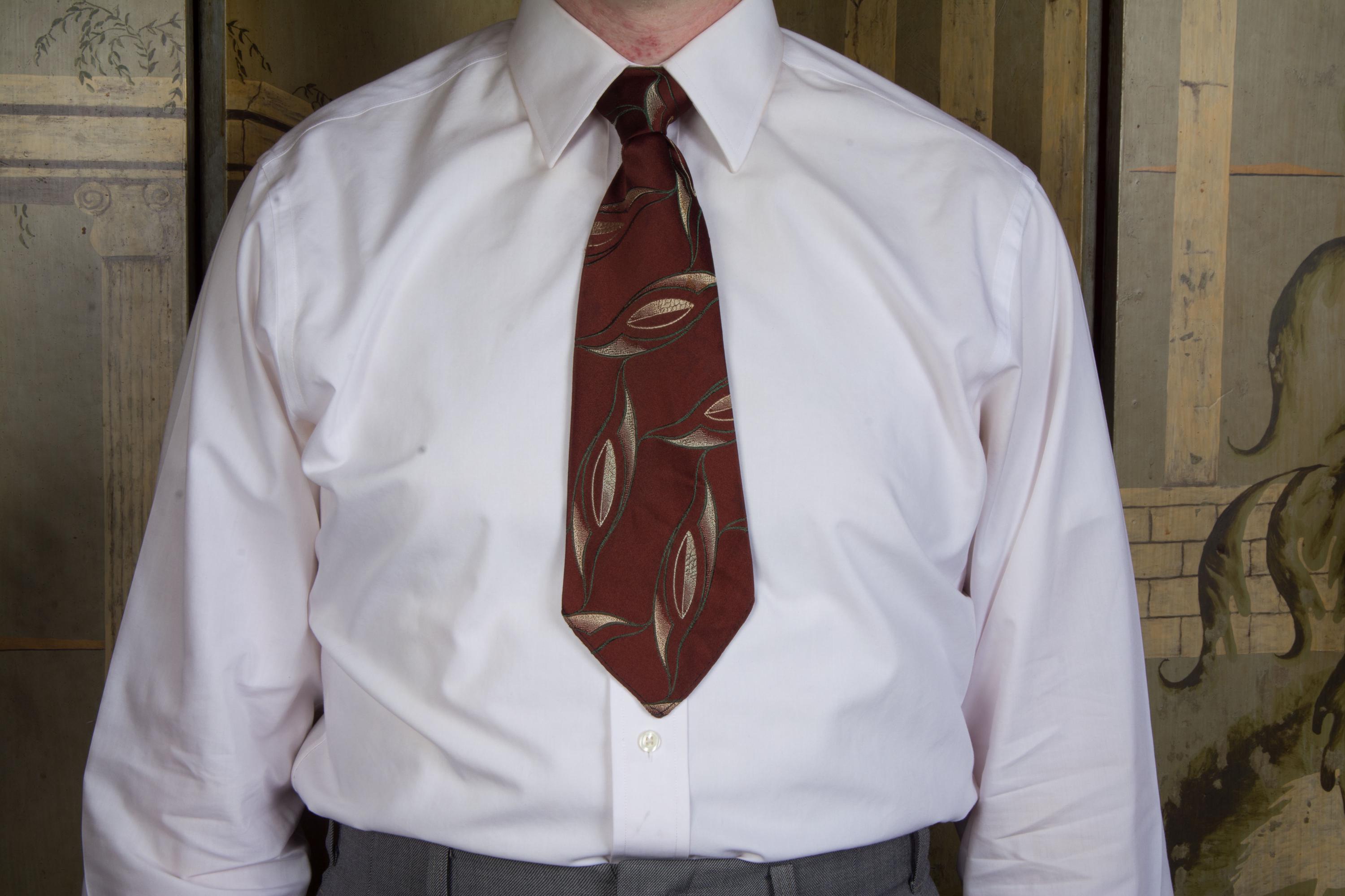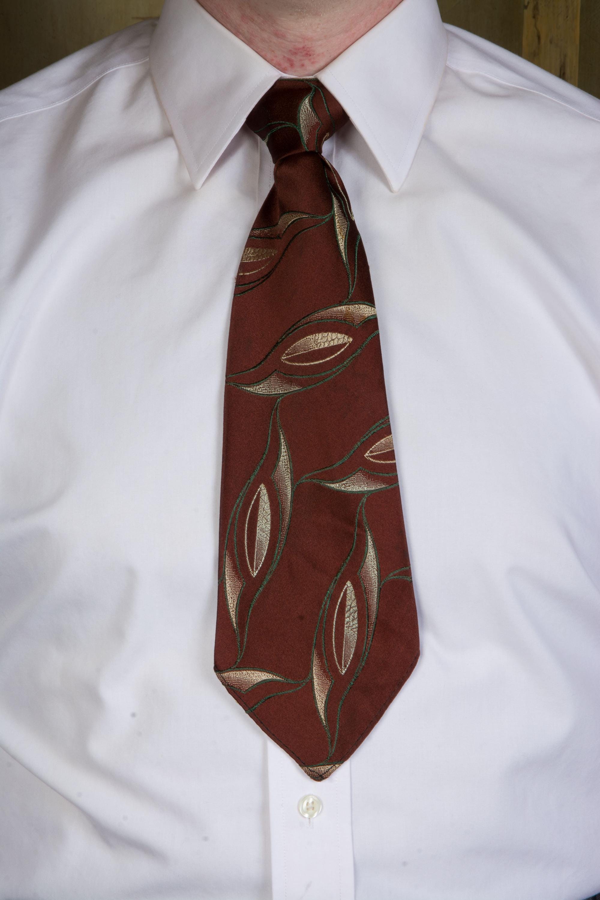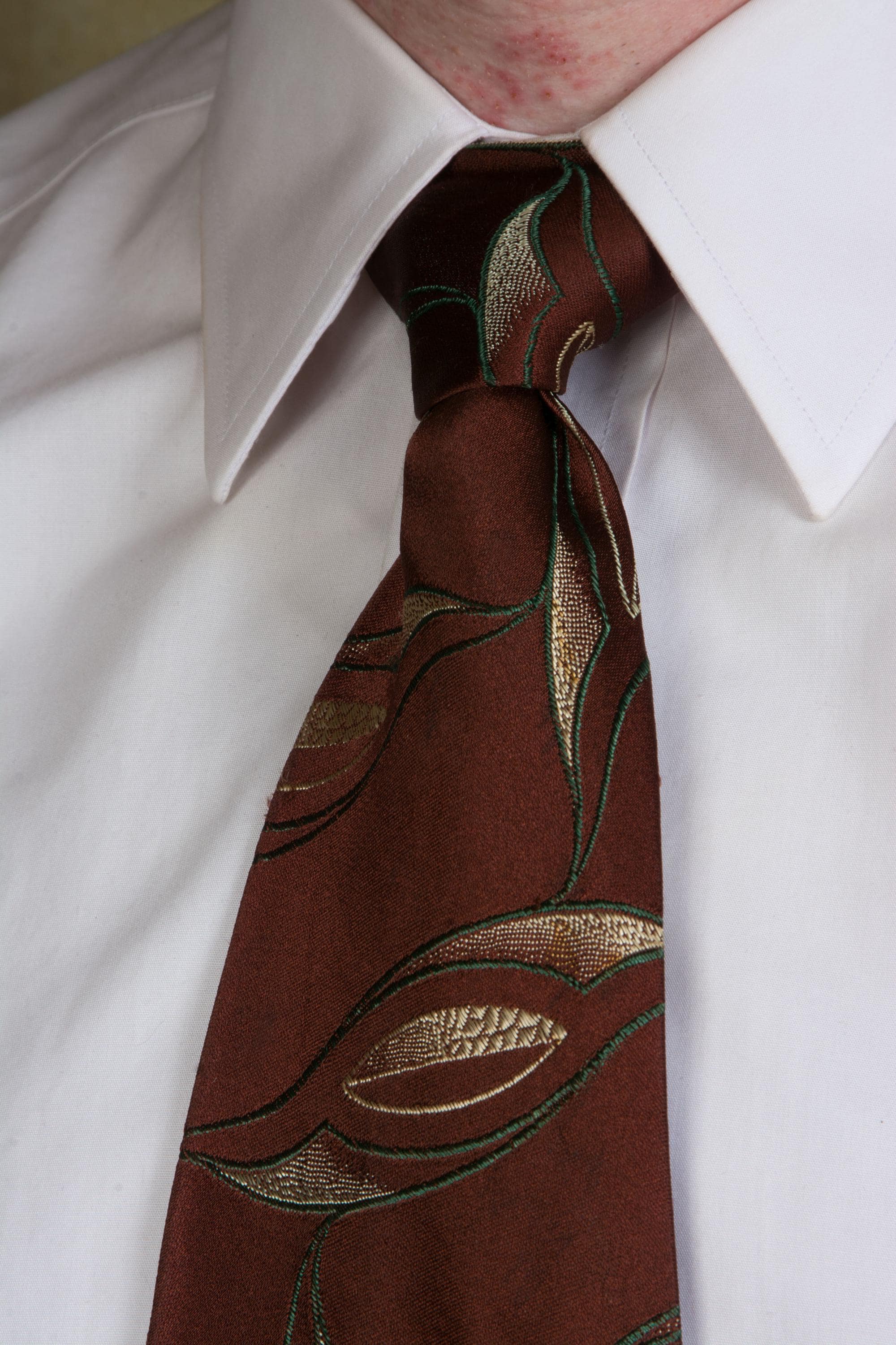 An excellent 1920s brocade tie, bold and rich. This features a very dark brown ground with a sweeping brocade in the shape of lily leaves, done in deep green and lustrous ivory. It has an asymmetric fold and is unlined, save for the interfacing at the neck. It makes a very crisp knot.