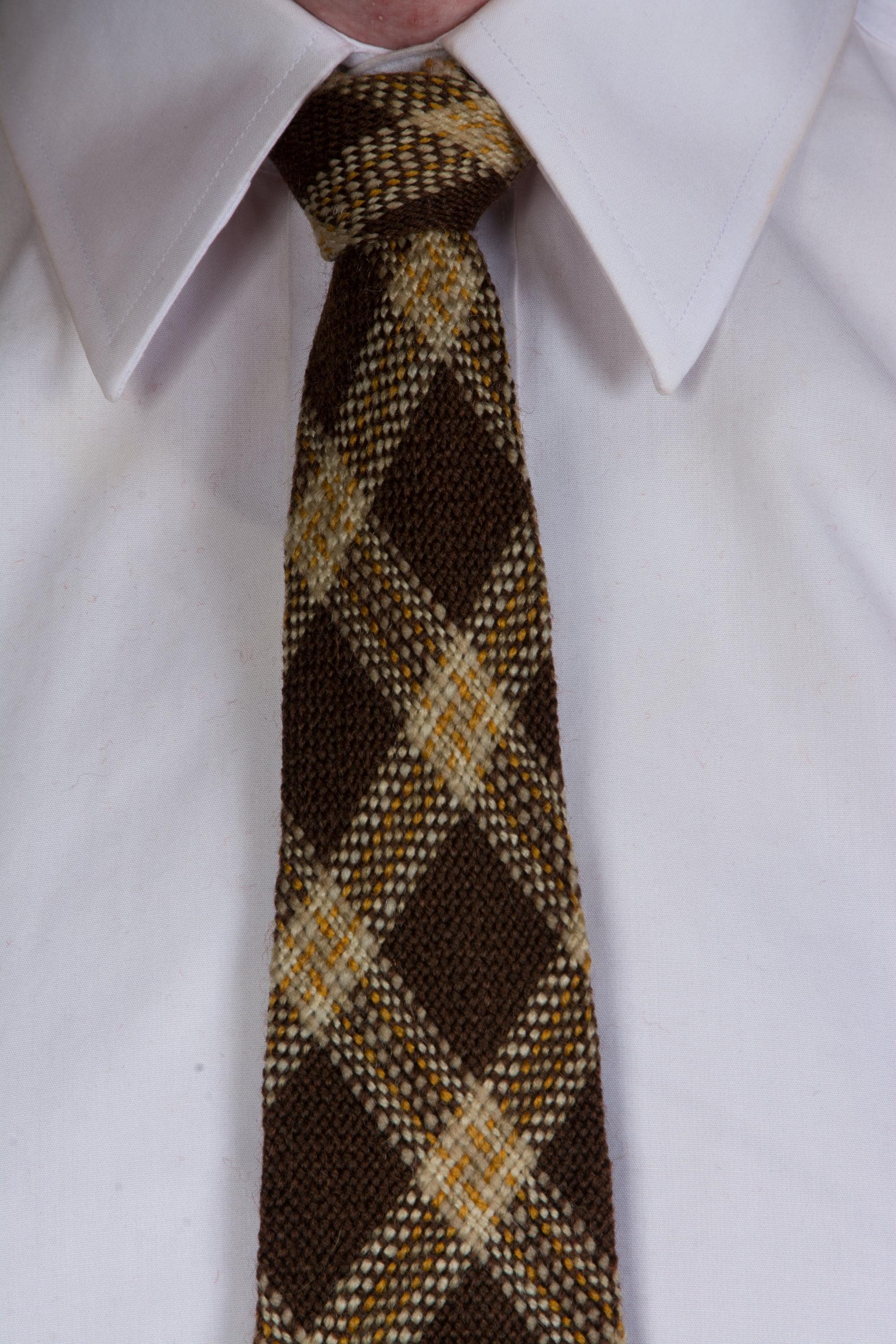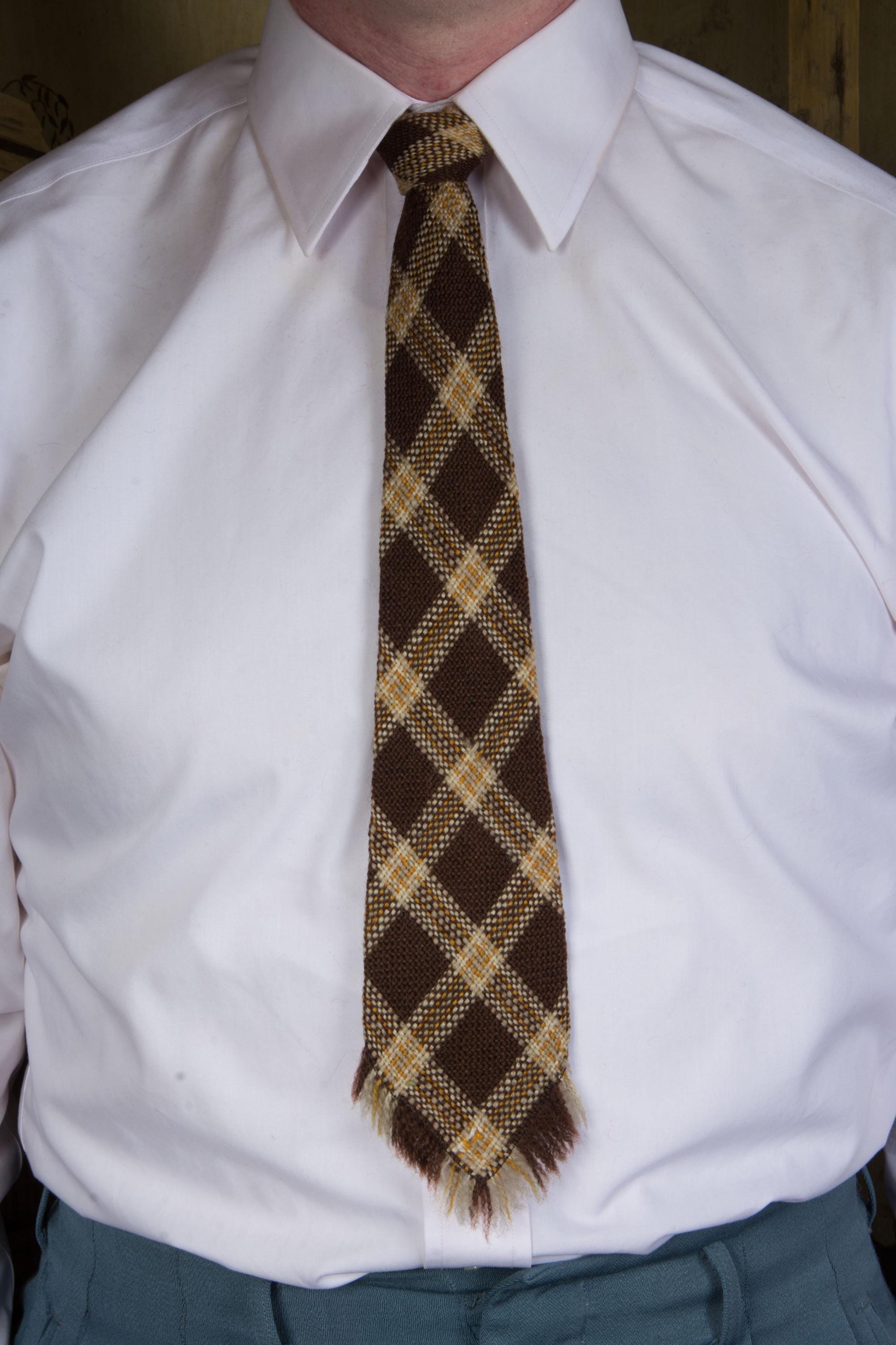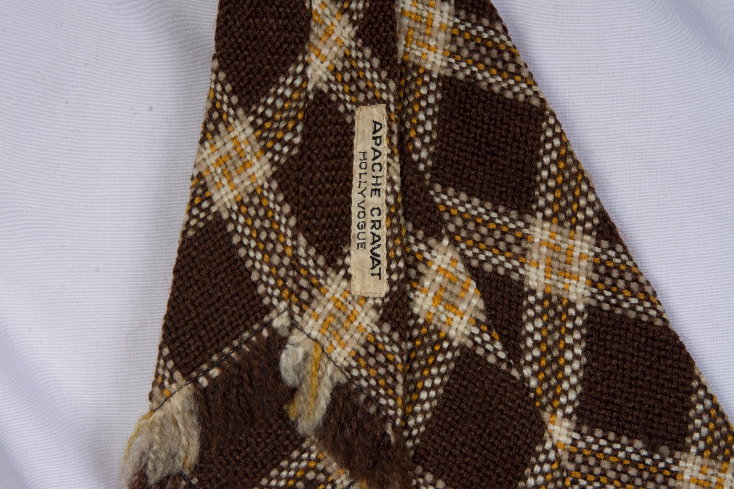 The earliest of all the woven ties in this collection! "Apache" ties were advertised by Hollyvogue in 1934 and 1935, and you can really see the year in this color palette of chocolate brown, white, bone and mustard yellow. This uses different weight of yarns for more texture in the finished product. The fringe is especially nice because of this.