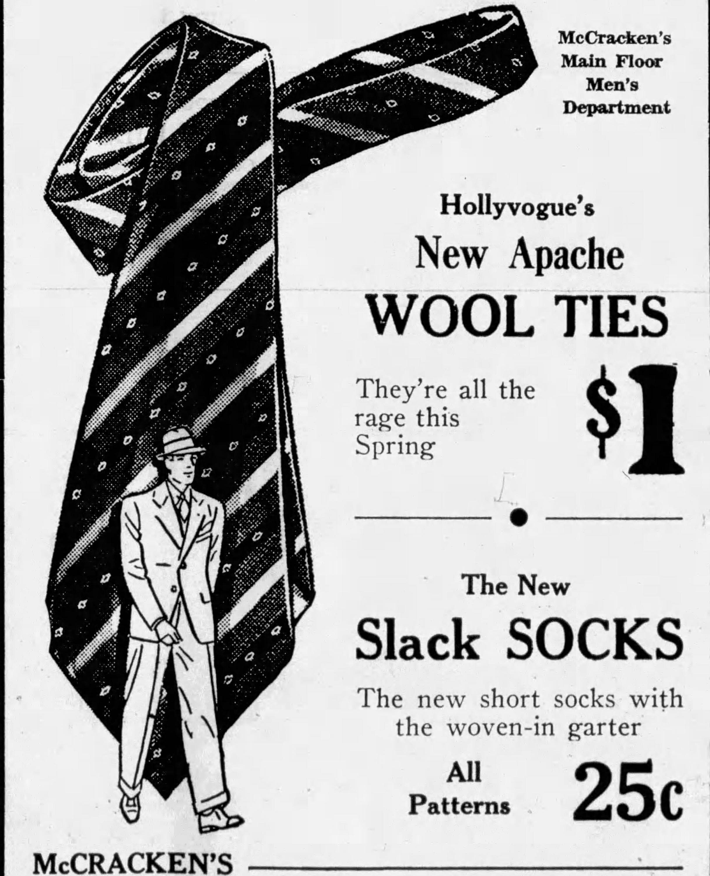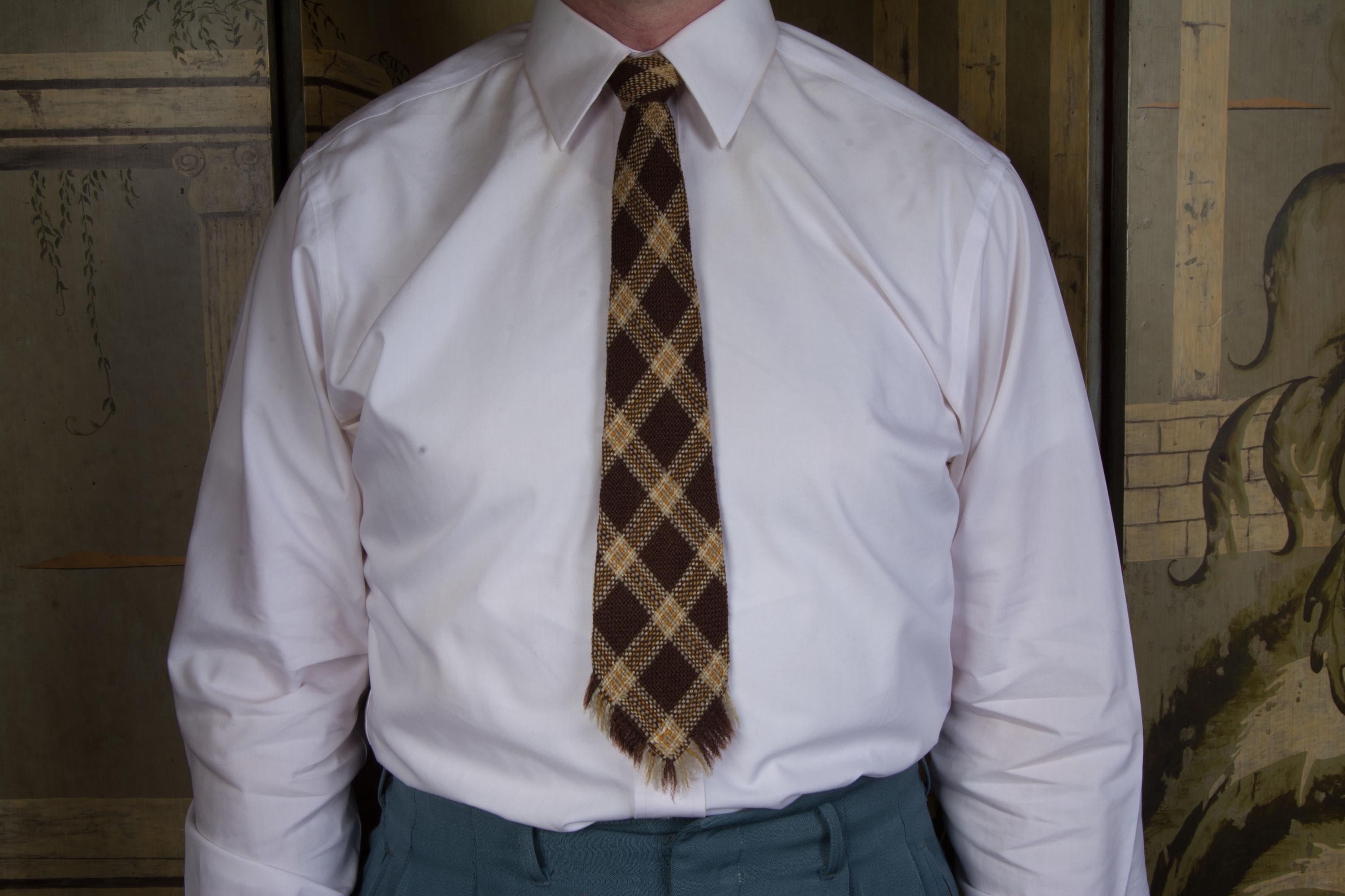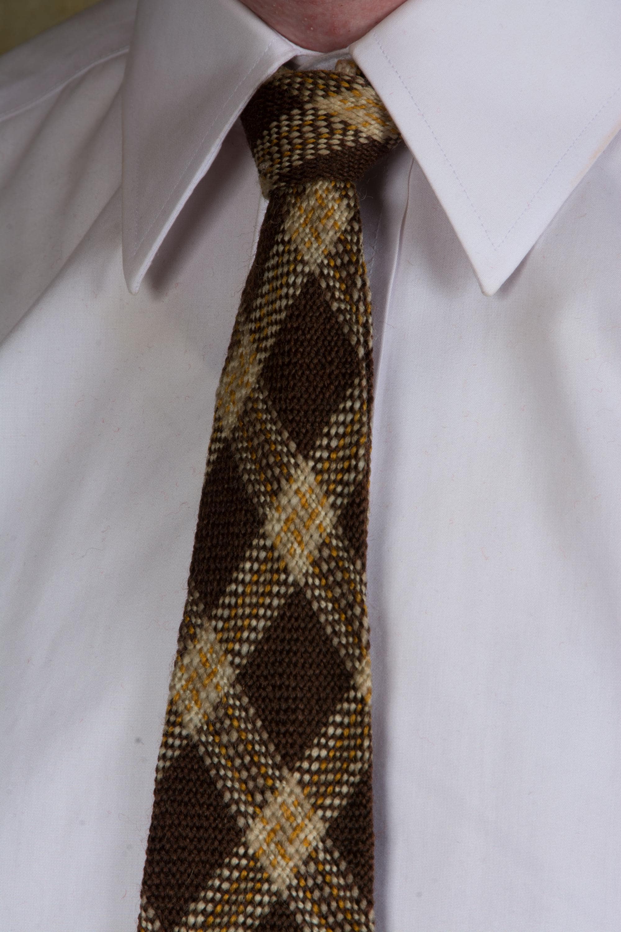 The earliest of all the woven ties in this collection! "Apache" ties were advertised by Hollyvogue in 1934 and 1935, and you can really see the year in this color palette of chocolate brown, white, bone and mustard yellow. This uses different weight of yarns for more texture in the finished product. The fringe is especially nice because of this.