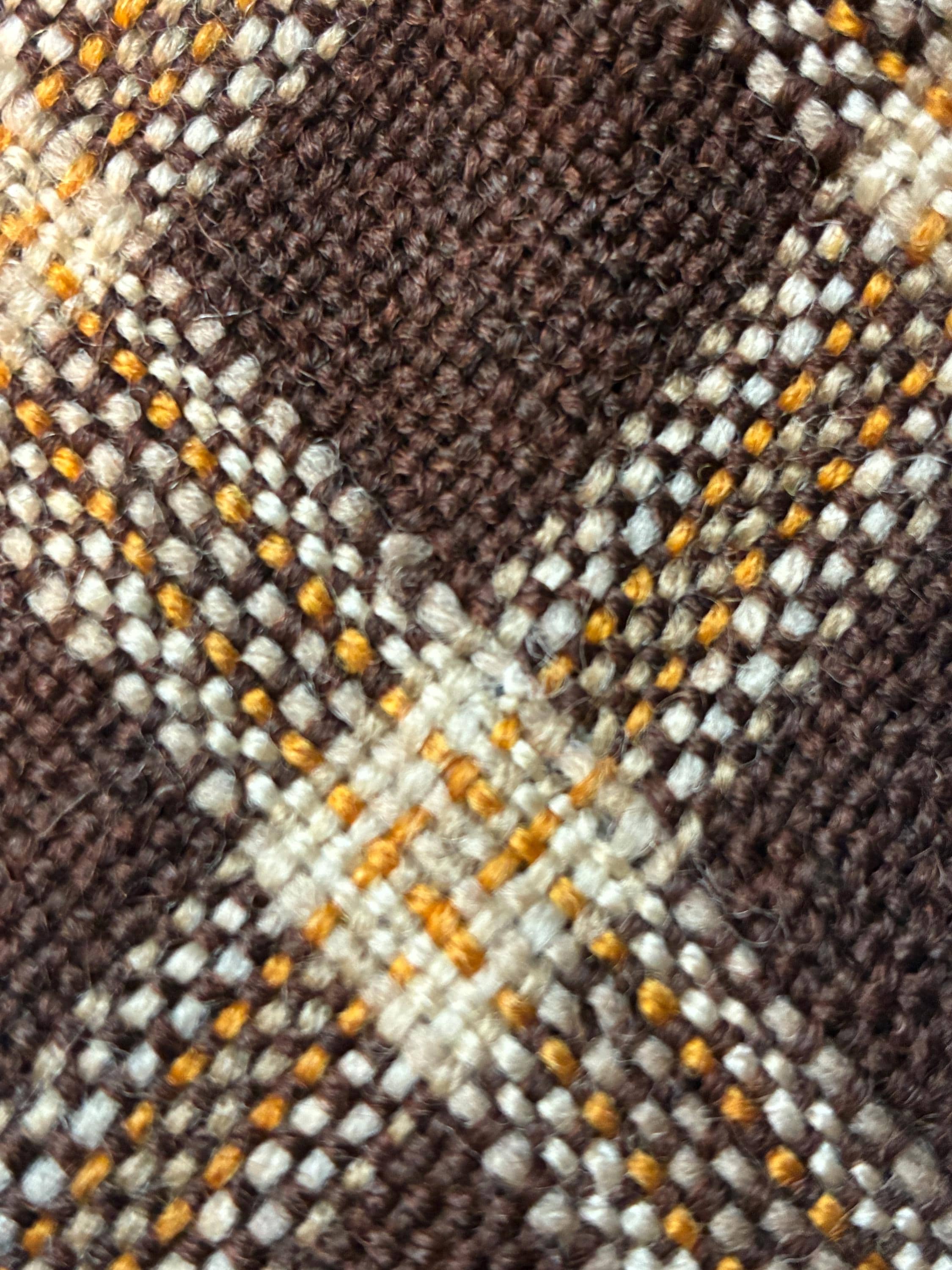 This tie wears well. I did think at first this one escaped the moths completely, but on a very careful check, there's a two spots where a stitch or two of the bone is missing, and I took a bit from the back to repair the one that might stand out - see last close up. The other is just above the fringe. I find no other issues to note!
