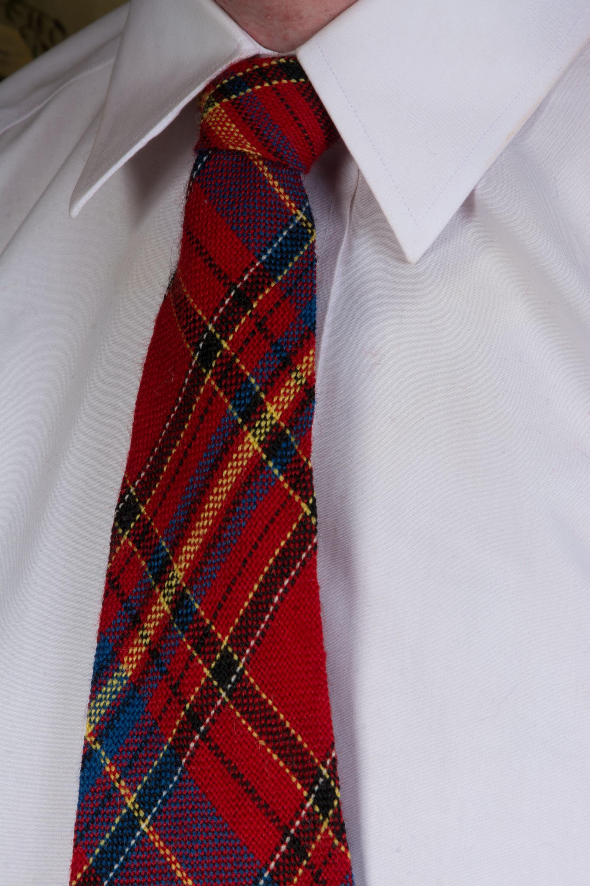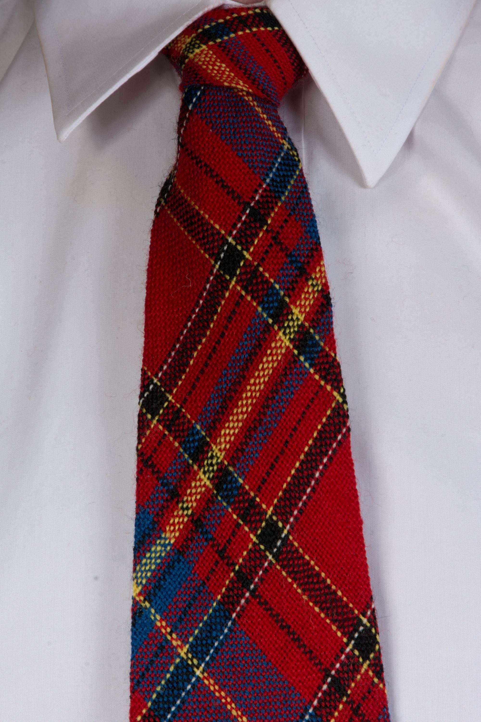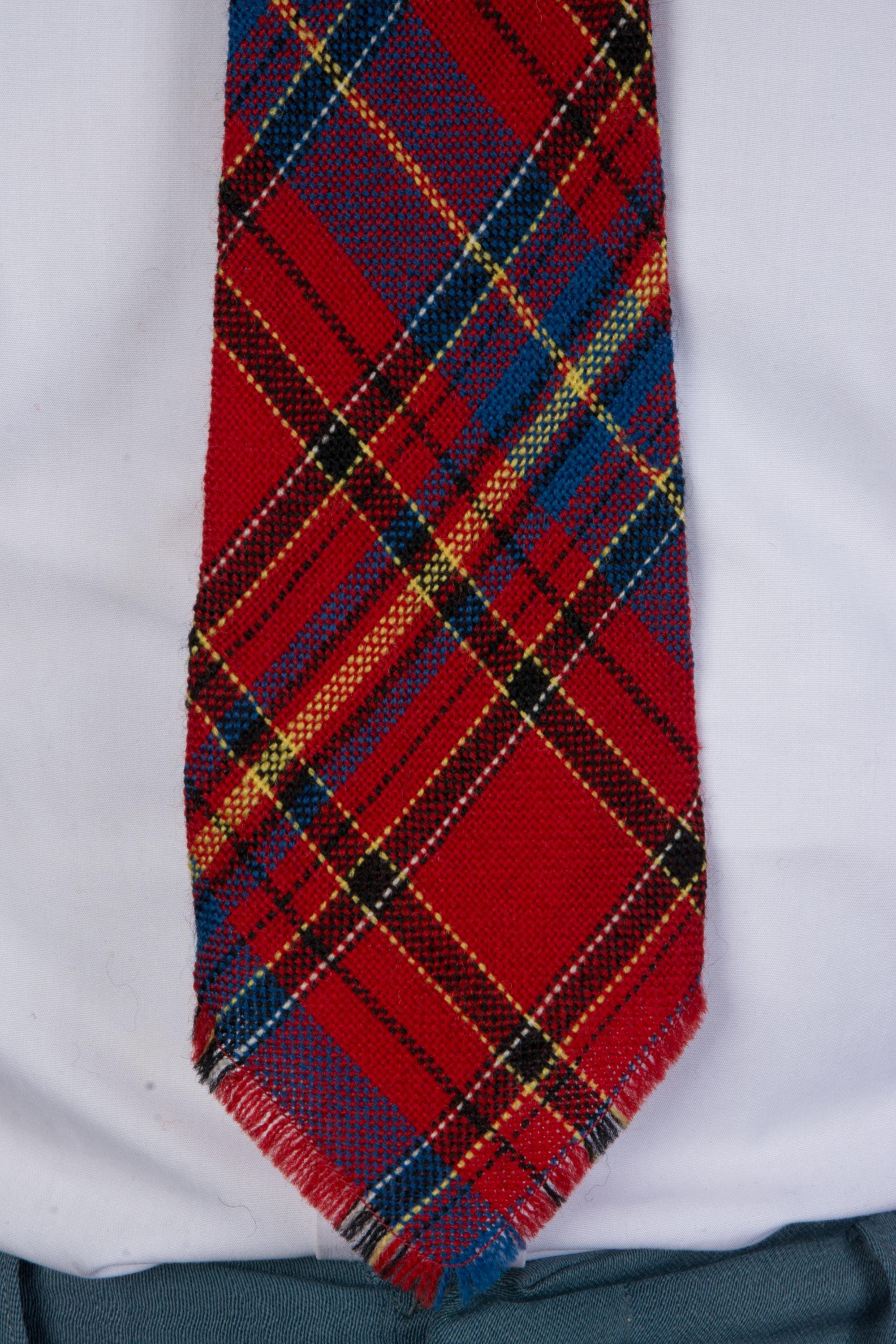 A gorgeous and vibrant woven wool tie in a wonderful Scottish Tartan. The colors are similar to Royal Stewart, but with more blue. Red, black, blue, yellow and white. Hand loomed by indigenous weavers in the 1940s, it is beautiful quality. It is unlined.