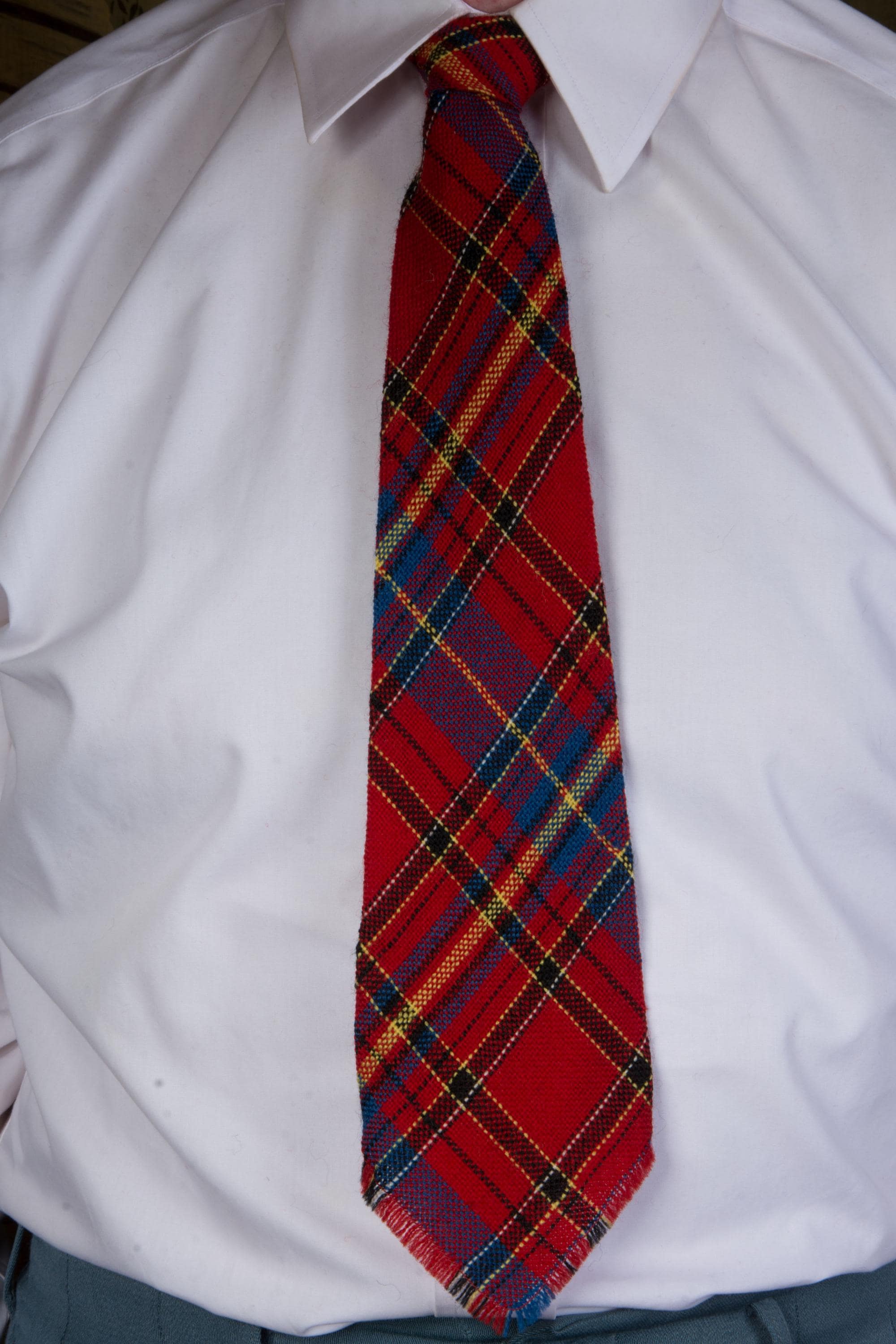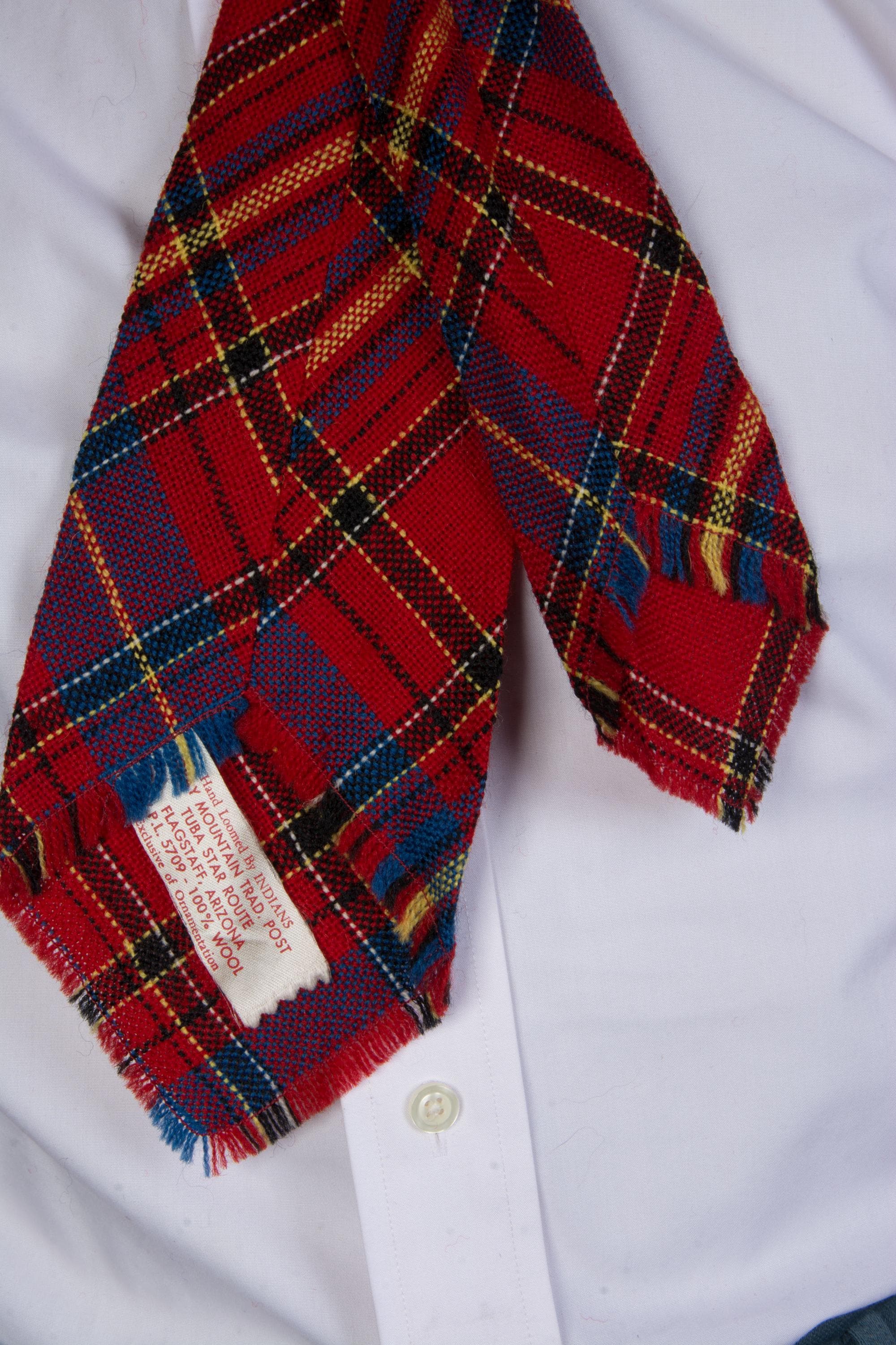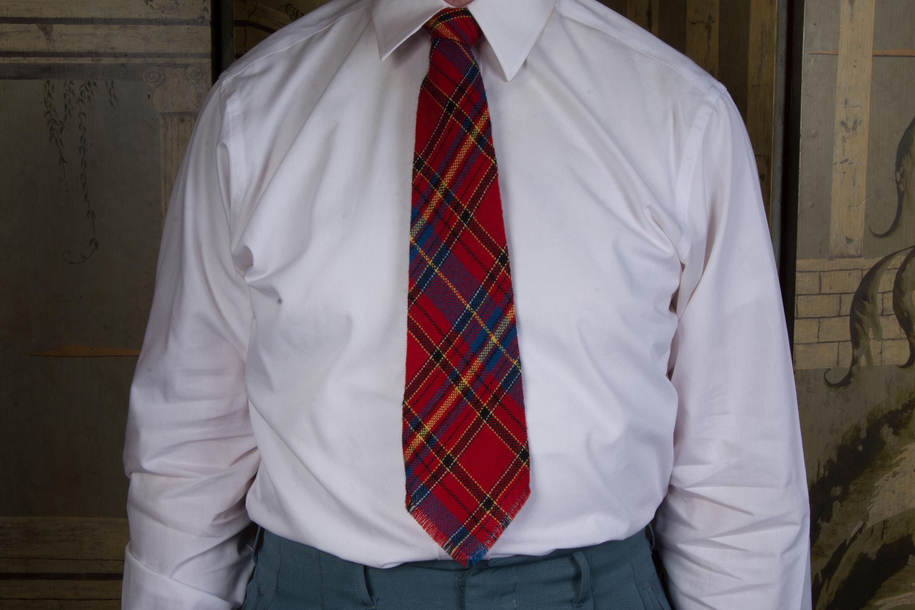 A gorgeous and vibrant woven wool tie in a wonderful Scottish Tartan. The colors are similar to Royal Stewart, but with more blue. Red, black, blue, yellow and white. Hand loomed by indigenous weavers in the 1940s, it is beautiful quality. It is unlined.