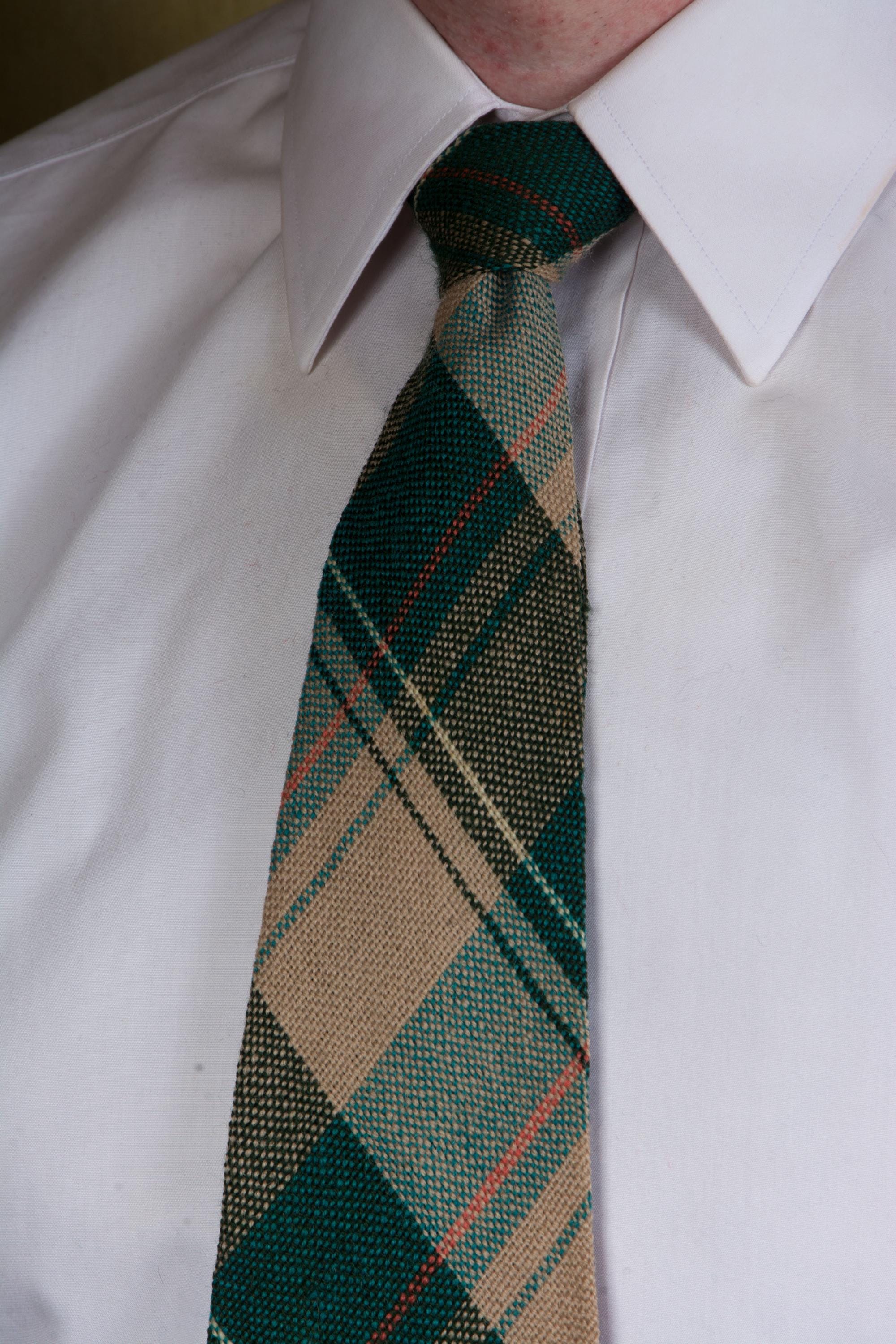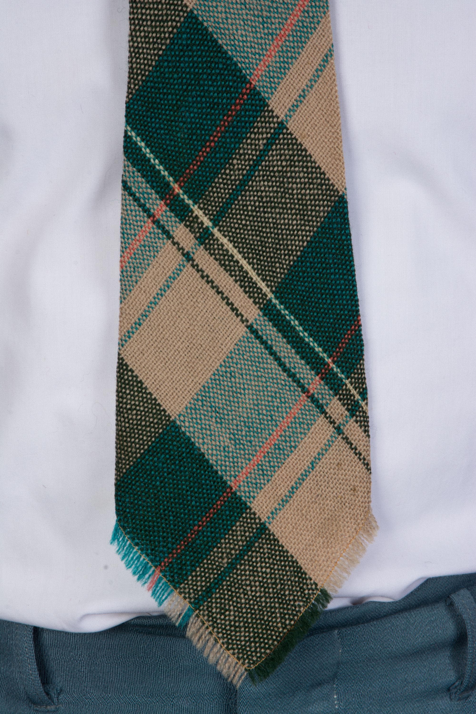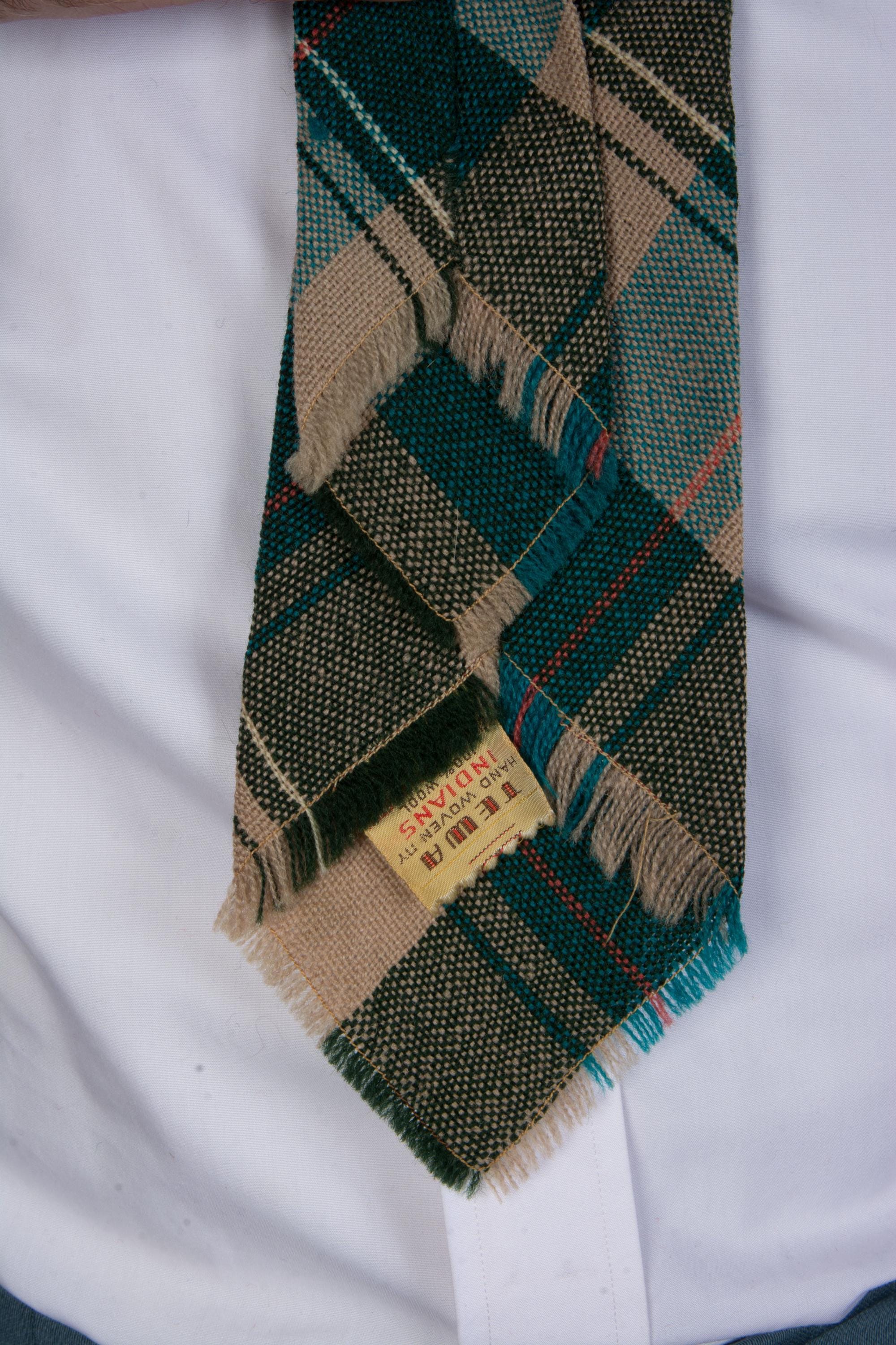 A particular lovely palette makes up the palette of this hand woven wool tie, create by indigenous Tewa weavers. Warm beige, vibrant teal, navy blue and a touch both black and orange ensure an eye catch plaid. It is unlined.