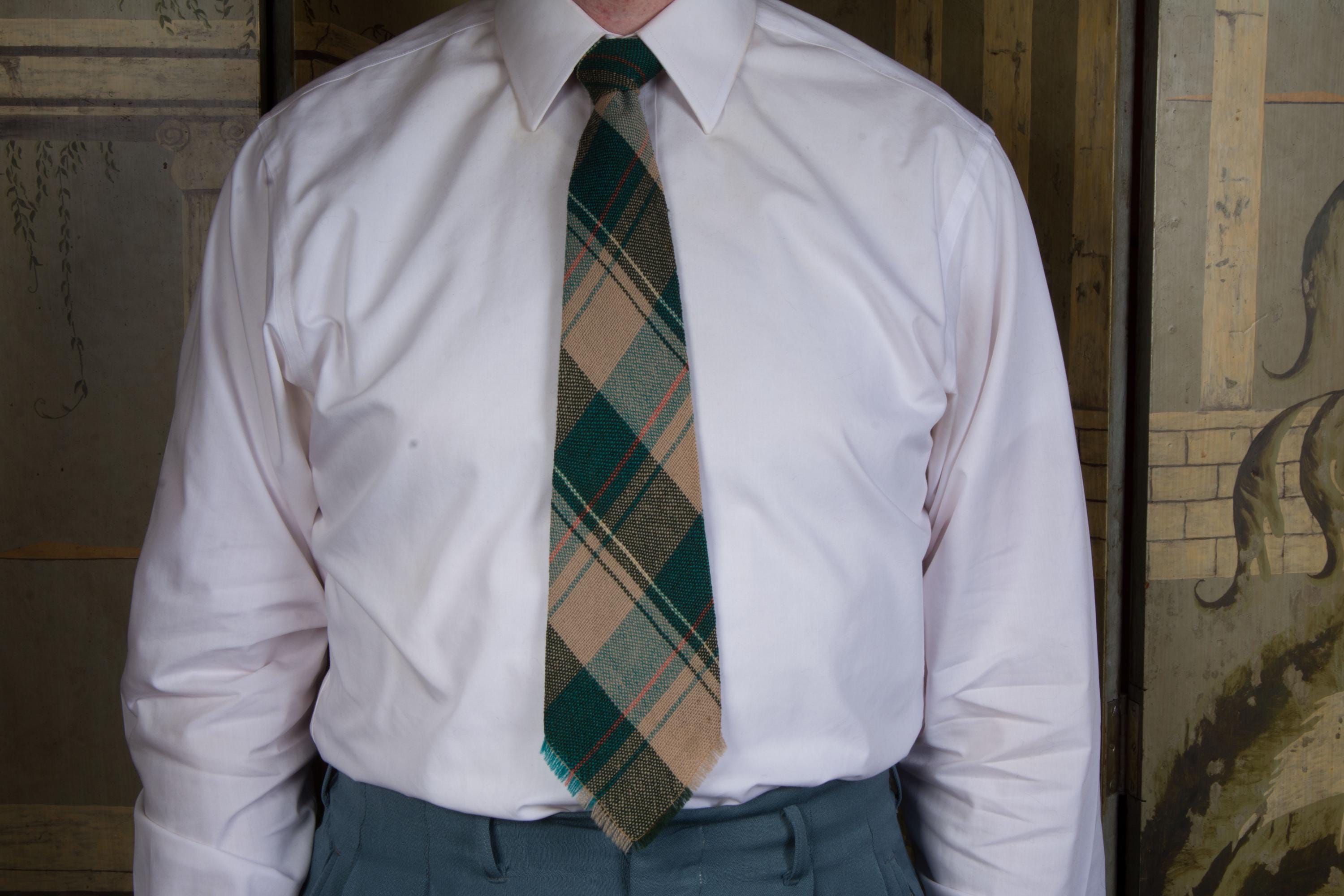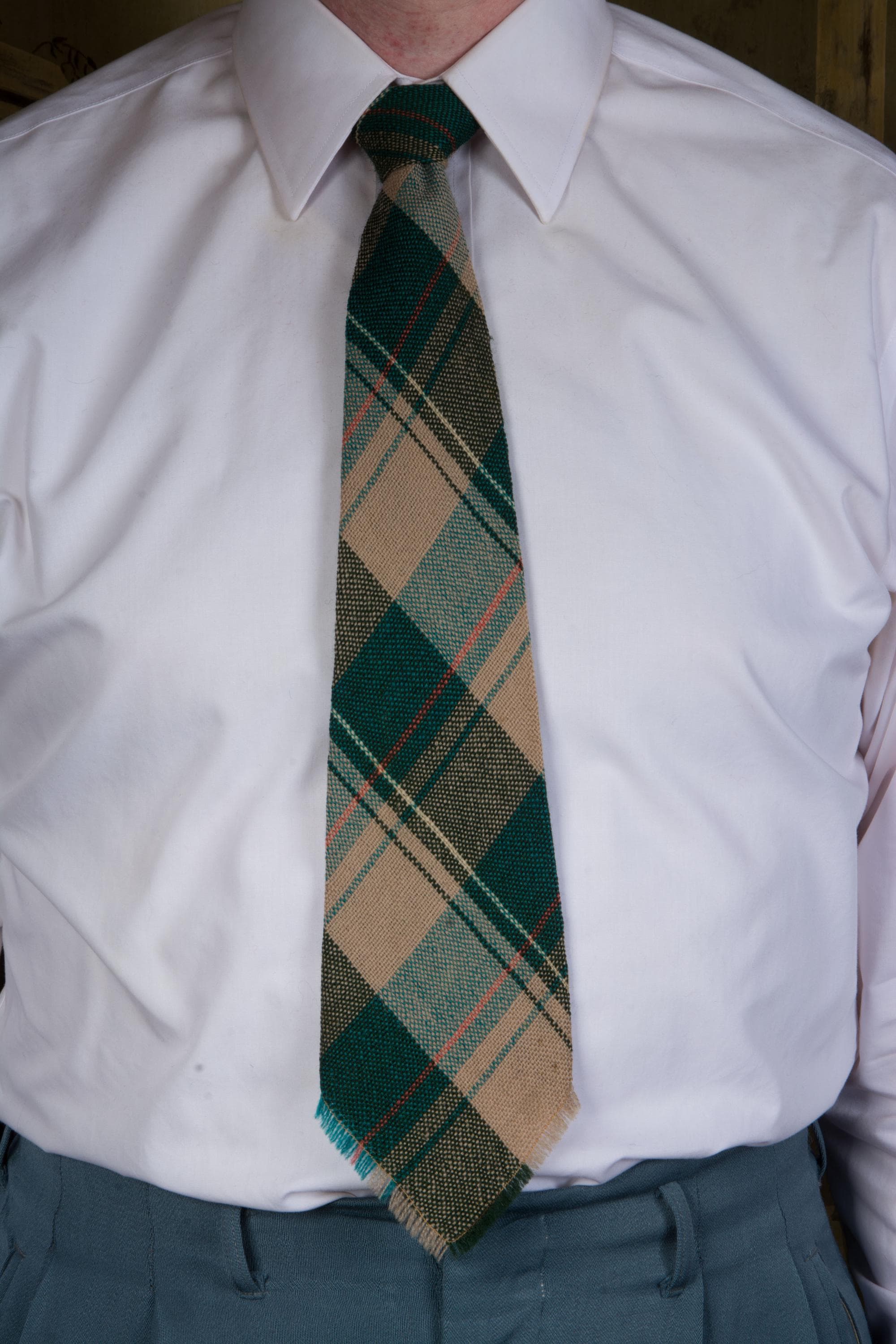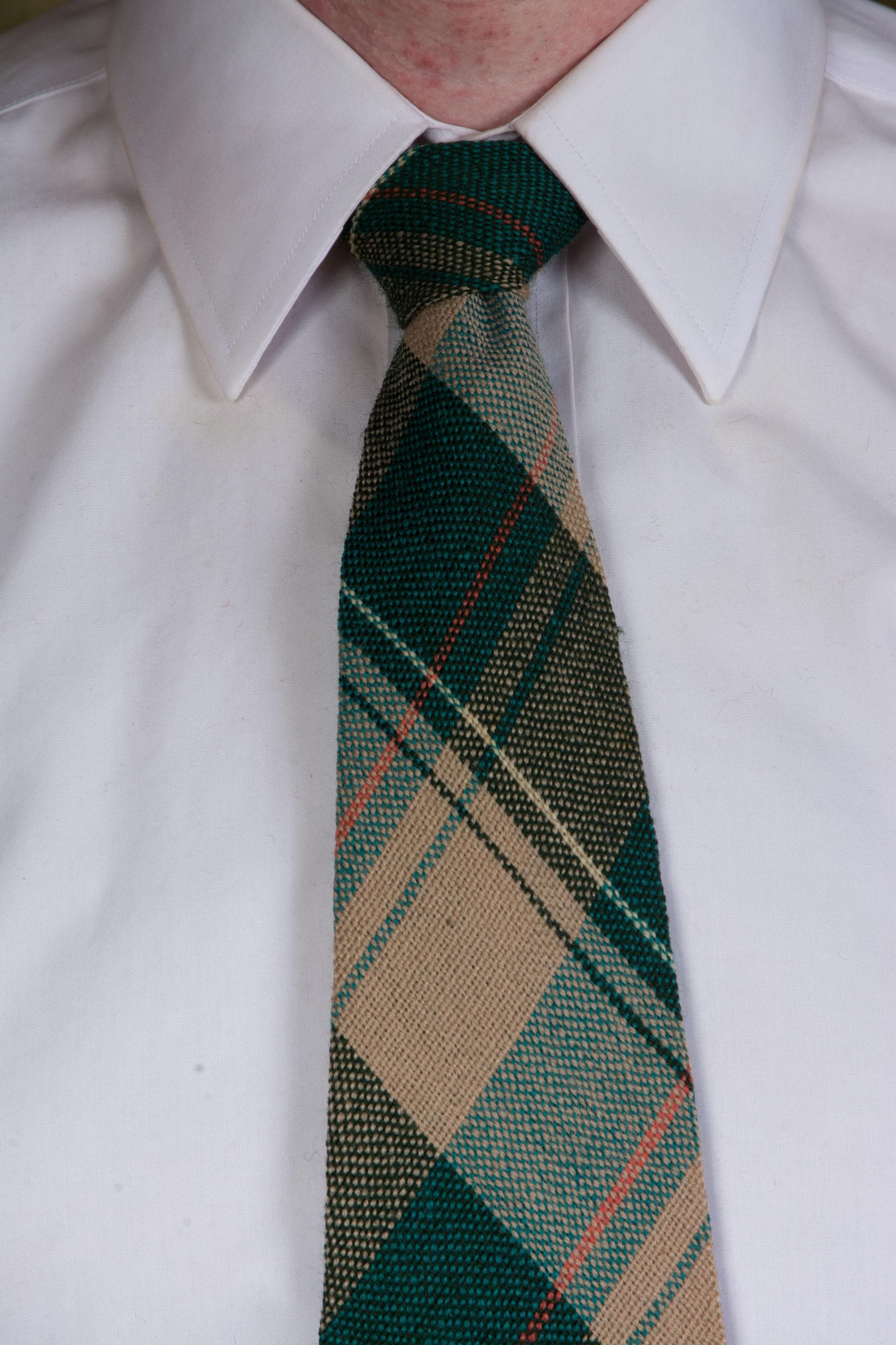A particular lovely palette makes up the palette of this hand woven wool tie, create by indigenous Tewa weavers. Warm beige, vibrant teal, navy blue and a touch both black and orange ensure an eye catch plaid. It is unlined.