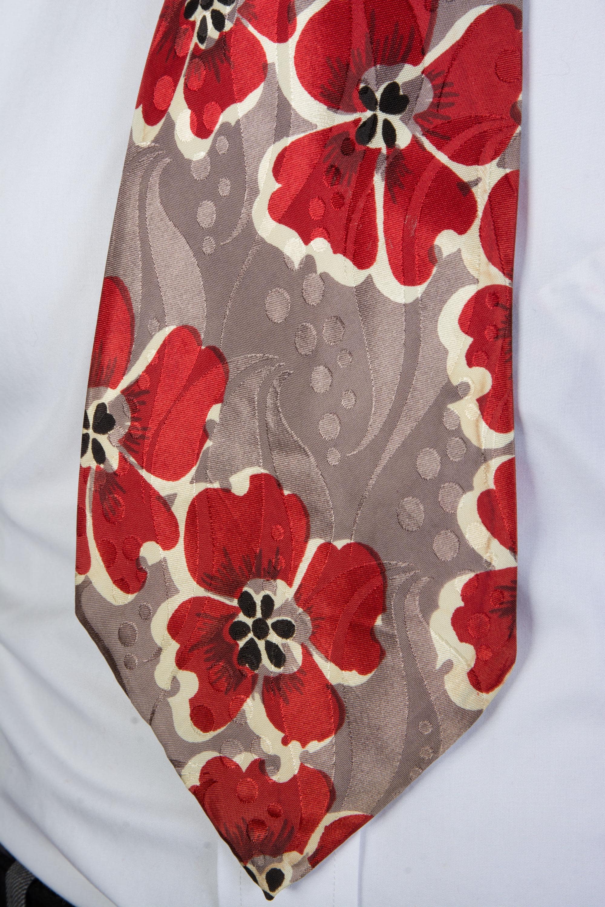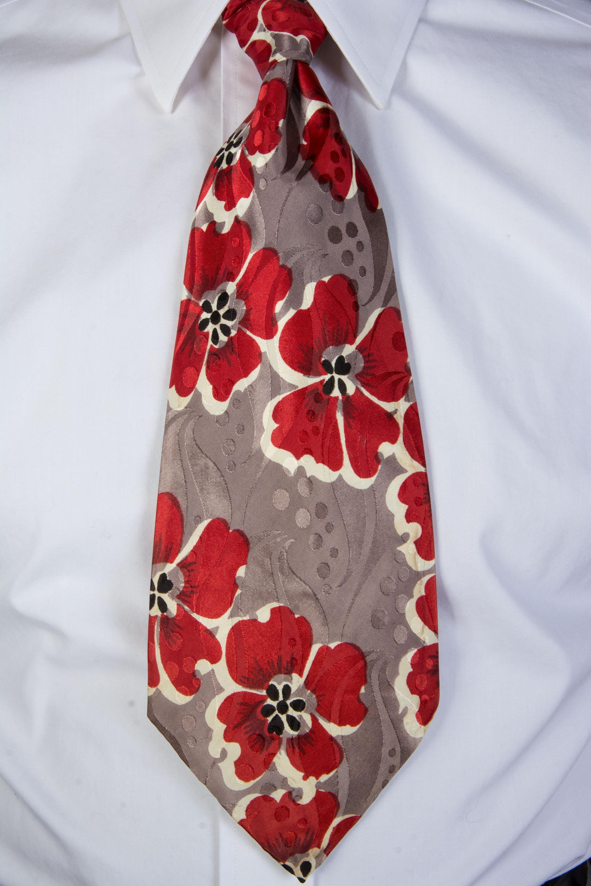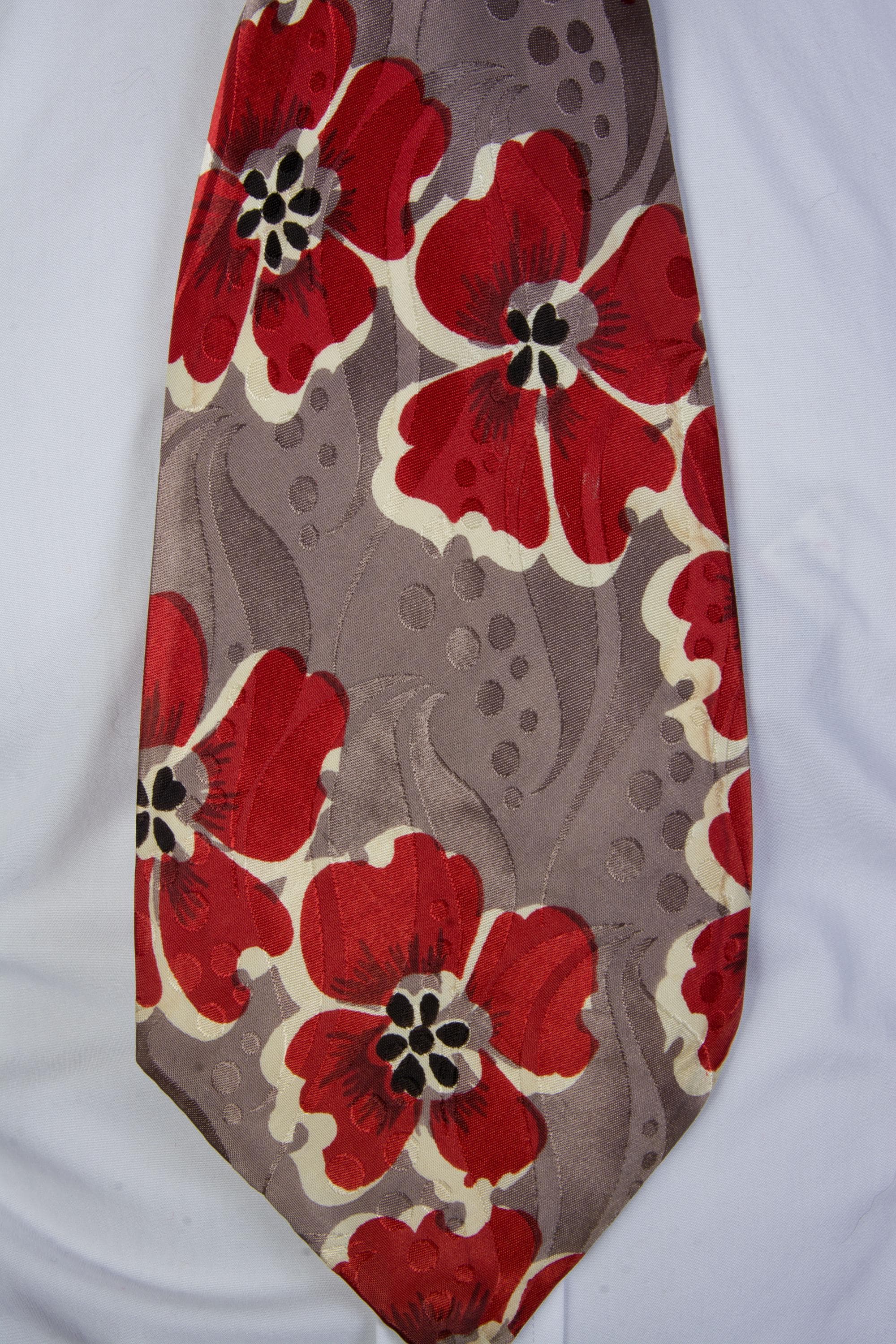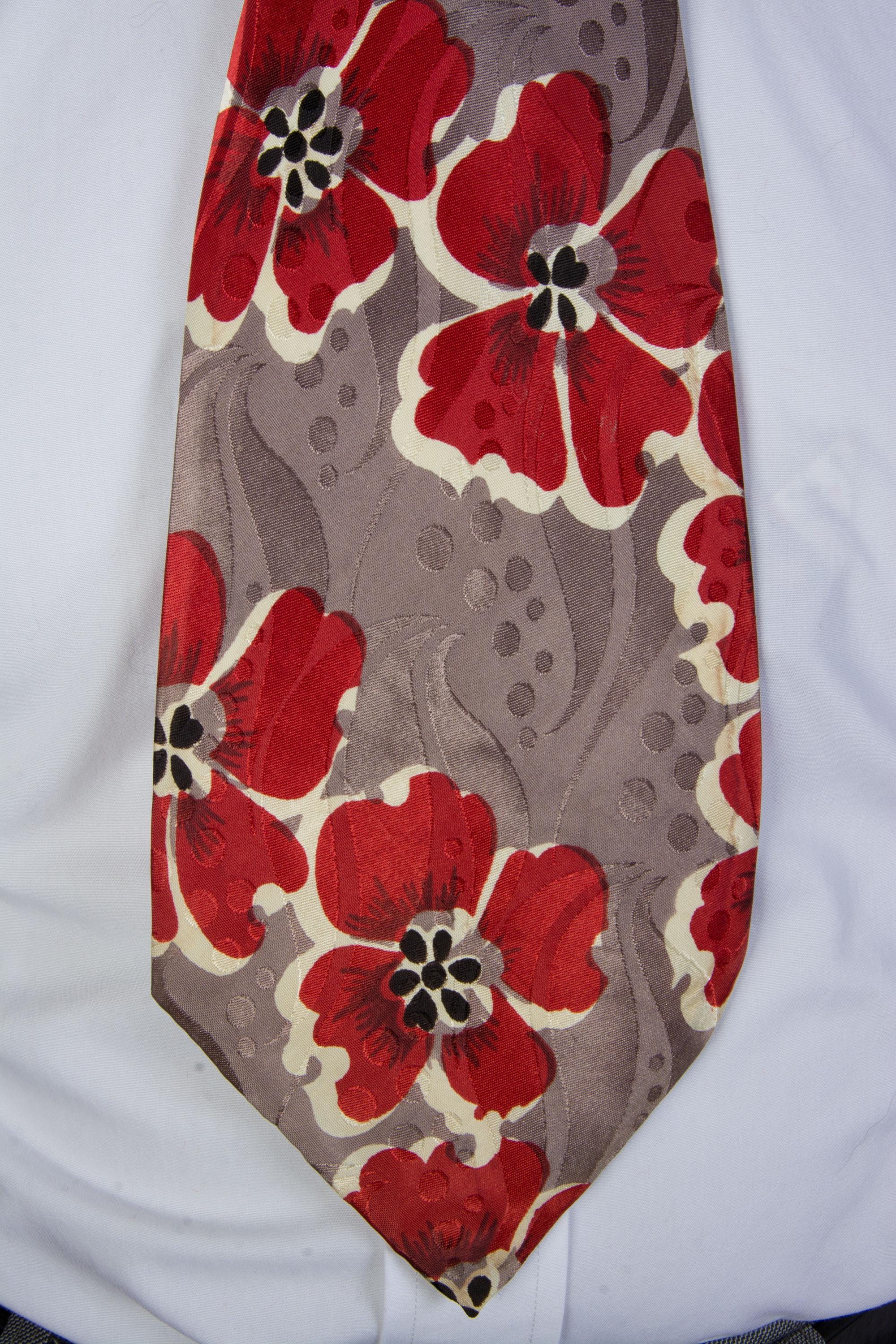 How fantastic is this bolder than bold, ultra wide POPPY print necktie! Silver brocade is paired with rich, deep lipsticky red, ivory and black. I love the way the brocade works with the print. Made by Creveling of California, this bold number will absolutely slay whether you wear it with a suit, or just frame it with a pair of braces. Fully lined