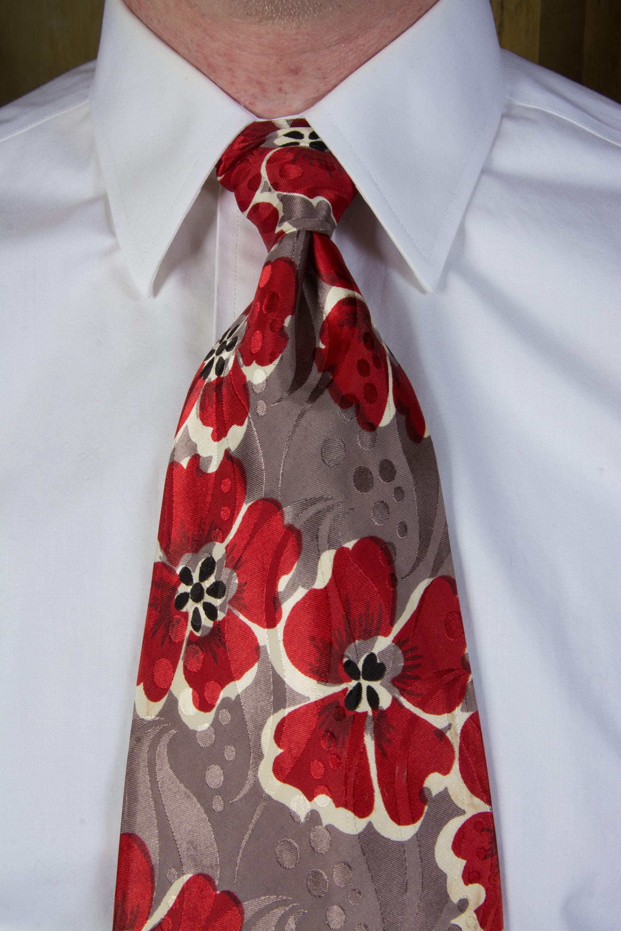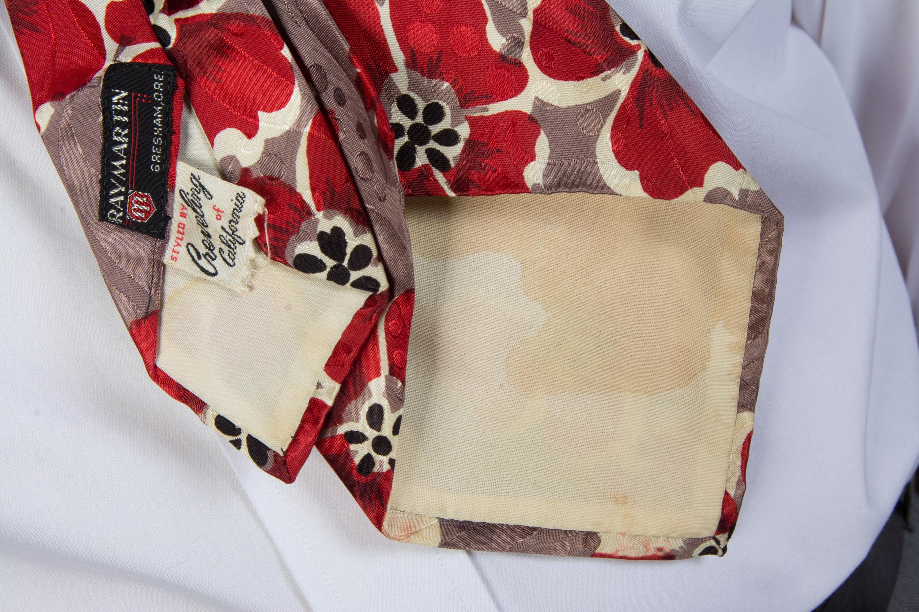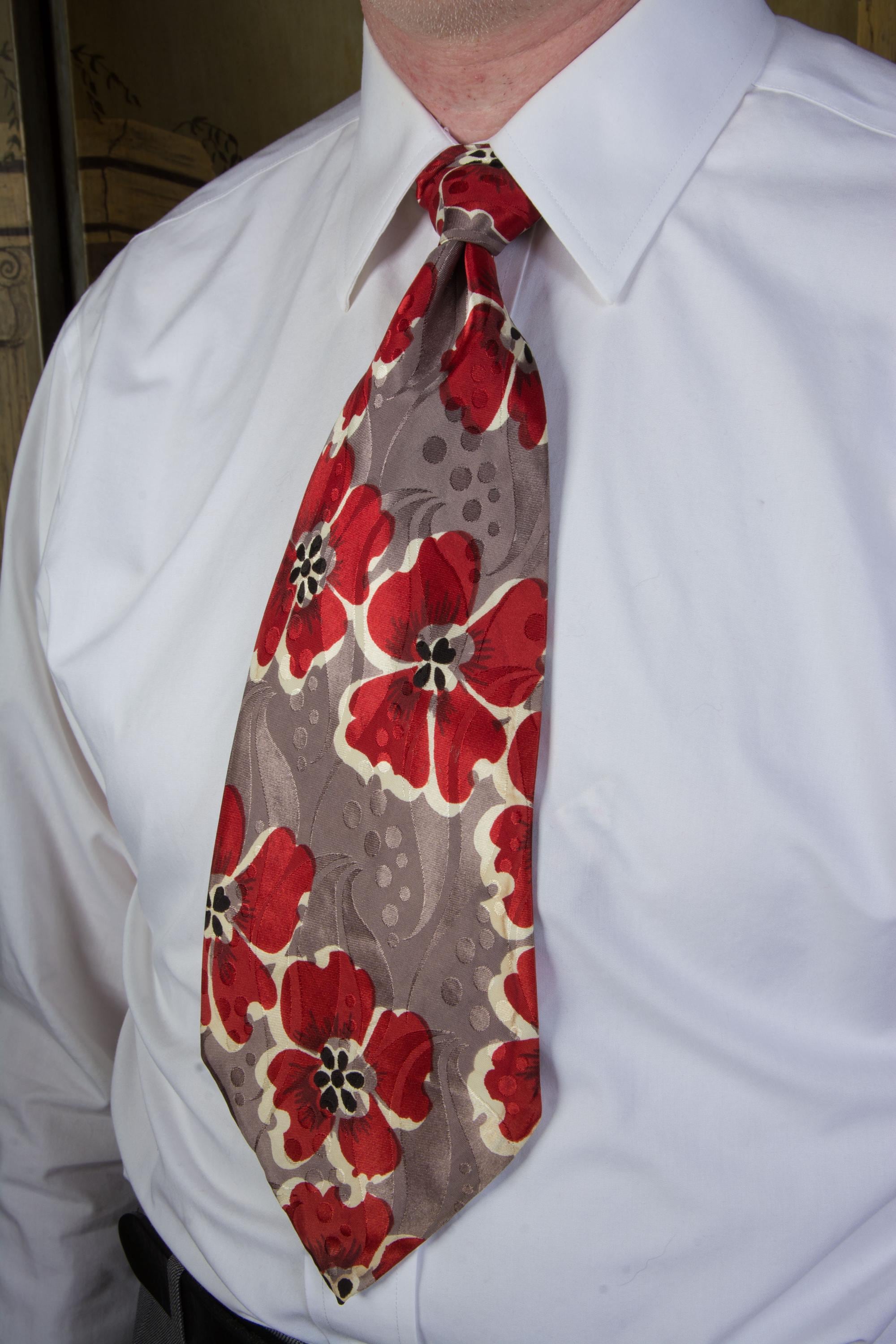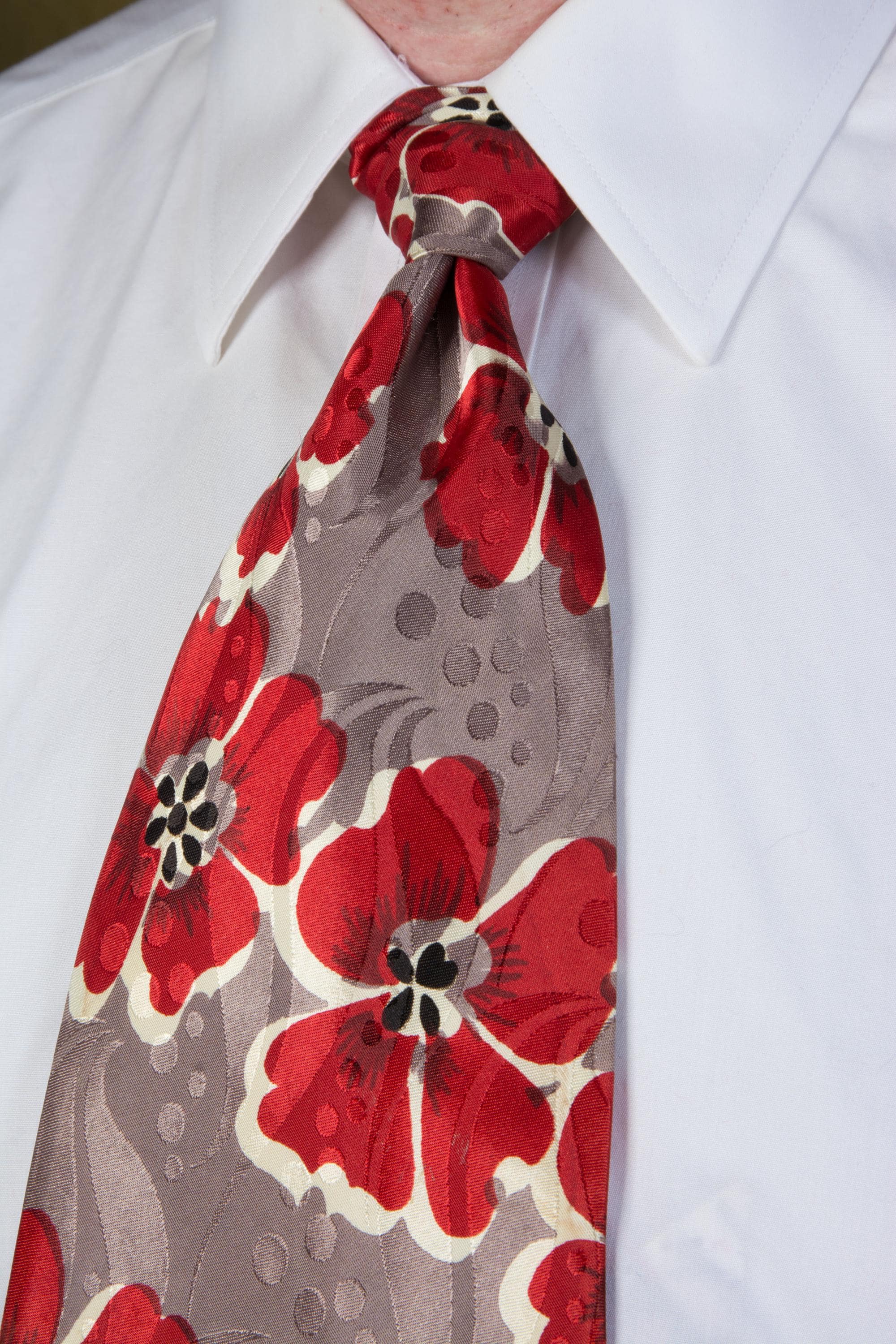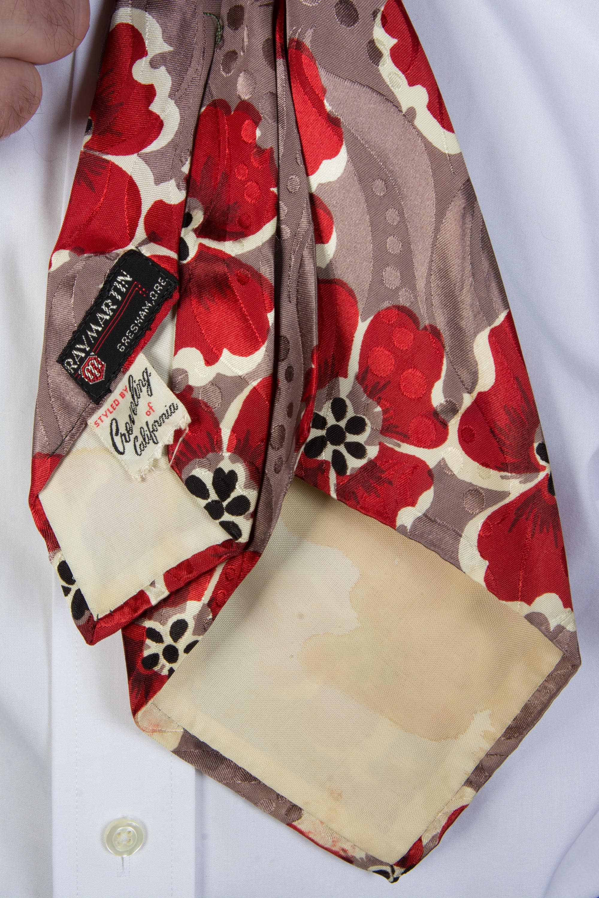 How fantastic is this bolder than bold, ultra wide POPPY print necktie! Silver brocade is paired with rich, deep lipsticky red, ivory and black. I love the way the brocade works with the print. Made by Creveling of California, this bold number will absolutely slay whether you wear it with a suit, or just frame it with a pair of braces. Fully lined