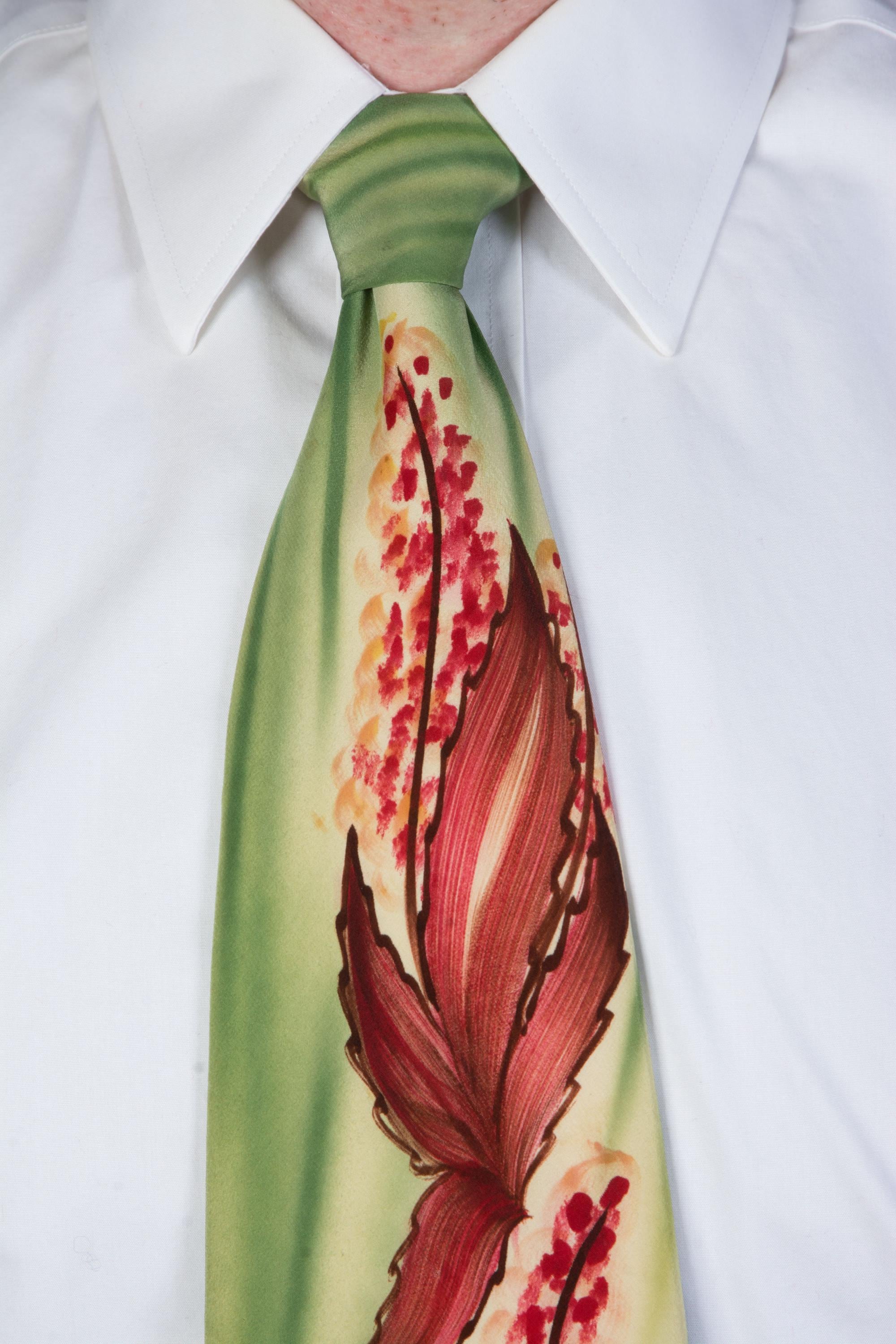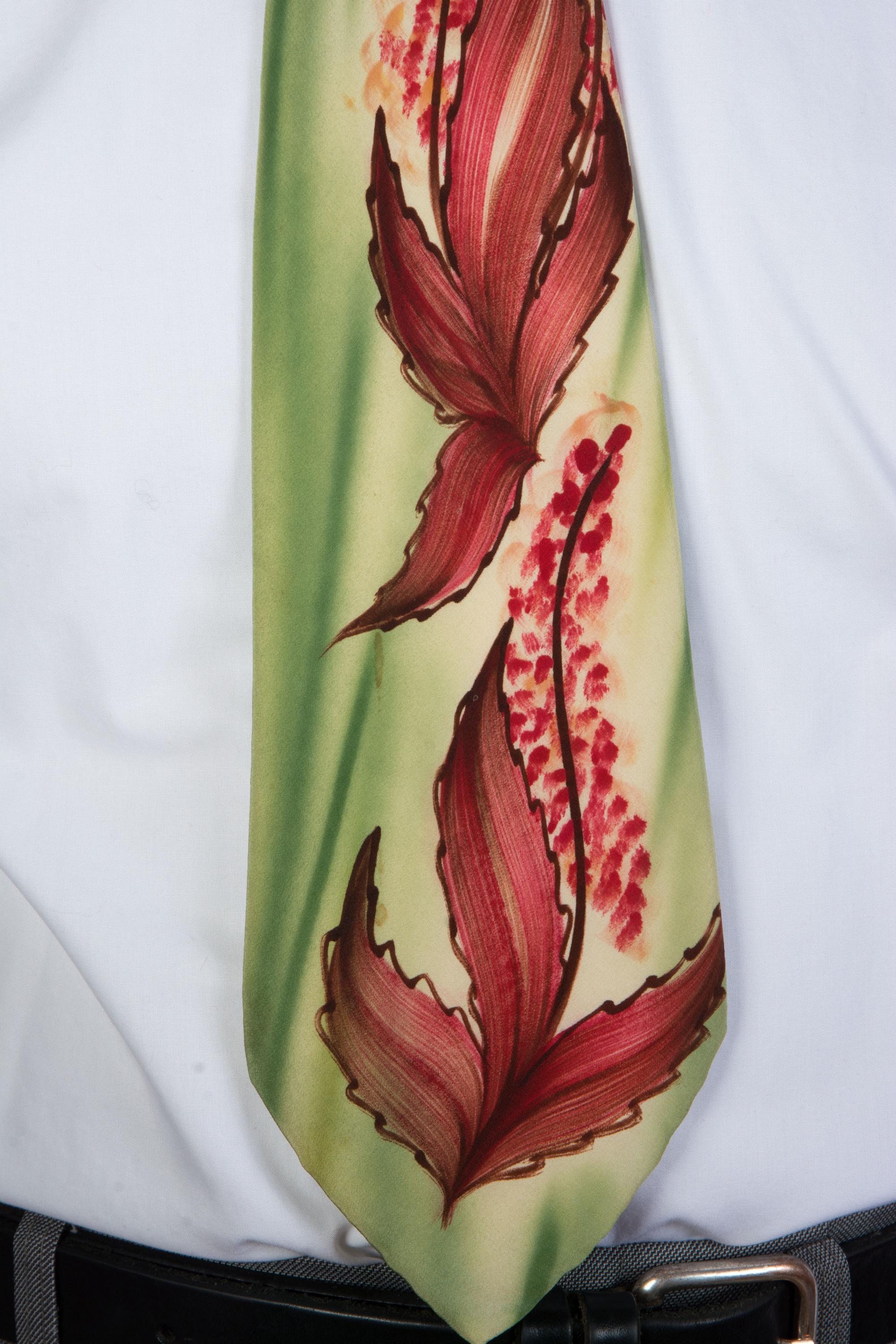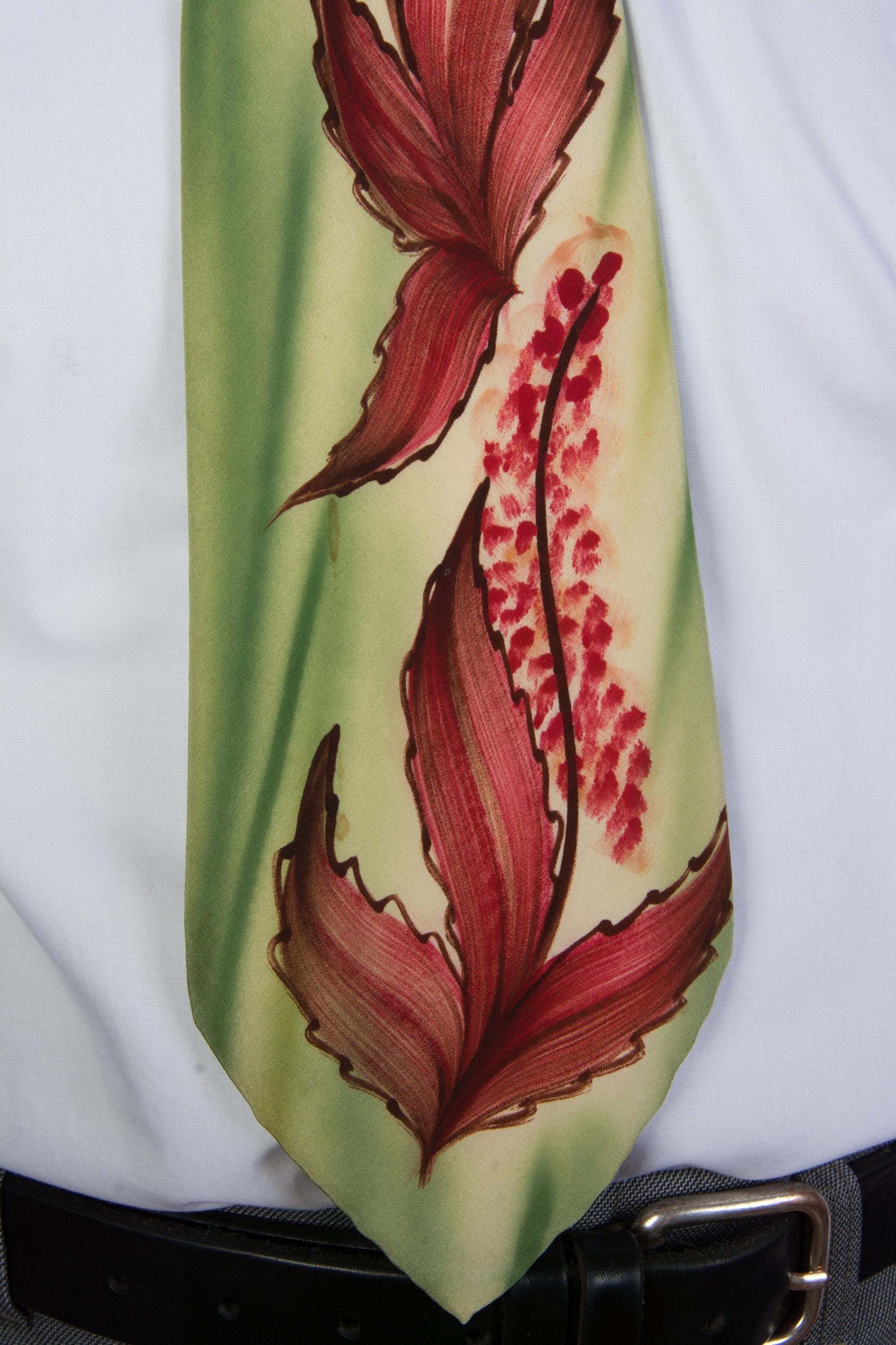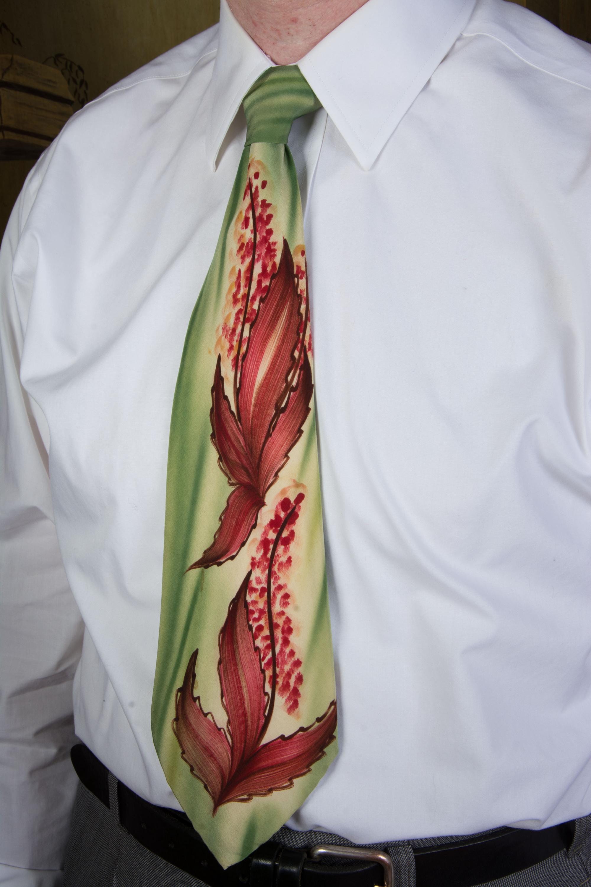 A stunning handpainted tie with striking autumnal art work. The background is brushy, vibrant airbrushed greens, and there's rich reds and browns mixed to create fall leaves and little flowers or berries, reaching to just below the knot. Fully lined in a nylon celanese satin.