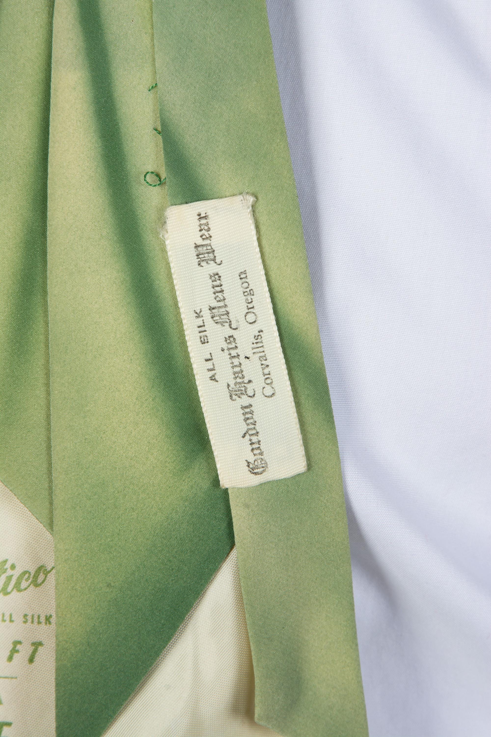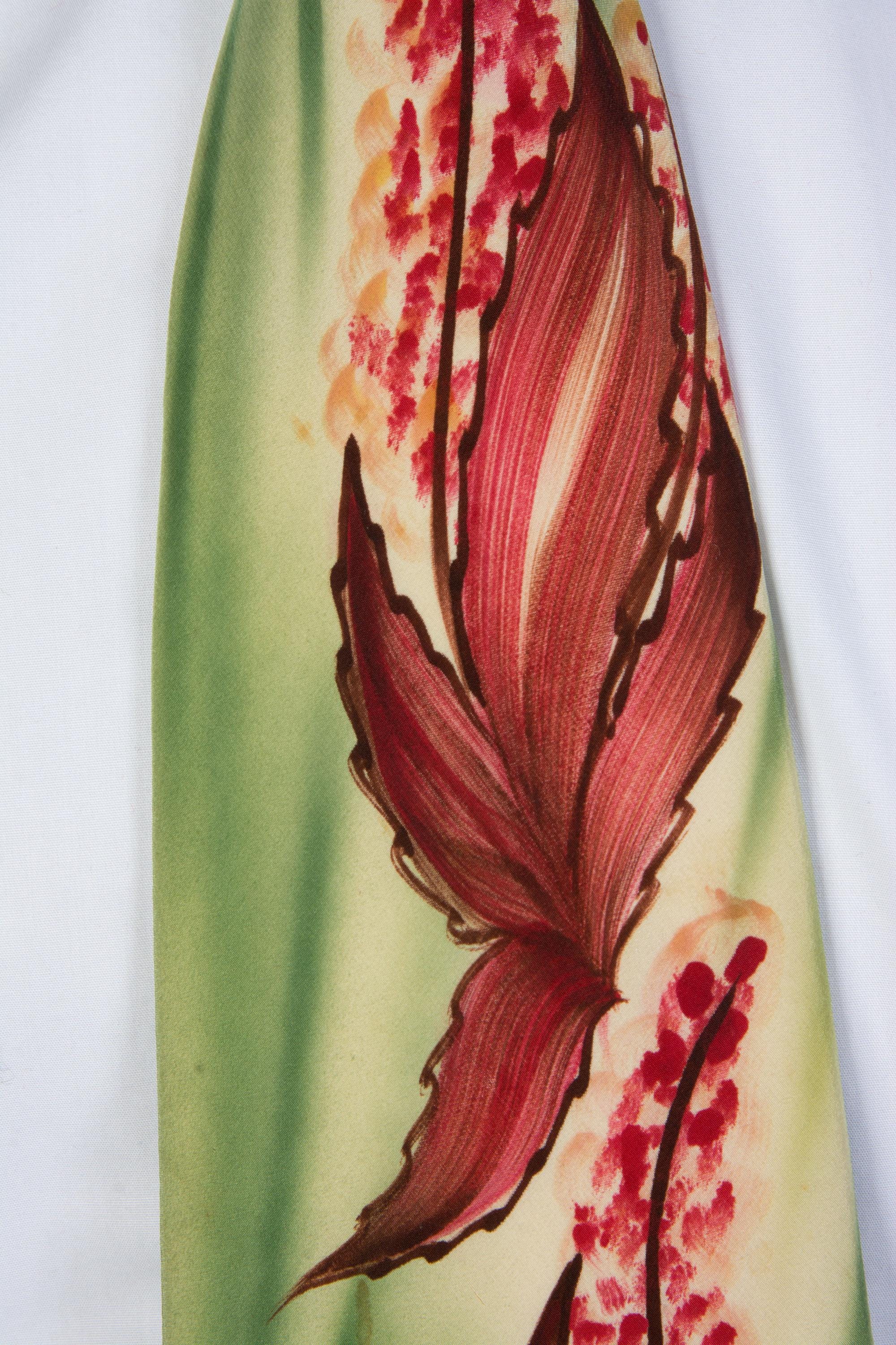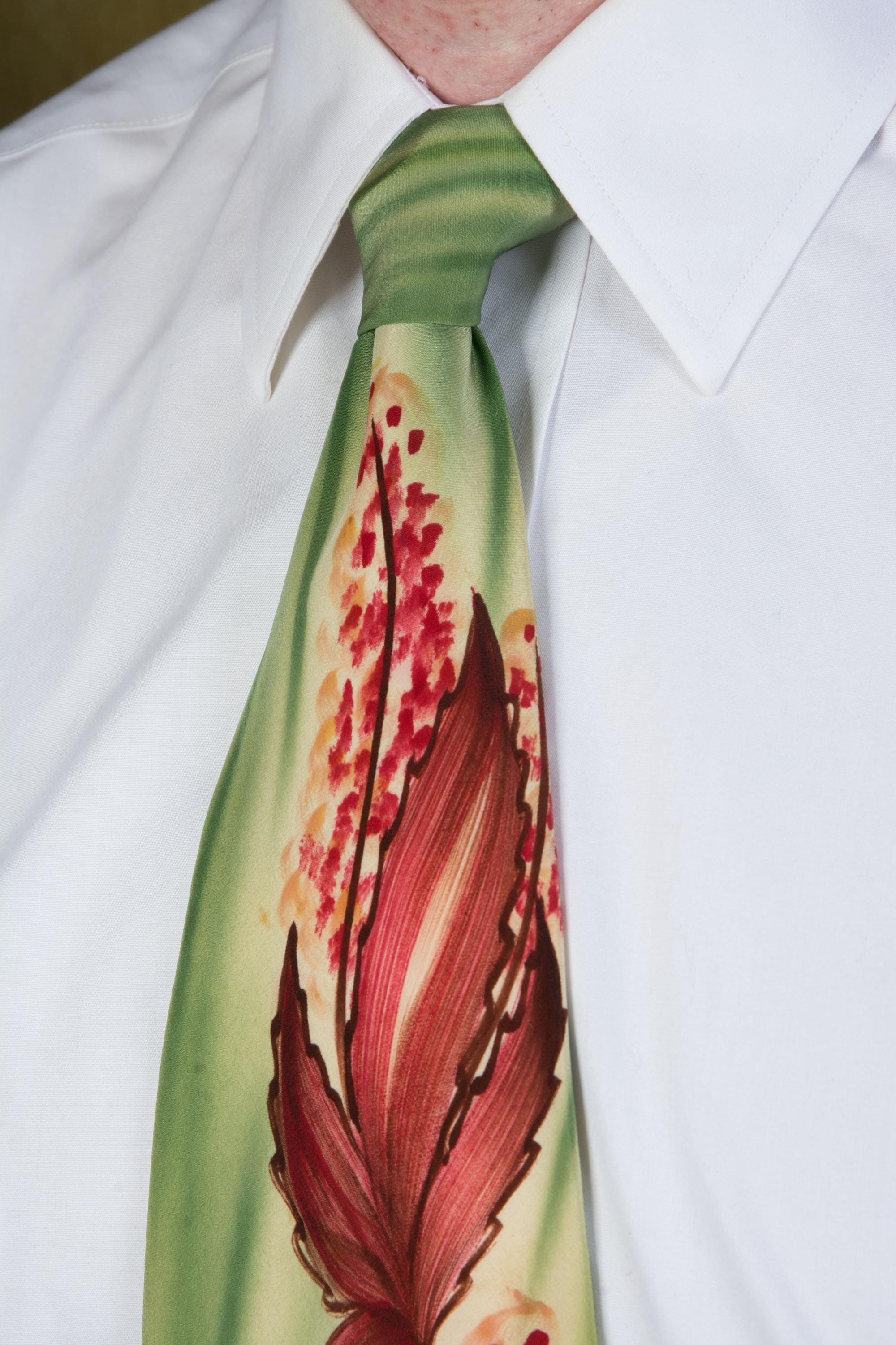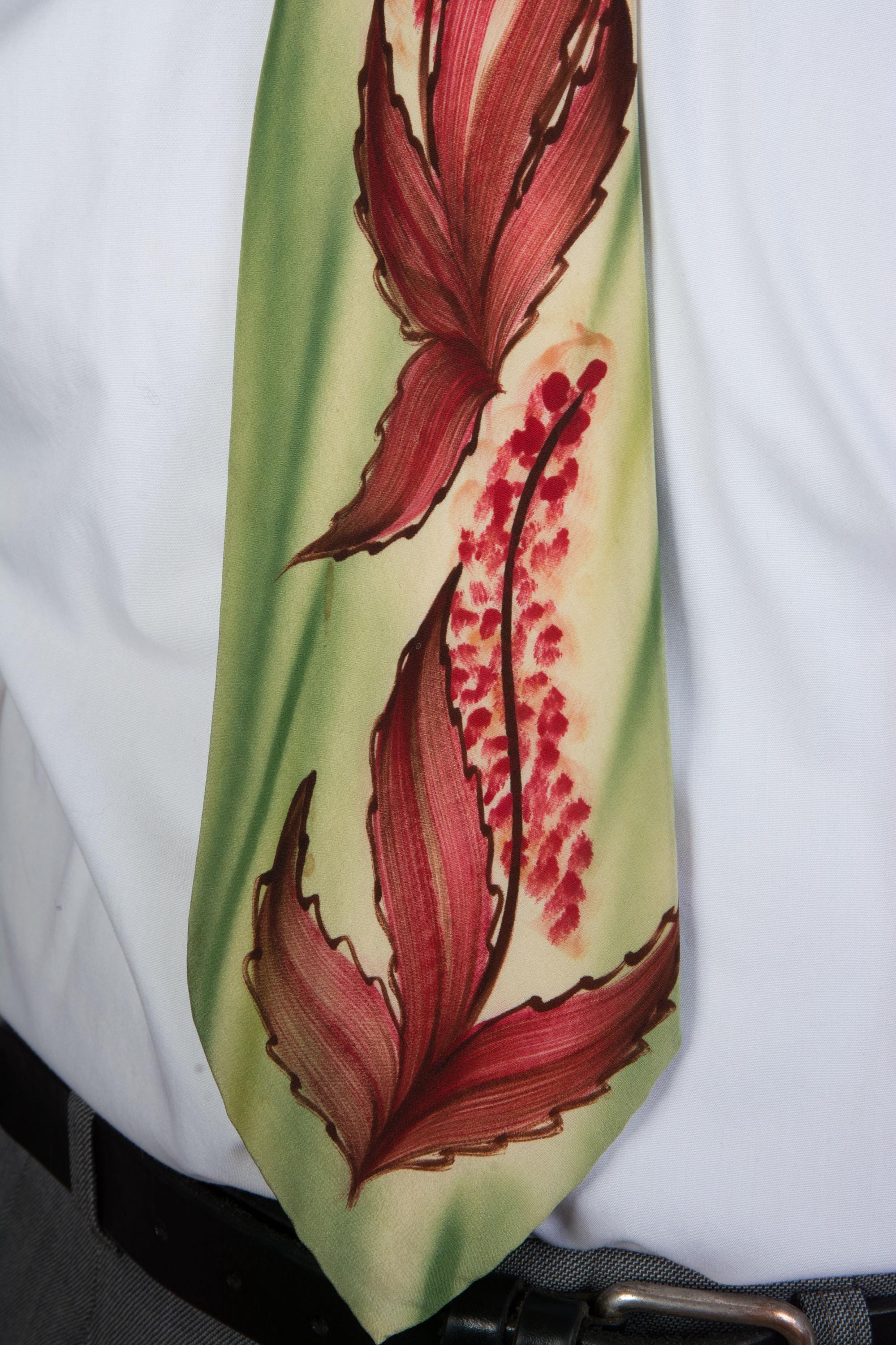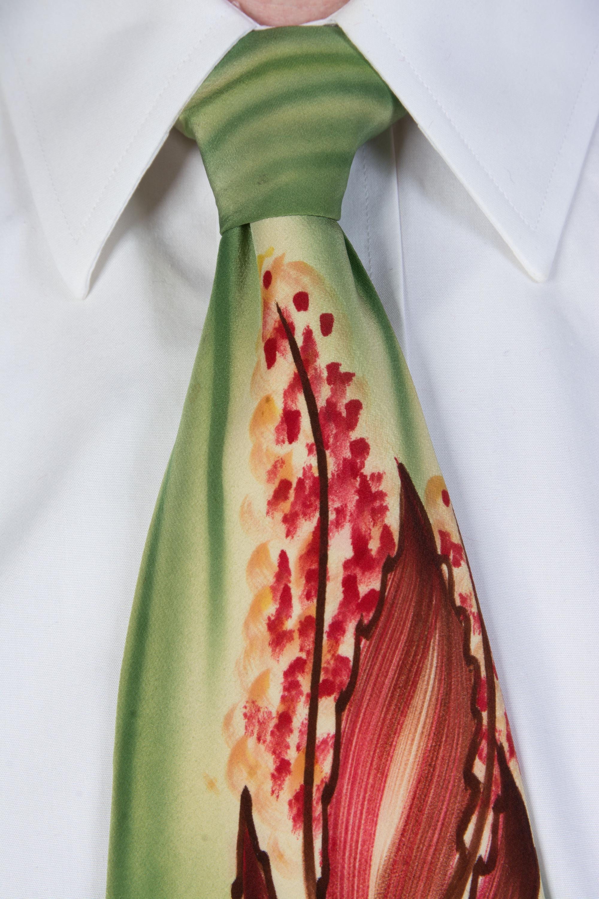 A stunning handpainted tie with striking autumnal art work. The background is brushy, vibrant airbrushed greens, and there's rich reds and browns mixed to create fall leaves and little flowers or berries, reaching to just below the knot. Fully lined in a nylon celanese satin.