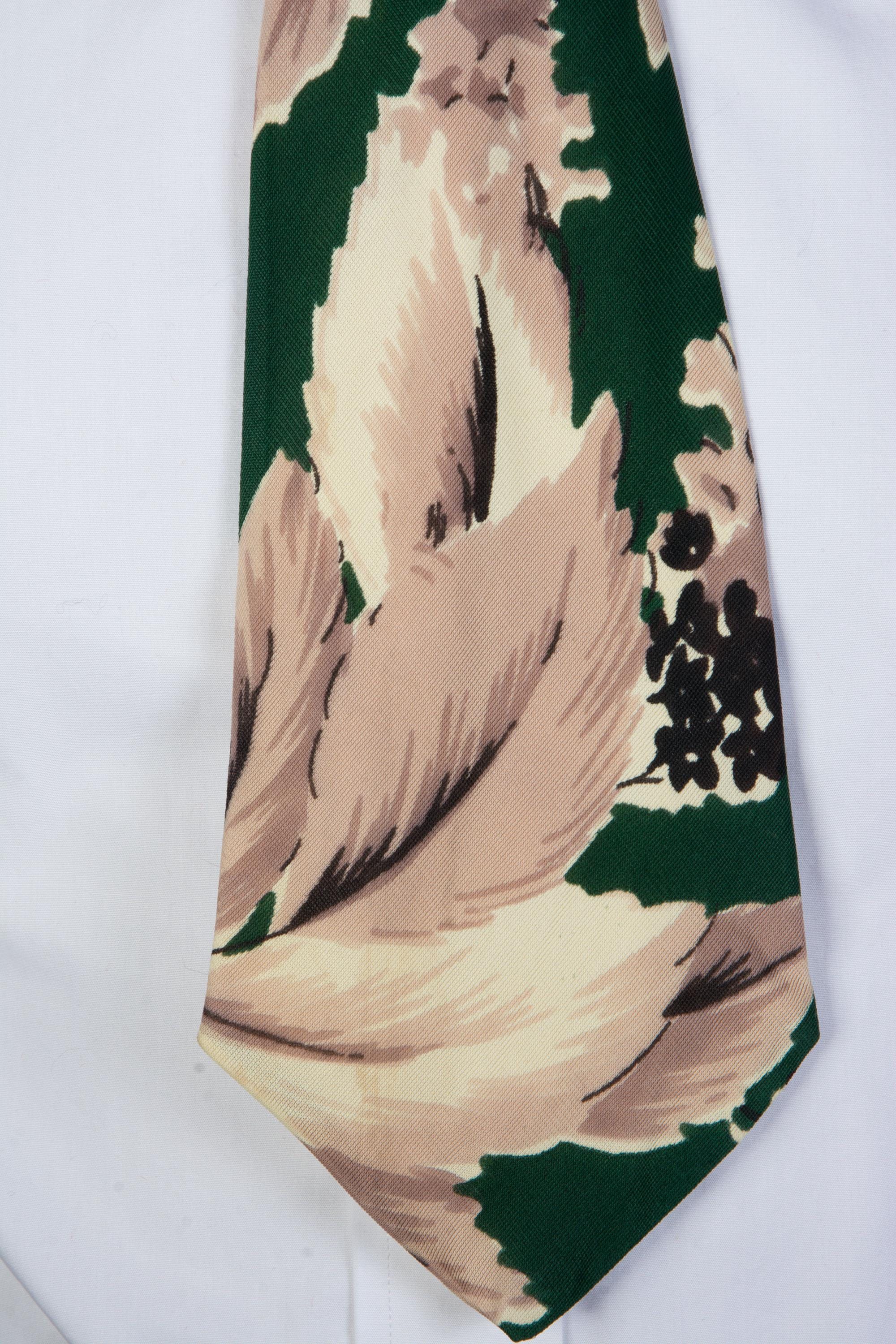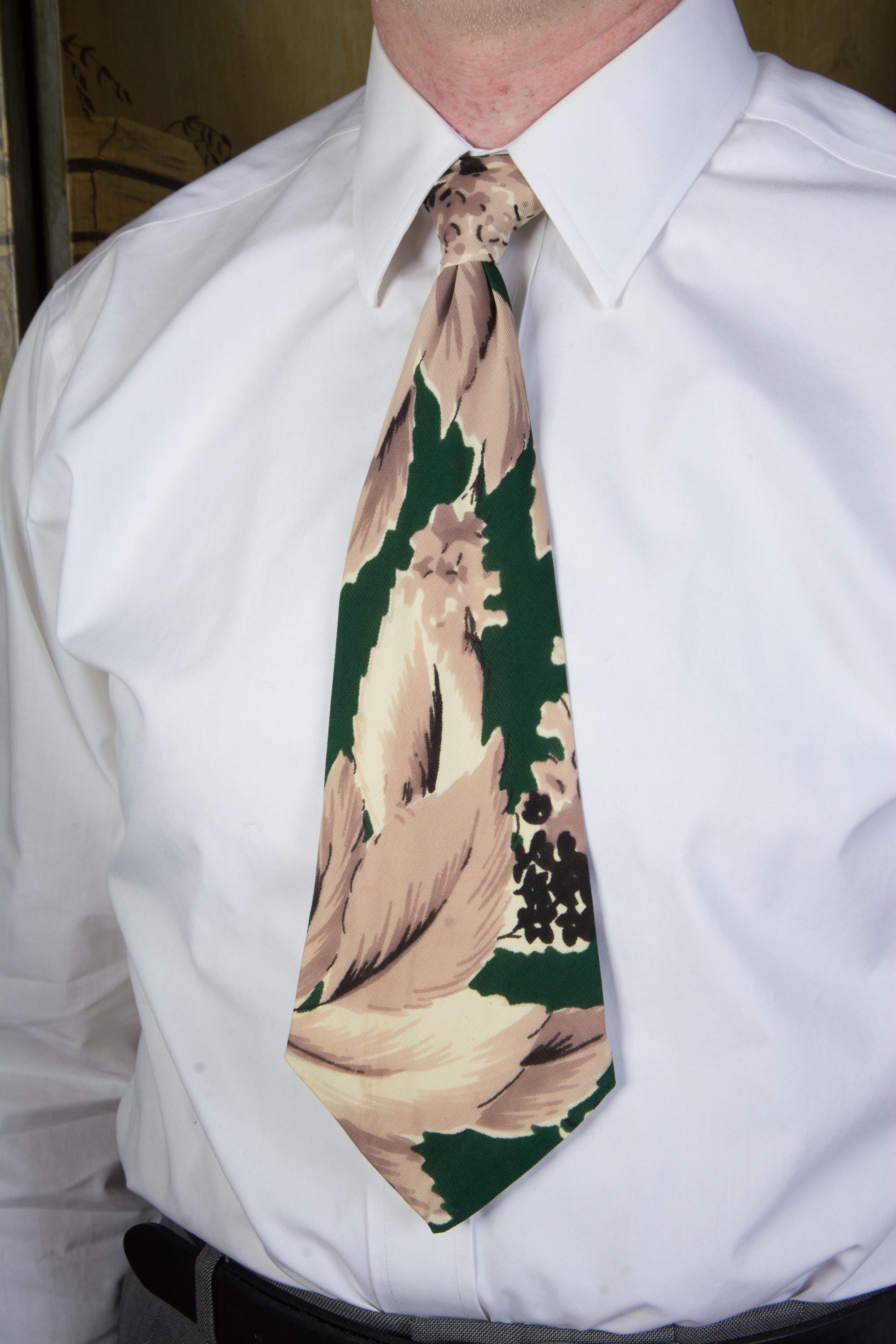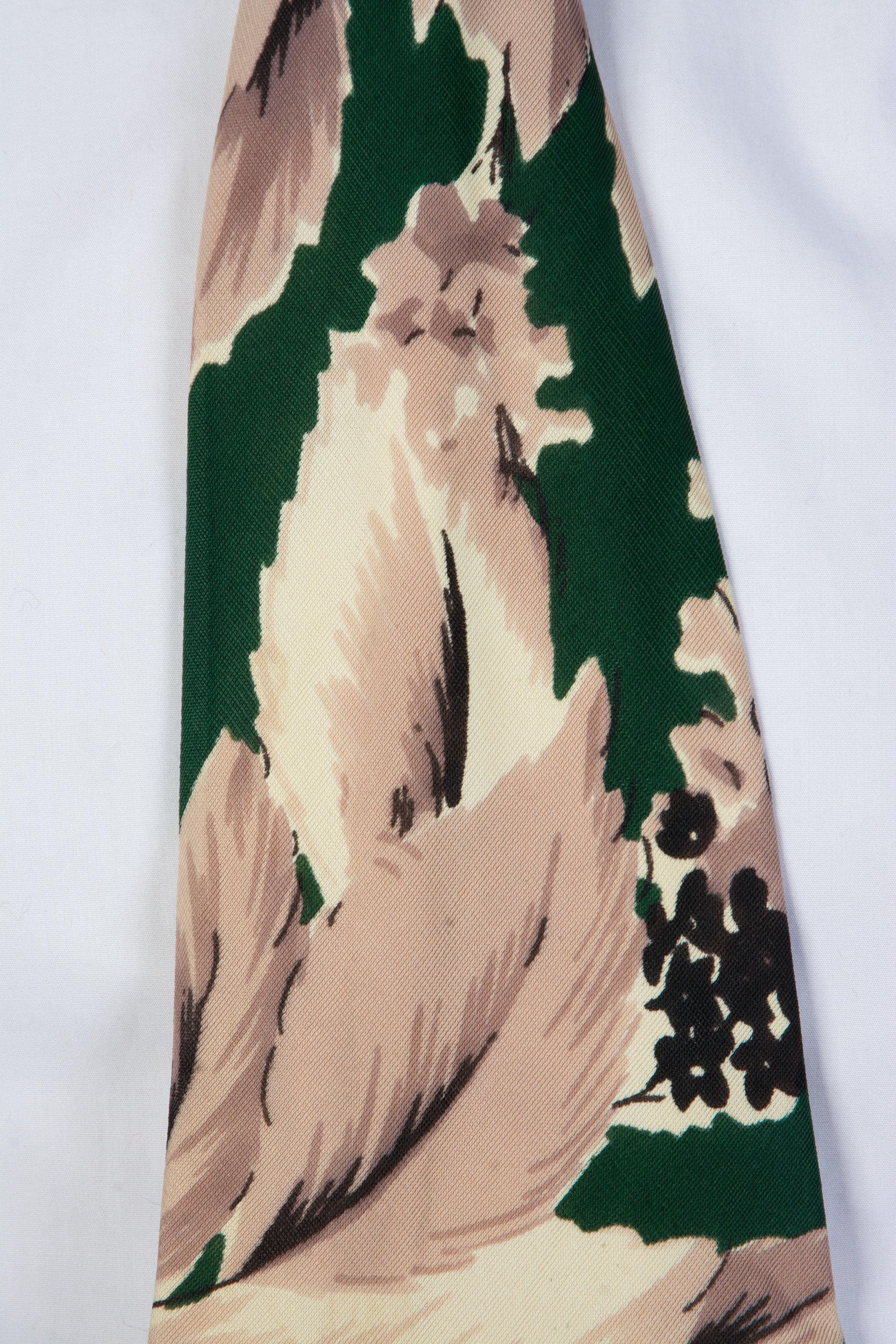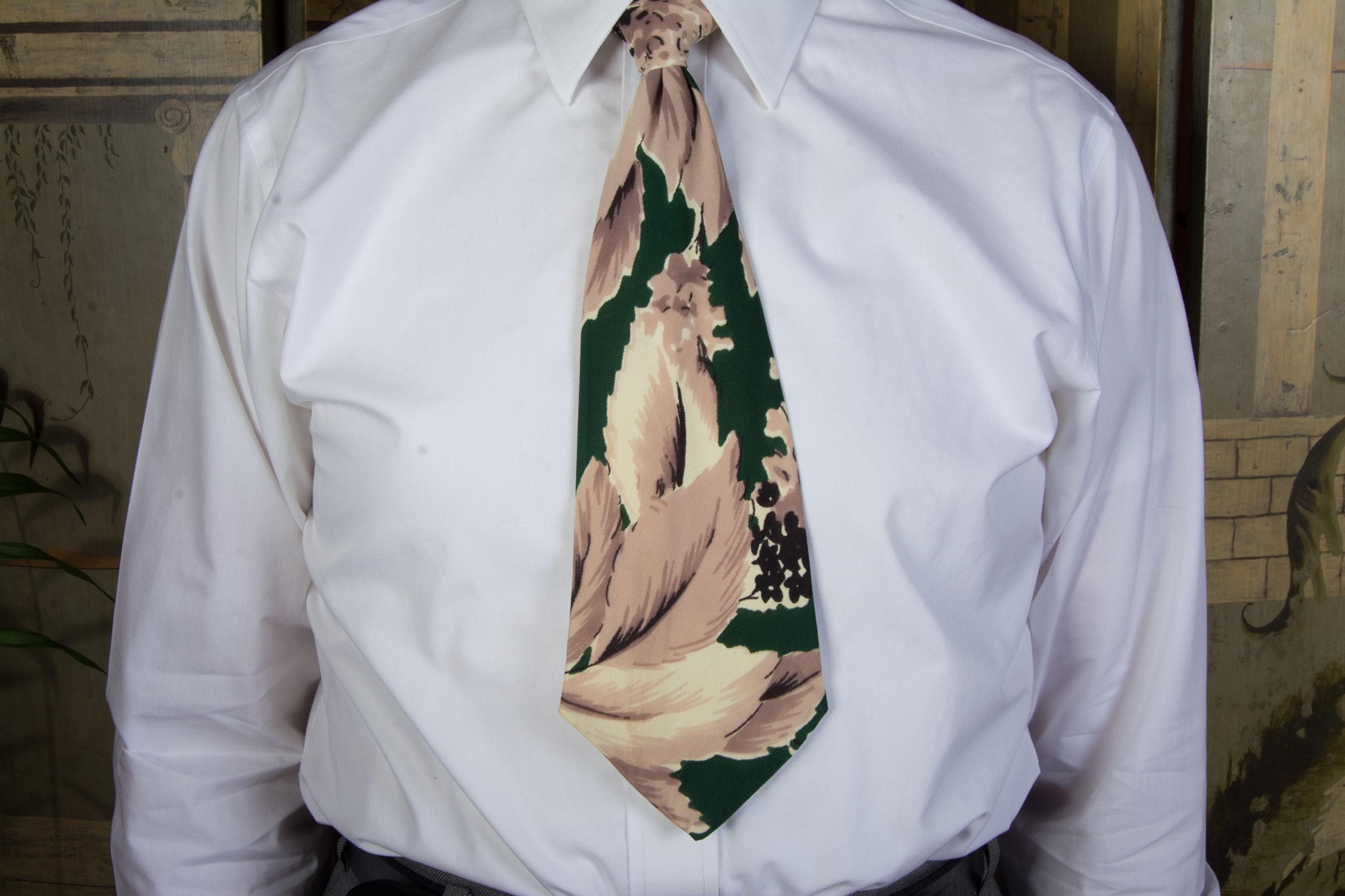 Oh I DO love a rayon jersey necktie, and it is genuinely one of the rarest textiles to find them in! This is a stunning late 1930s or early 40s all rayon jersey, super silky and drapey. The ground is a deep, saturated spruce green color. It's got a leaves and hydrangea floral print doe in ivory, soft beige and taupe, with a touch of soft blacks. It makes a great knot. Fully lined.