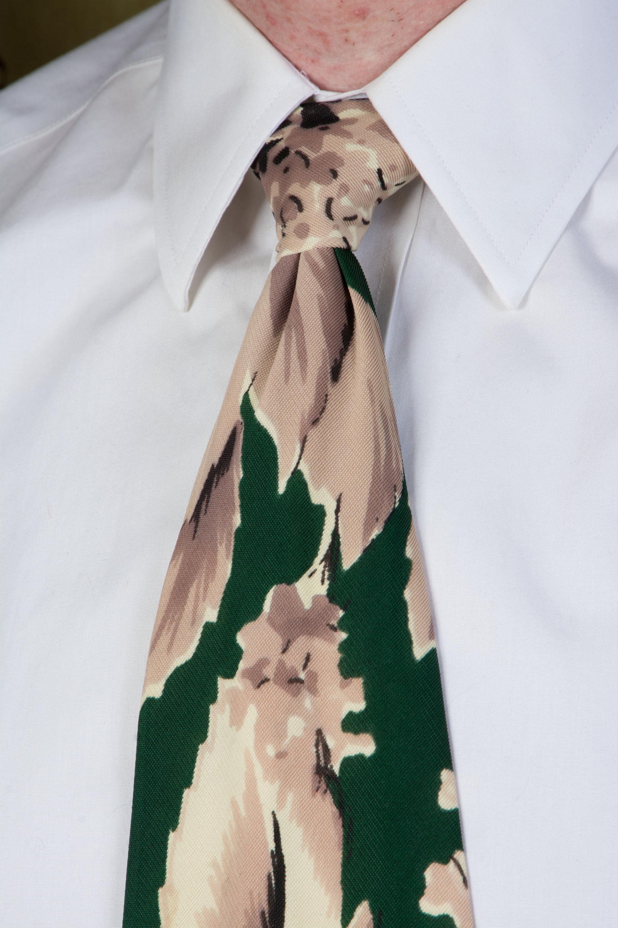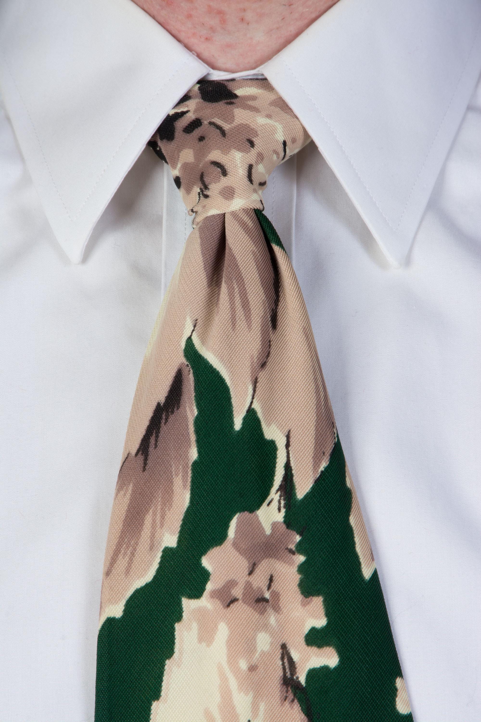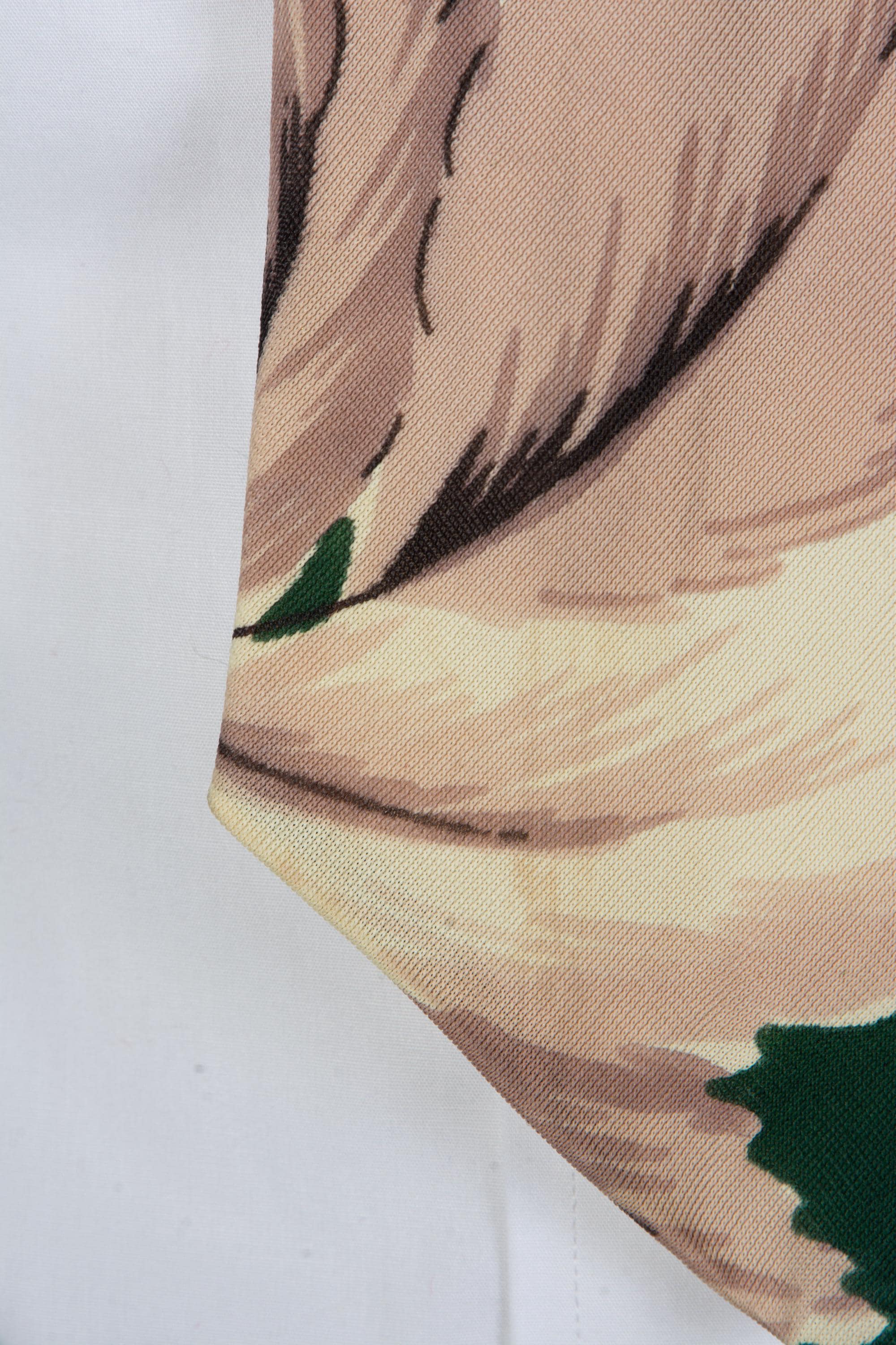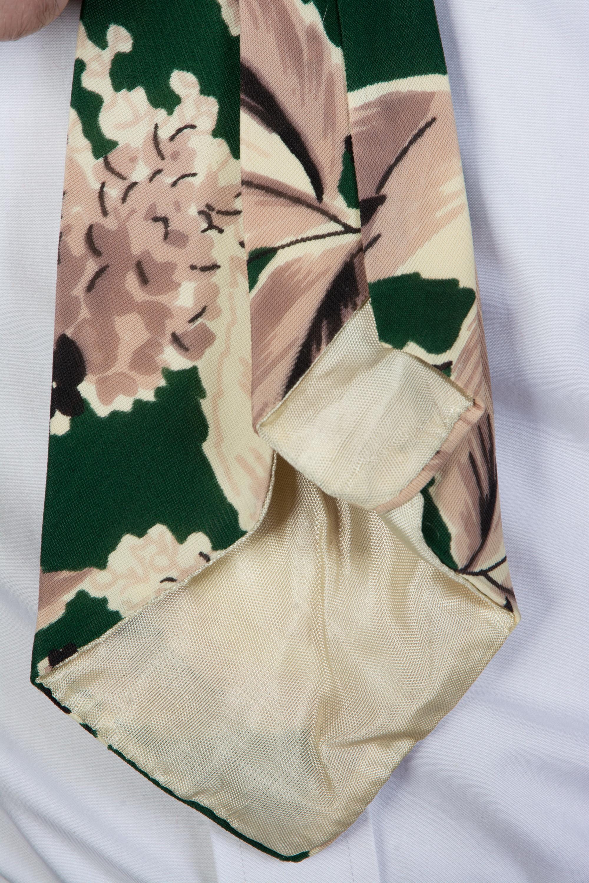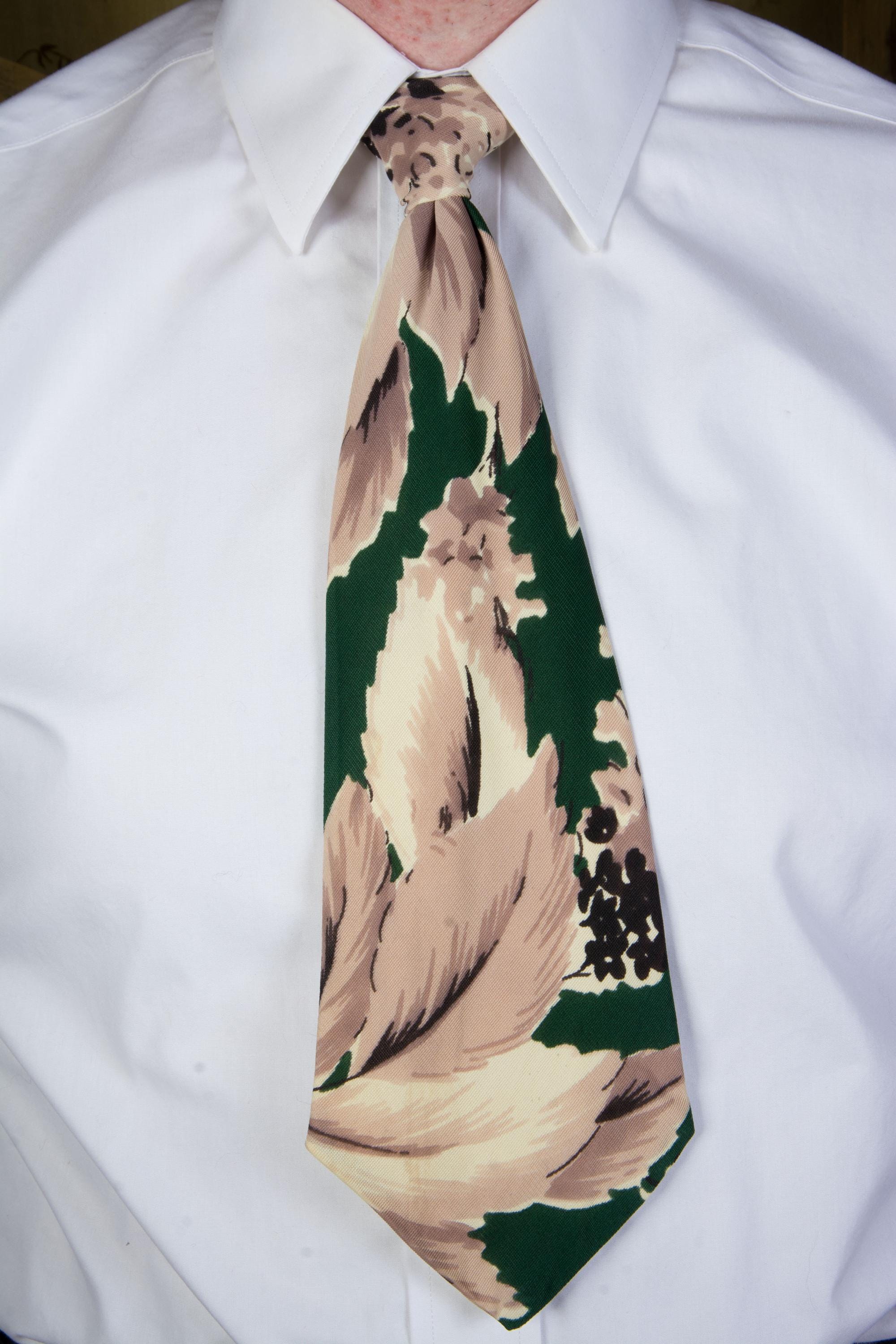 Oh I DO love a rayon jersey necktie, and it is genuinely one of the rarest textiles to find them in! This is a stunning late 1930s or early 40s all rayon jersey, super silky and drapey. The ground is a deep, saturated spruce green color. It's got a leaves and hydrangea floral print doe in ivory, soft beige and taupe, with a touch of soft blacks. It makes a great knot. Fully lined.