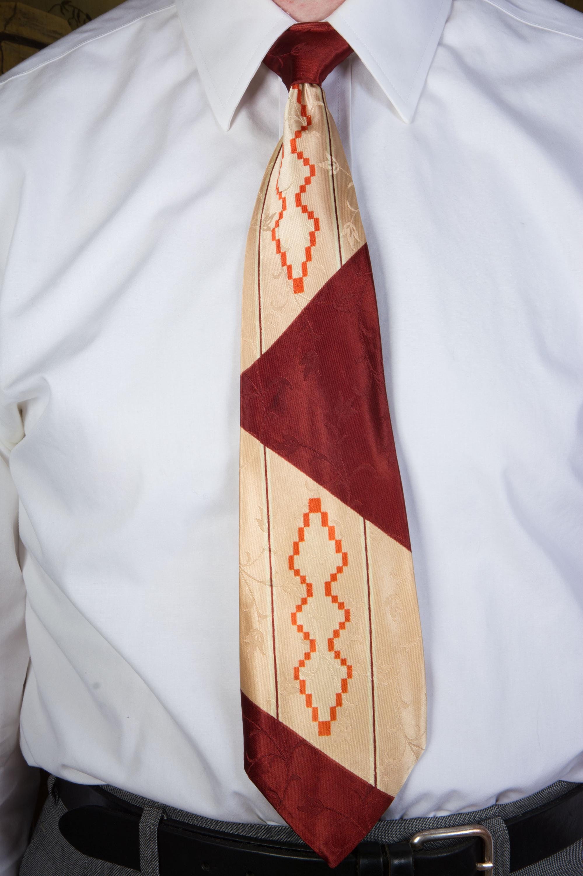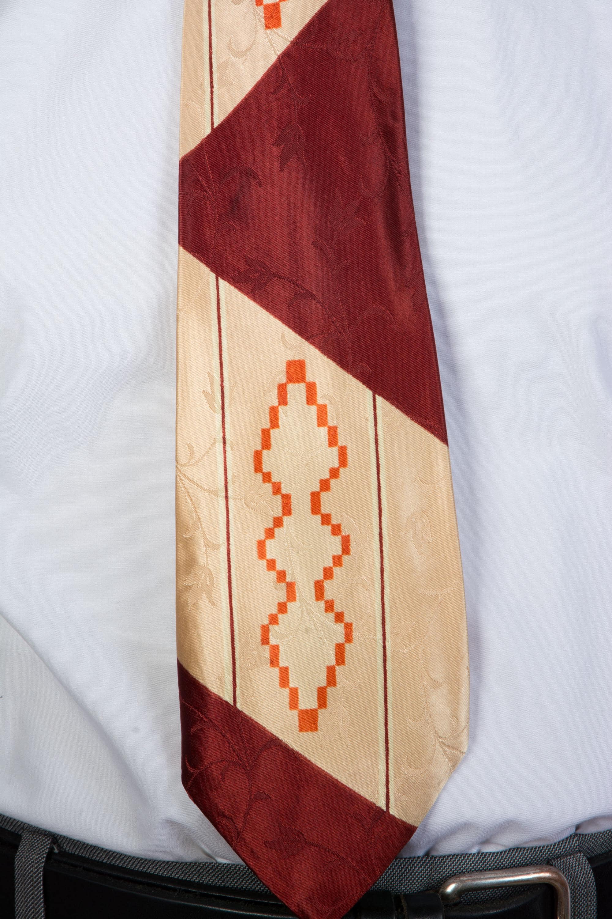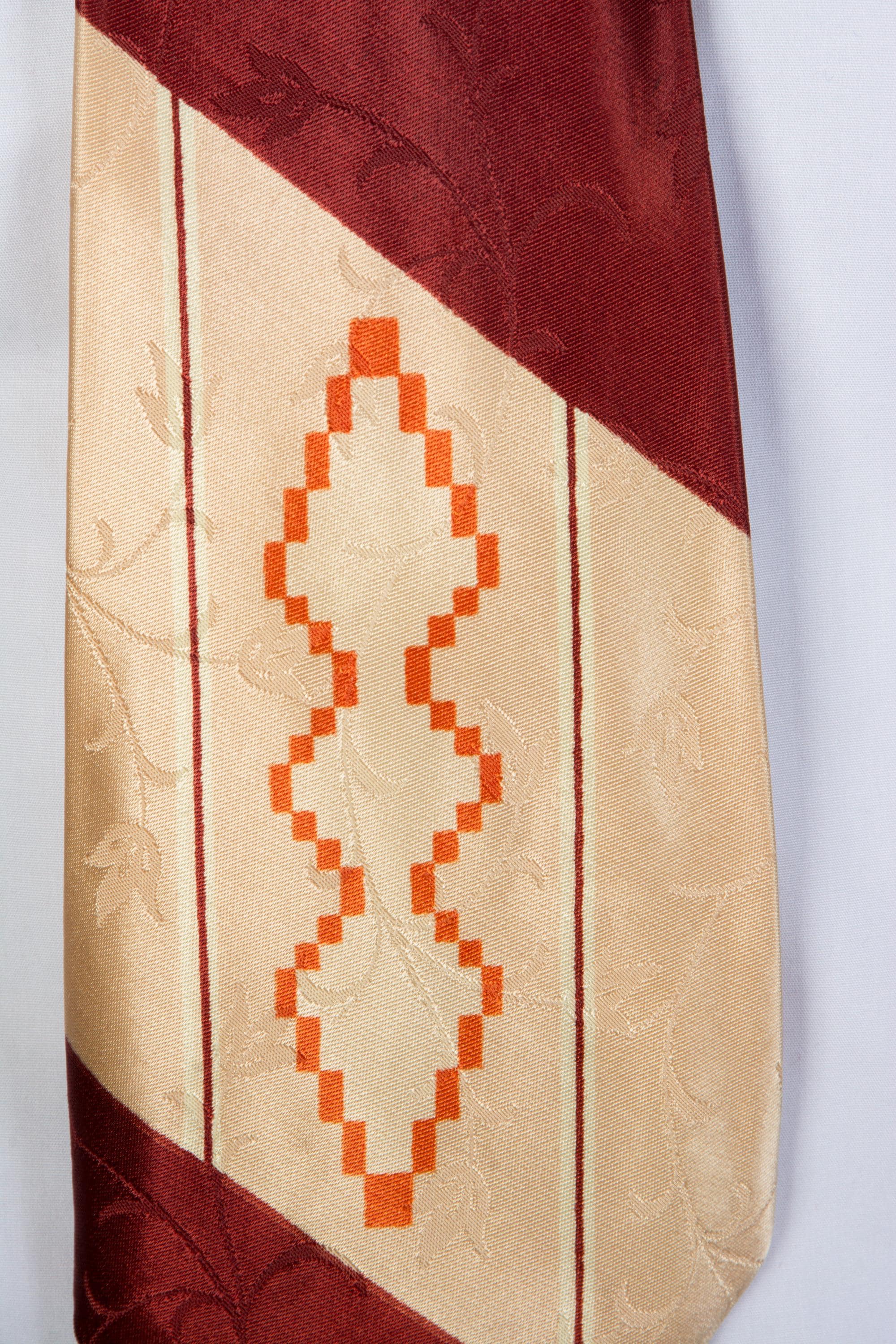 If you love a really glossy tie, here's a winner for you! Vintage late 1940s or early 40s is a shiny satin with a background brocade of climbing vines, and a color block effect in peach and burgundy with southwest inspired orange accents - the shapes feel very Chimayo. This is fully lined.