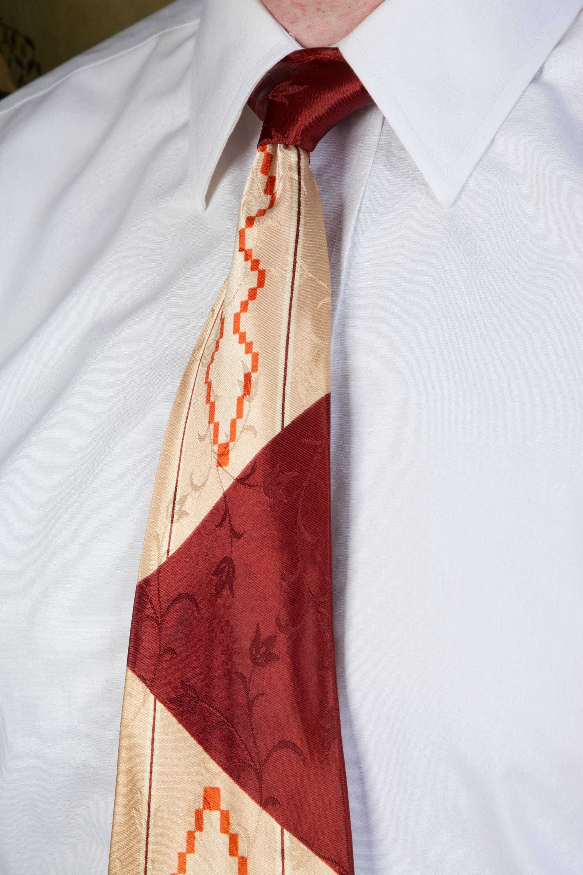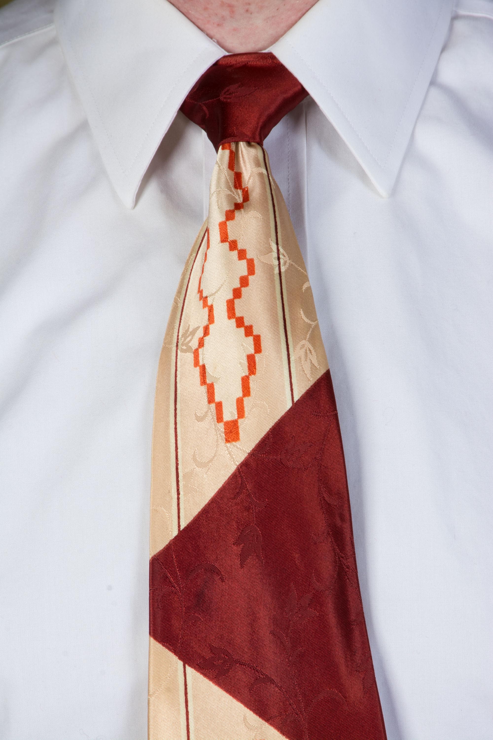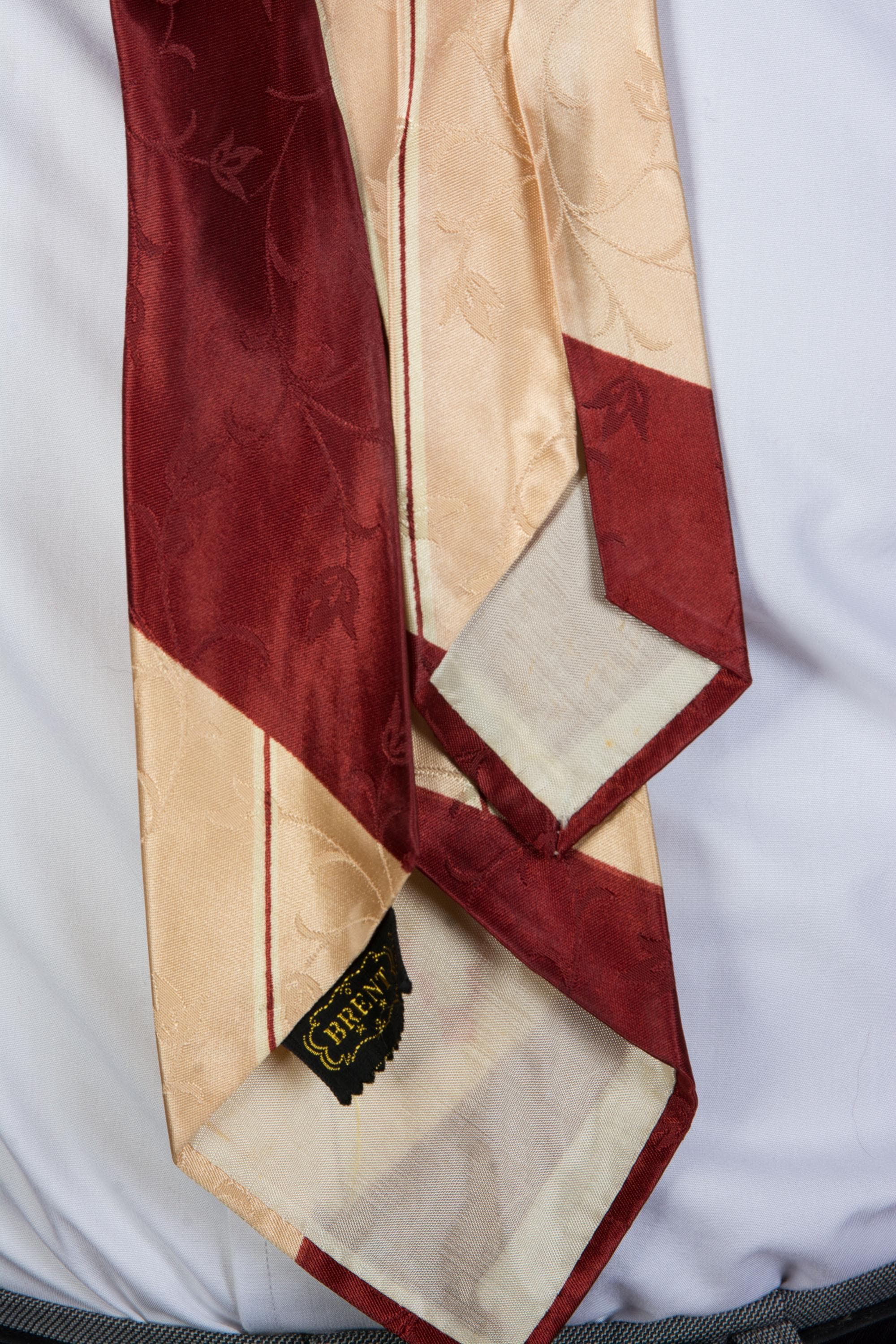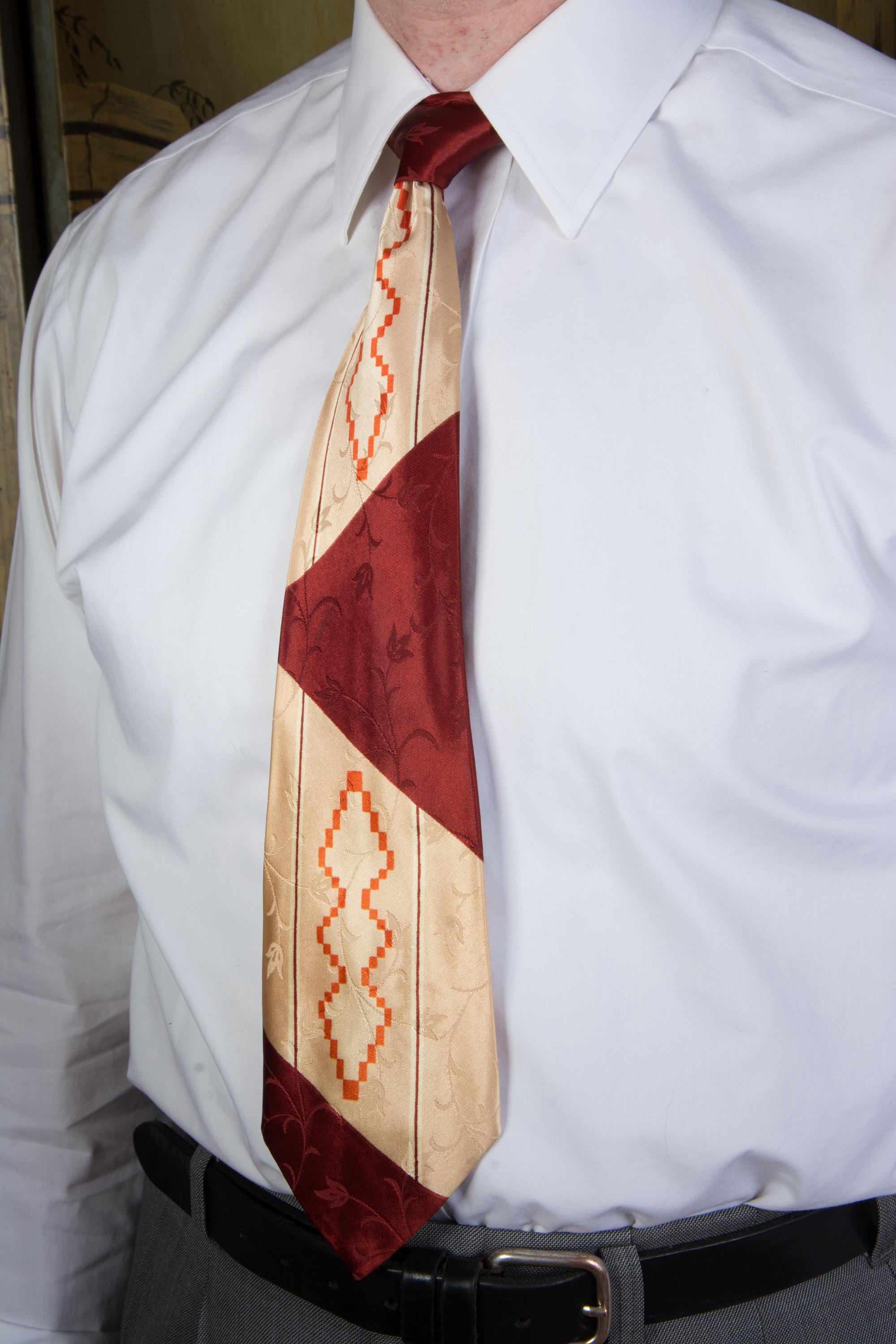 If you love a really glossy tie, here's a winner for you! Vintage late 1940s or early 40s is a shiny satin with a background brocade of climbing vines, and a color block effect in peach and burgundy with southwest inspired orange accents - the shapes feel very Chimayo. This is fully lined.