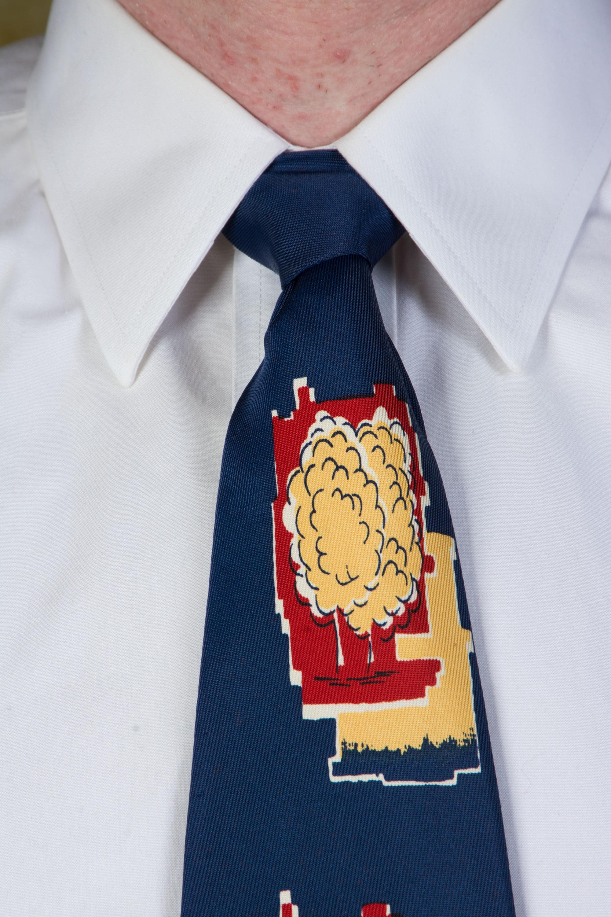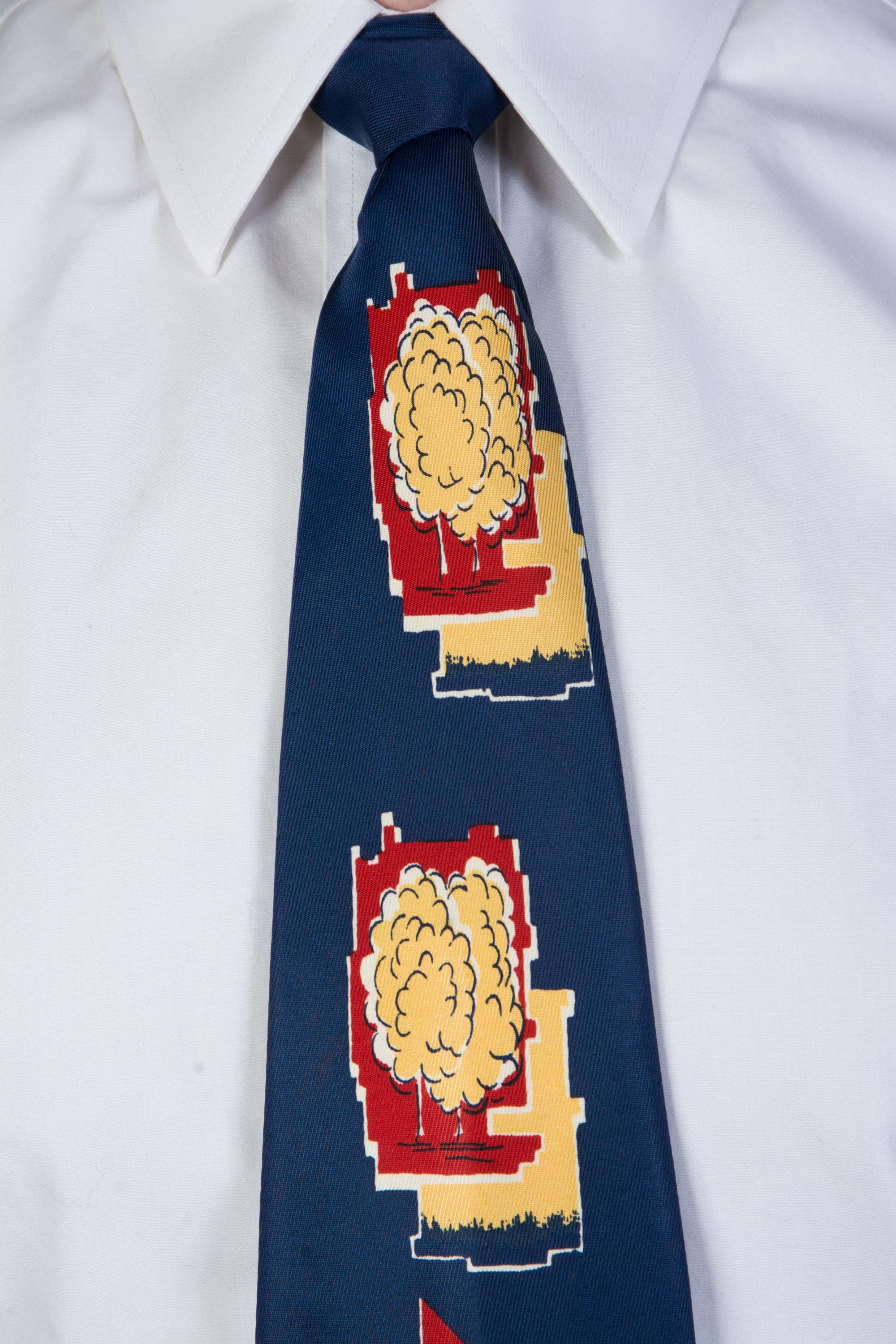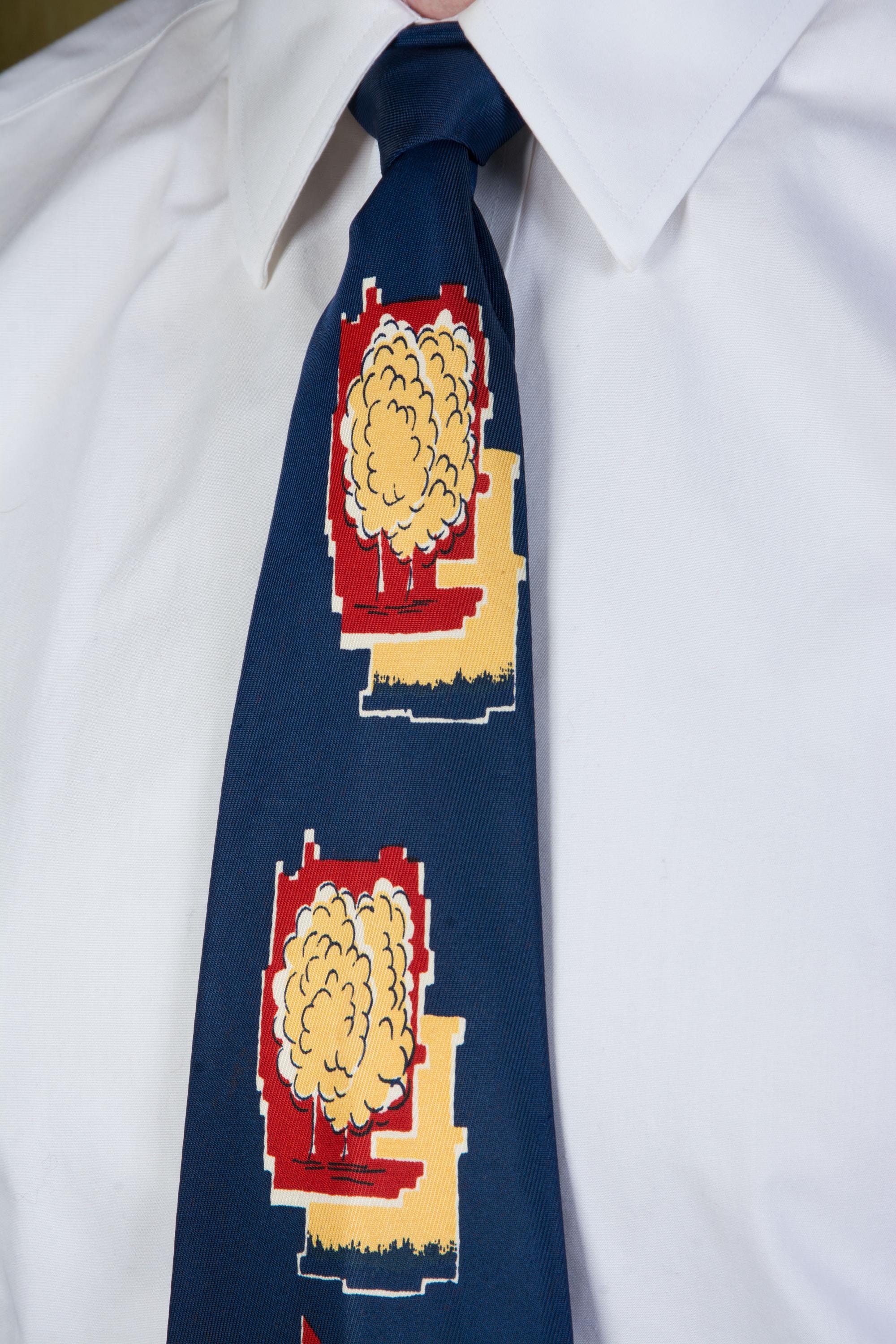 A terrific time in almost-primary hues - a deep blue, a dark red, butter yellow. This is a matte tie, printed on a finely draped rayon and acetate blend faille. The hashes feel military inspired, and the trees in boxes feel like they were lifted out of the yellow windows behind them - it's a big surrealist. This is fully lined.