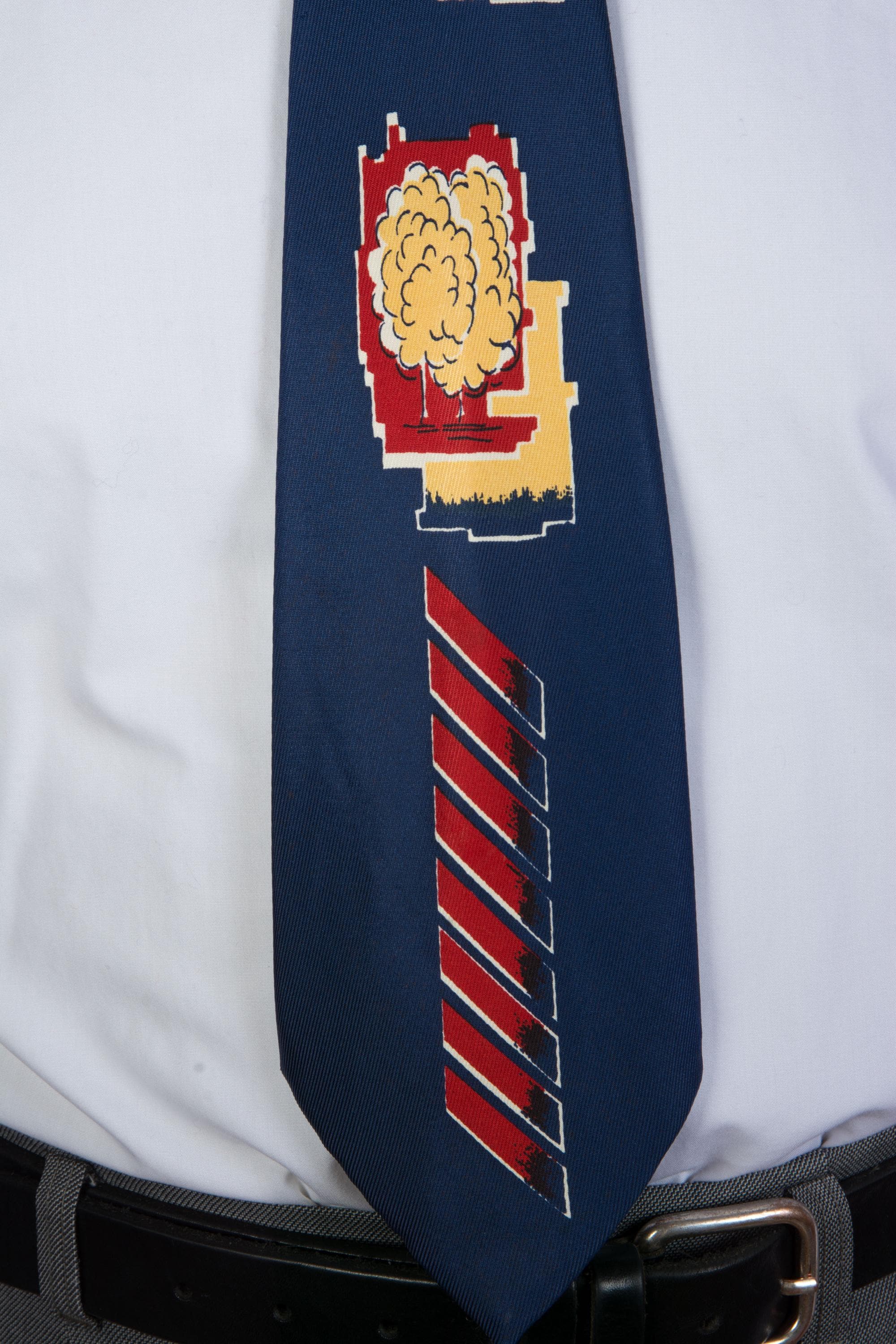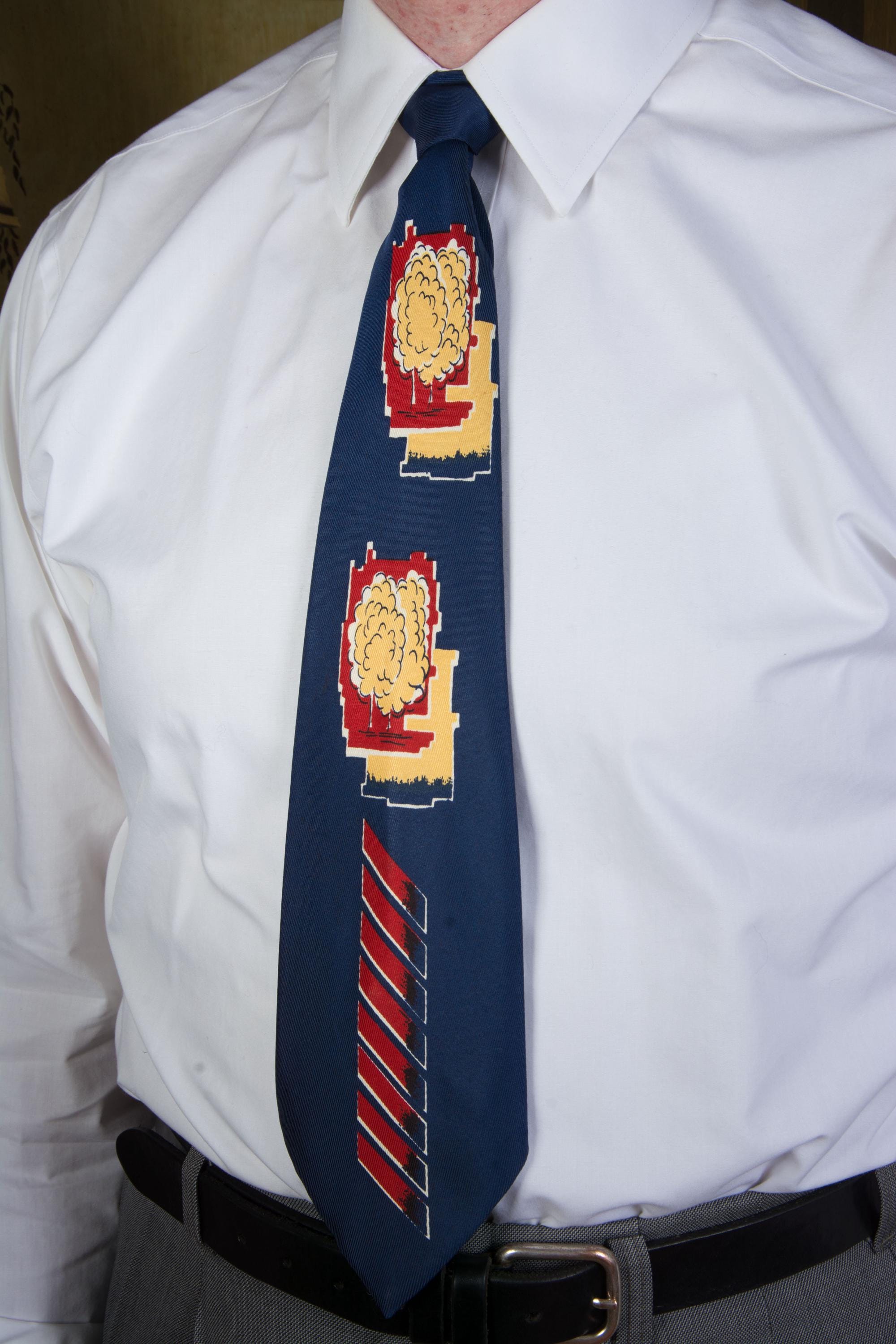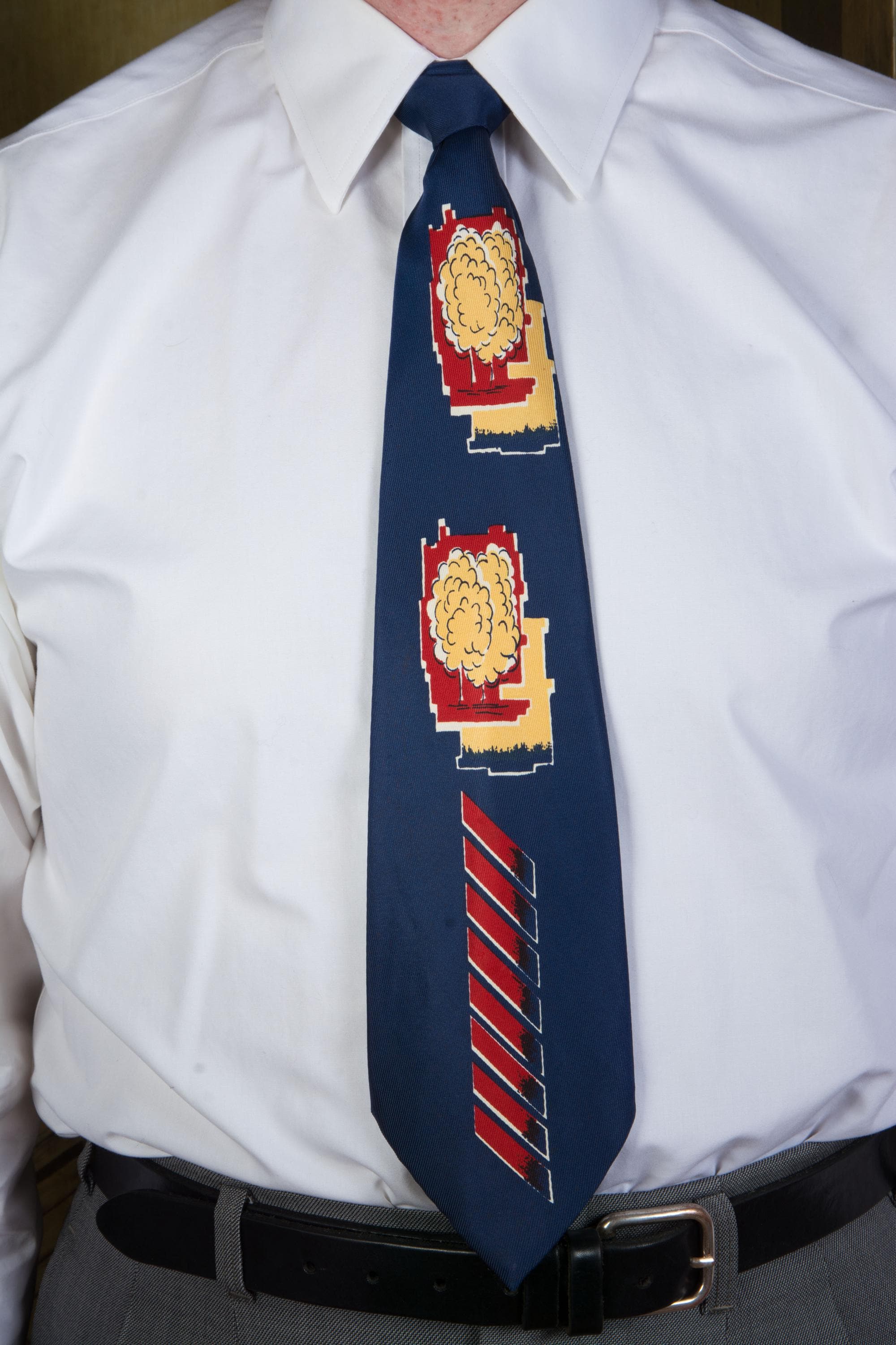 A terrific time in almost-primary hues - a deep blue, a dark red, butter yellow. This is a matte tie, printed on a finely draped rayon and acetate blend faille. The hashes feel military inspired, and the trees in boxes feel like they were lifted out of the yellow windows behind them - it's a big surrealist. This is fully lined.