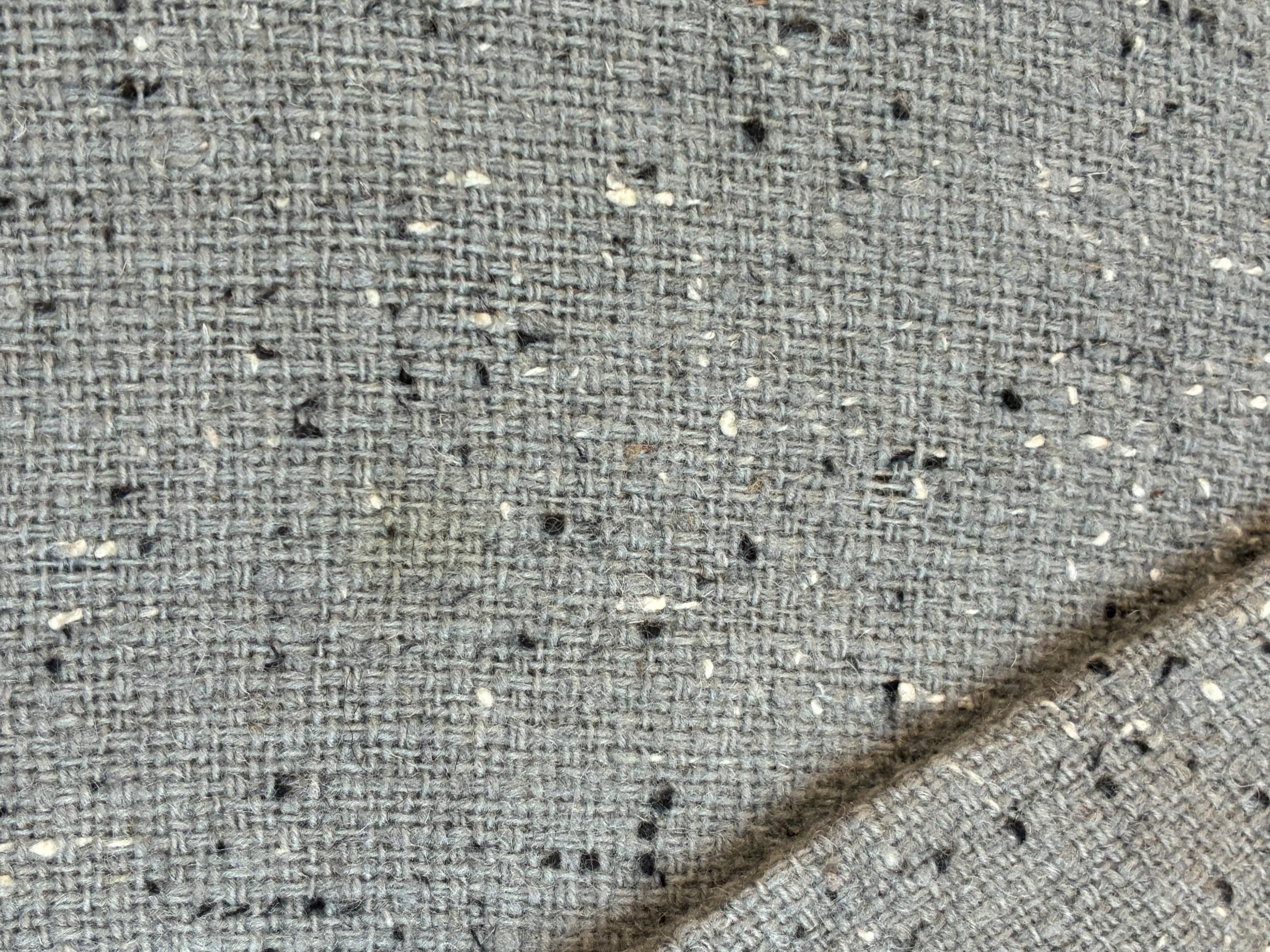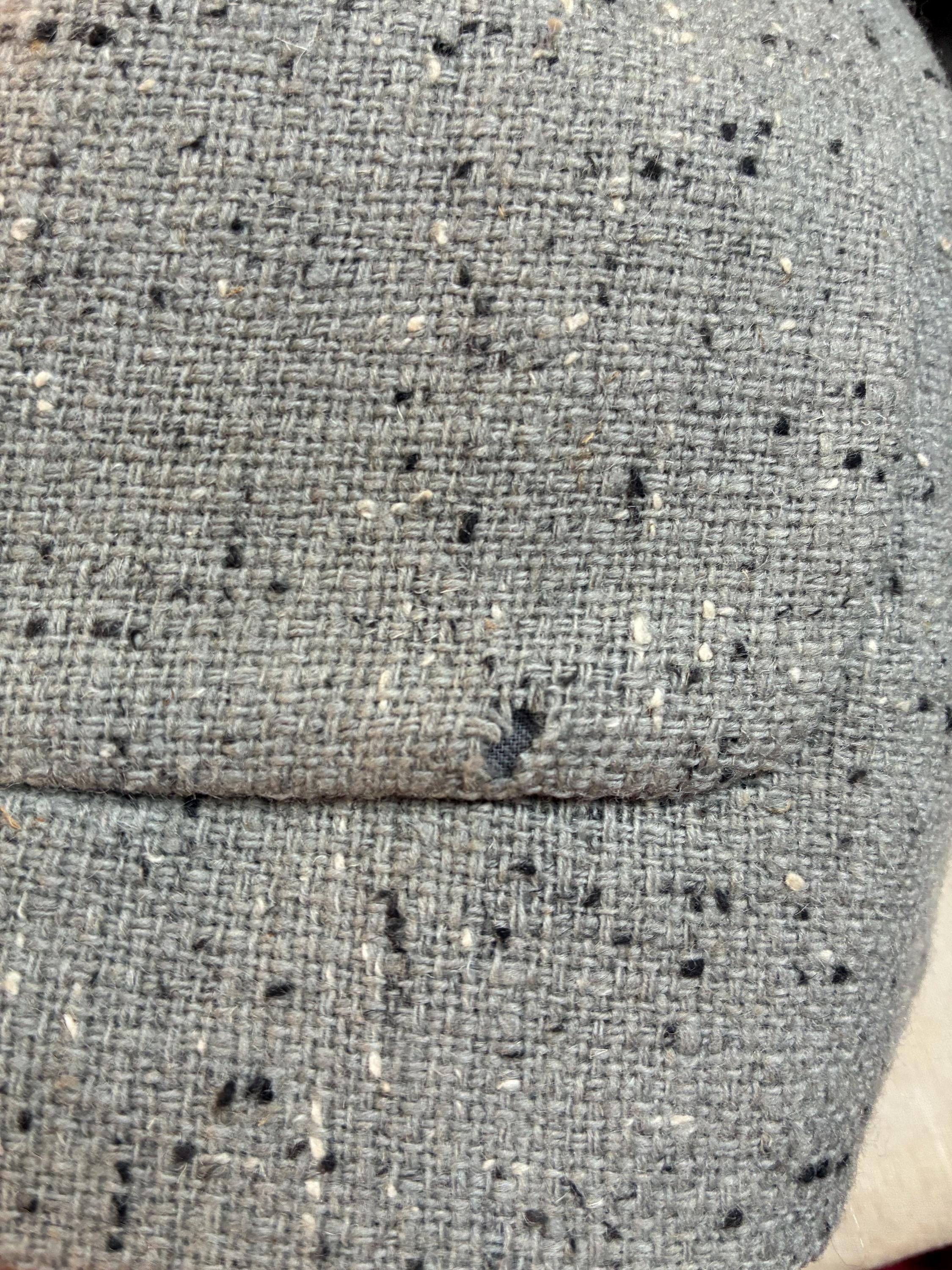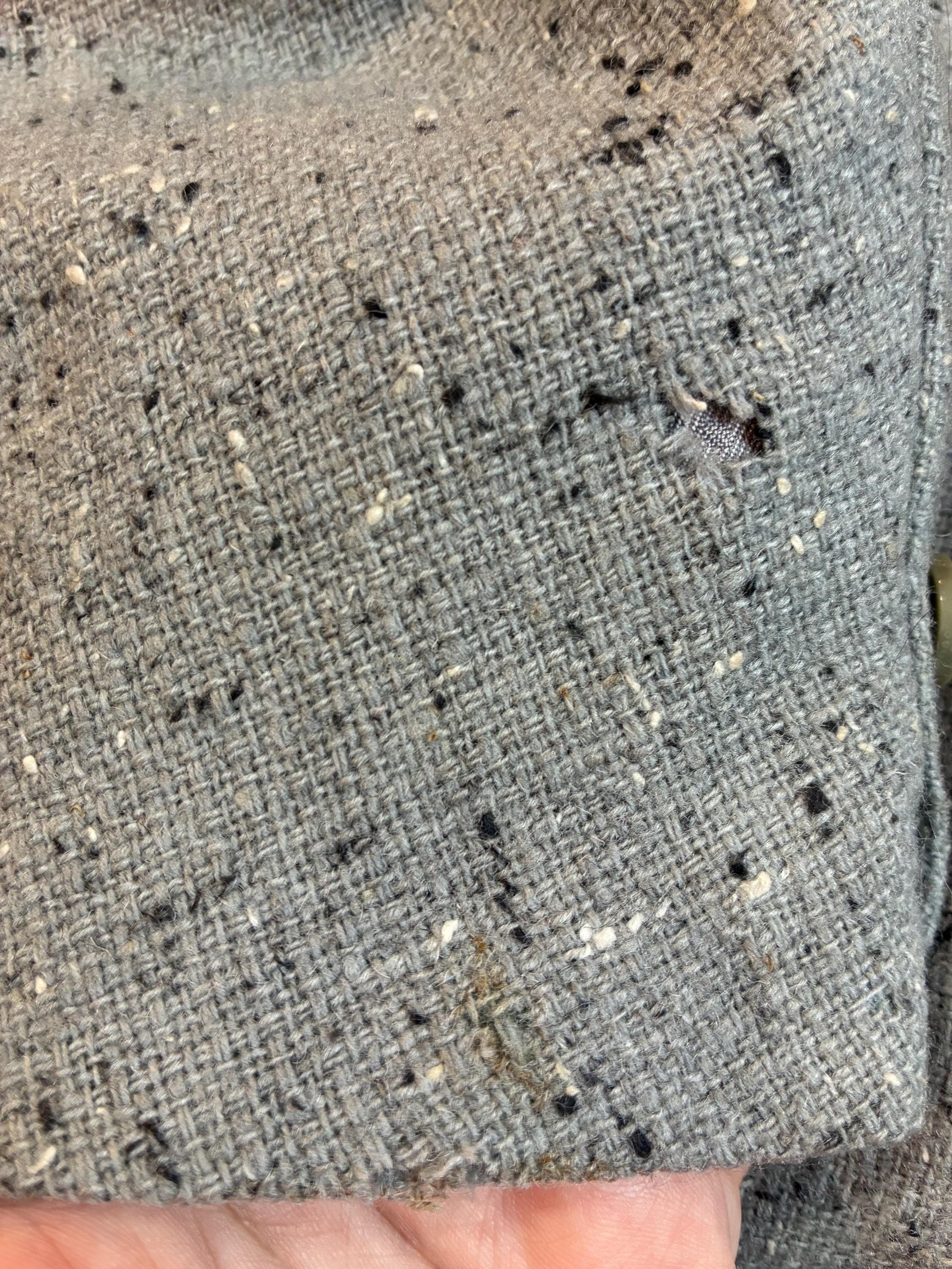 Drycleaned by the consignor, but not more recently cleaned by me. The right sleeve has a few spots and a cluster of moth chews, with a little larger hole a bit further up - see photo. I found one hole at the corner of the left pocket, one at the back right shoulder and one on the back center hem. There's some very light spots to the right of the collar, and two yellowed spots at the lower right hem. See photos for flaws. The busy tweed really helps hide them, it wears well. Priced with imperfections in mind.