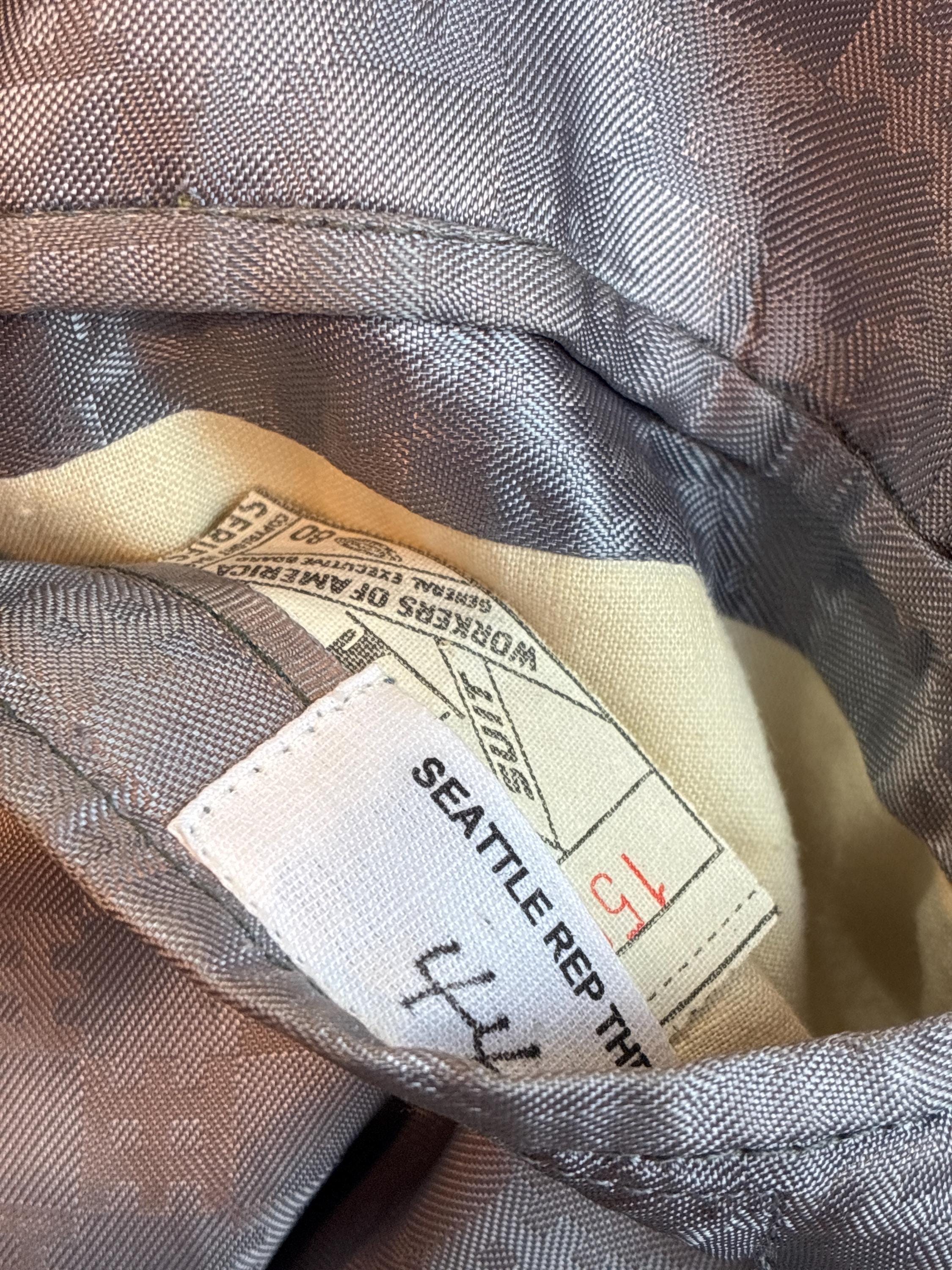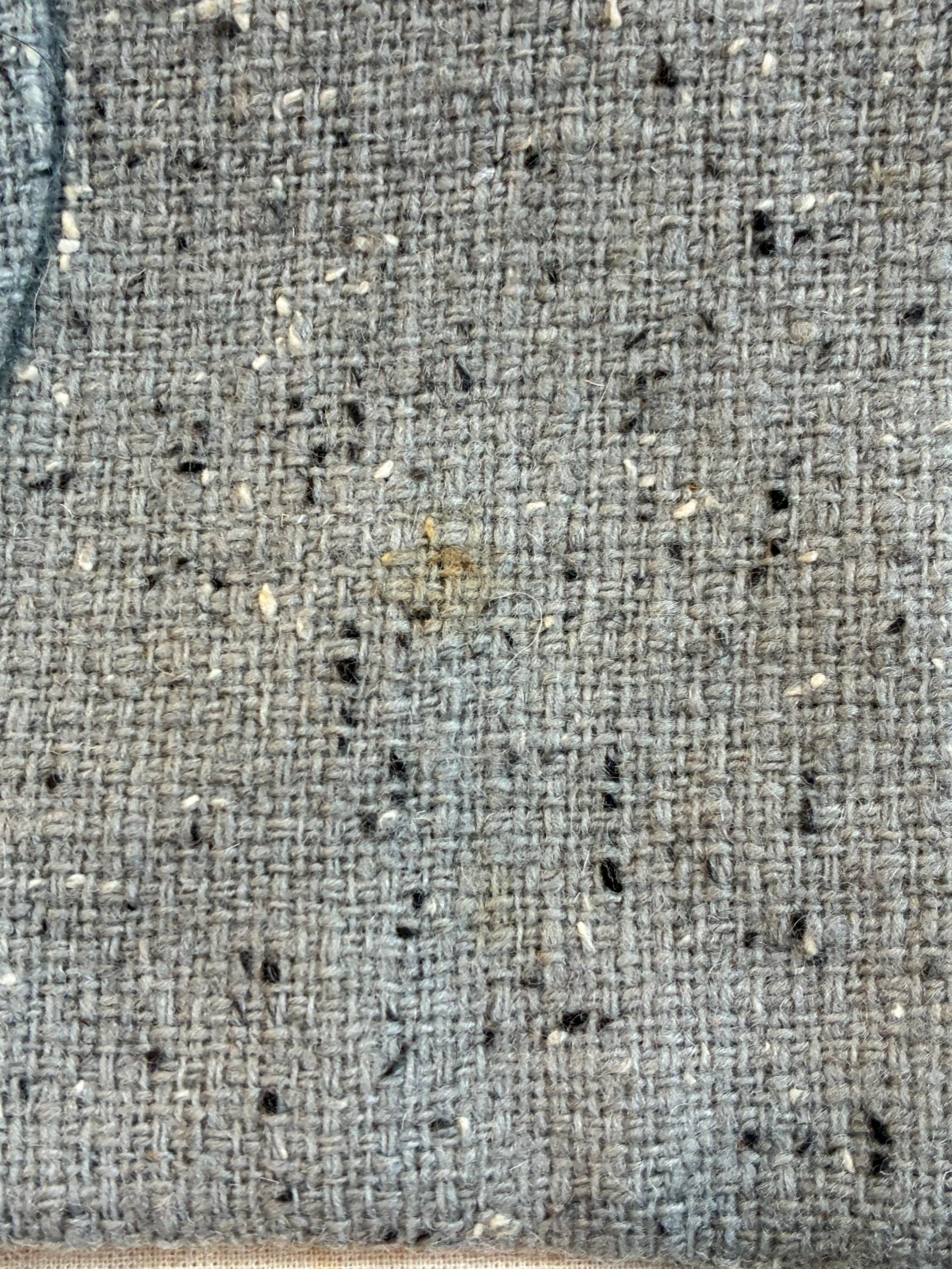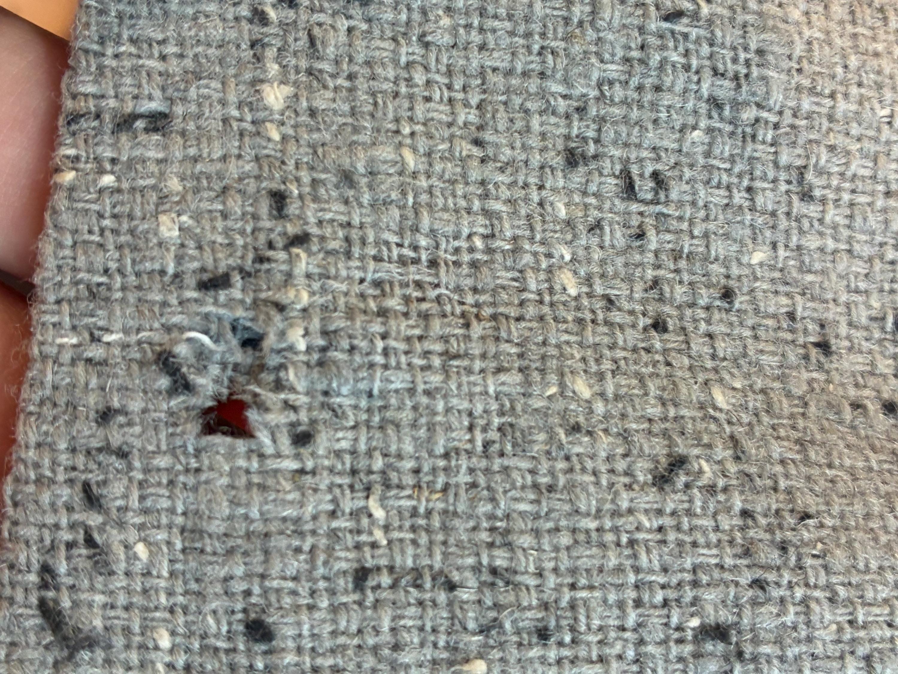 Drycleaned by the consignor, but not more recently cleaned by me. The right sleeve has a few spots and a cluster of moth chews, with a little larger hole a bit further up - see photo. I found one hole at the corner of the left pocket, one at the back right shoulder and one on the back center hem. There's some very light spots to the right of the collar, and two yellowed spots at the lower right hem. See photos for flaws. The busy tweed really helps hide them, it wears well. Priced with imperfections in mind.