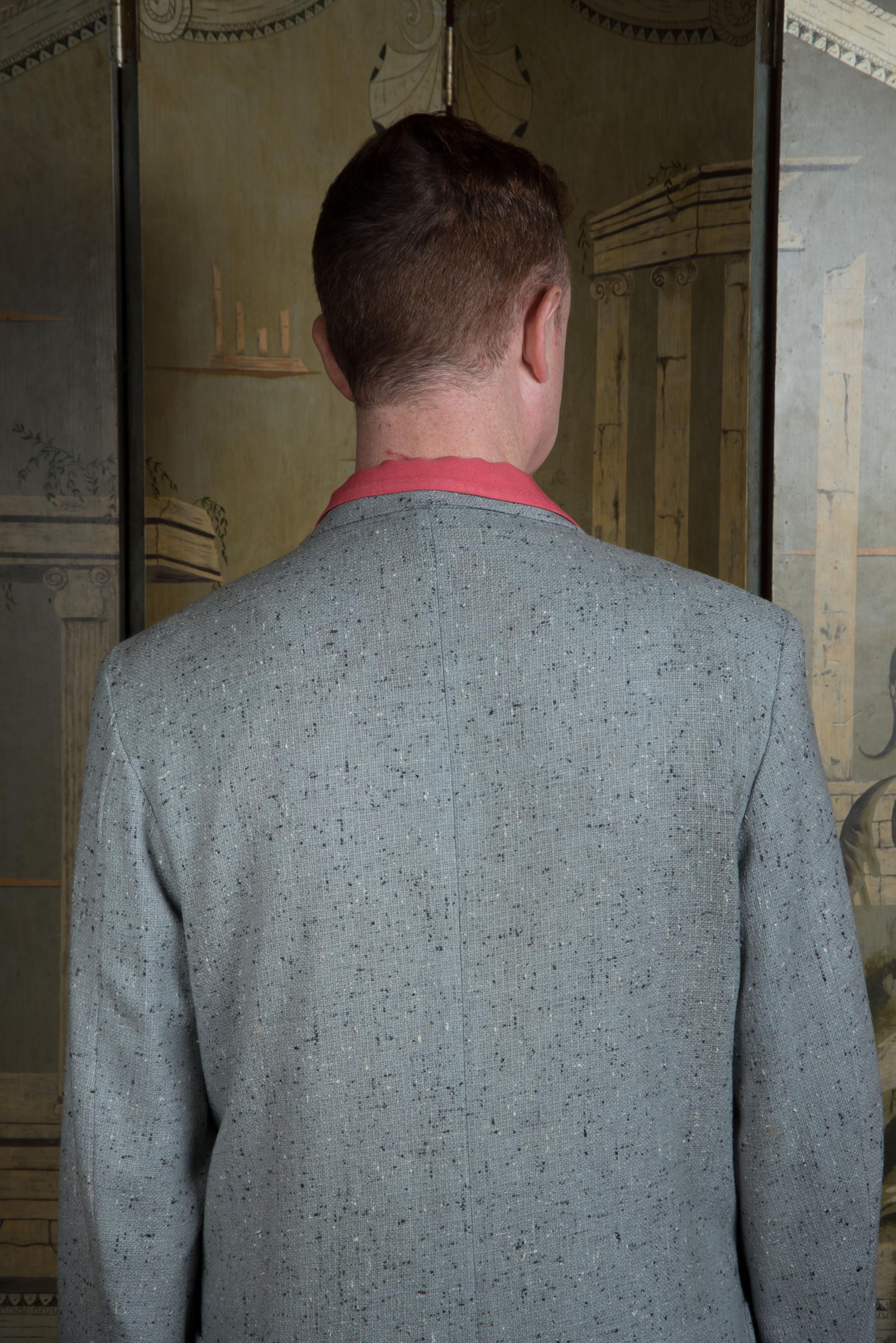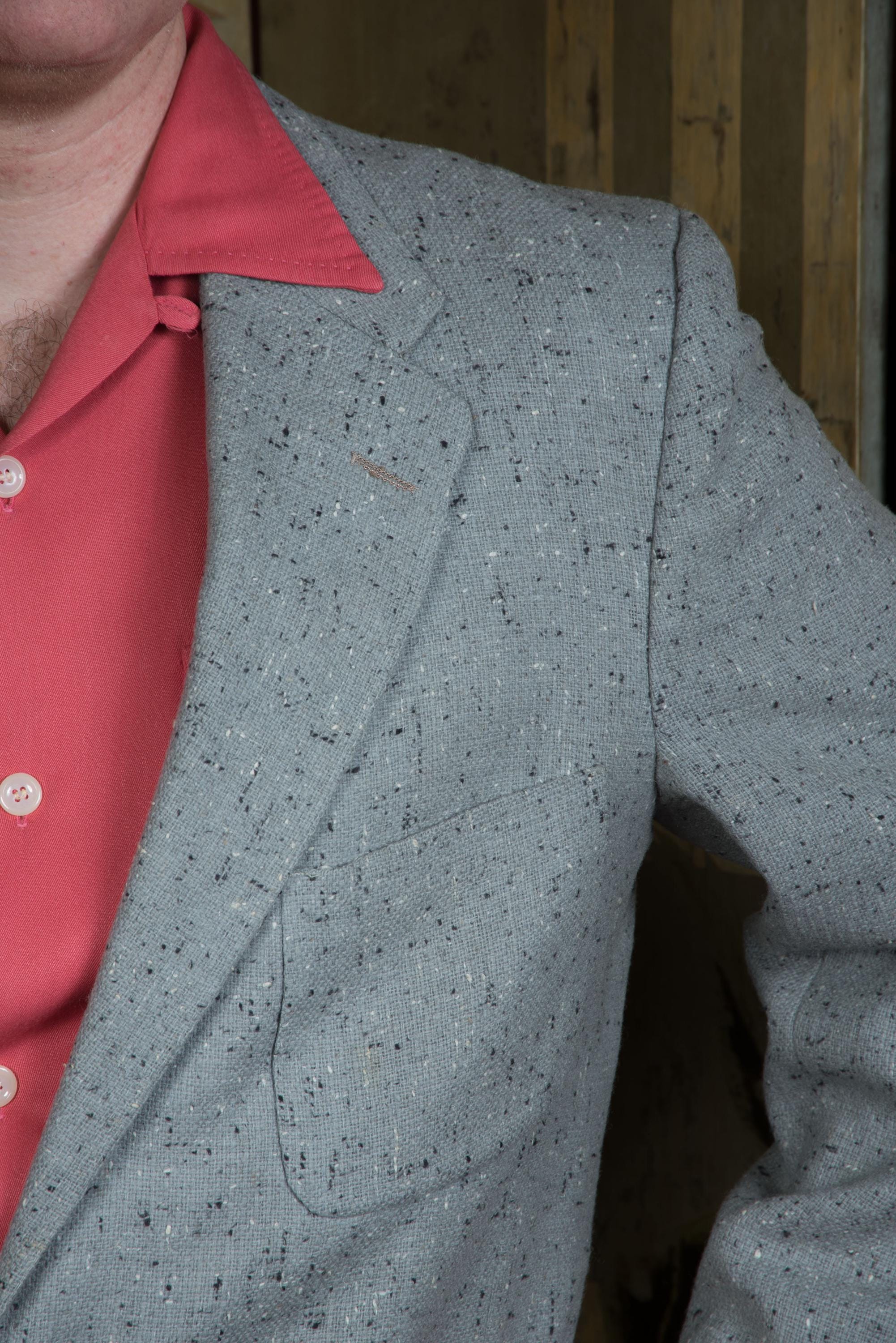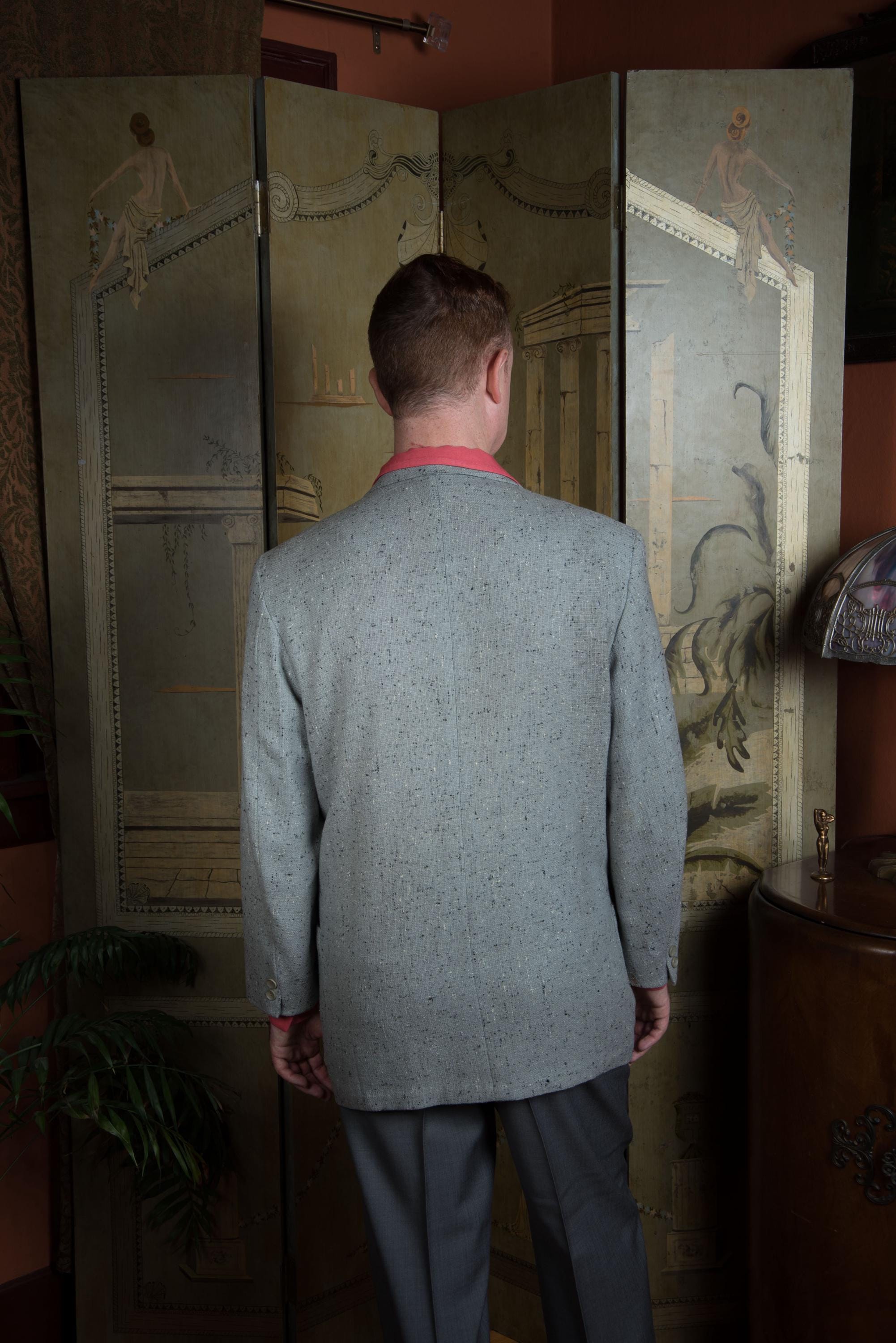 A sporty, easy wearing vintage 1950s wool tweed sportcoat with a smart fleck of black and white on cool grey. It has wide notched lapels and a casually low gorge. The three patch pockets are quintessential, a rockabilly favorite for a reason. This features petal lining through the back yoke and the selvage is machine finished. There is a single internal breast pocket.