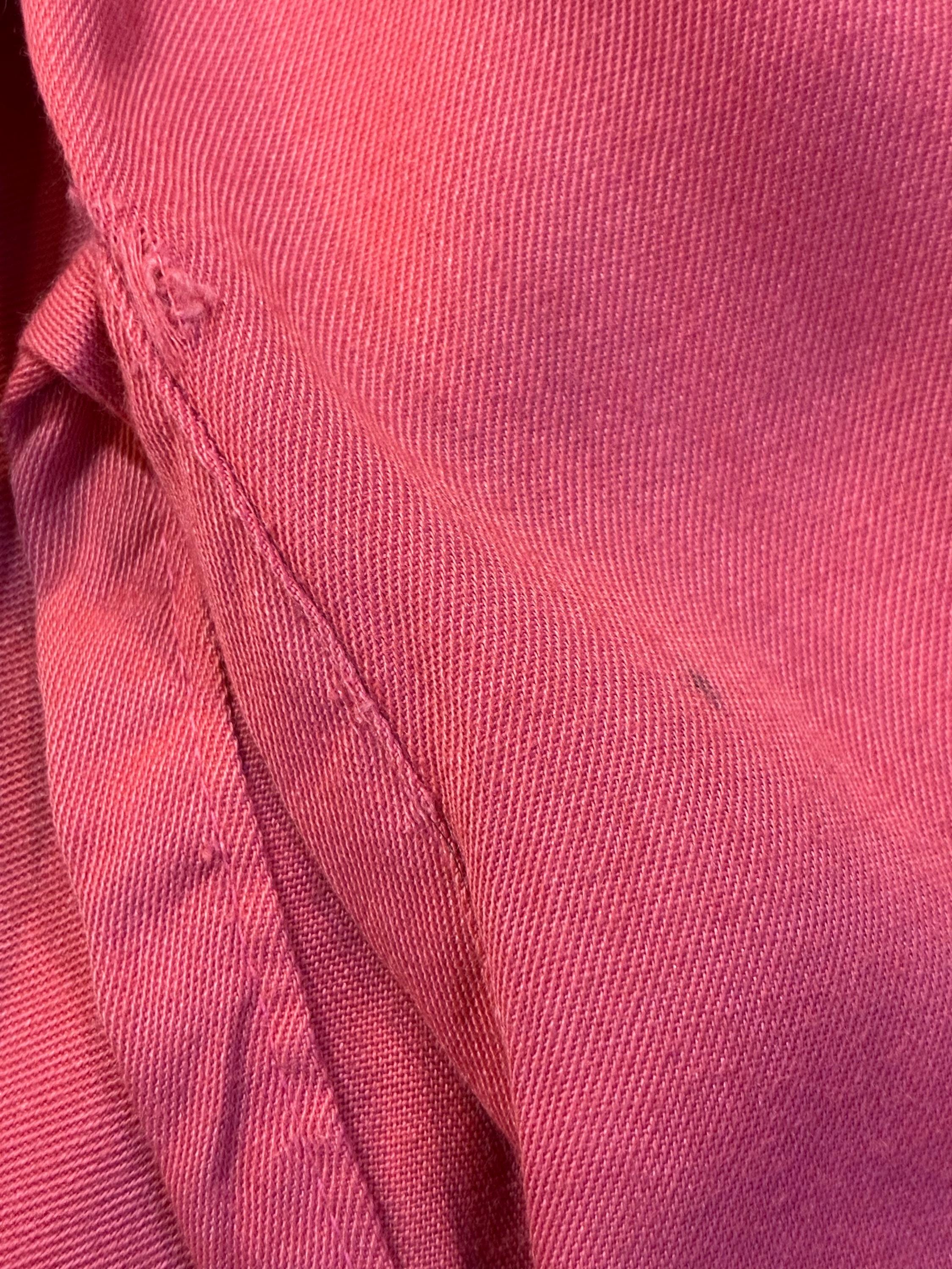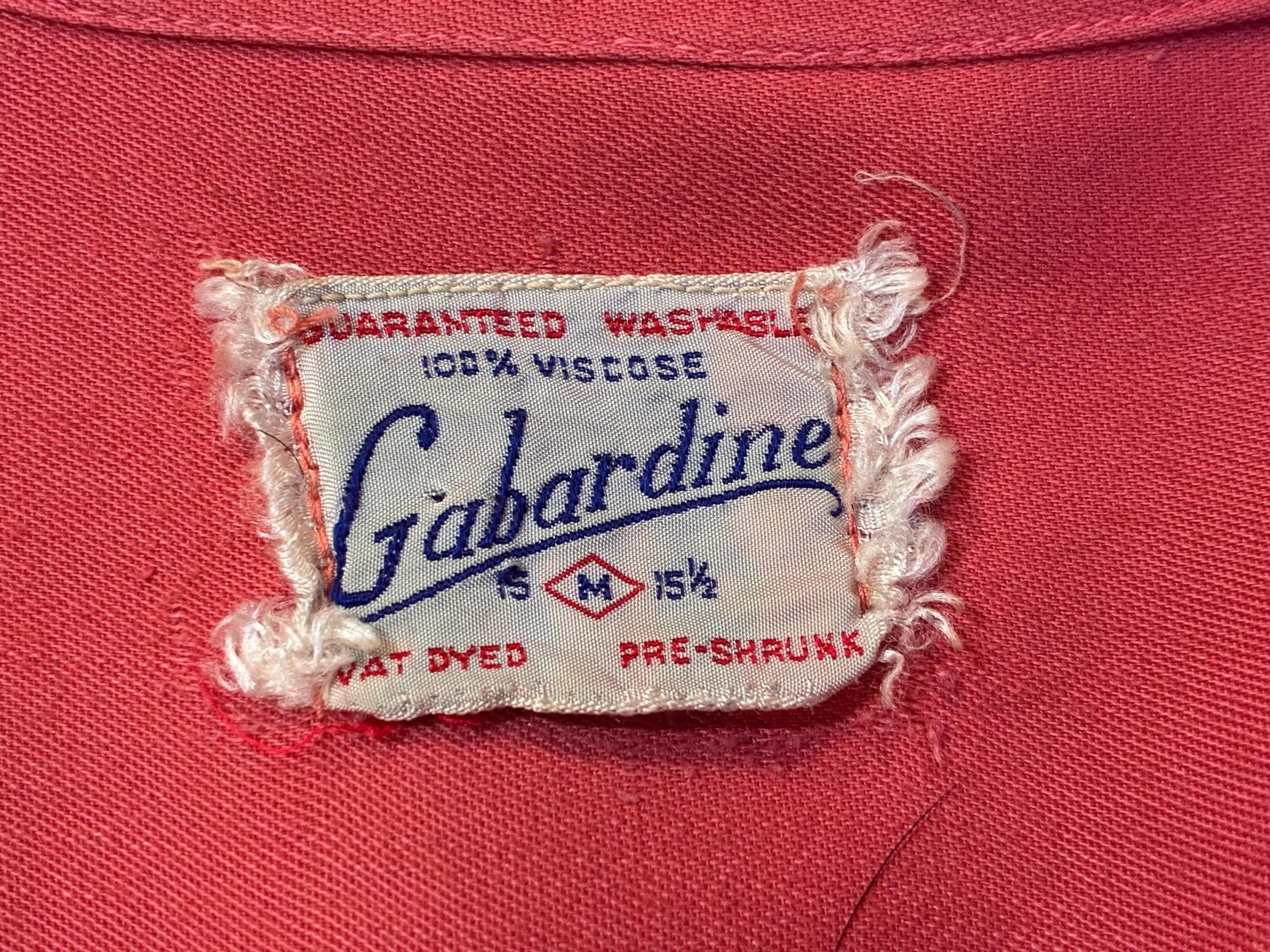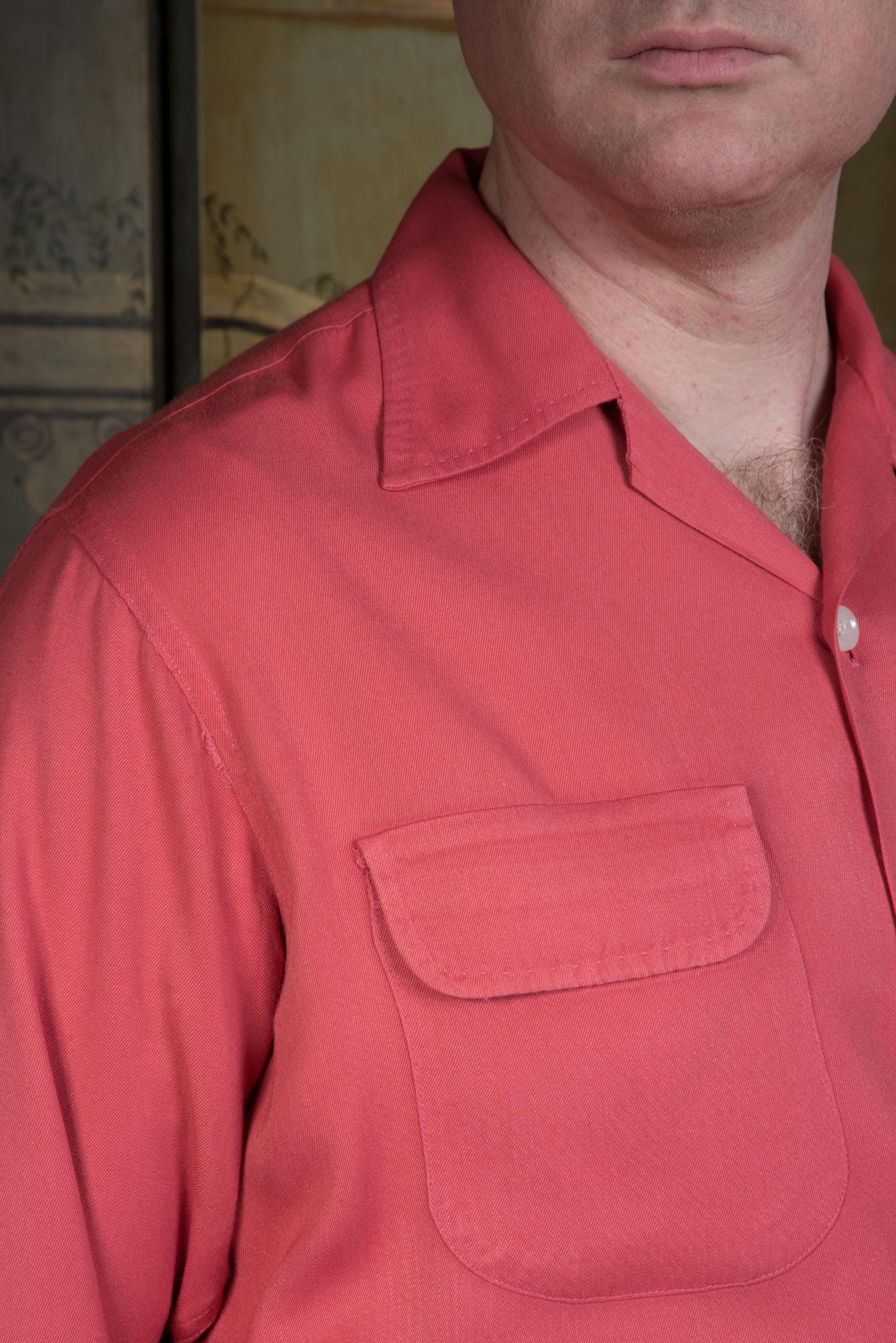 Vintage 1950s gabardine sportshirt is soft with a heavy drape, made in a saturated rosy coral or salmon hue. Has a wide top stitched collar with a loop, and two top stitched flap pockets, and full length sleeves. Killer color made of super soft, drapey rayon.