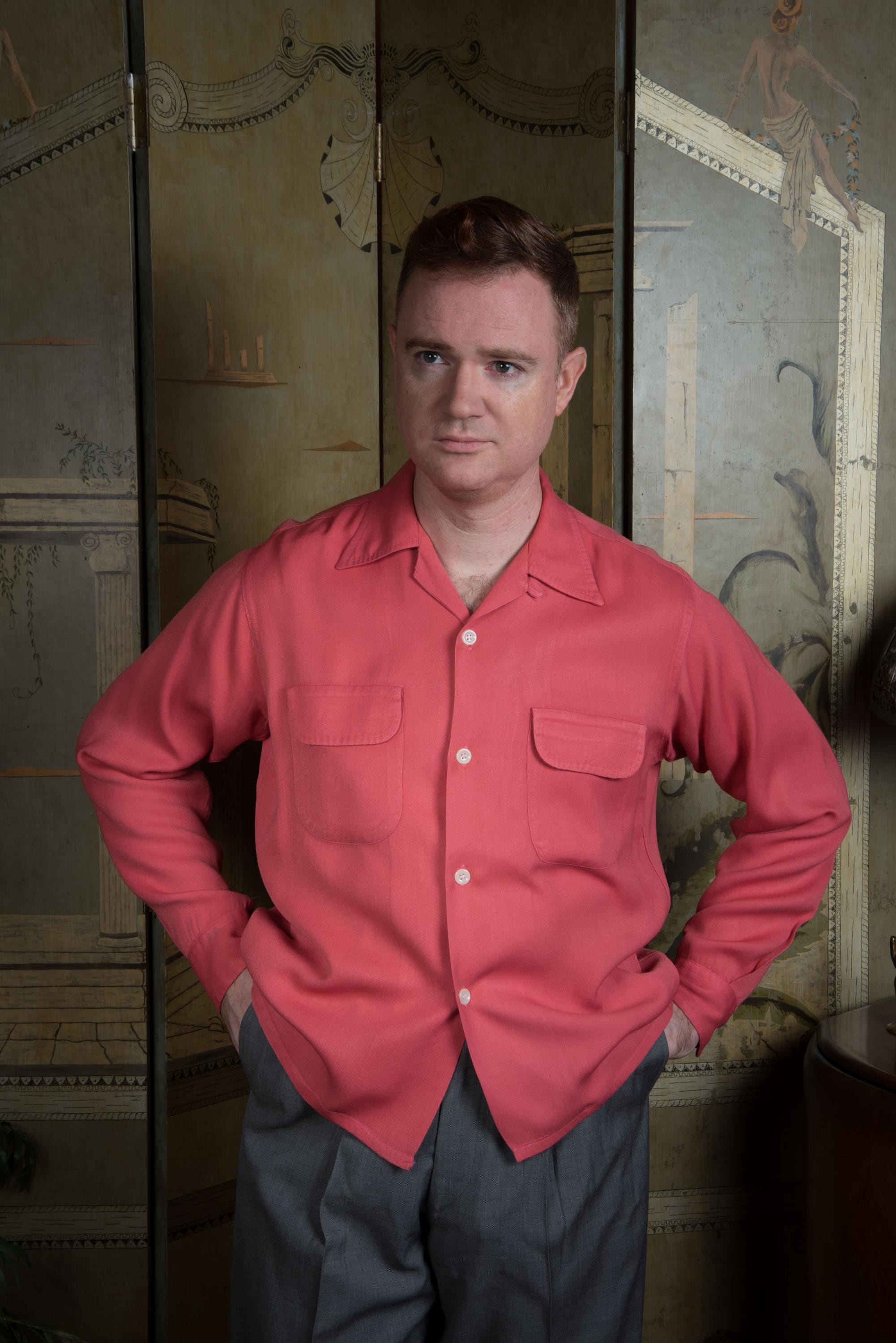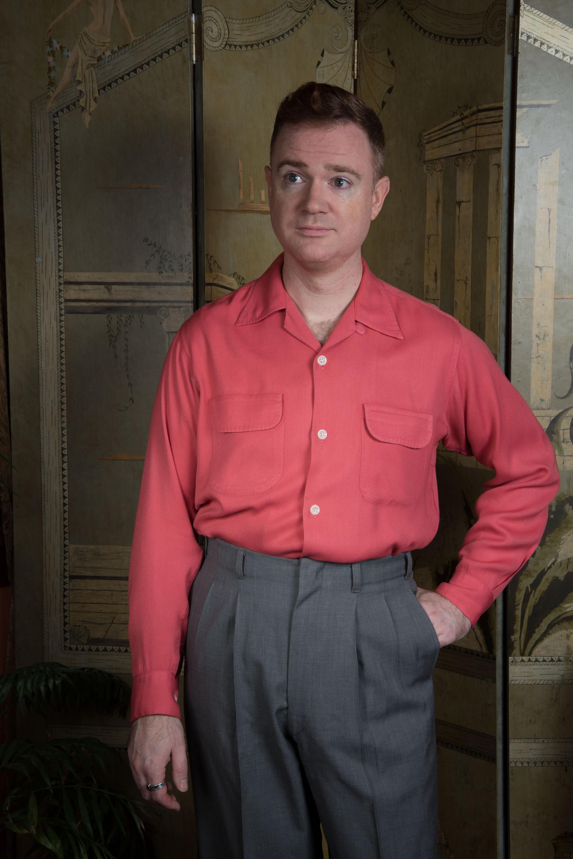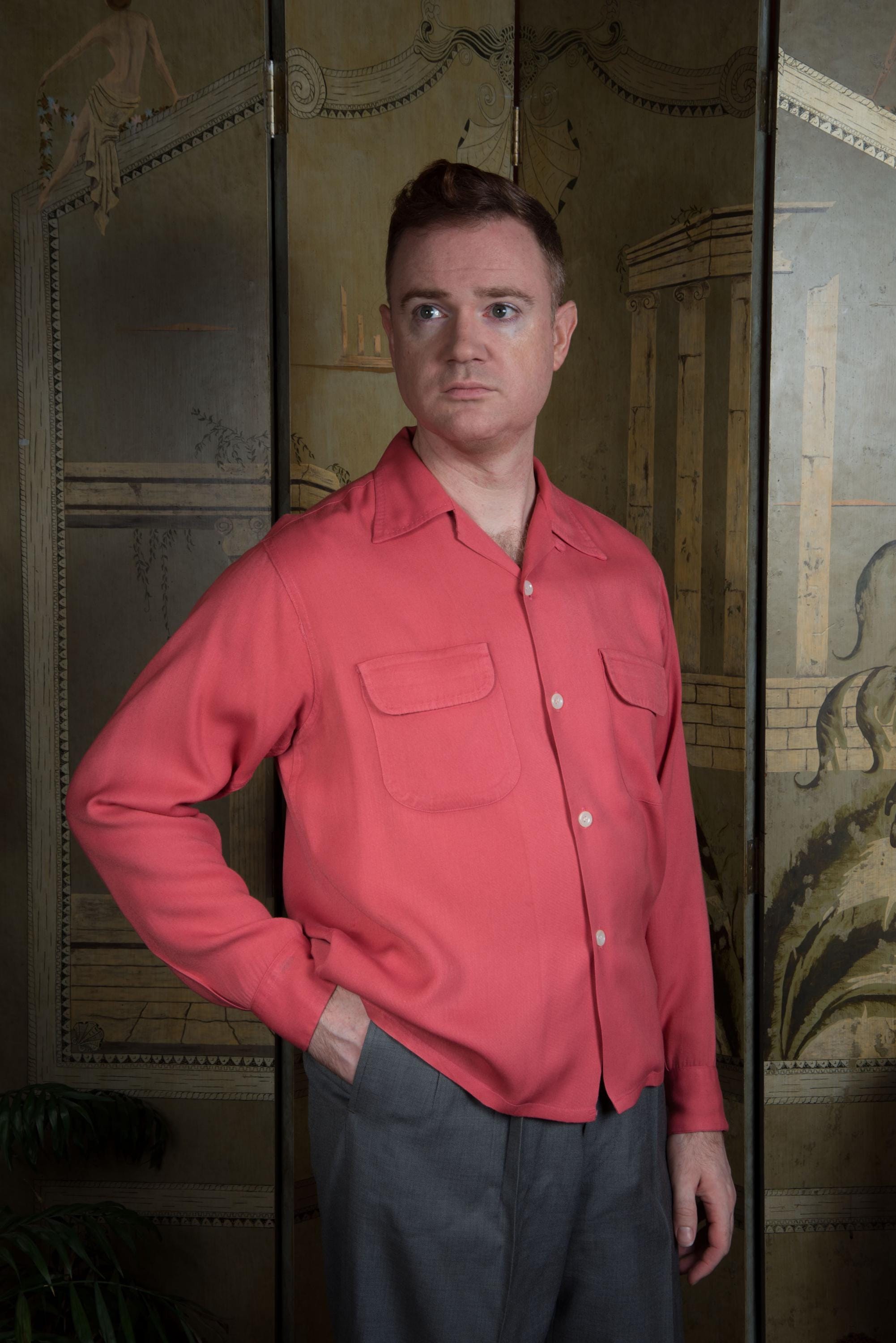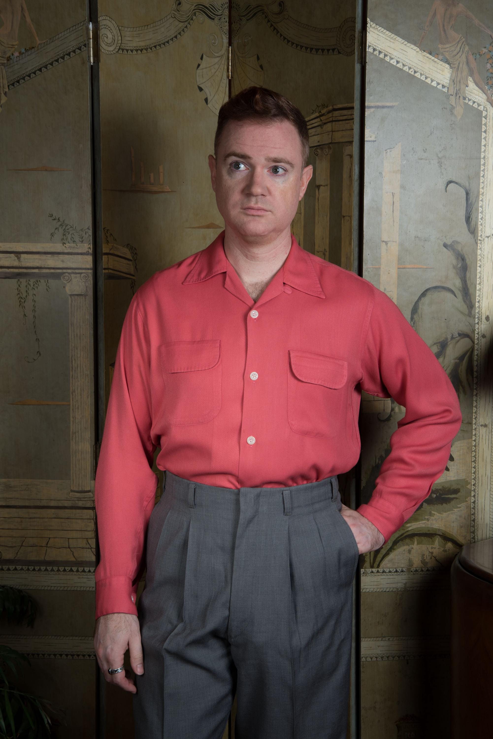Vintage 1950s gabardine sportshirt is soft with a heavy drape, made in a saturated rosy coral or salmon hue. Has a wide top stitched collar with a loop, and two top stitched flap pockets, and full length sleeves. Killer color made of super soft, drapey rayon.