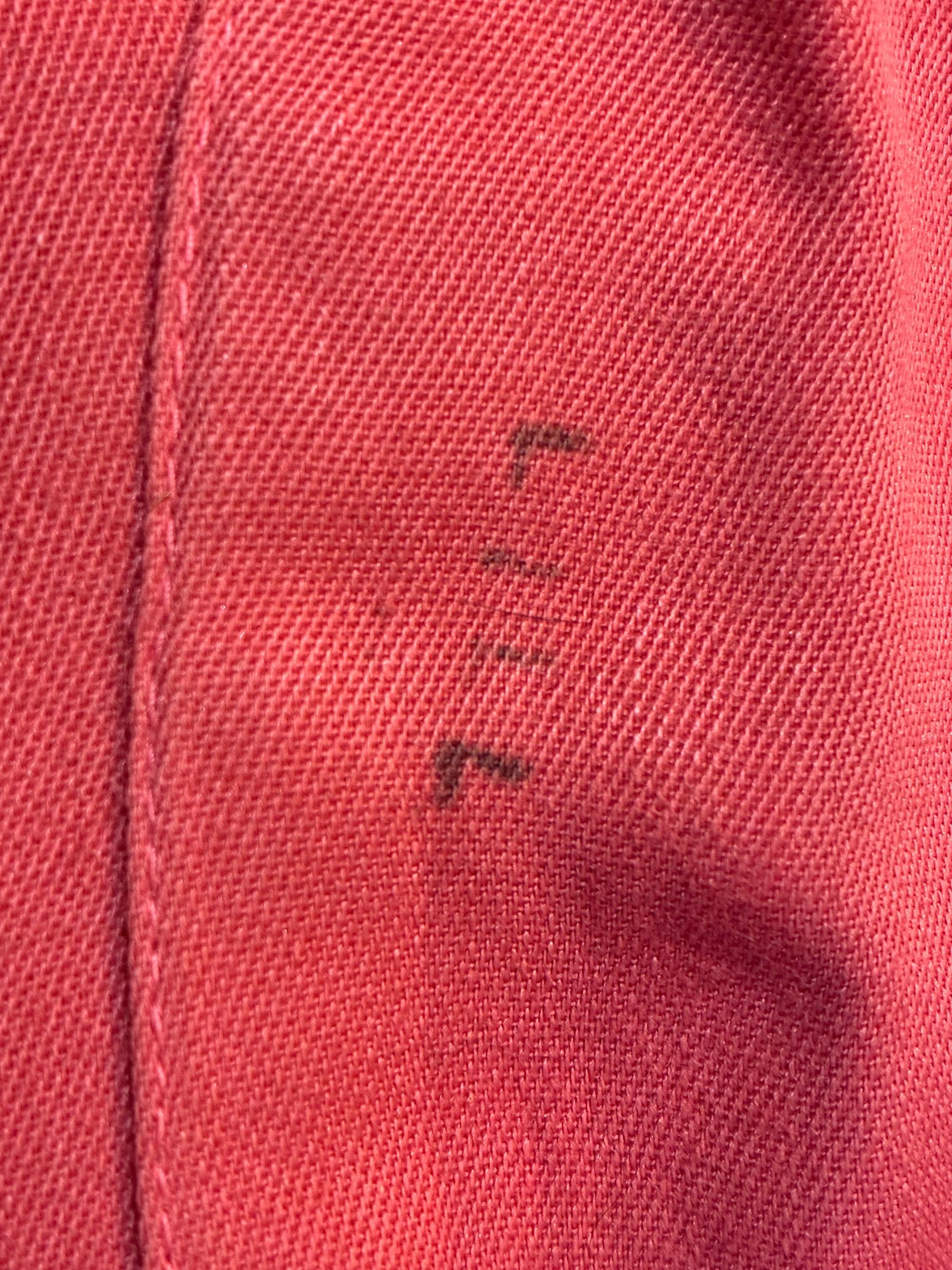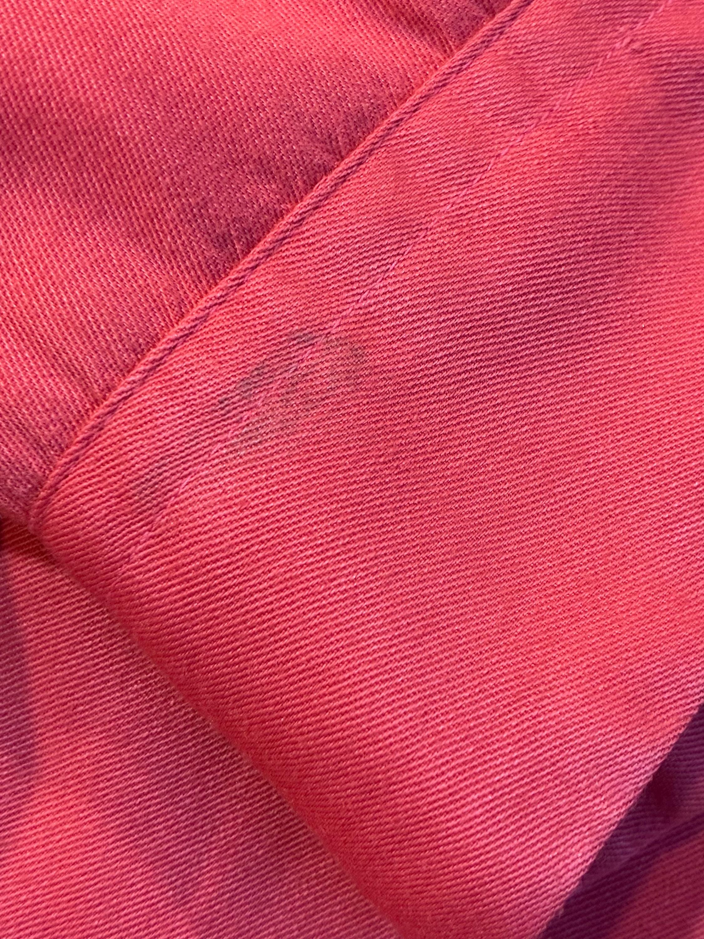 This has been dry cleaned and is ready to wear. There is a tiny bit of pressing a couple seam points, nothing significant. There's 1.5" repair along the left underarm seam. The right cuff has a small stain, and there's a little dot on the sleeve next to the cuff opening, along with a small fray at the corner of that opening (photographed.) The shirt is very sturdy and wears beautifully. I find no other issues to note!