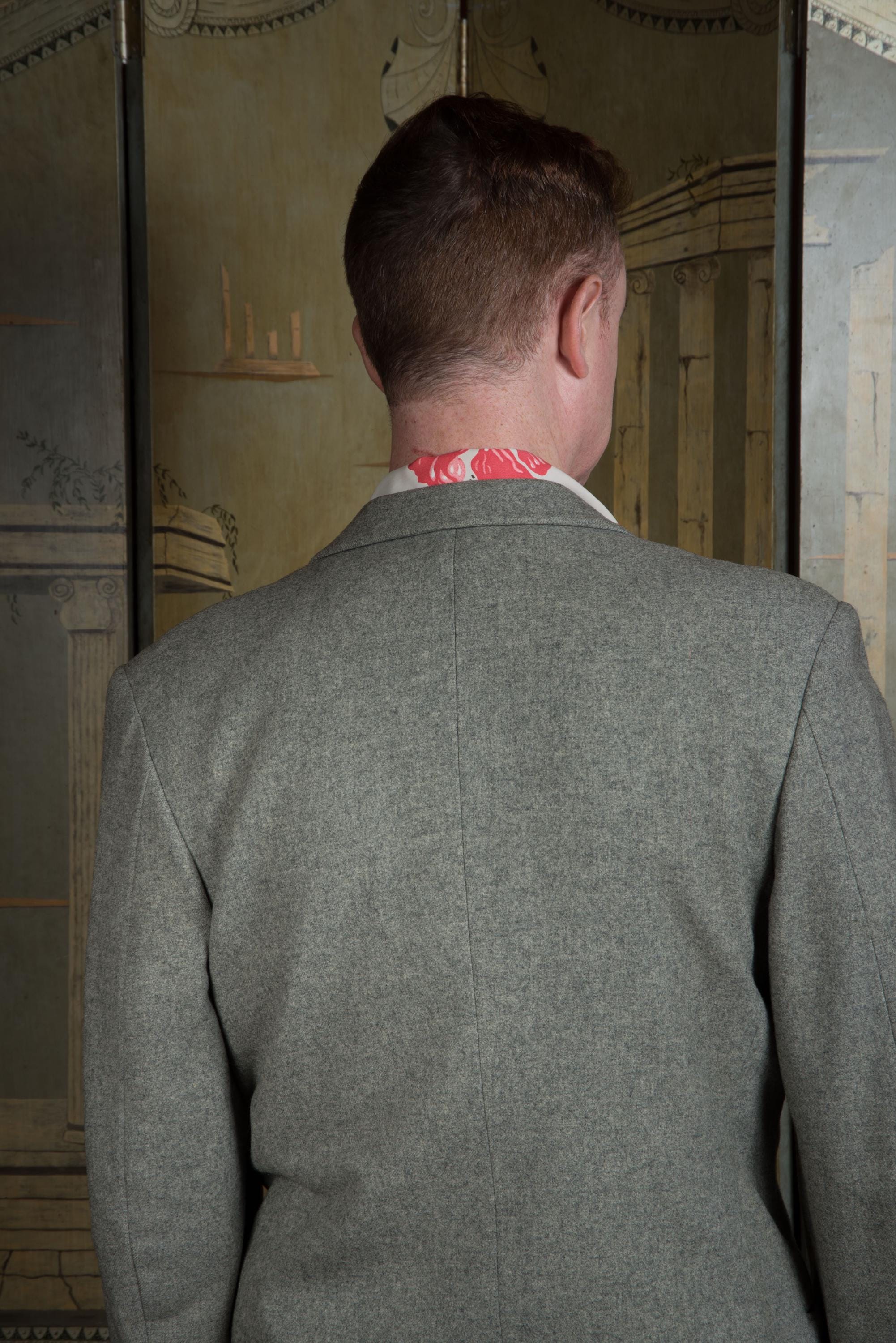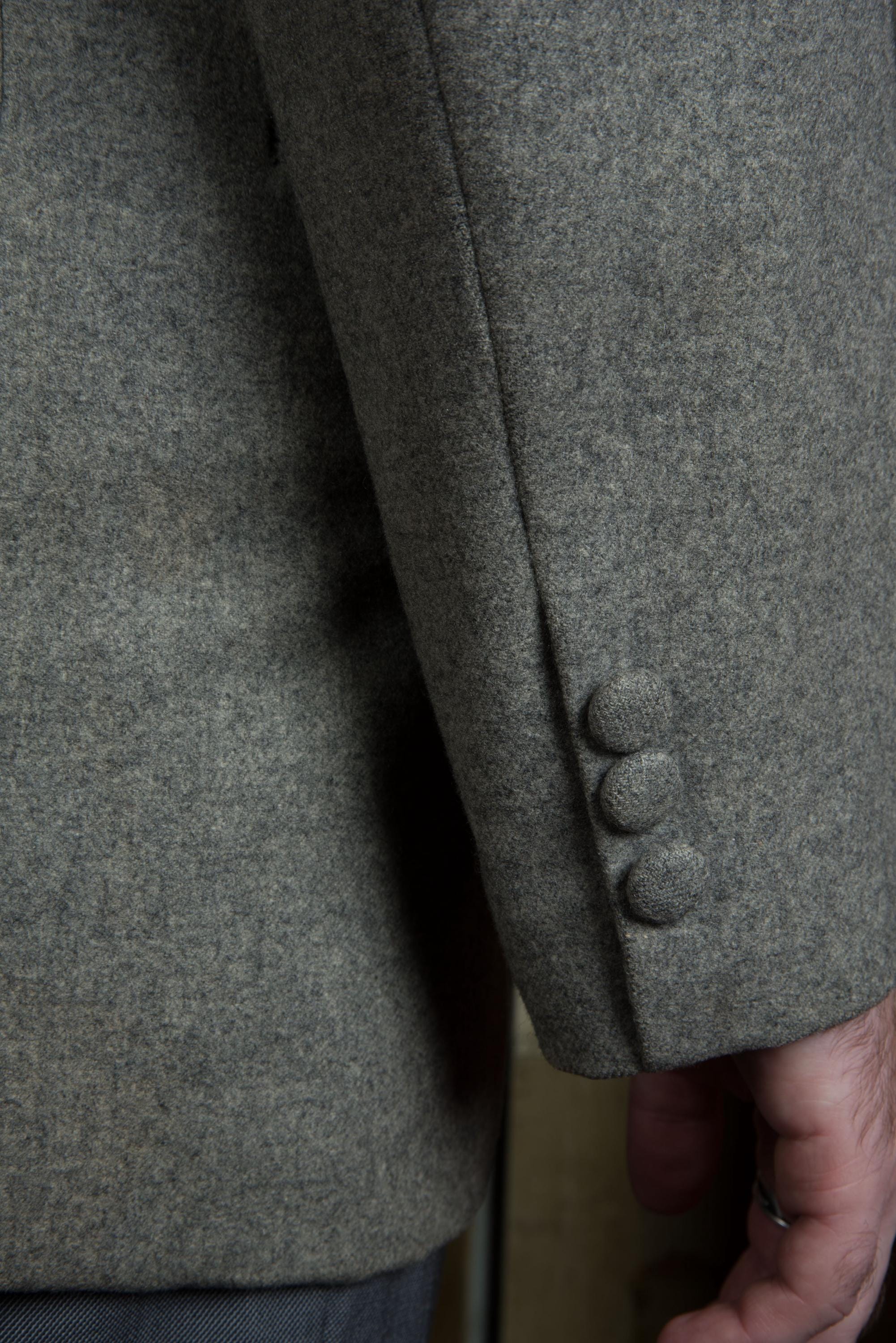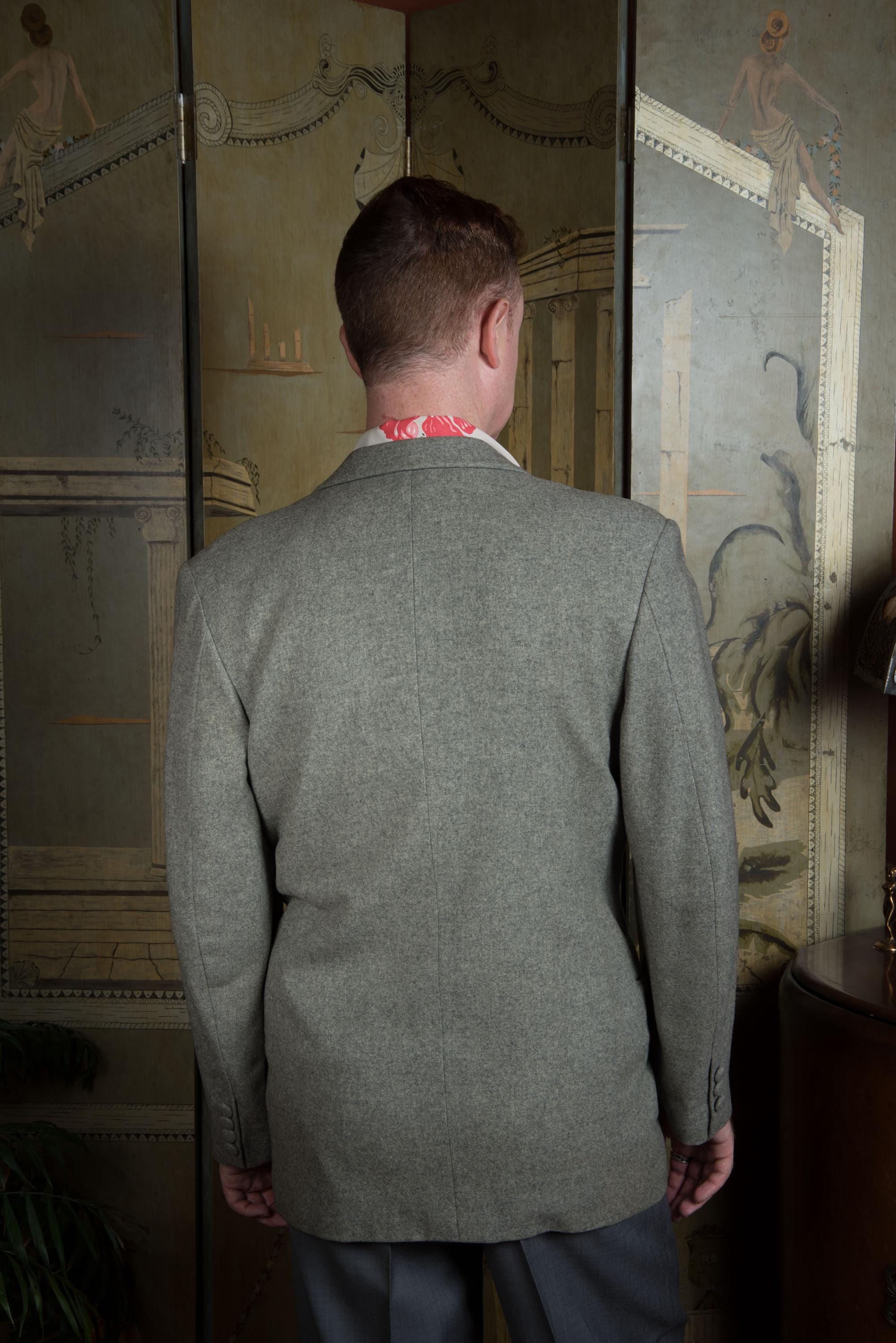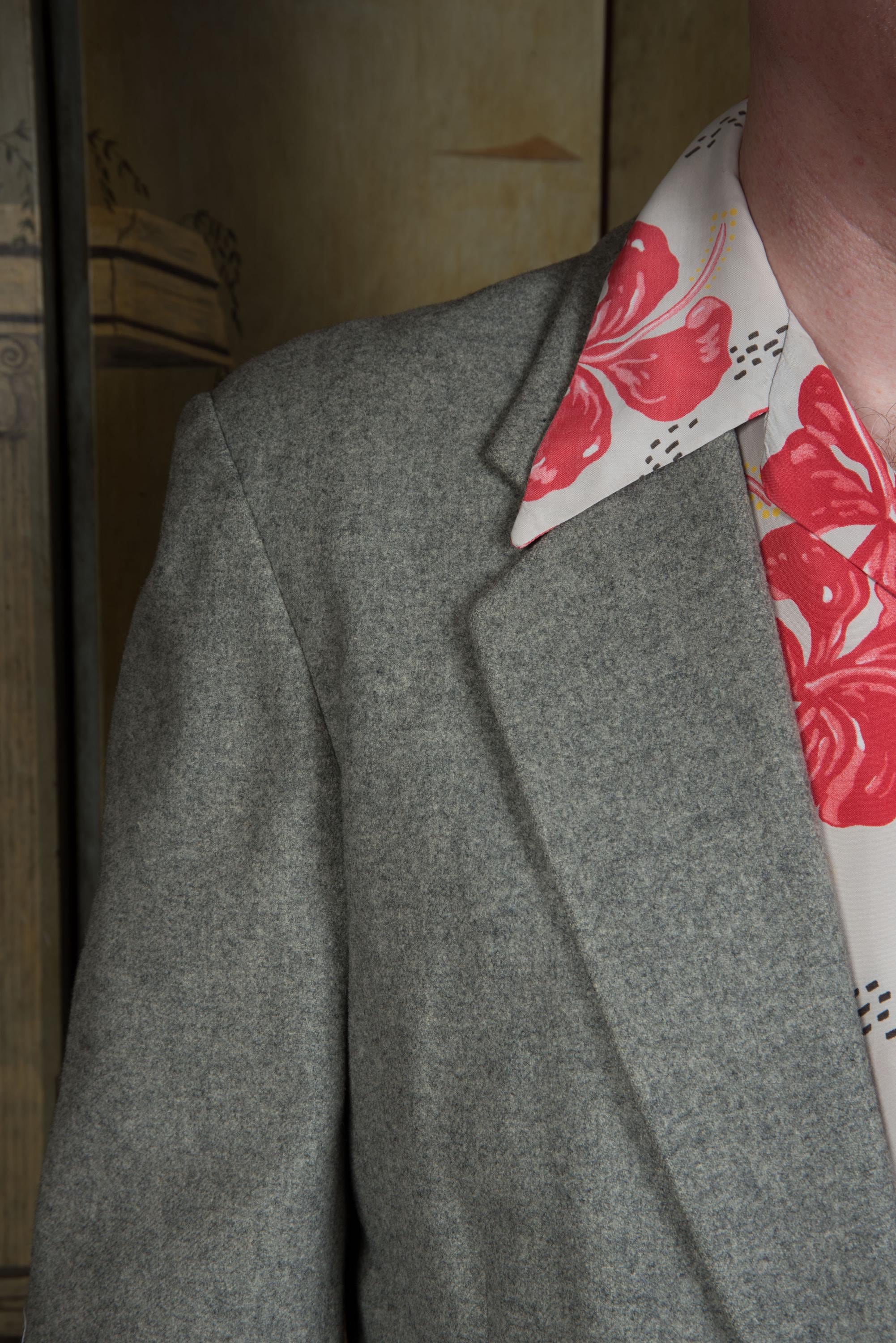 A fantastic beautifully made early to mid 50s sportcoat, tailored by the US Naval Tailor A.S. Tom Co. Ltd on the base on Yokosuka, Japan. It's beautifully made of a quality warm grey wool flannel with heathering. It is fully lined in purple rayon acetate satin. It's a swank but still very professional look - standard pockets but a low gorge. The cuff buttons are self-fabric covered, a really nice touch. Looks great worn casually or with a tie.