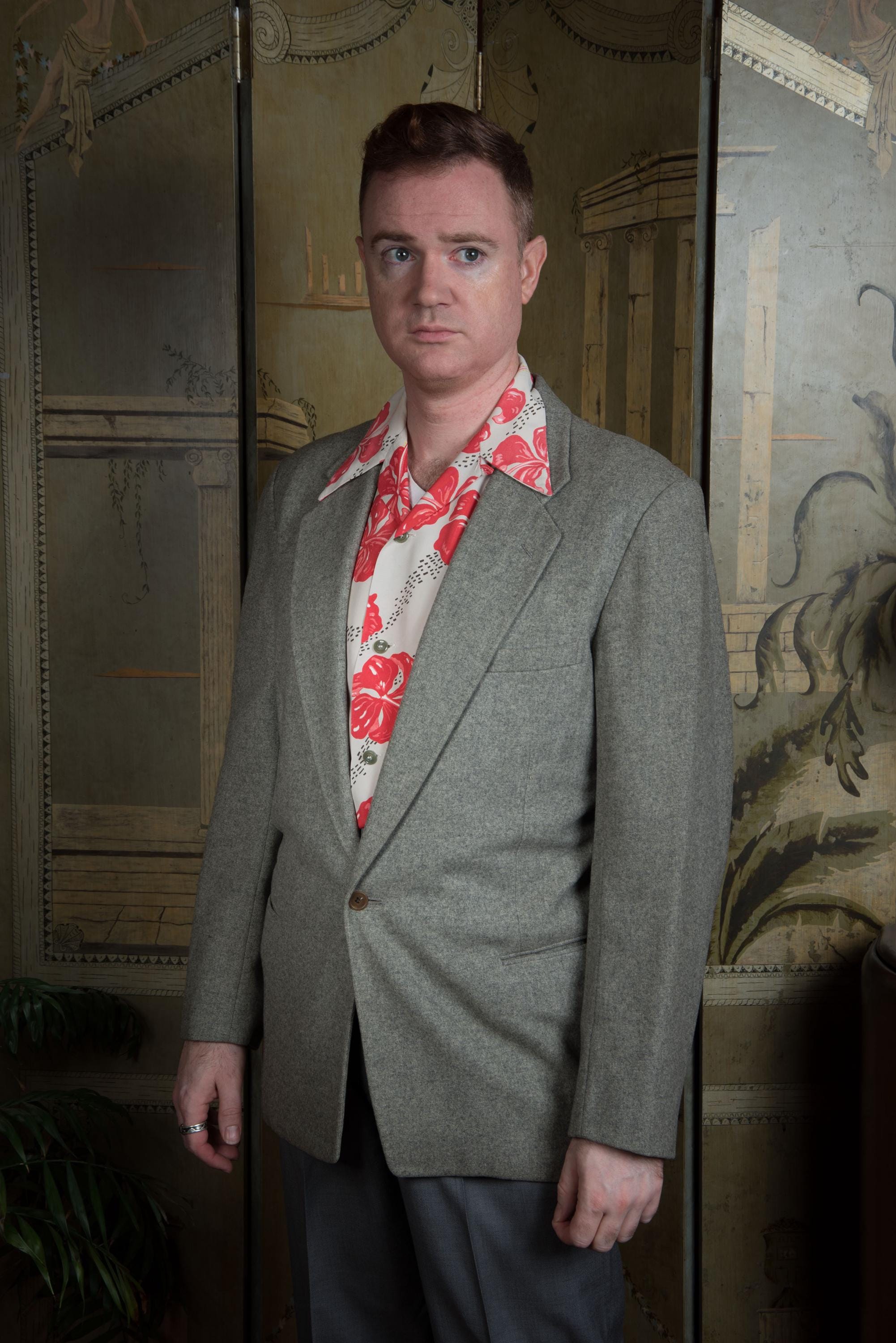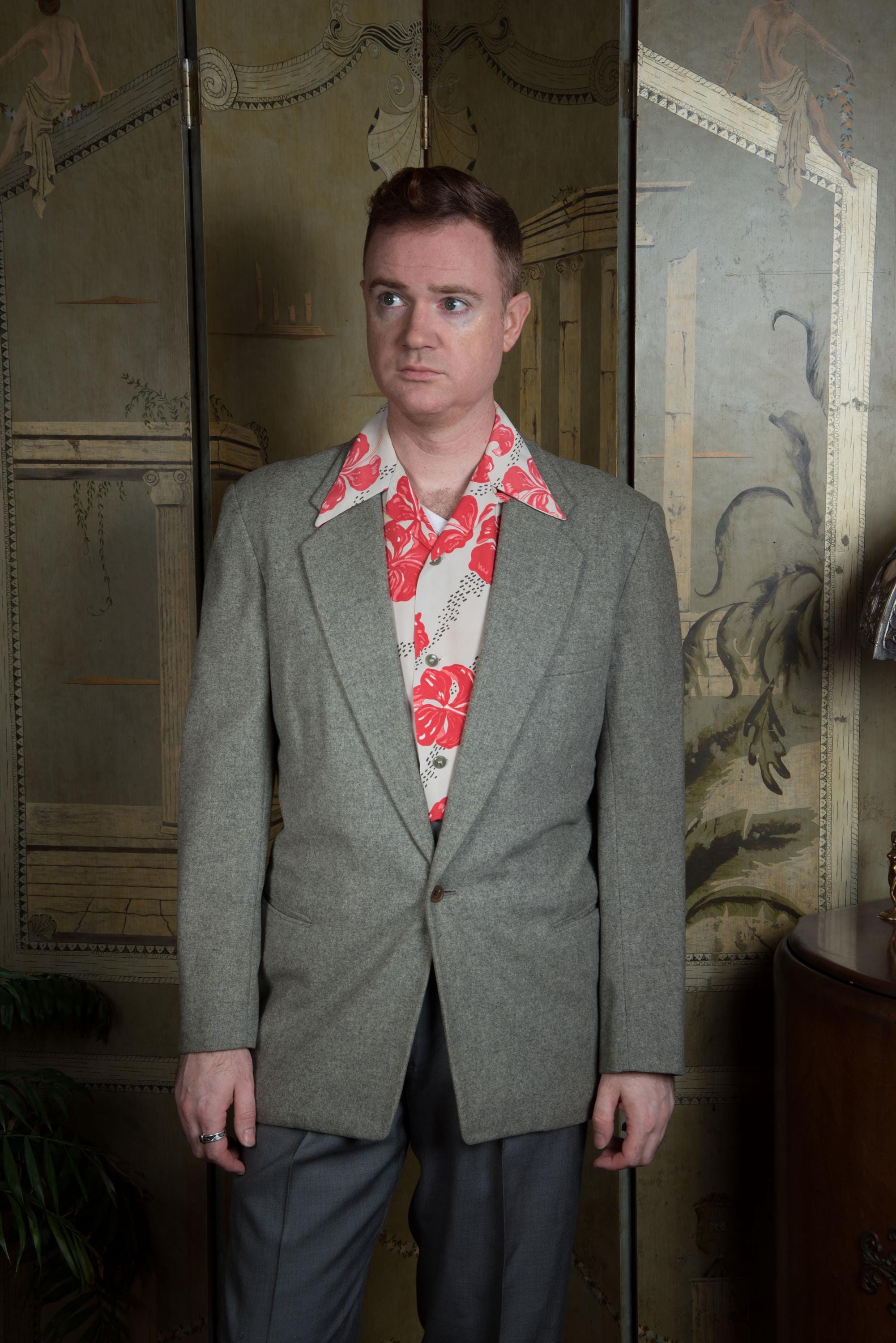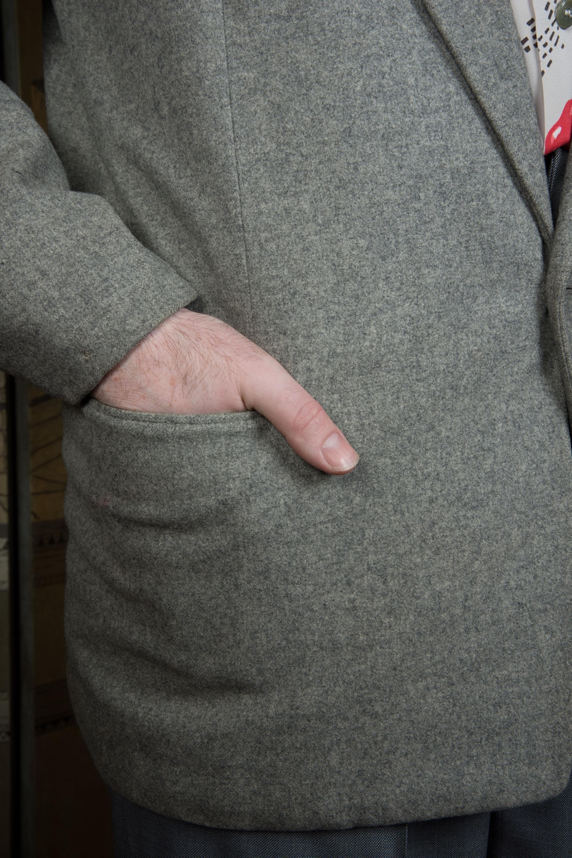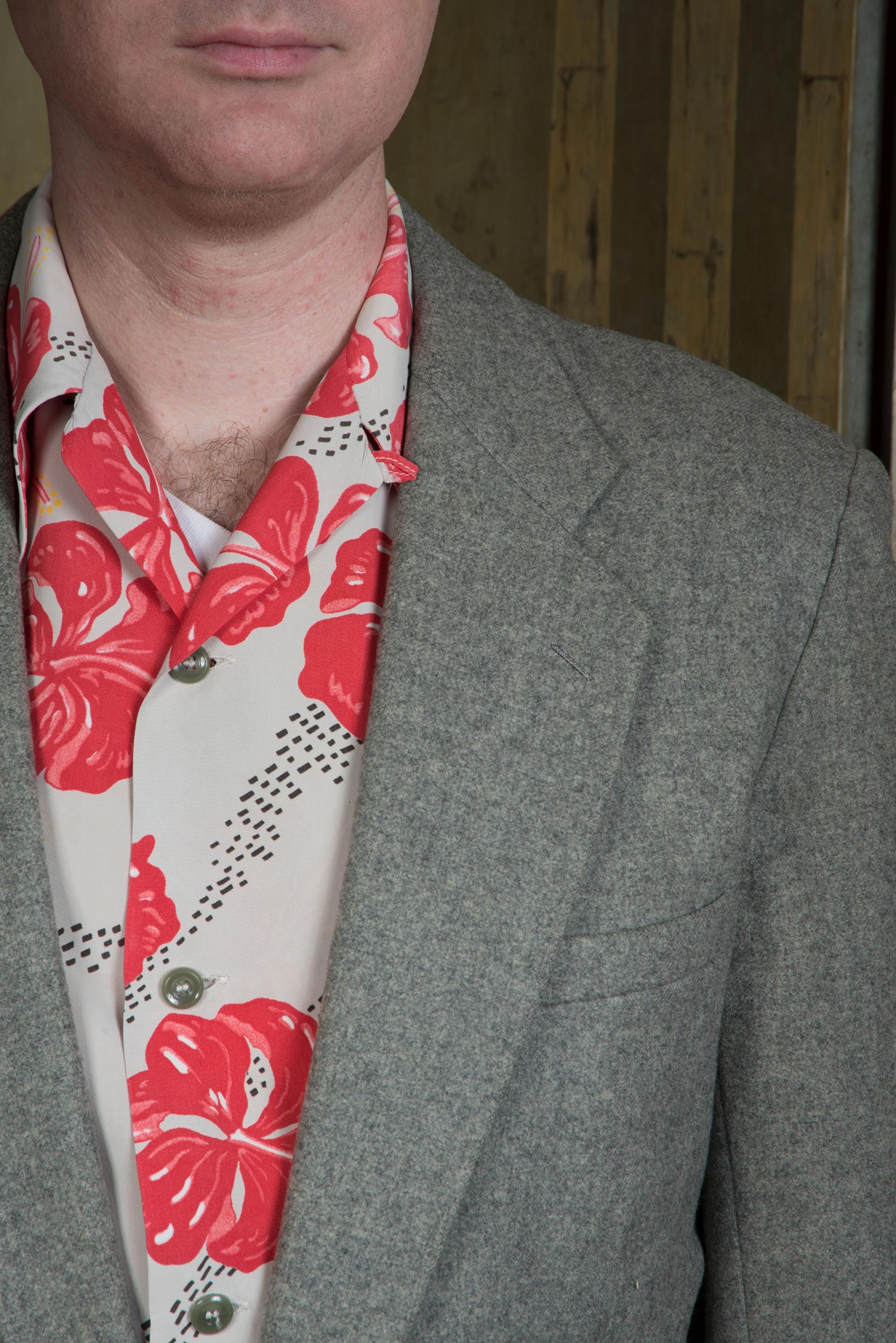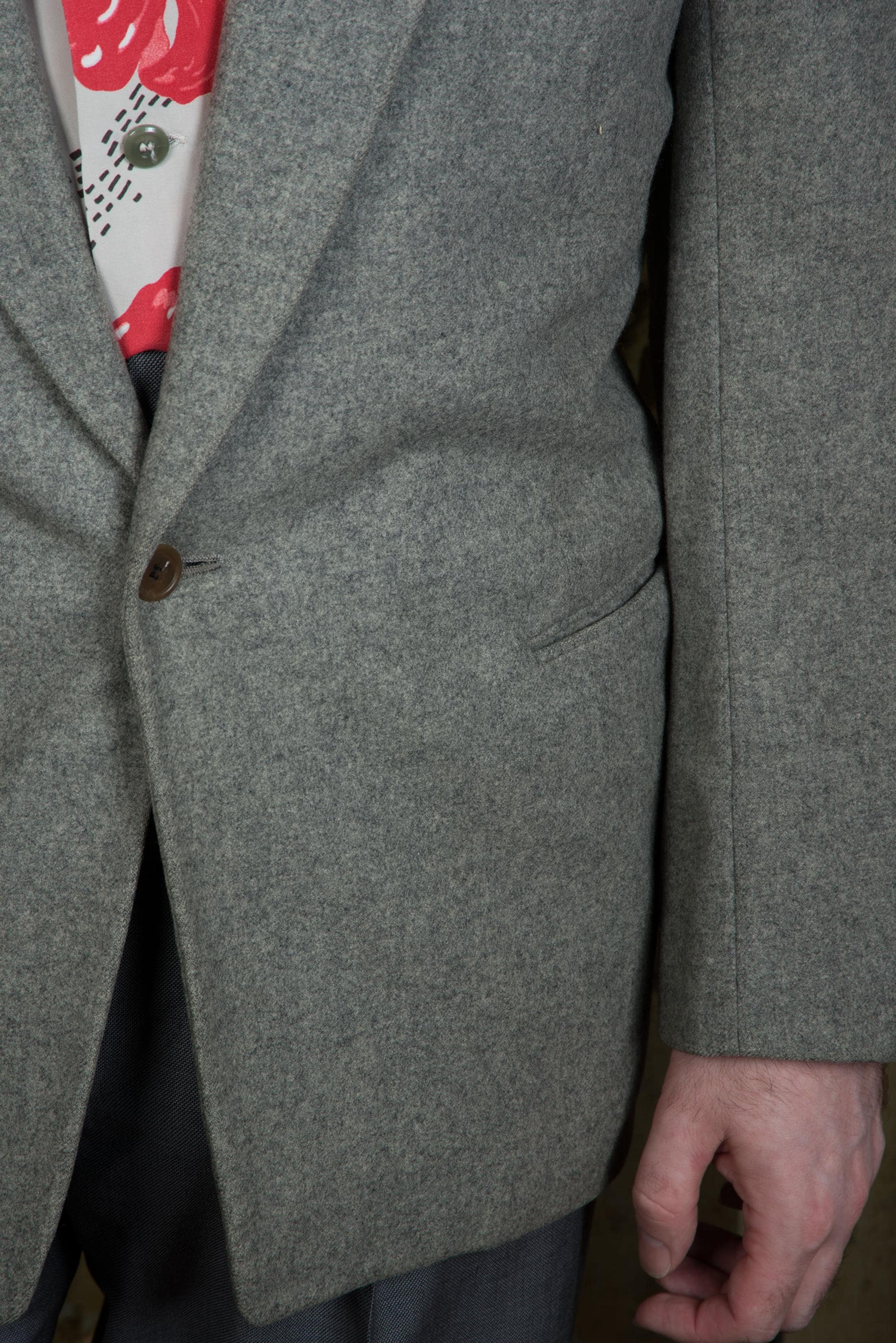 A fantastic beautifully made early to mid 50s sportcoat, tailored by the US Naval Tailor A.S. Tom Co. Ltd on the base on Yokosuka, Japan. It's beautifully made of a quality warm grey wool flannel with heathering. It is fully lined in purple rayon acetate satin. It's a swank but still very professional look - standard pockets but a low gorge. The cuff buttons are self-fabric covered, a really nice touch. Looks great worn casually or with a tie.