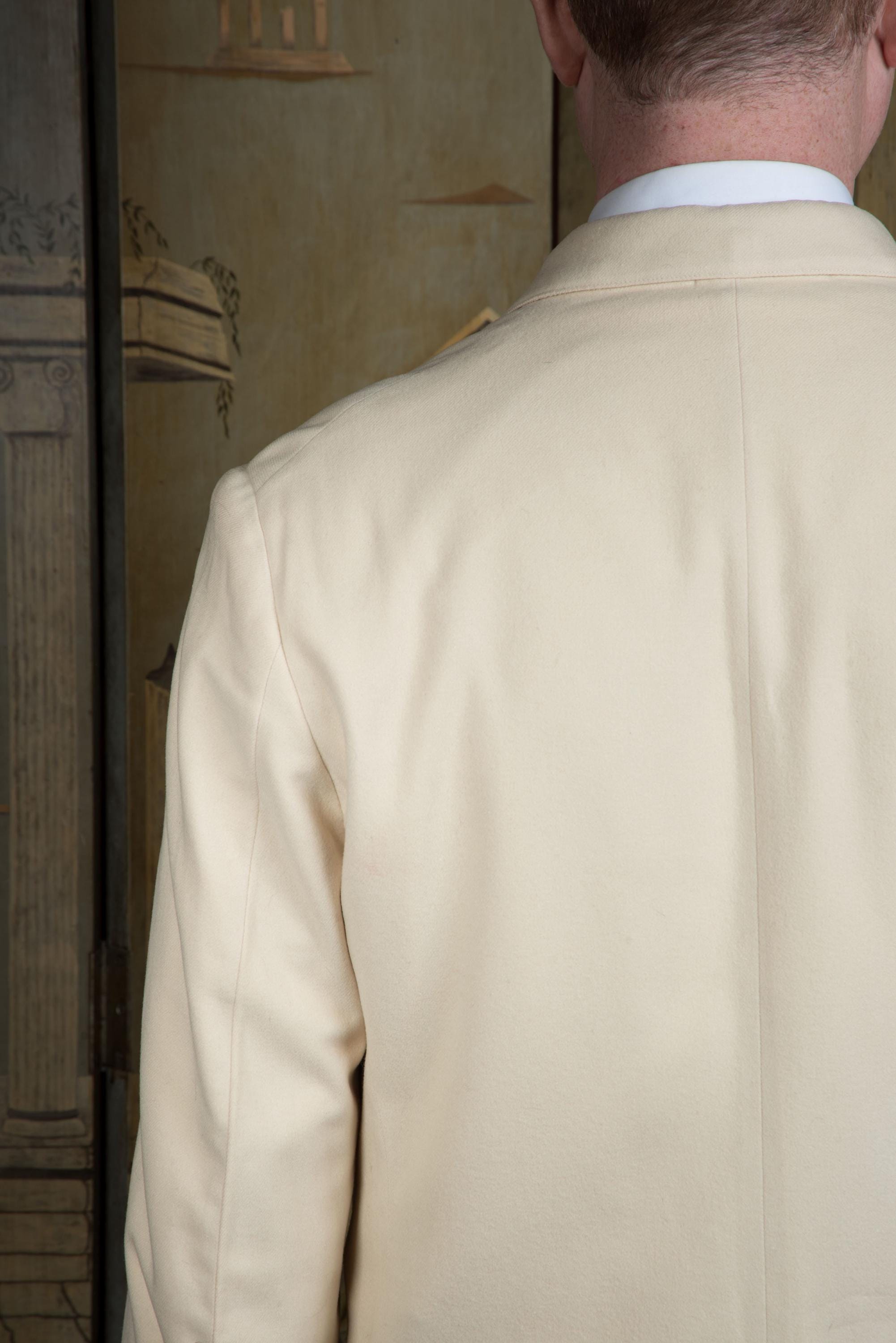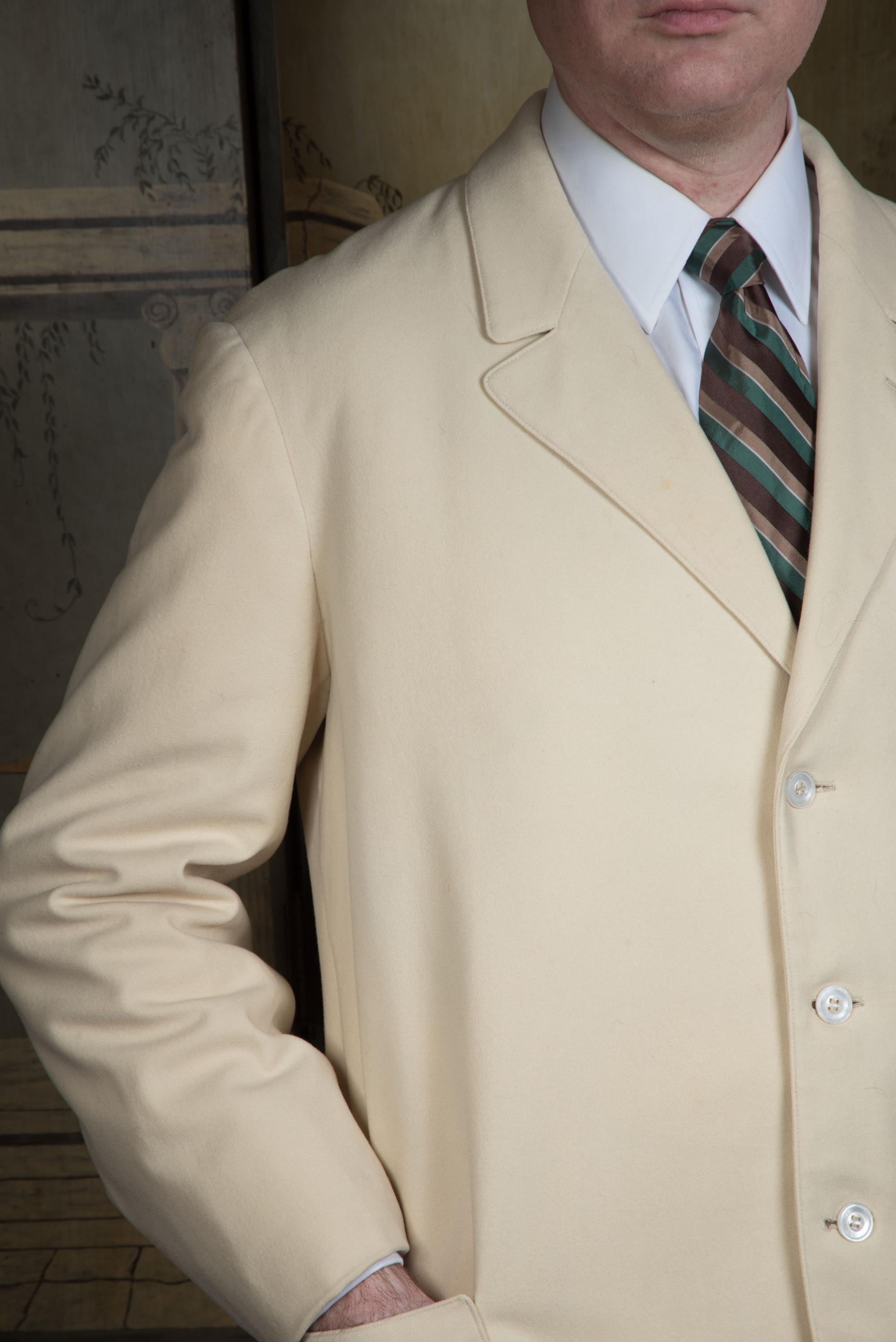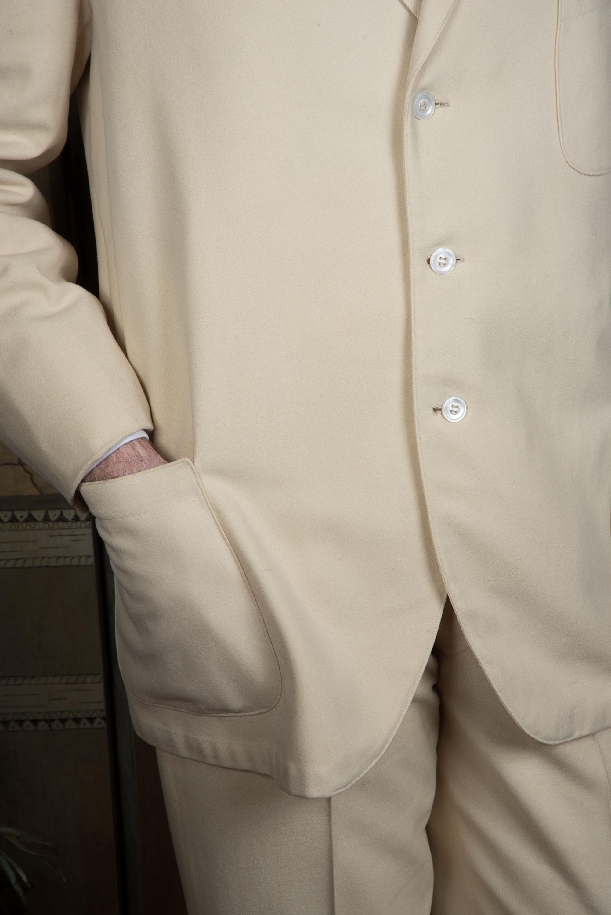 A fantastic antique sack suit jacket made of a soft flannel in a warm cream hue. Liberated from a costume house, this beauty was made for a Dr. Morrison in April 1917. It features notched lapels and three patch pockets, all edged with a fine machine stitch. It is partially lined in sturdy cotton through the front, upper back yoke and shoulders. There is a single internal breast pocket.