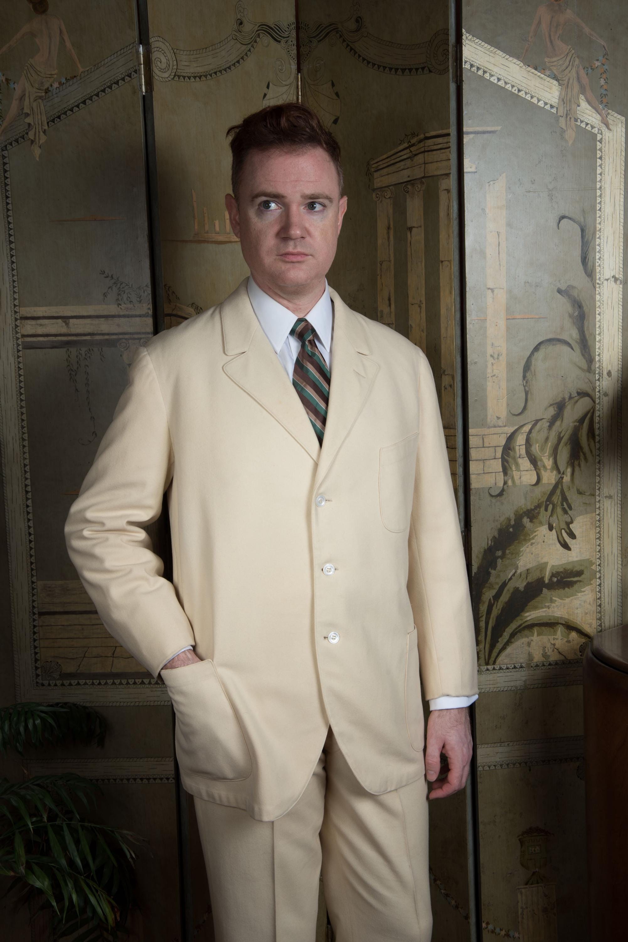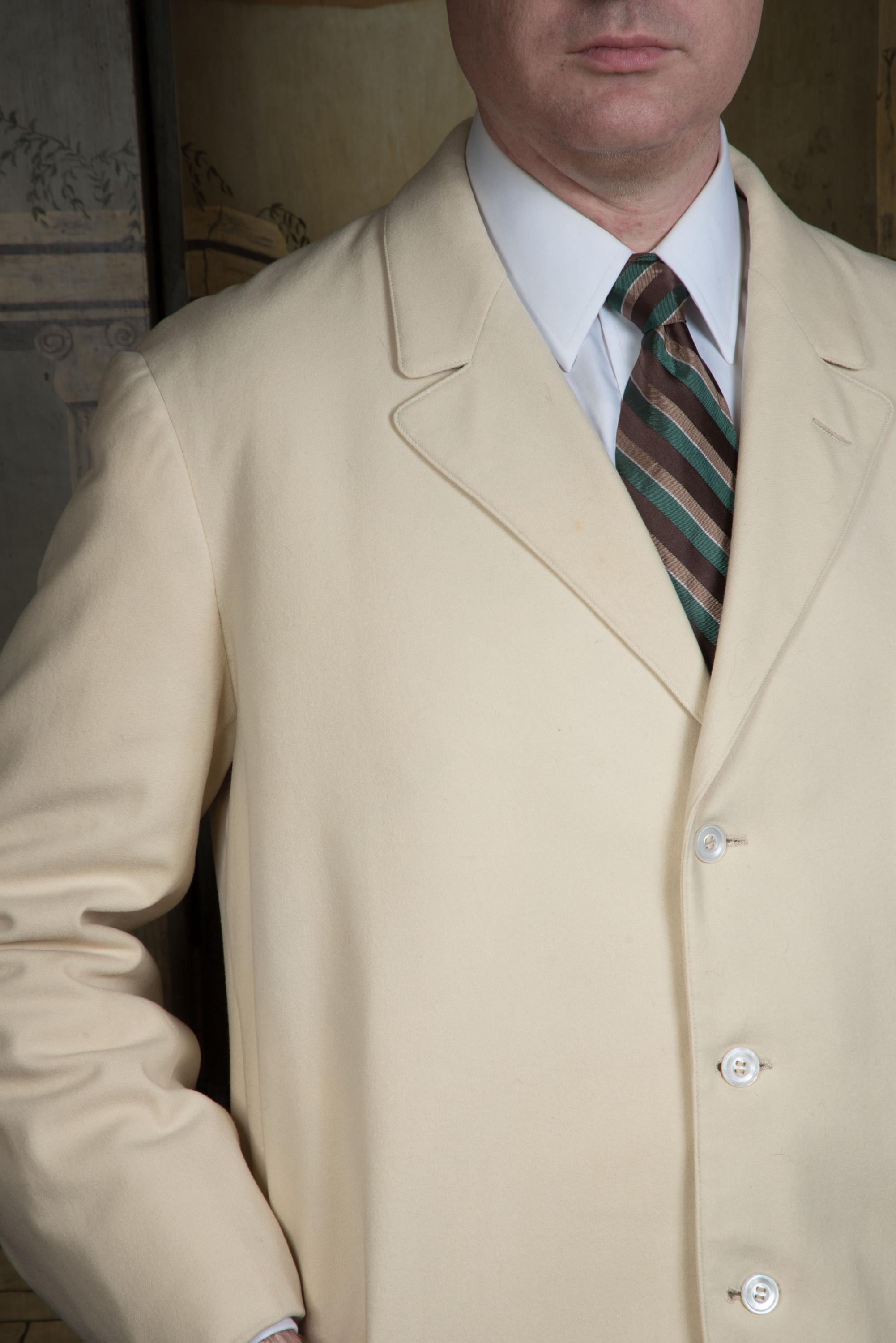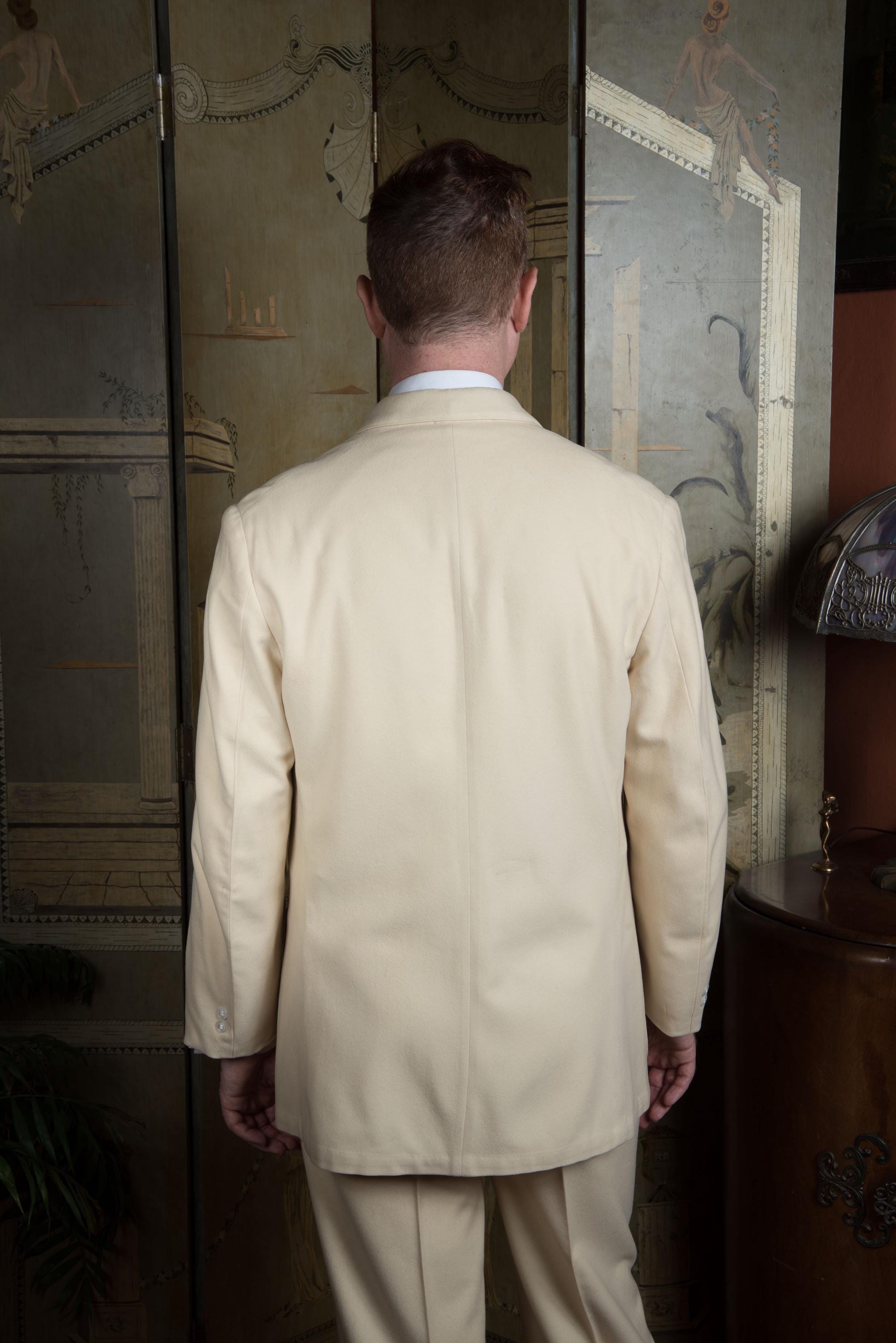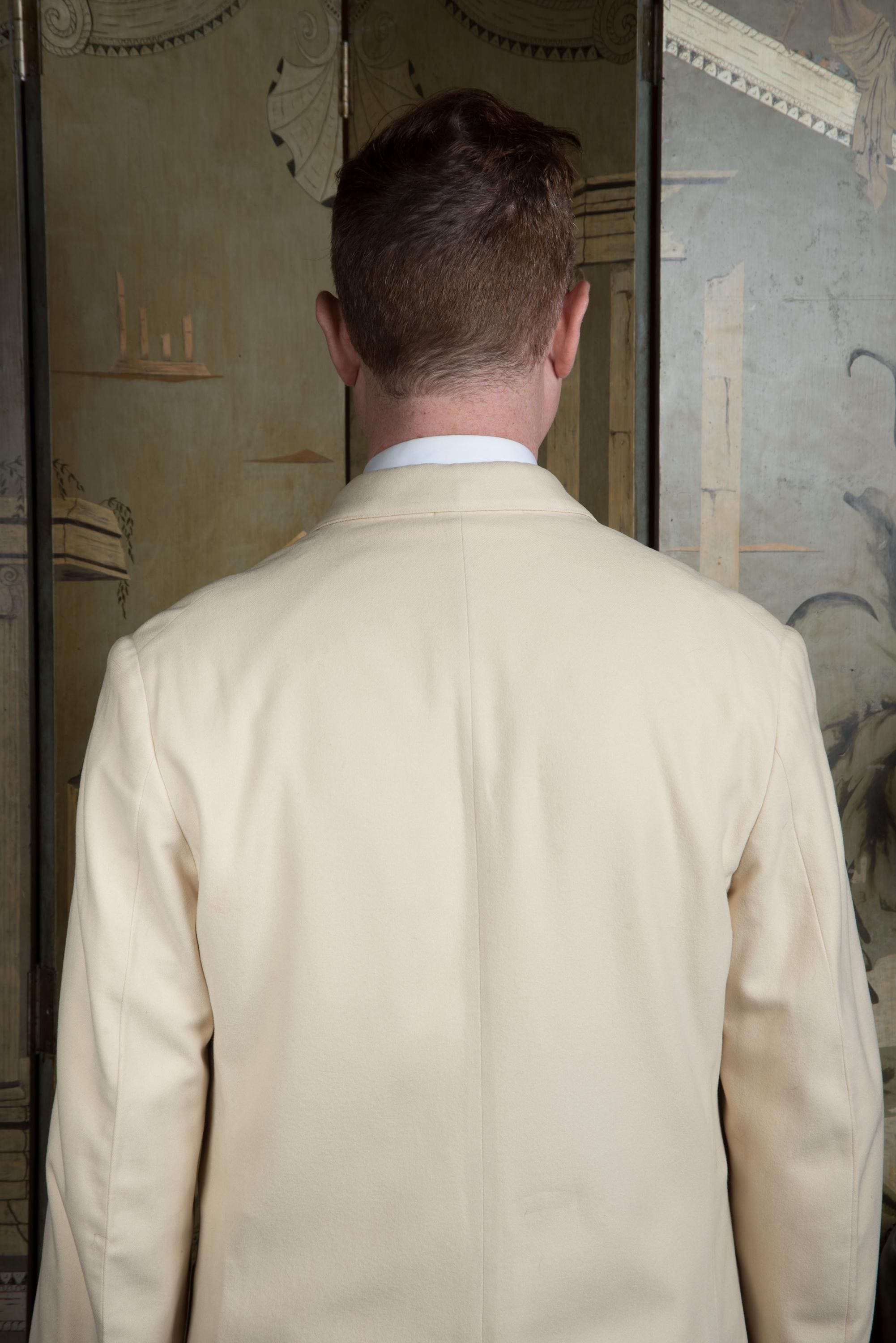 A fantastic antique sack suit jacket made of a soft flannel in a warm cream hue. Liberated from a costume house, this beauty was made for a Dr. Morrison in April 1917. It features notched lapels and three patch pockets, all edged with a fine machine stitch. It is partially lined in sturdy cotton through the front, upper back yoke and shoulders. There is a single internal breast pocket.