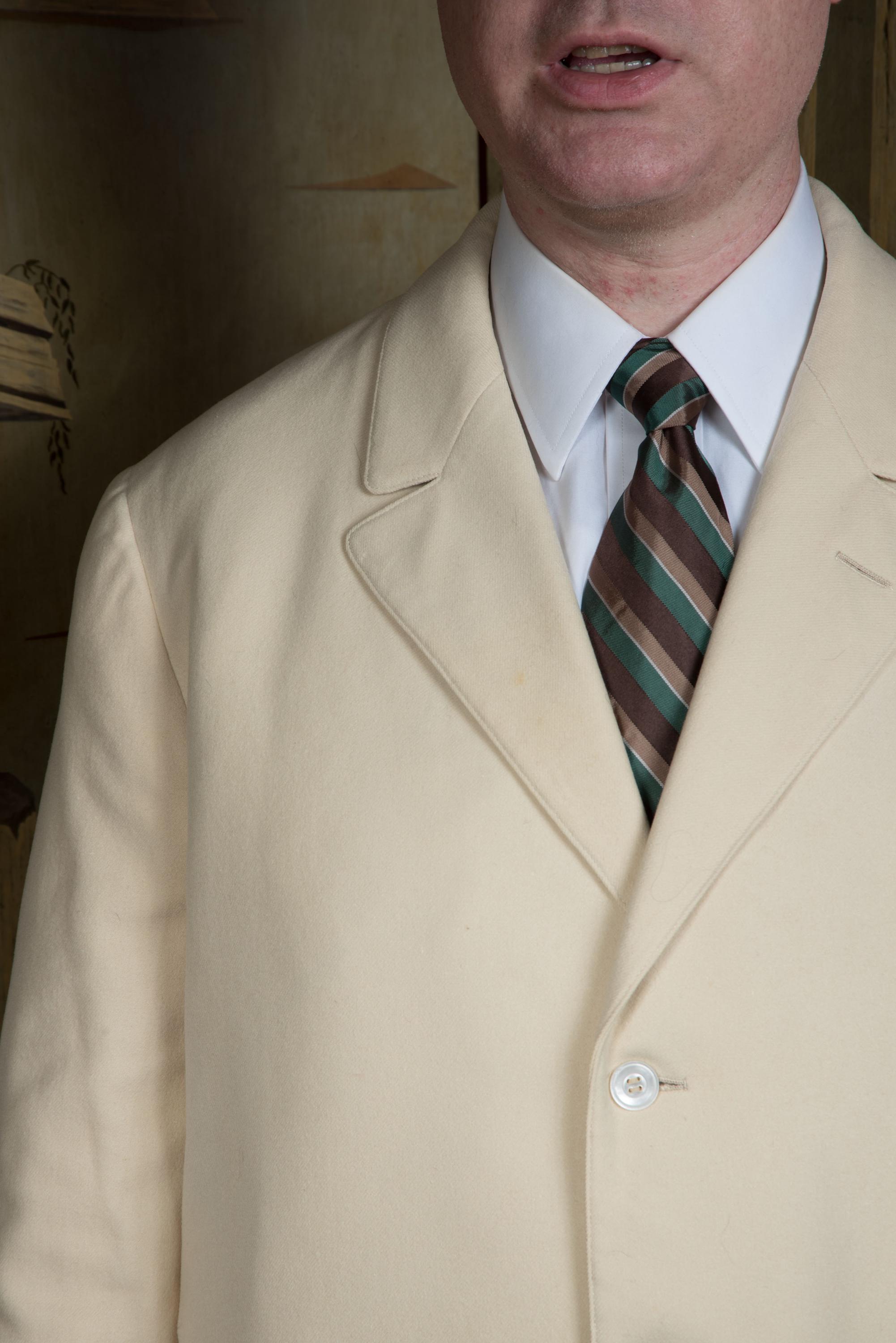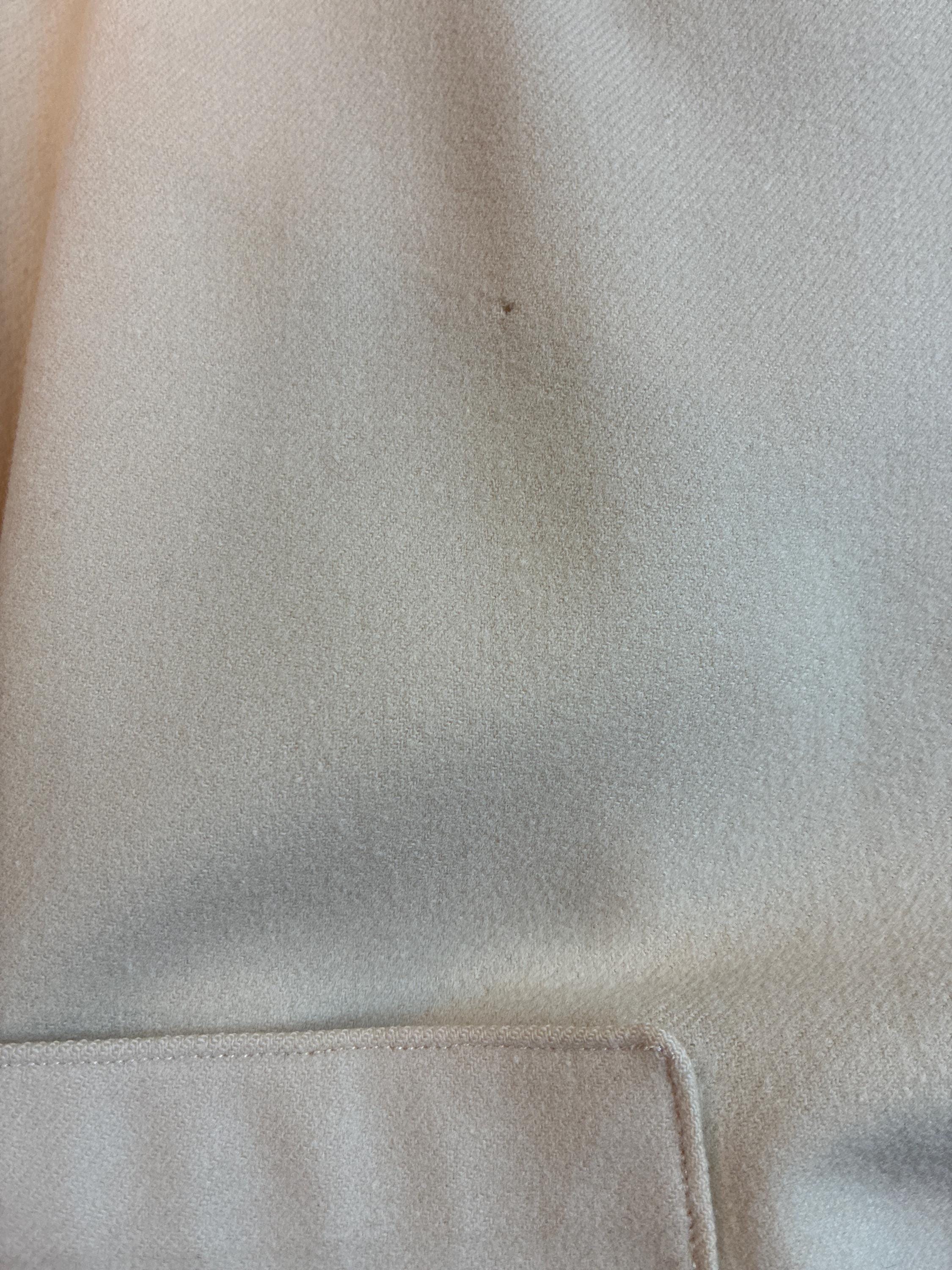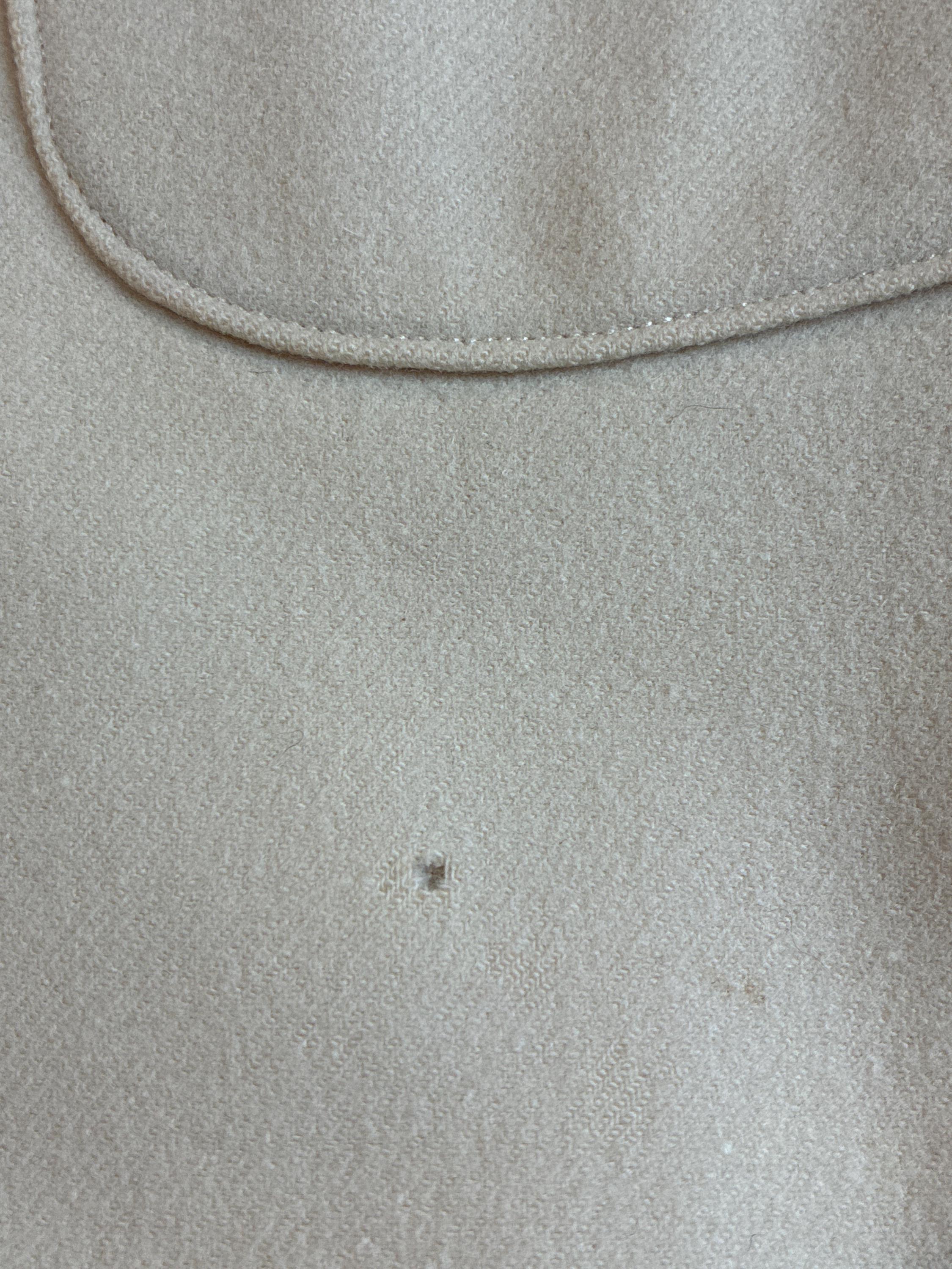 This has not been dry cleaned, although it did have tags indicating the theater has cleaned it in the past. There are two small moth chews - one at left front a couple inches below the breast pocket, and one on the right front a few inches above the patch pocket. There's two small, light spots on the right side of the collar, and one faint spot on the lower left hand pocket. It is very sturdy, and was either not used much by the theater company, or is just very hardy. I find no other issues to note.