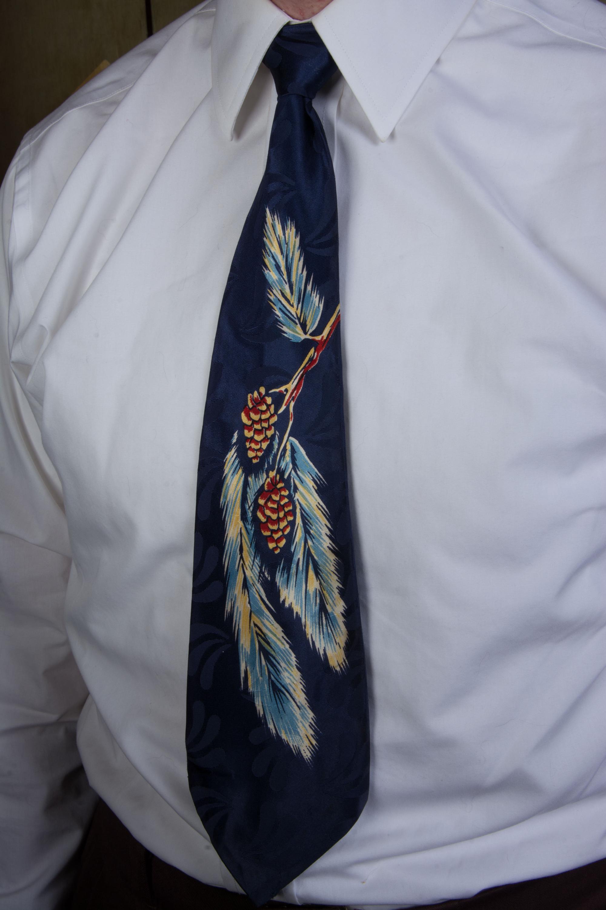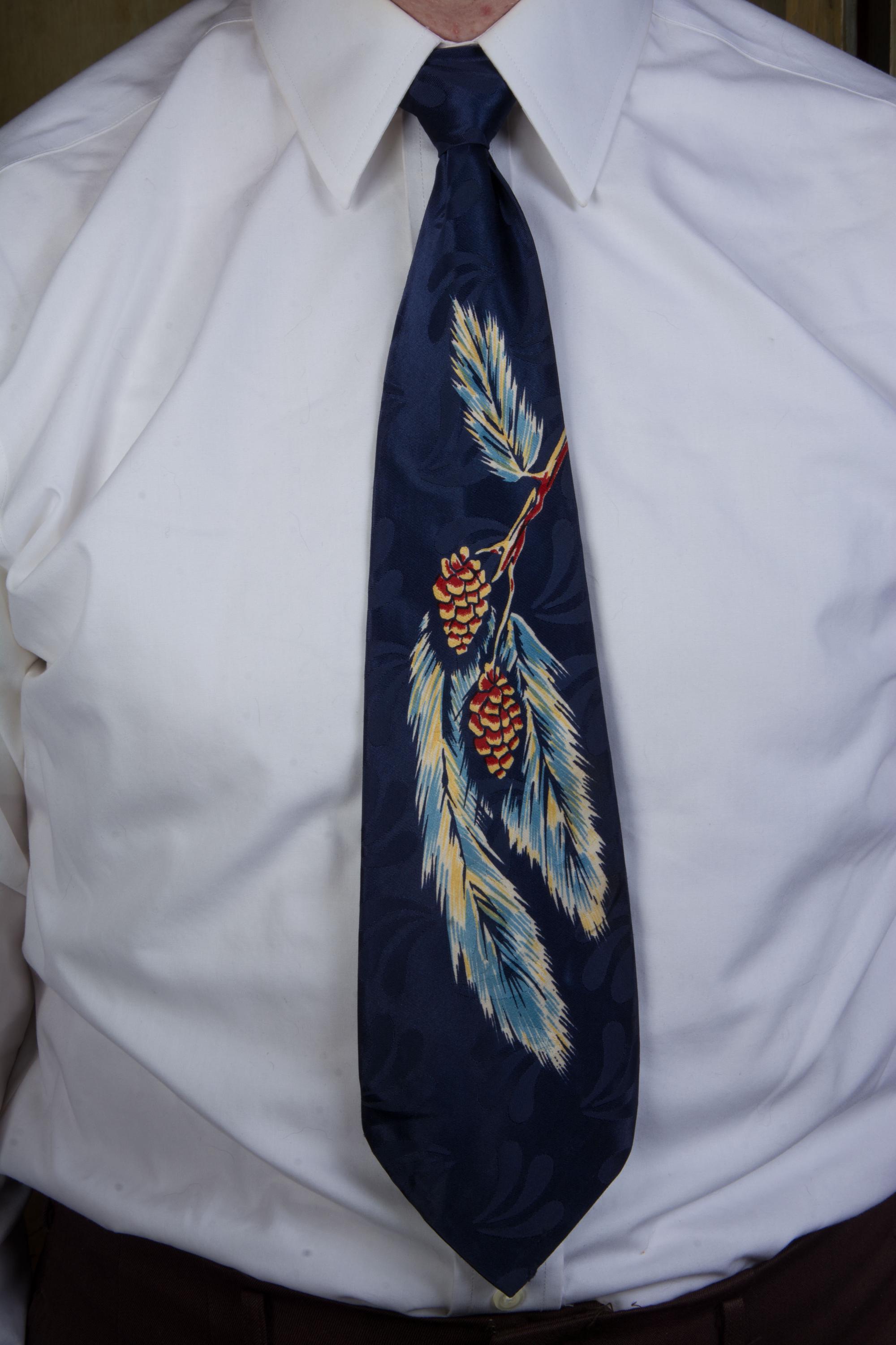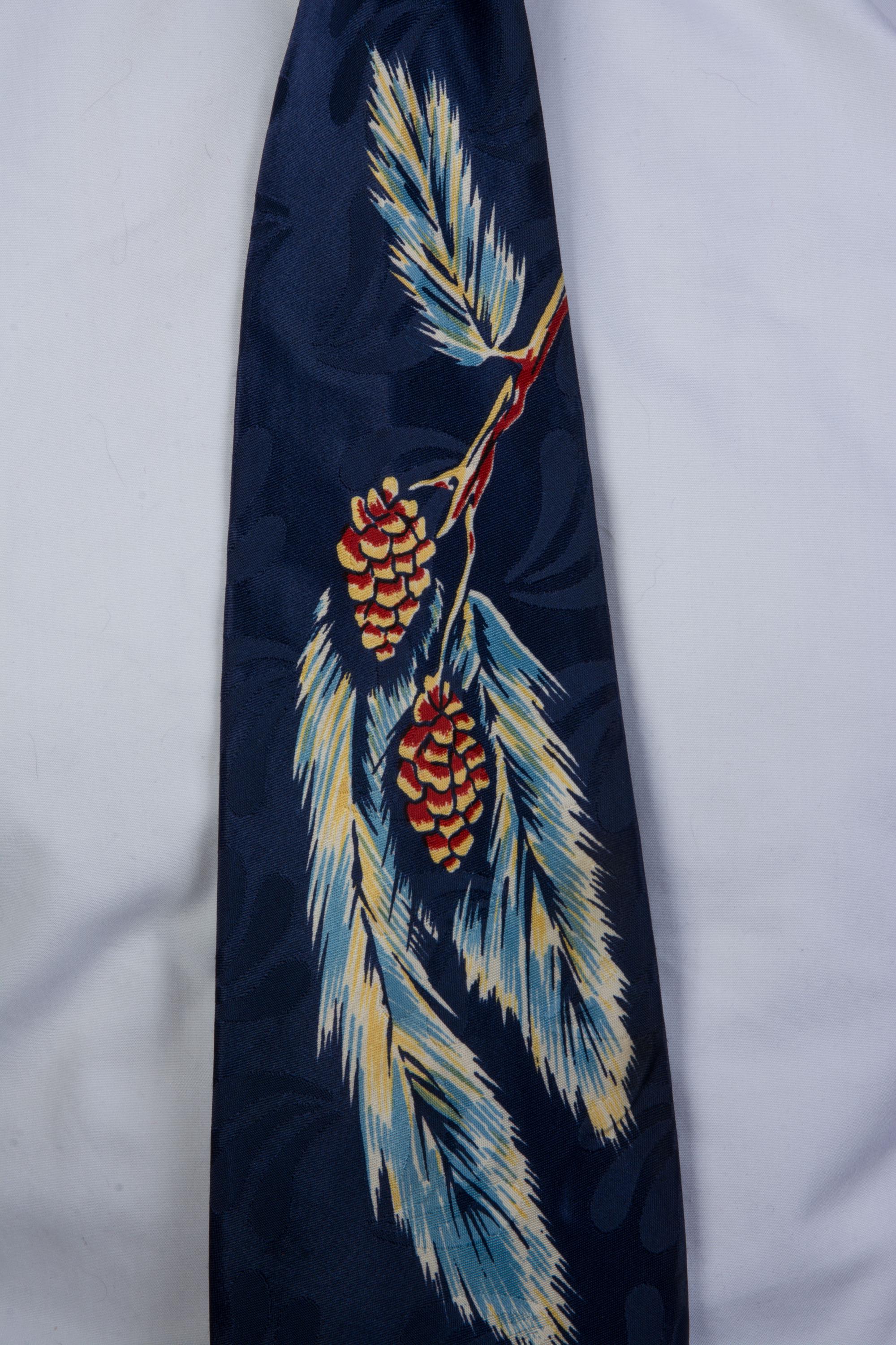 A lustrous tie with the perfect wintery theme - it features snowy fronds of fir tree in blue, white and yellow and little pinecones in yellow and rust brown, all bold against a gleaming blue satin brocade. The print is named "Whispering Pines" made by Creveling of California. It is fully lined.