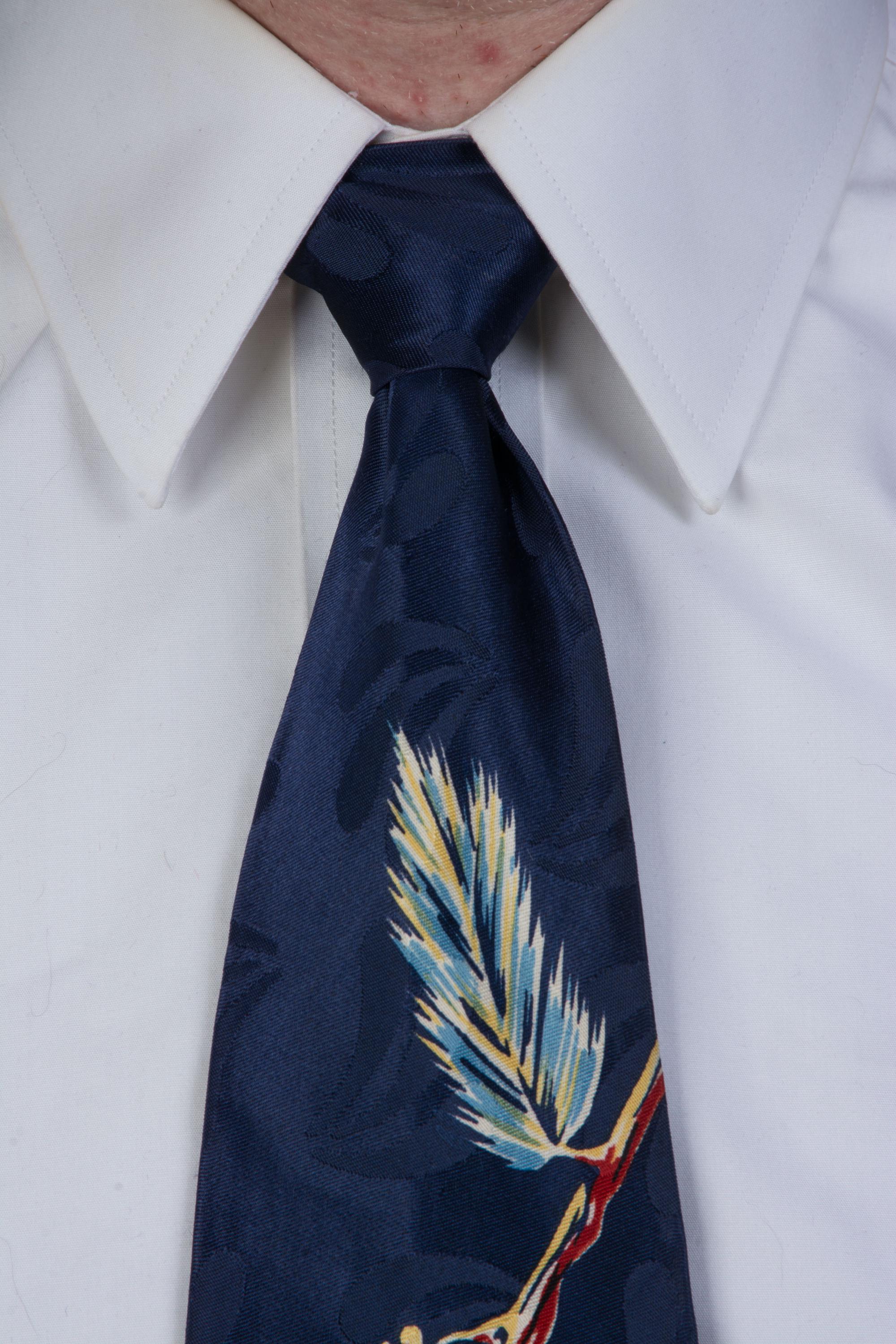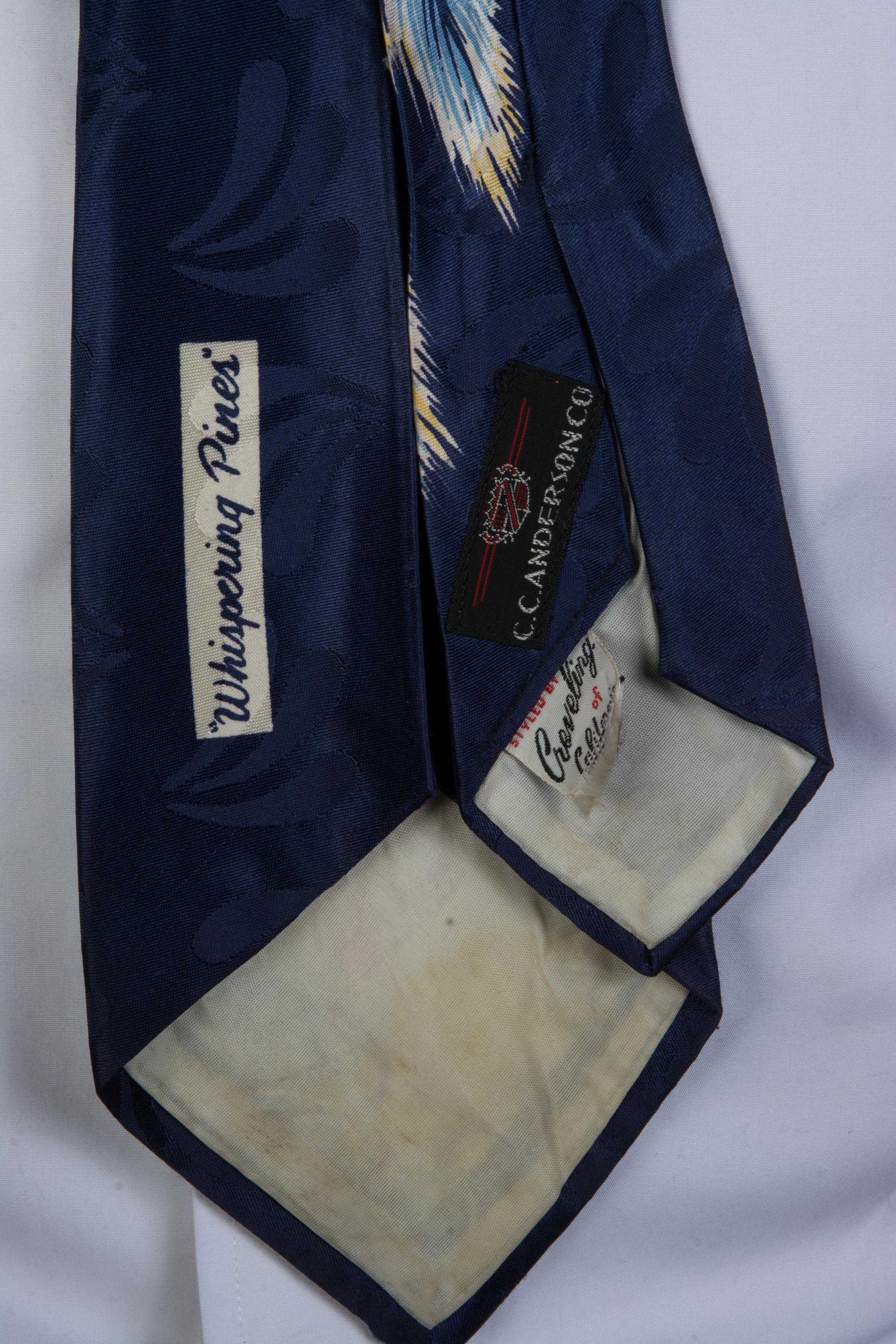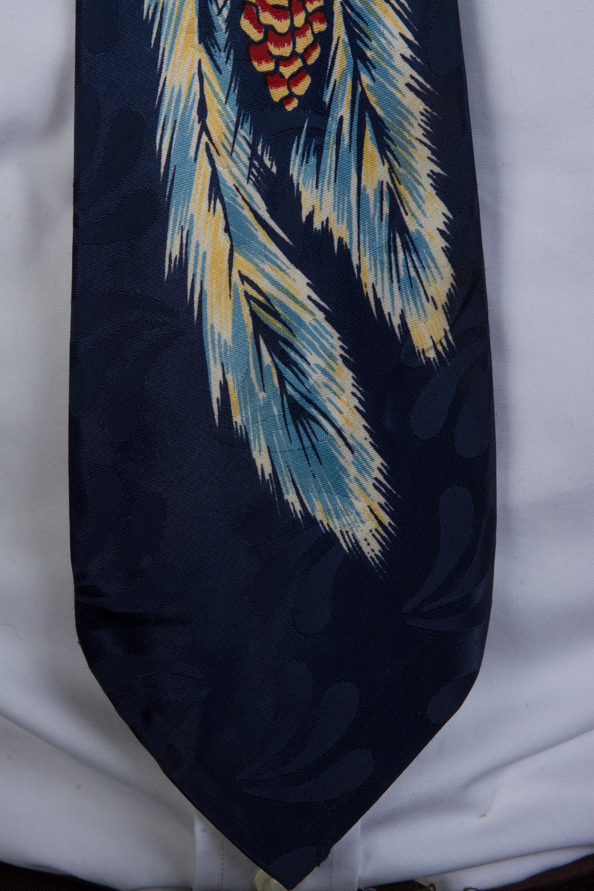 A lustrous tie with the perfect wintery theme - it features snowy fronds of fir tree in blue, white and yellow and little pinecones in yellow and rust brown, all bold against a gleaming blue satin brocade. The print is named "Whispering Pines" made by Creveling of California. It is fully lined.