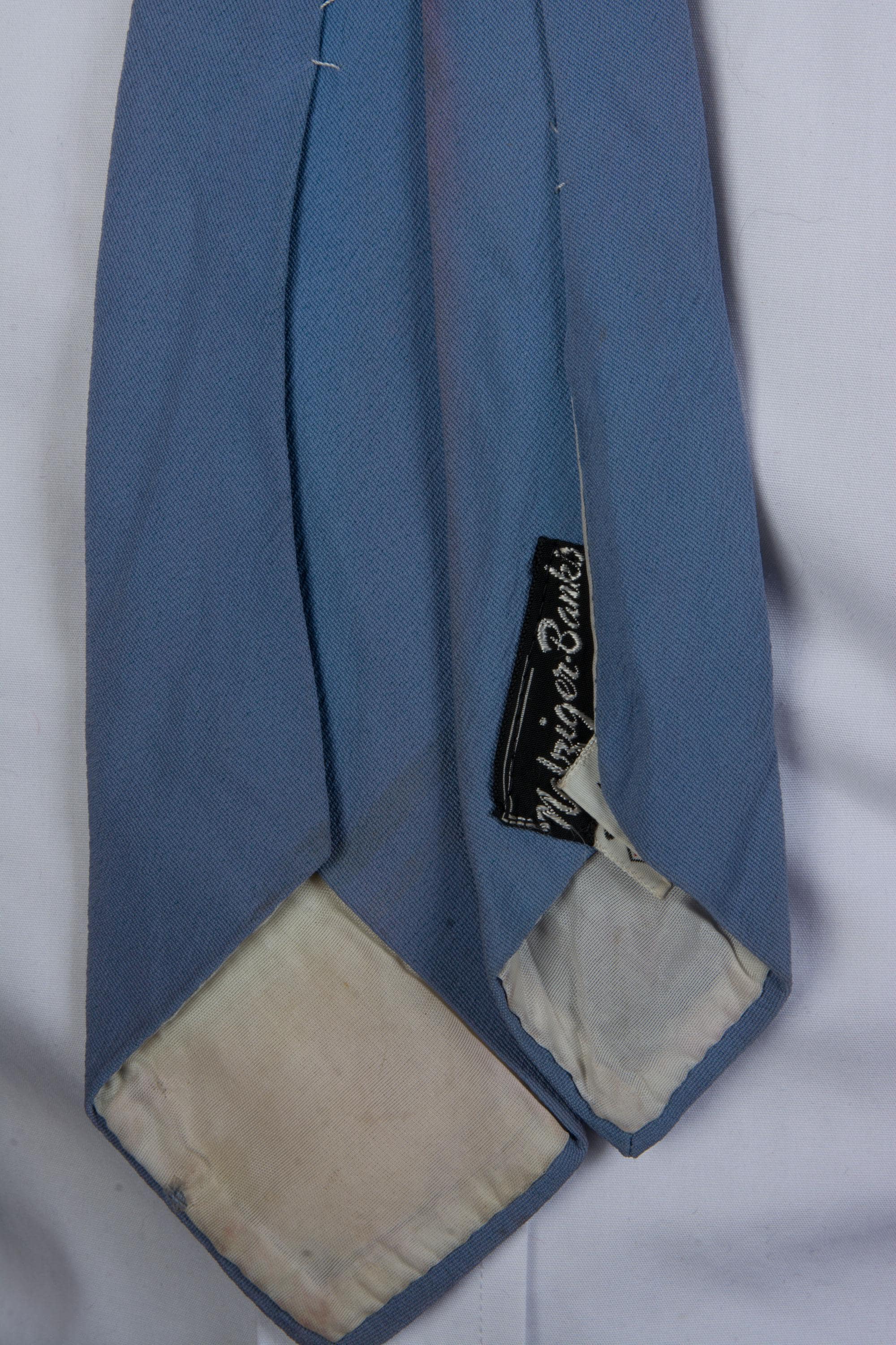 I didn't have this cleaned, as I don't trust my cleaners with painted ties. It has been slightly mis-pressed in the past, and the left side of the blade bows a little - it's minor, but should be corrected with a future press. The cornflower blue color is unstable and has begun to fade to a periwinkle, with more pinkisih hues at the back of the neck. I find no other issues to note!