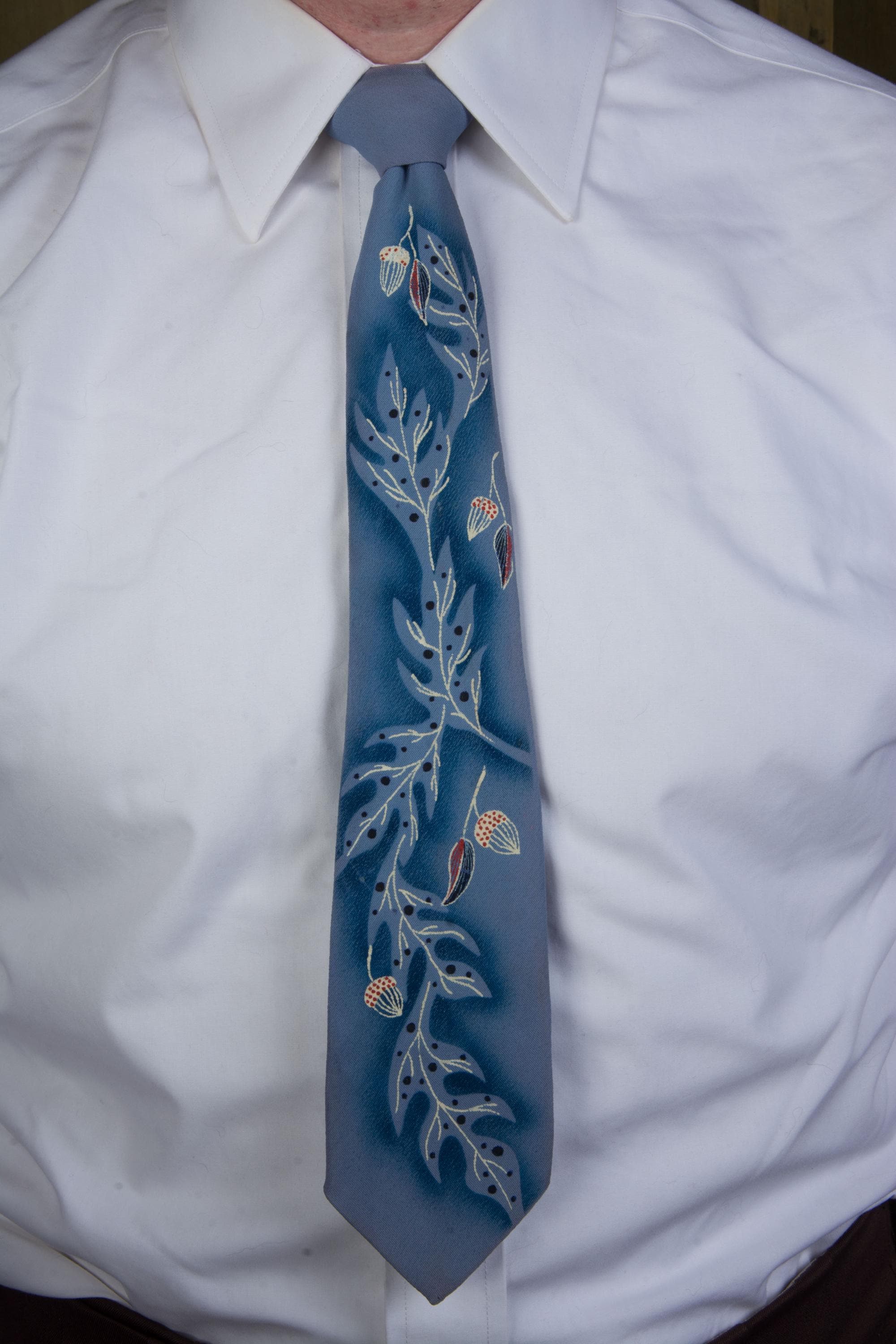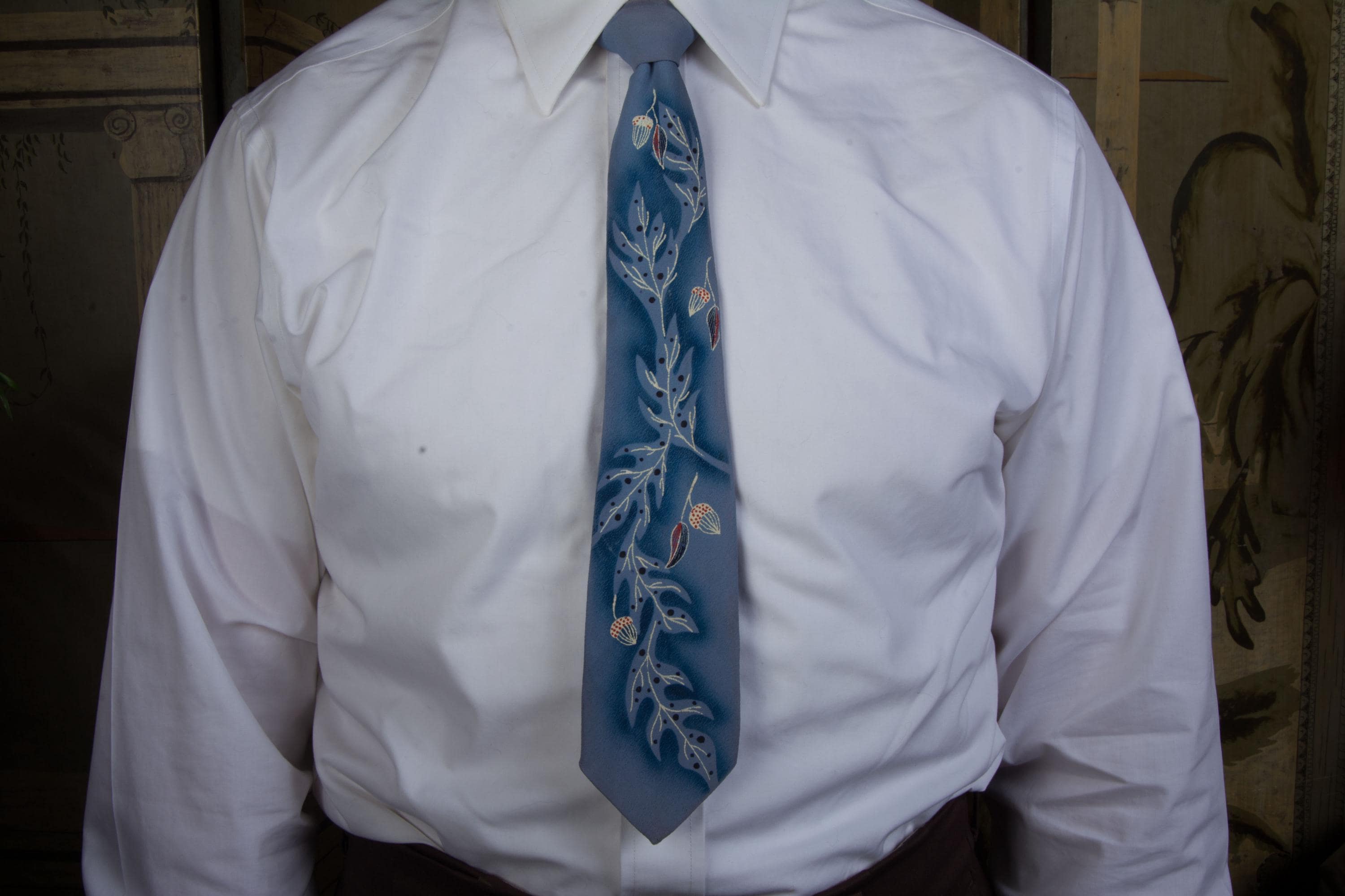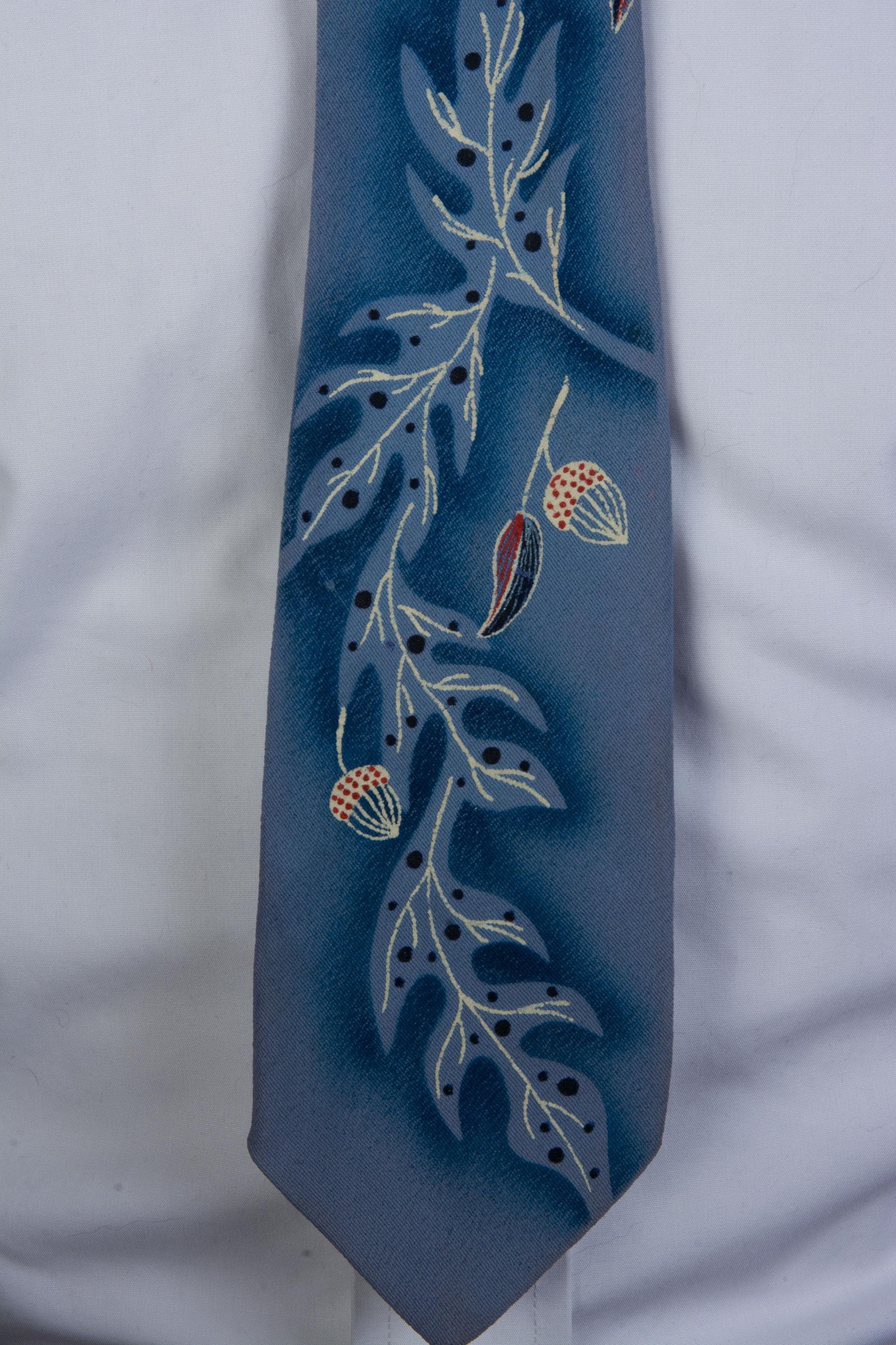 A gorgeous mid to later 1950s tie with hand painted with winter branches, leaves and acorns on a cornflower blue ground. The material has a crepe texture. I love the negative space air brushing, and the way the white branches fill in the ghostly oak tree shapes. This is fully lined
