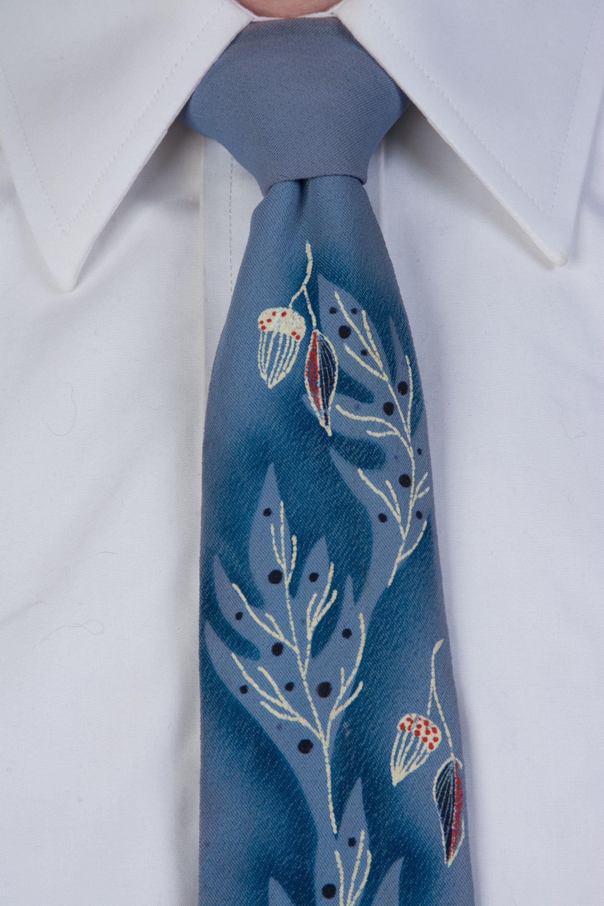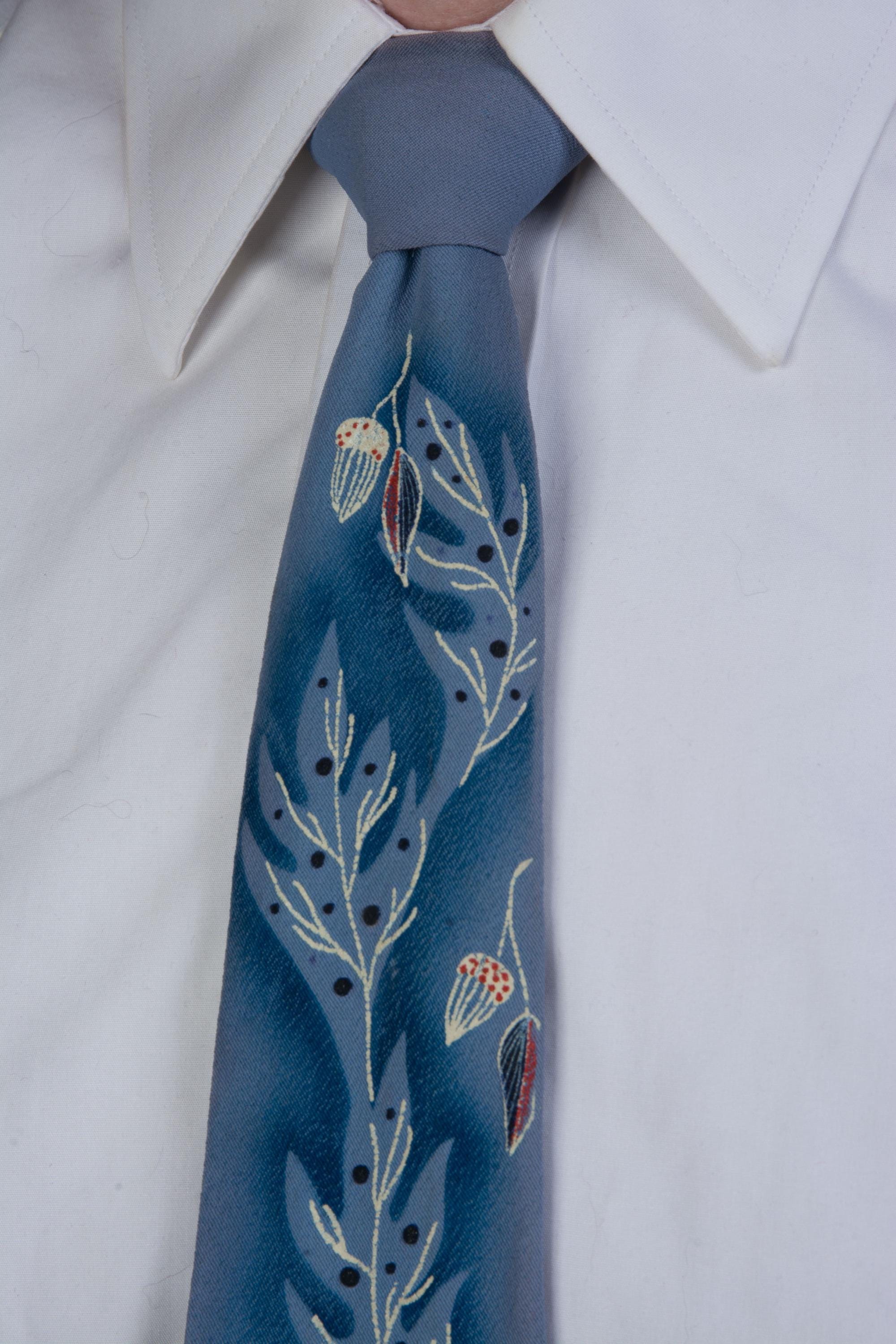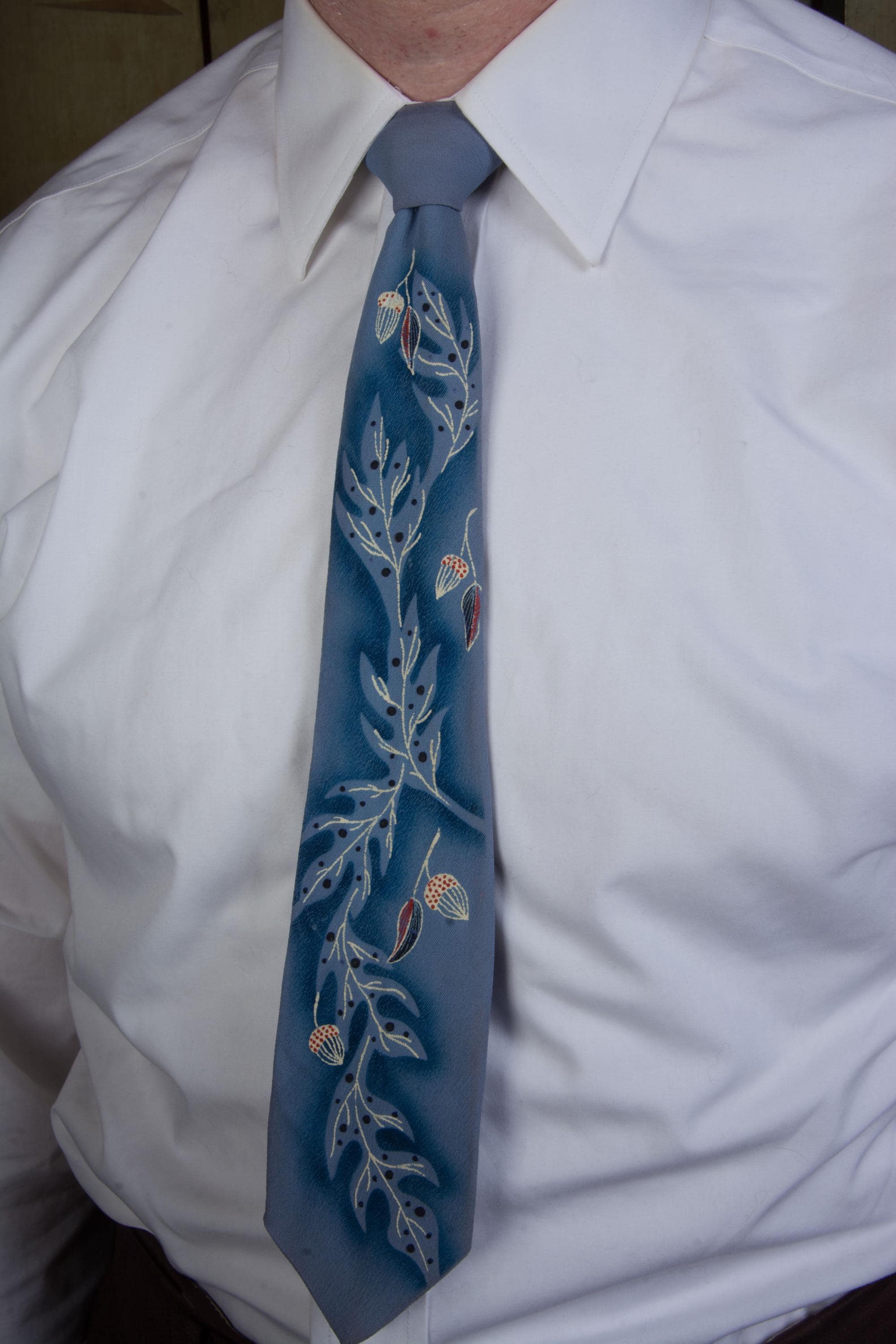 A gorgeous mid to later 1950s tie with hand painted with winter branches, leaves and acorns on a cornflower blue ground. The material has a crepe texture. I love the negative space air brushing, and the way the white branches fill in the ghostly oak tree shapes. This is fully lined