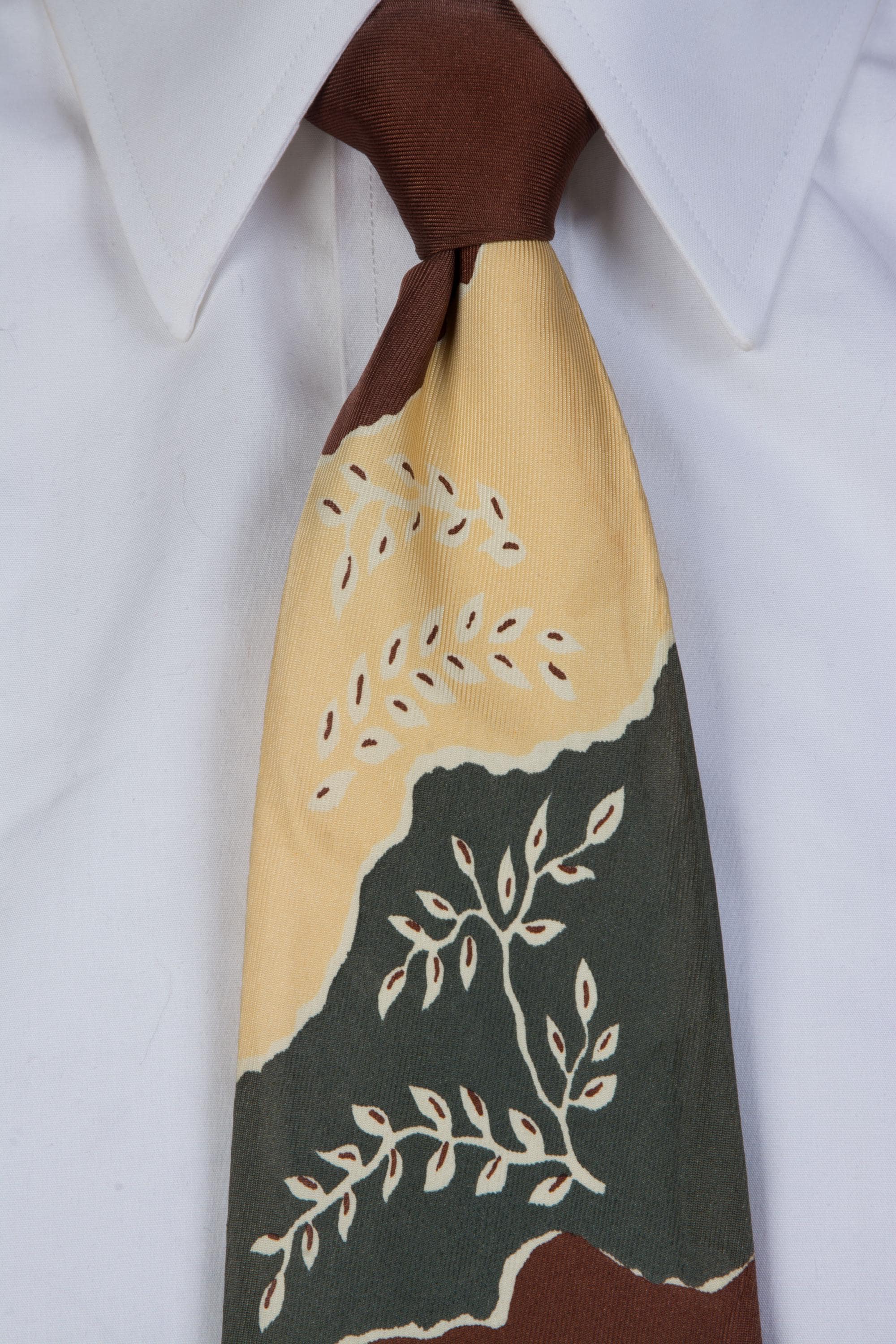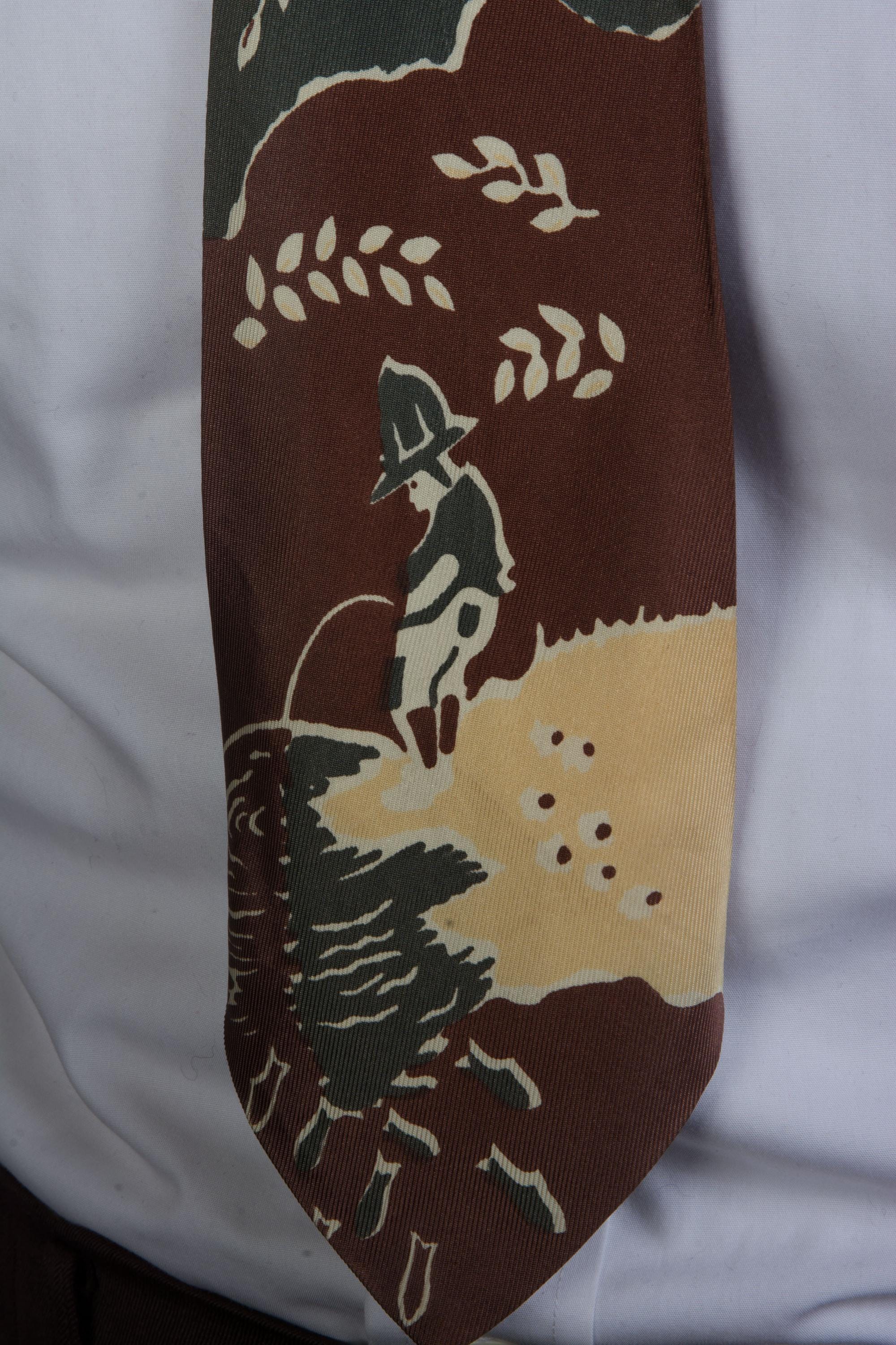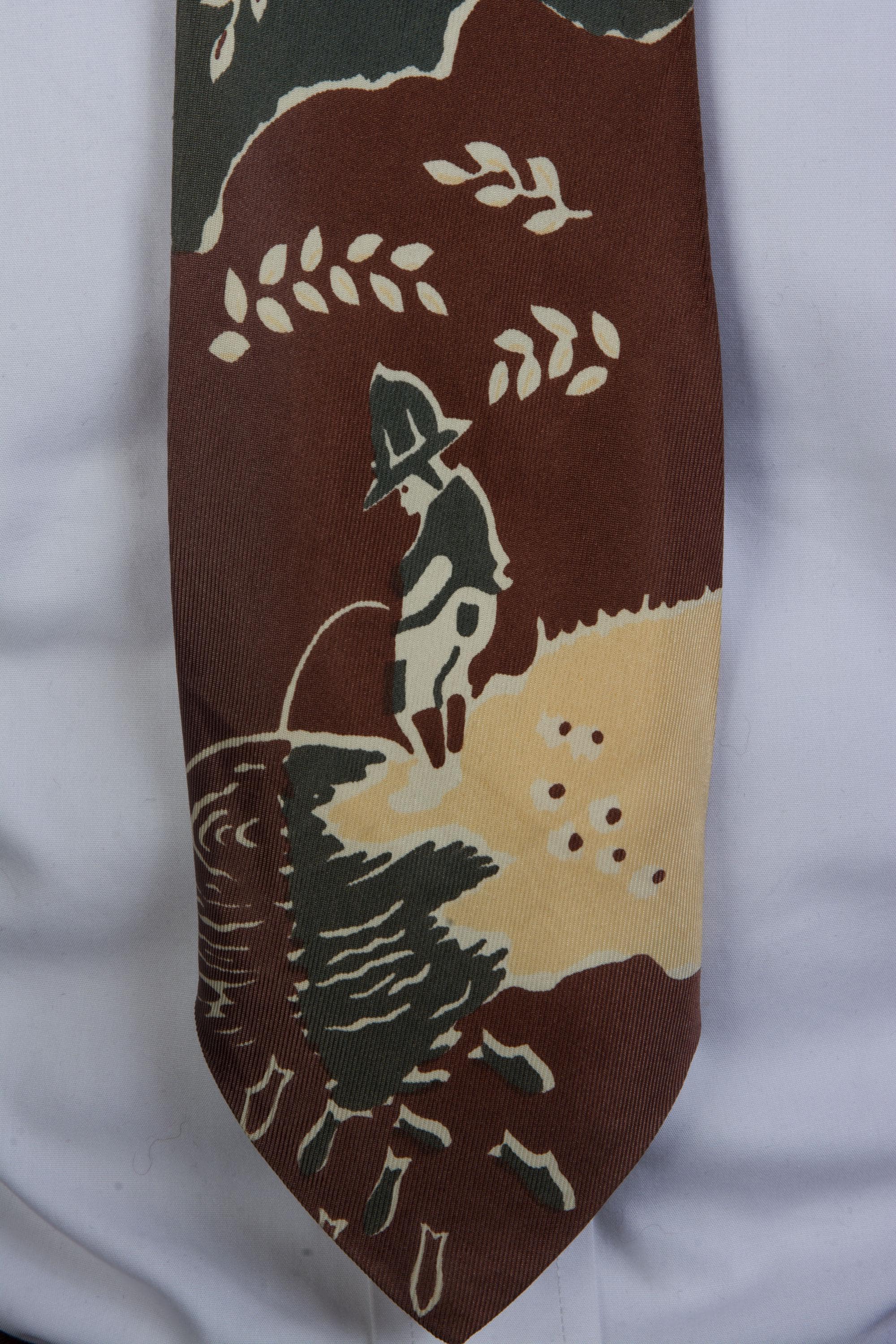 A very cheeky, very classic novelty necktie from the golden era of men's neckwear. Intentionally flippant, this piece features the classic naught lil guy peeing into a pond - I swear this must be what the Calvin windshield stickers were based on! Its down in warm autumnal tones - brown, butter yellow, muted spruce green. It is fully lined.