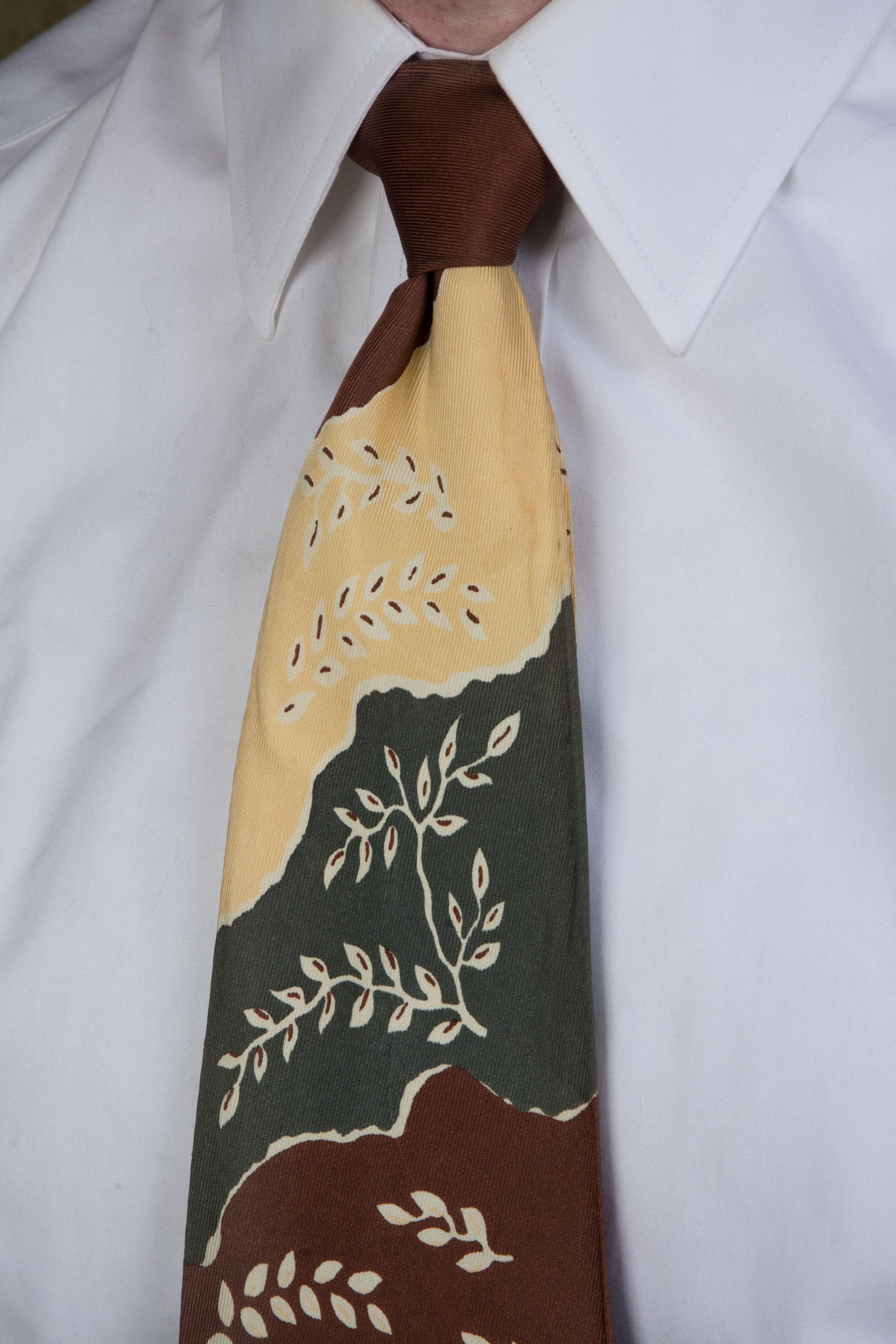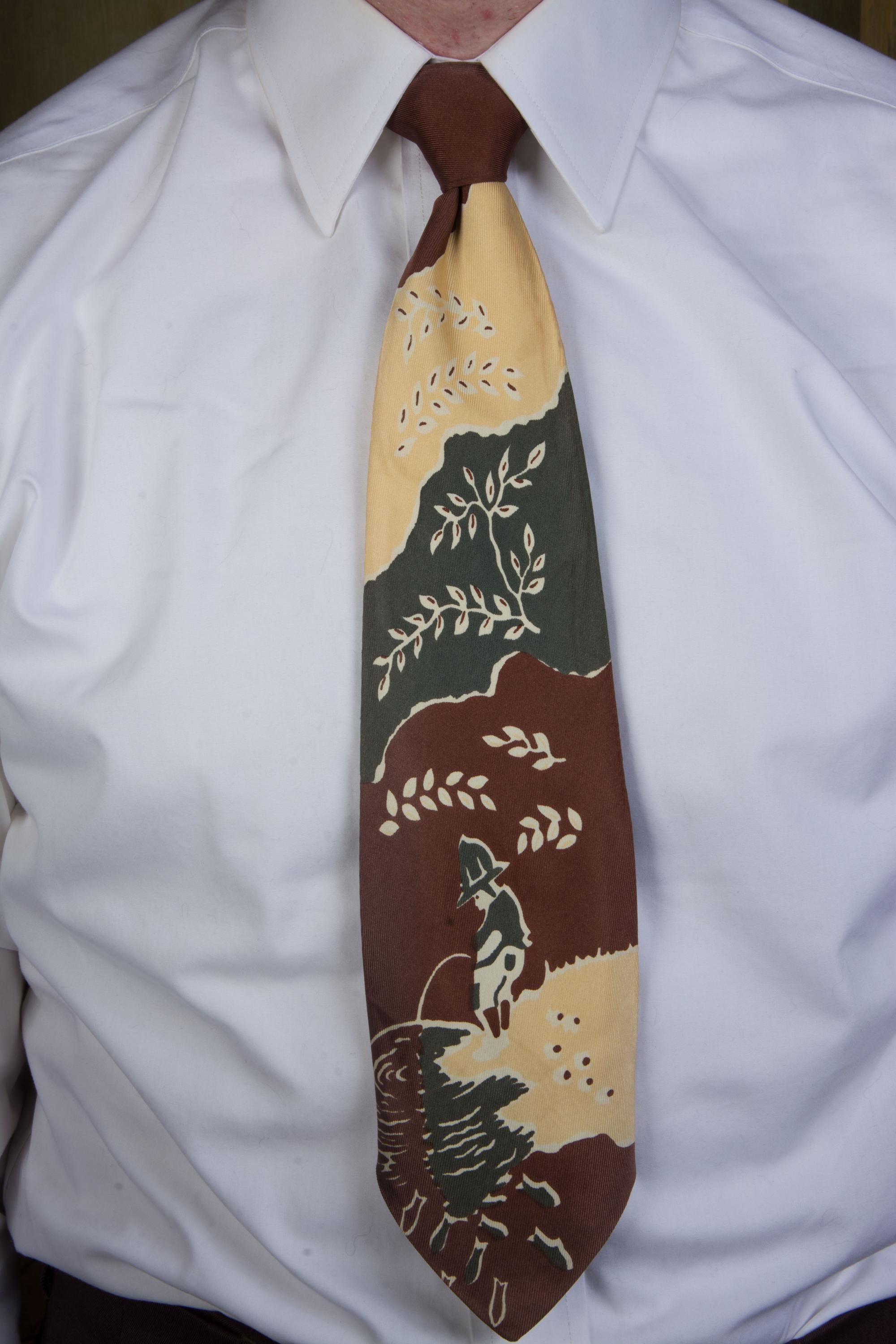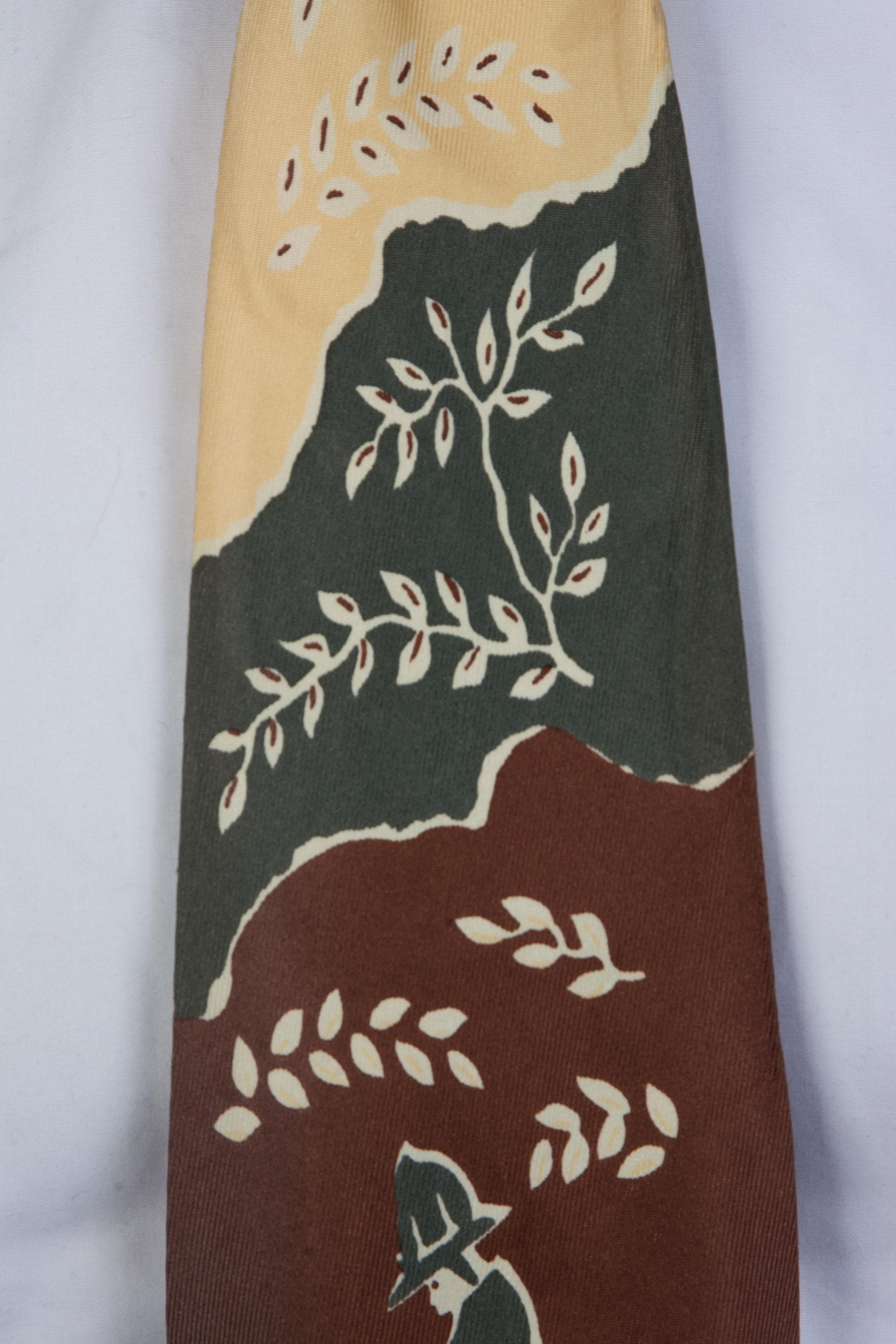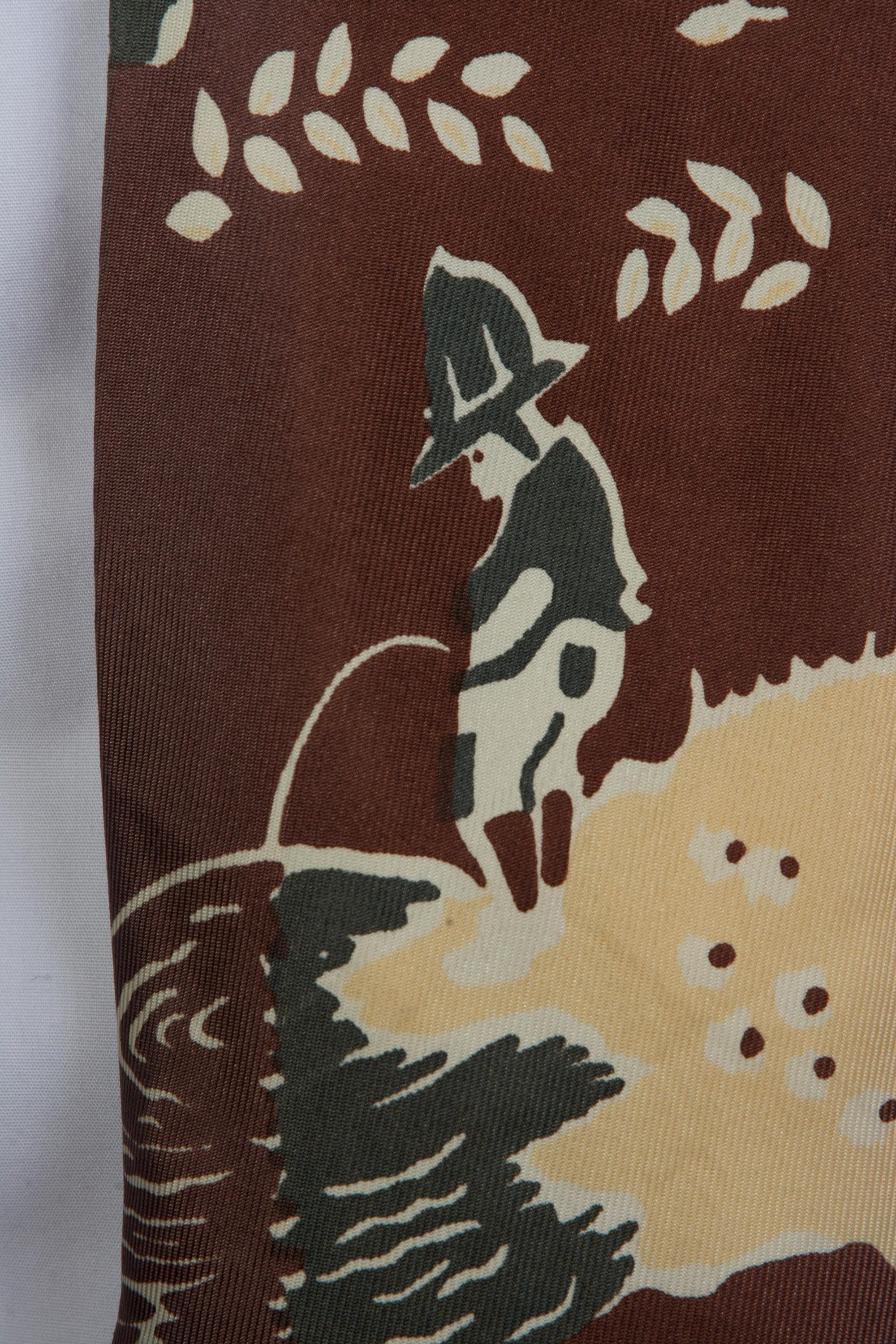 A very cheeky, very classic novelty necktie from the golden era of men's neckwear. Intentionally flippant, this piece features the classic naught lil guy peeing into a pond - I swear this must be what the Calvin windshield stickers were based on! Its down in warm autumnal tones - brown, butter yellow, muted spruce green. It is fully lined.