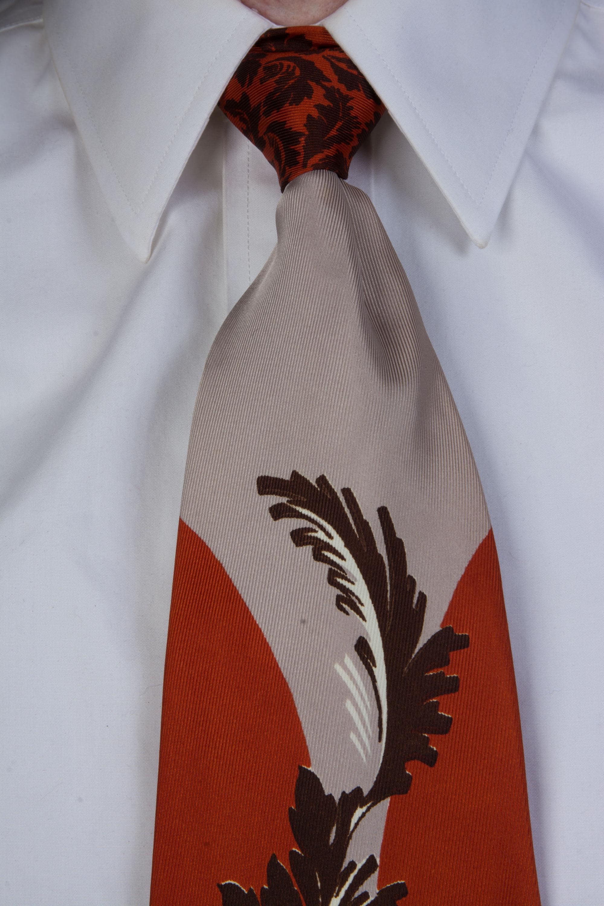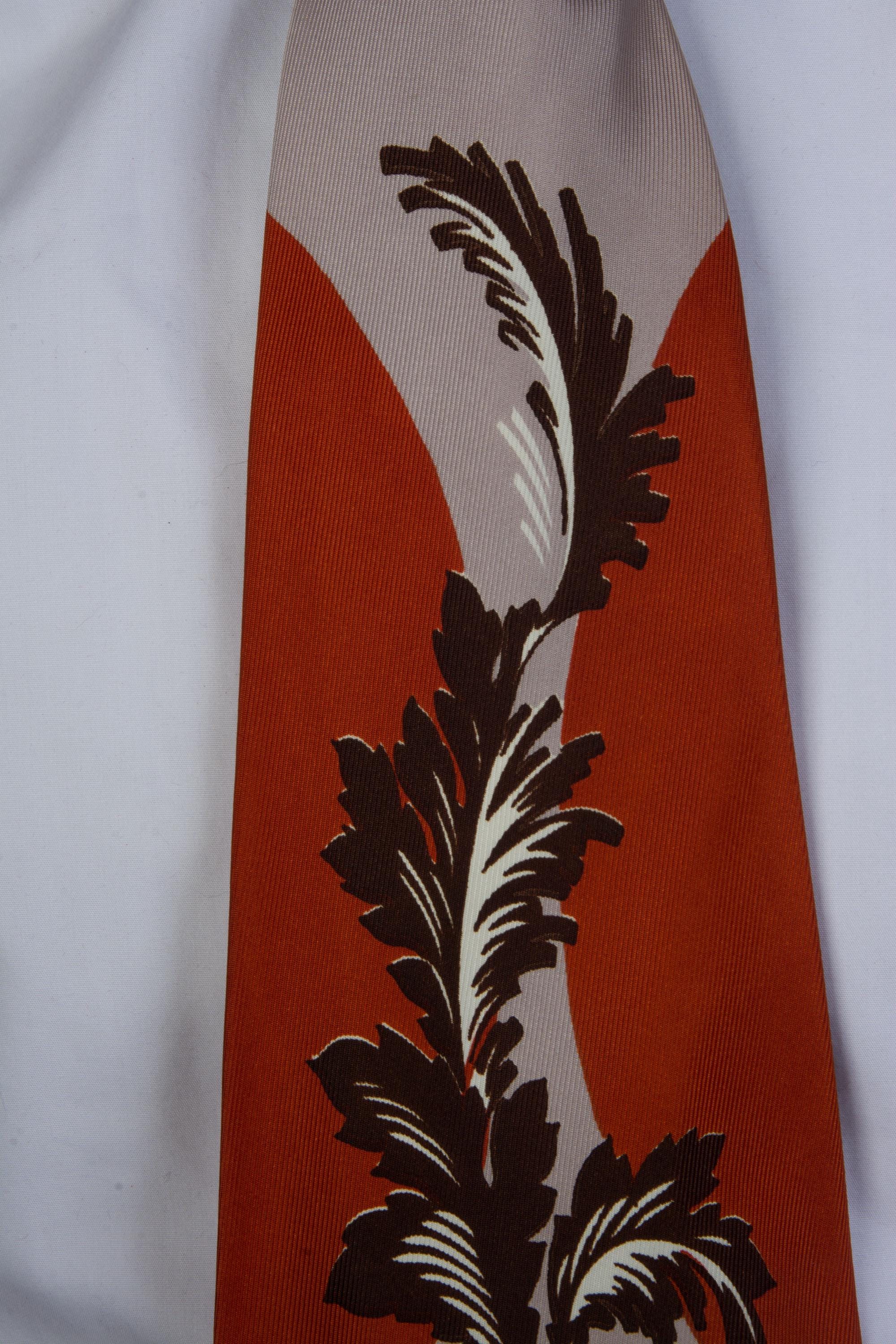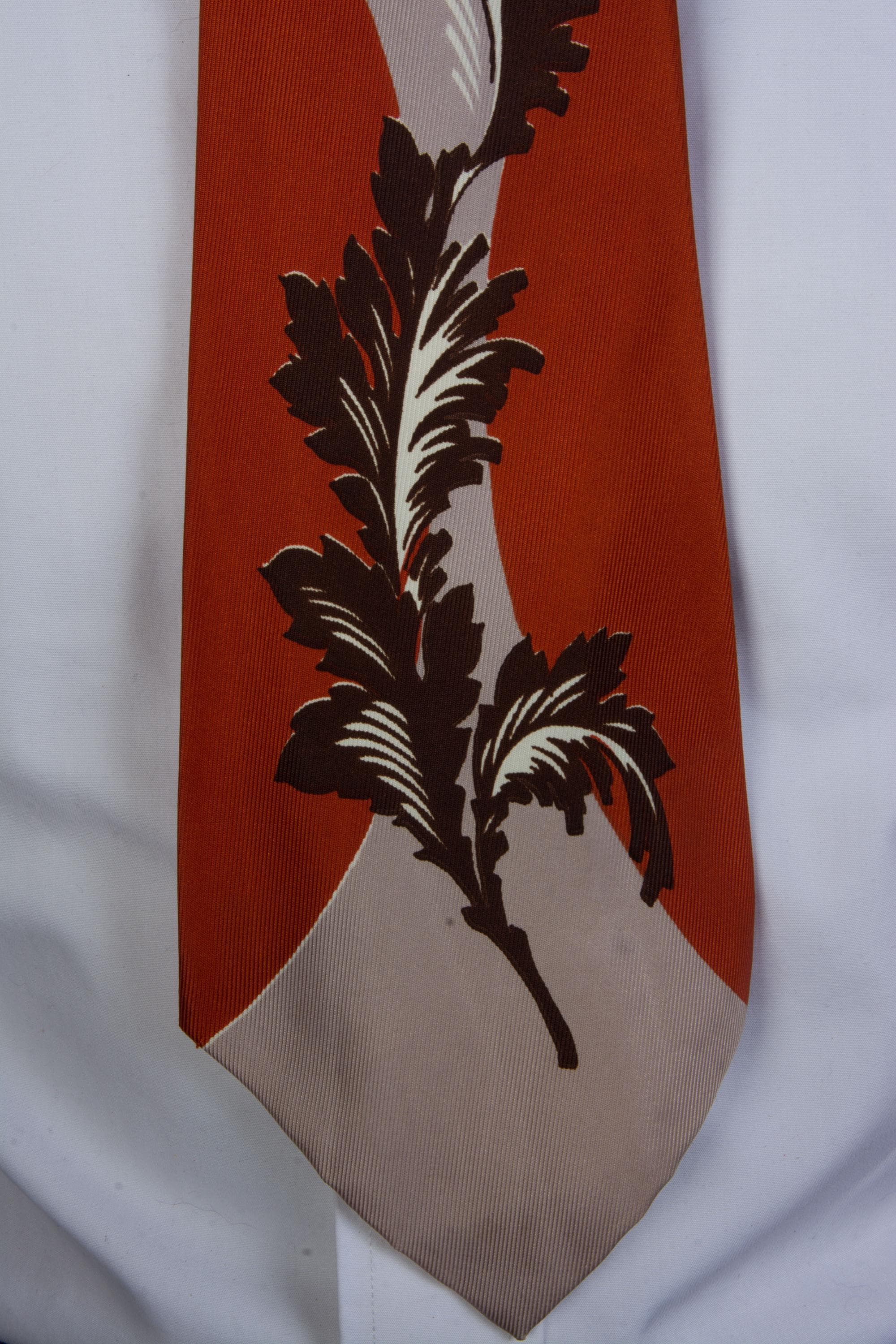 A bold tie in a unique colorway - rusty orange with warm taupe grey. I love the styling of this print - a brown and white stem with frilled leaves climbs between two circles of orange. The motif is repeated in miniature, brown against rust orange at the knot - I do love a contrast knot. This is fully lined.