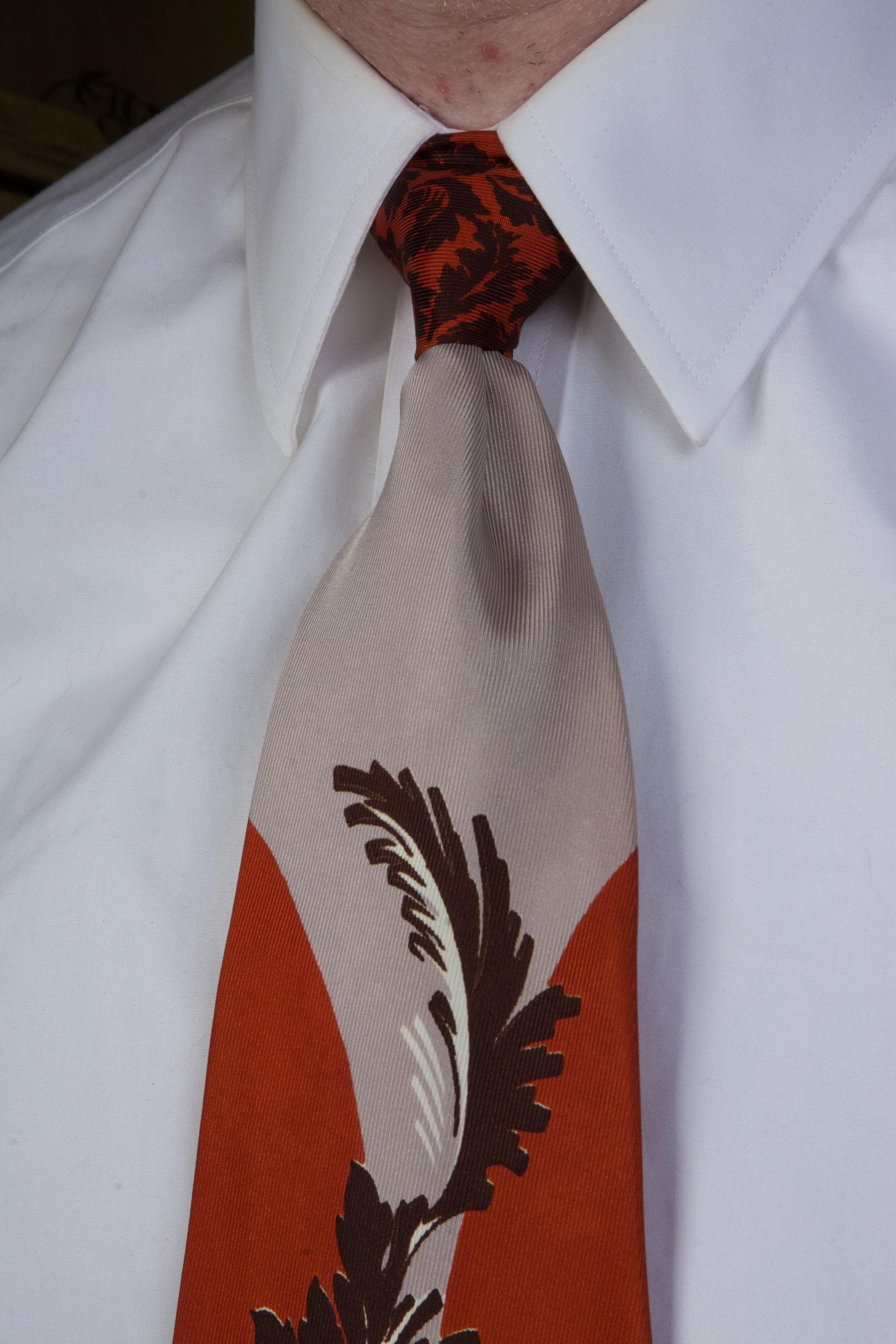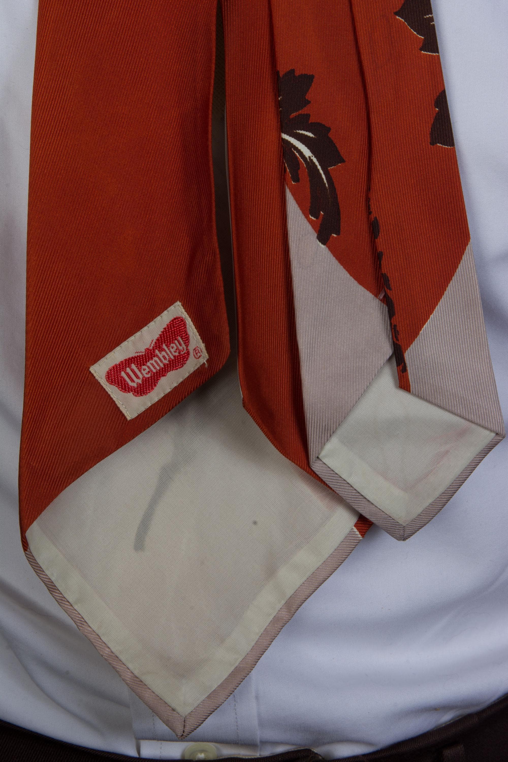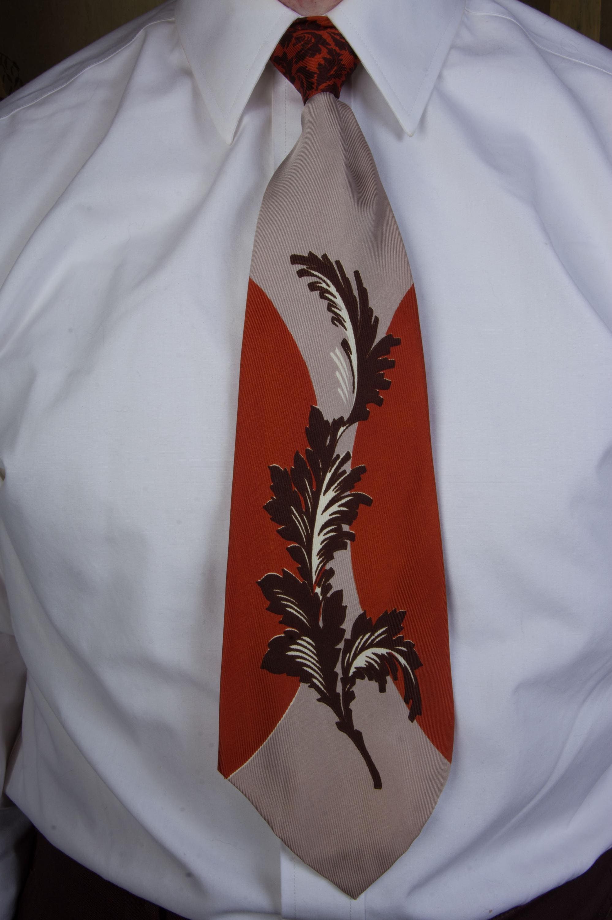A bold tie in a unique colorway - rusty orange with warm taupe grey. I love the styling of this print - a brown and white stem with frilled leaves climbs between two circles of orange. The motif is repeated in miniature, brown against rust orange at the knot - I do love a contrast knot. This is fully lined.