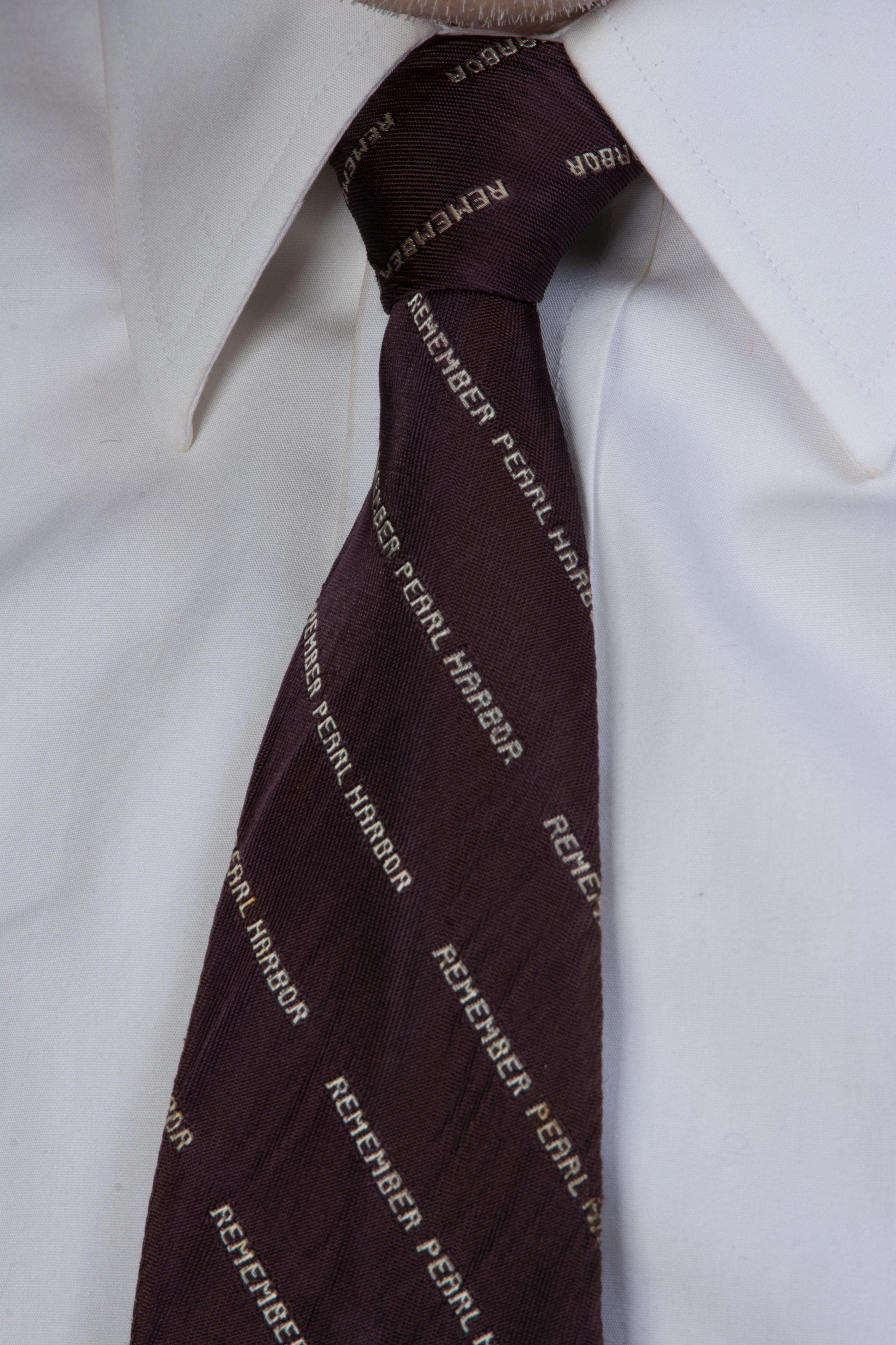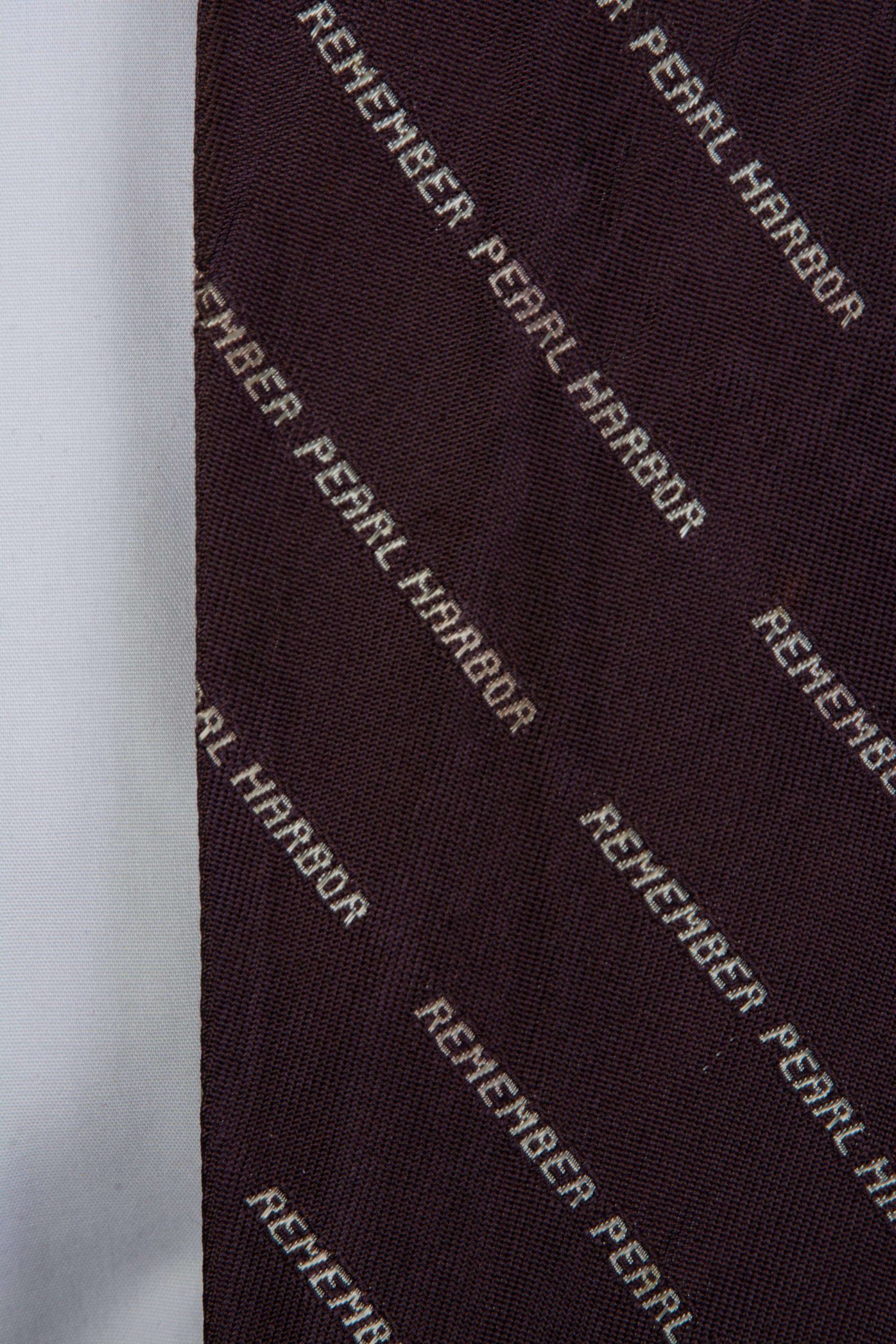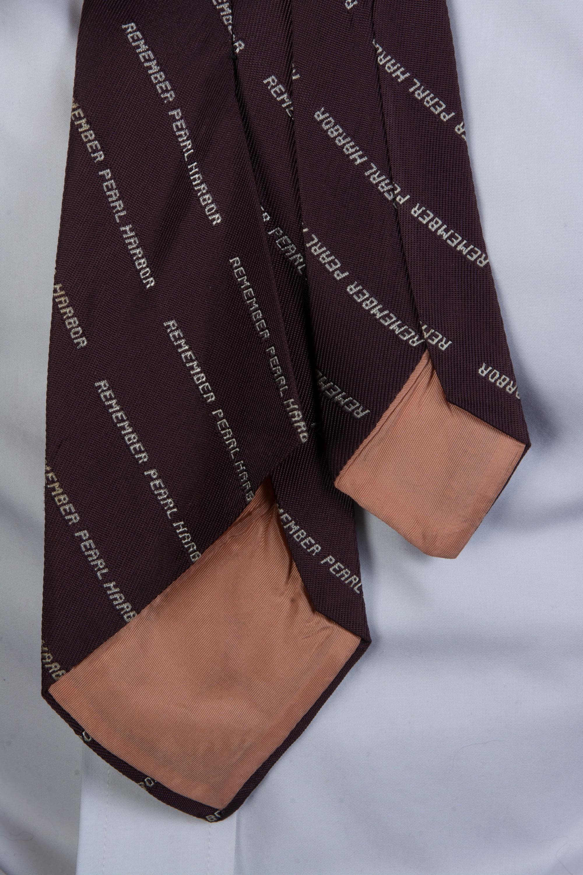 A vintage 1960s tie, probably made around the 25th anniversary of the attack on Pearl Harbor. The words "Remember Pearl Harbor" are written in white block script, on a subtle plum purple ground. The tie is fully lined in peach acetate