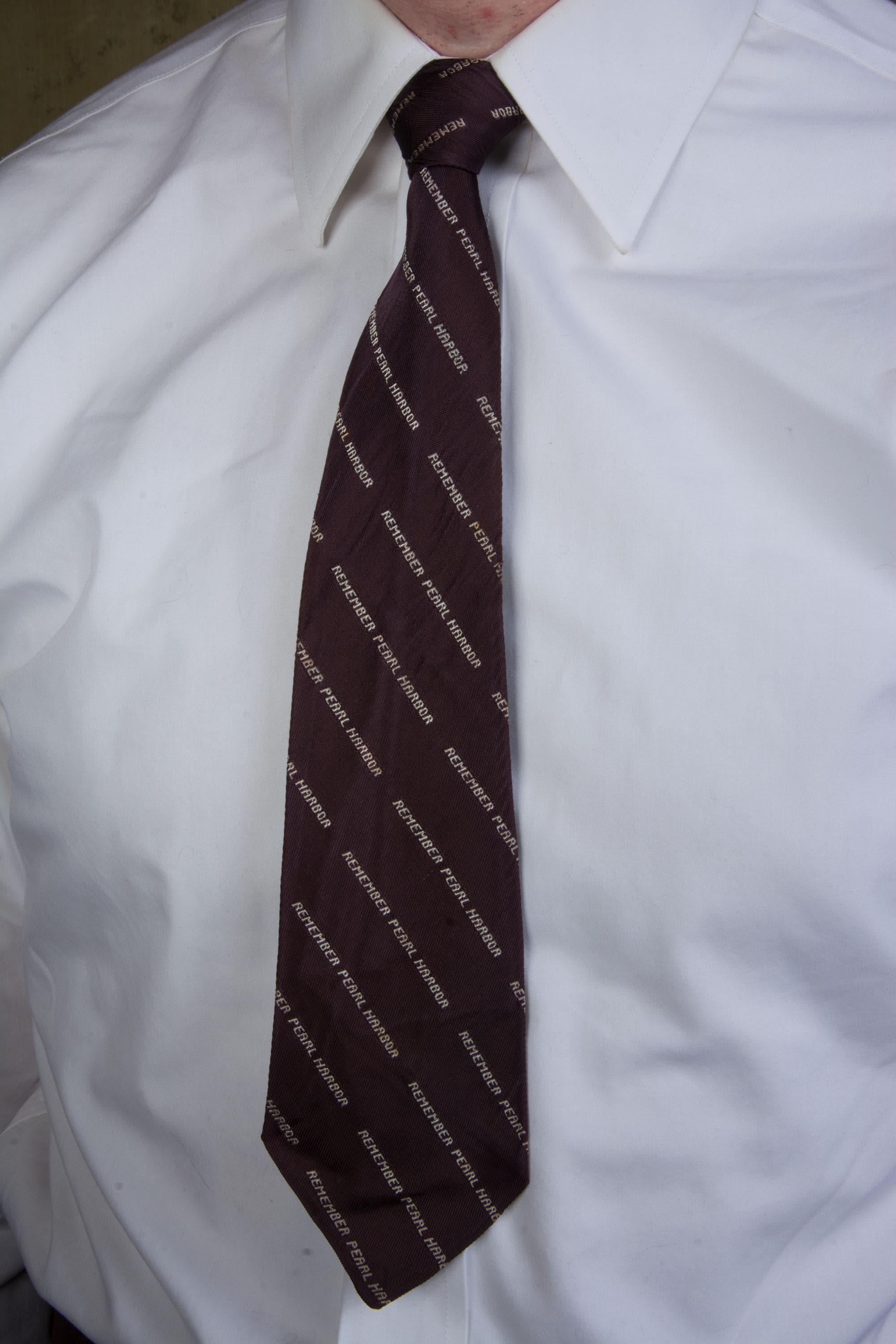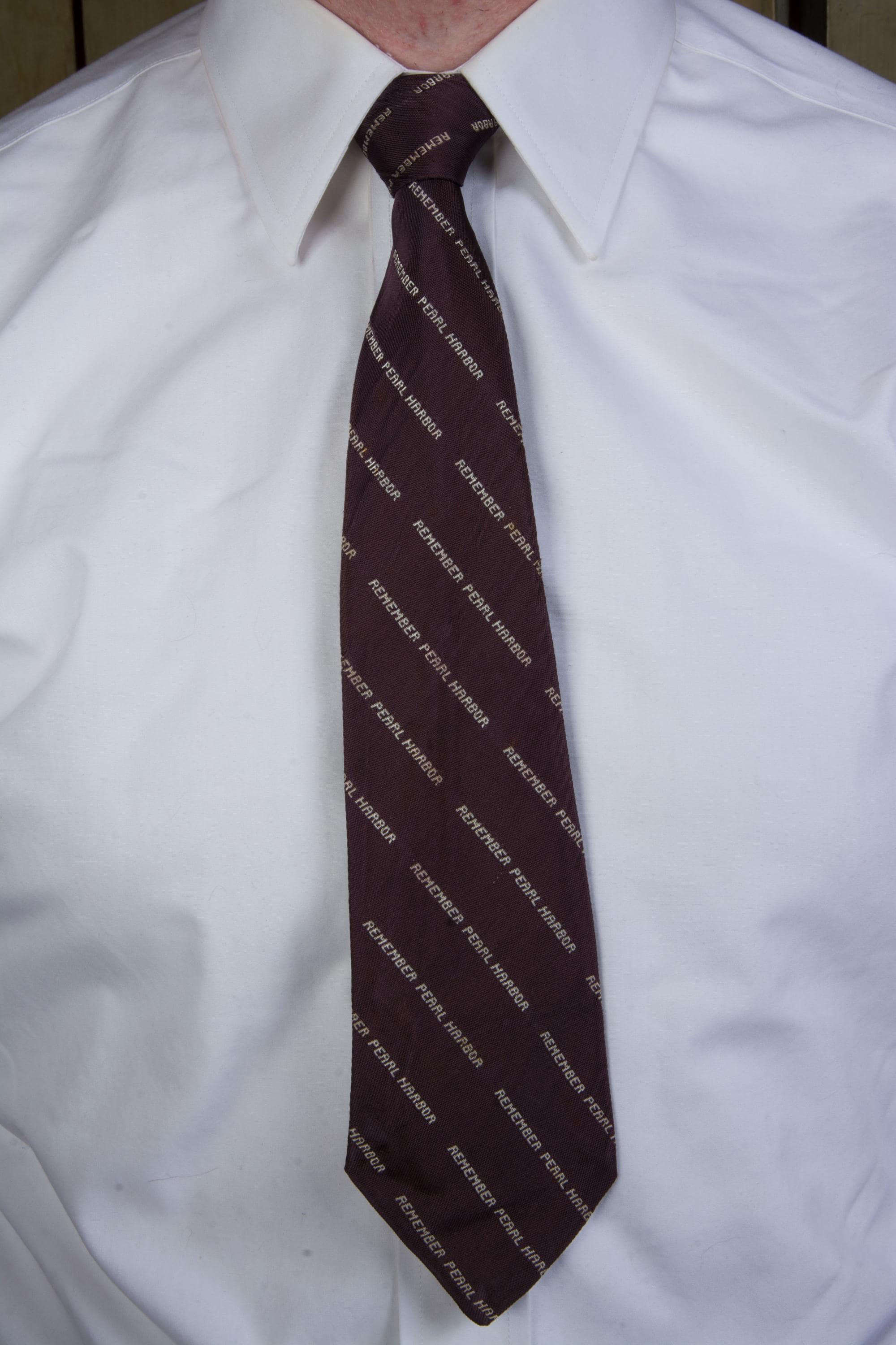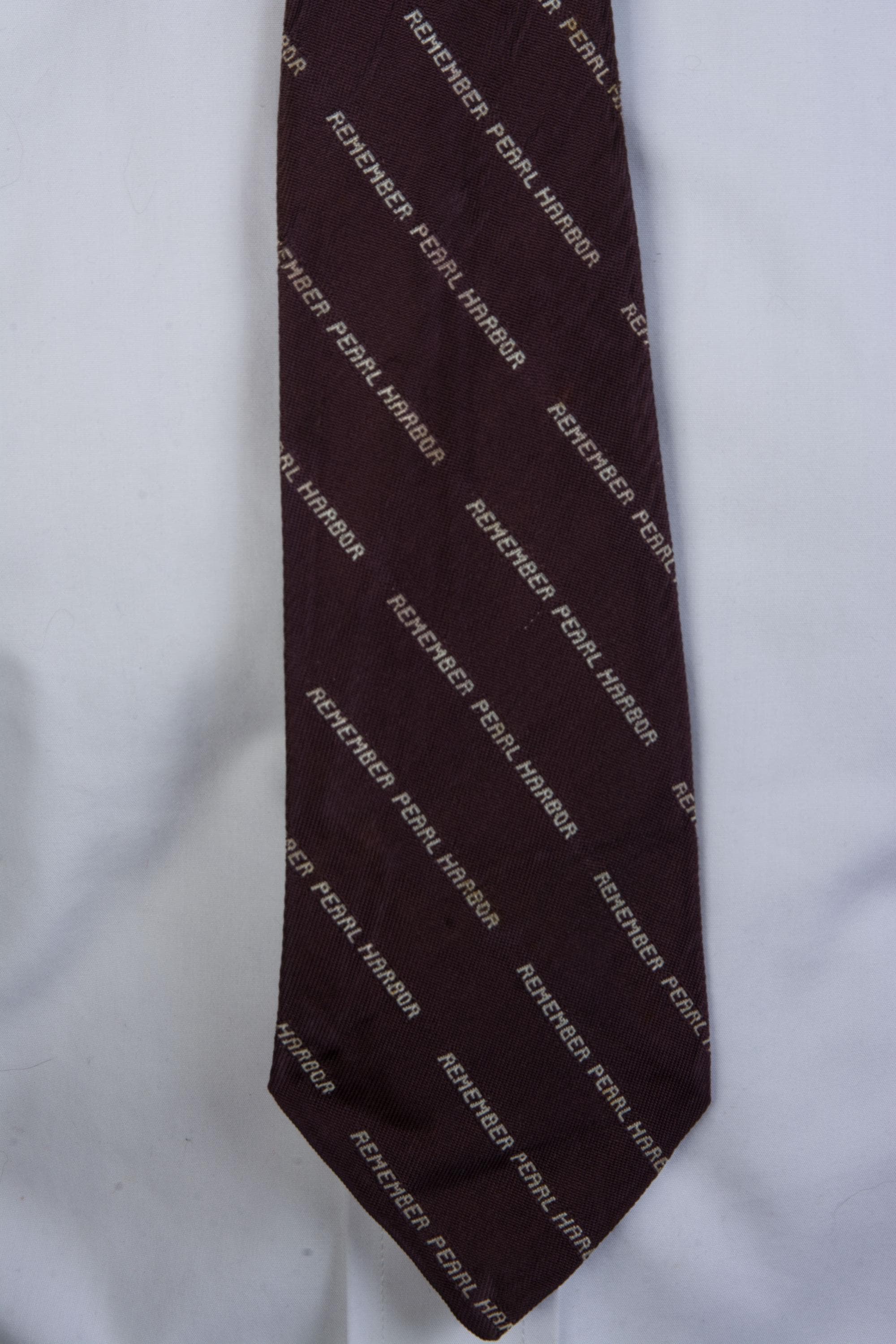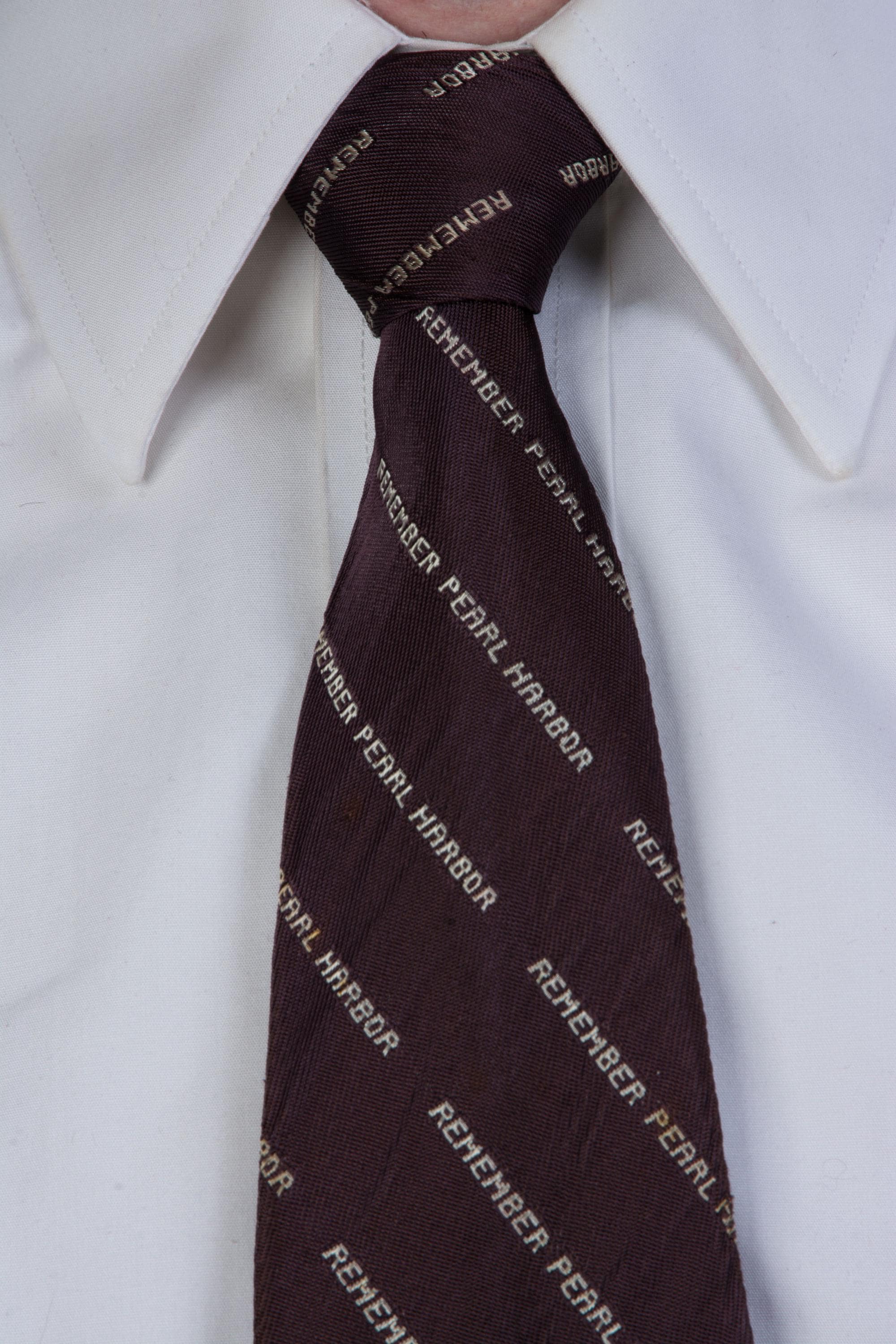 A vintage 1960s tie, probably made around the 25th anniversary of the attack on Pearl Harbor. The words "Remember Pearl Harbor" are written in white block script, on a subtle plum purple ground. The tie is fully lined in peach acetate