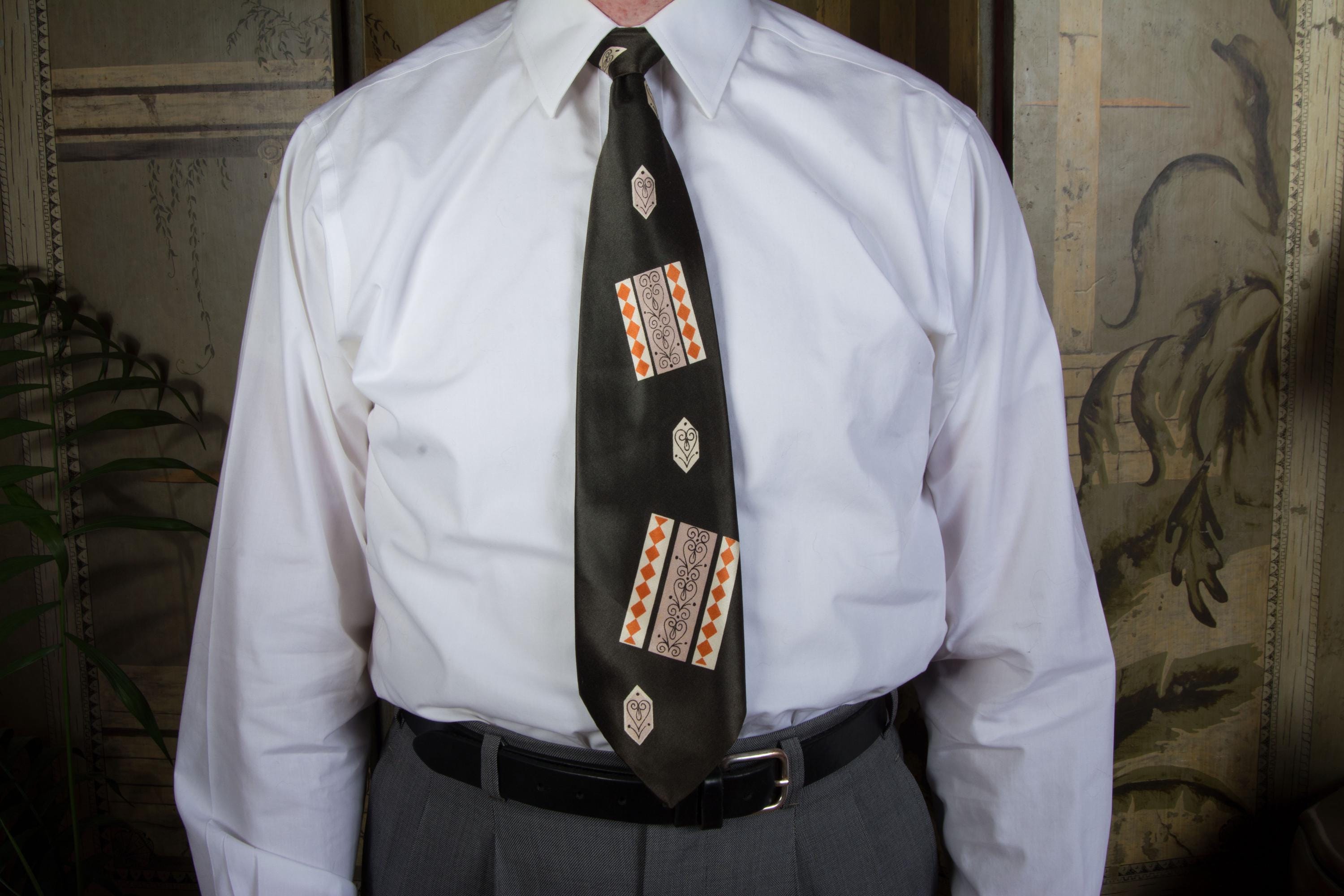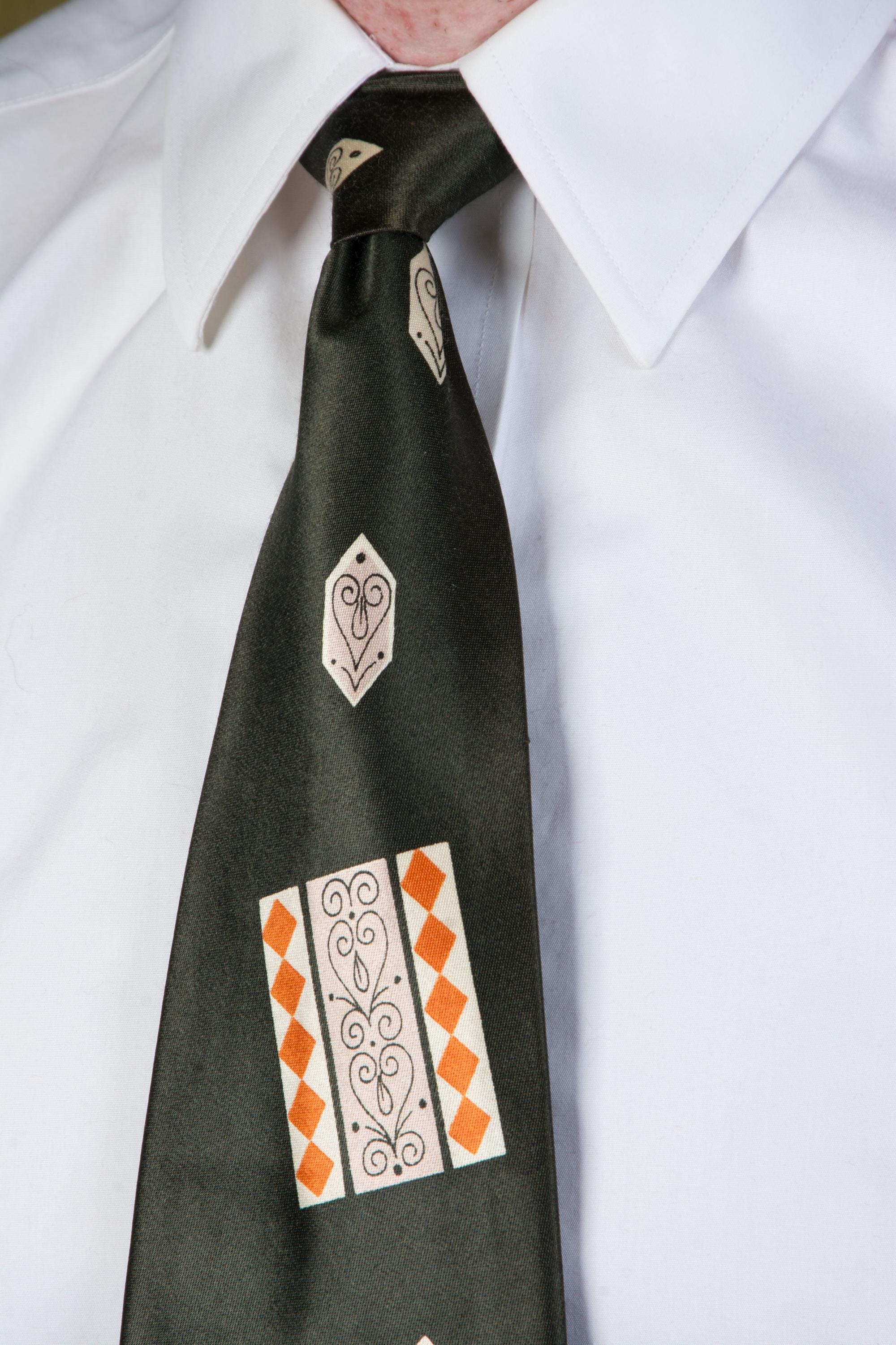 A lustrous 1940s satin necktie, softly gleaming in a subbed, drying pine needle green hue. The dark, drab family hue is off set with crisp white, pumpkin orange and a very pale lavender-rose hue, with black line work. It's an usual combination, I like it. Fully lined.