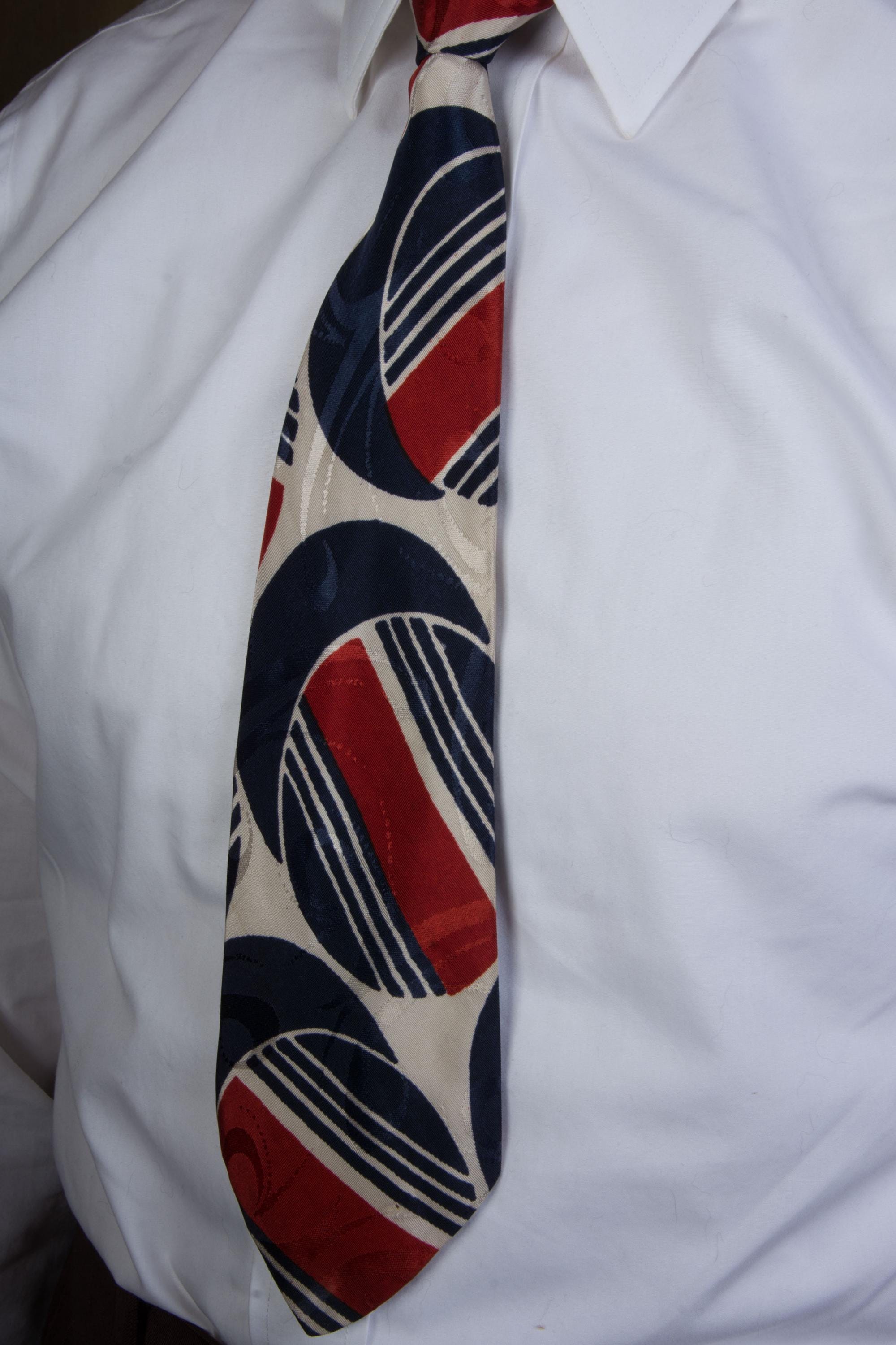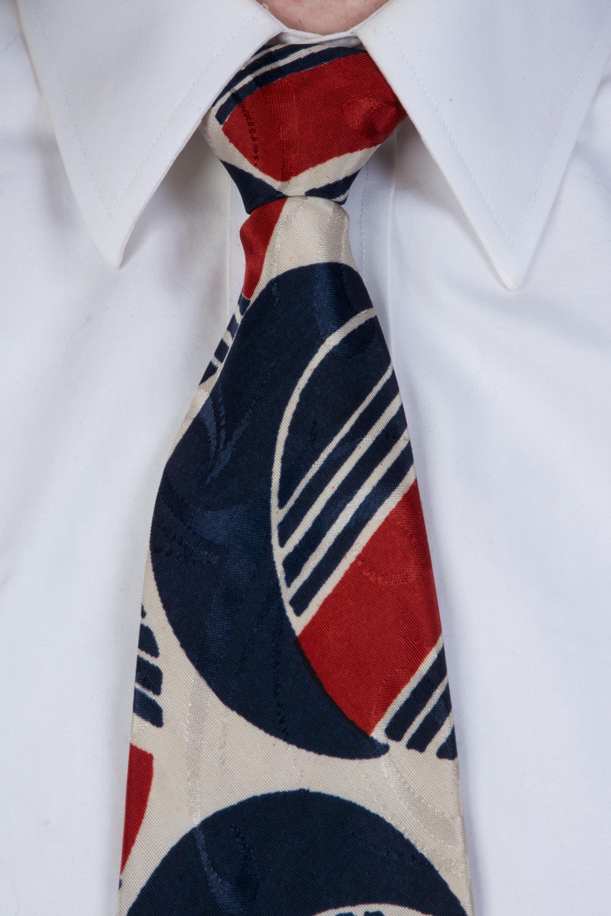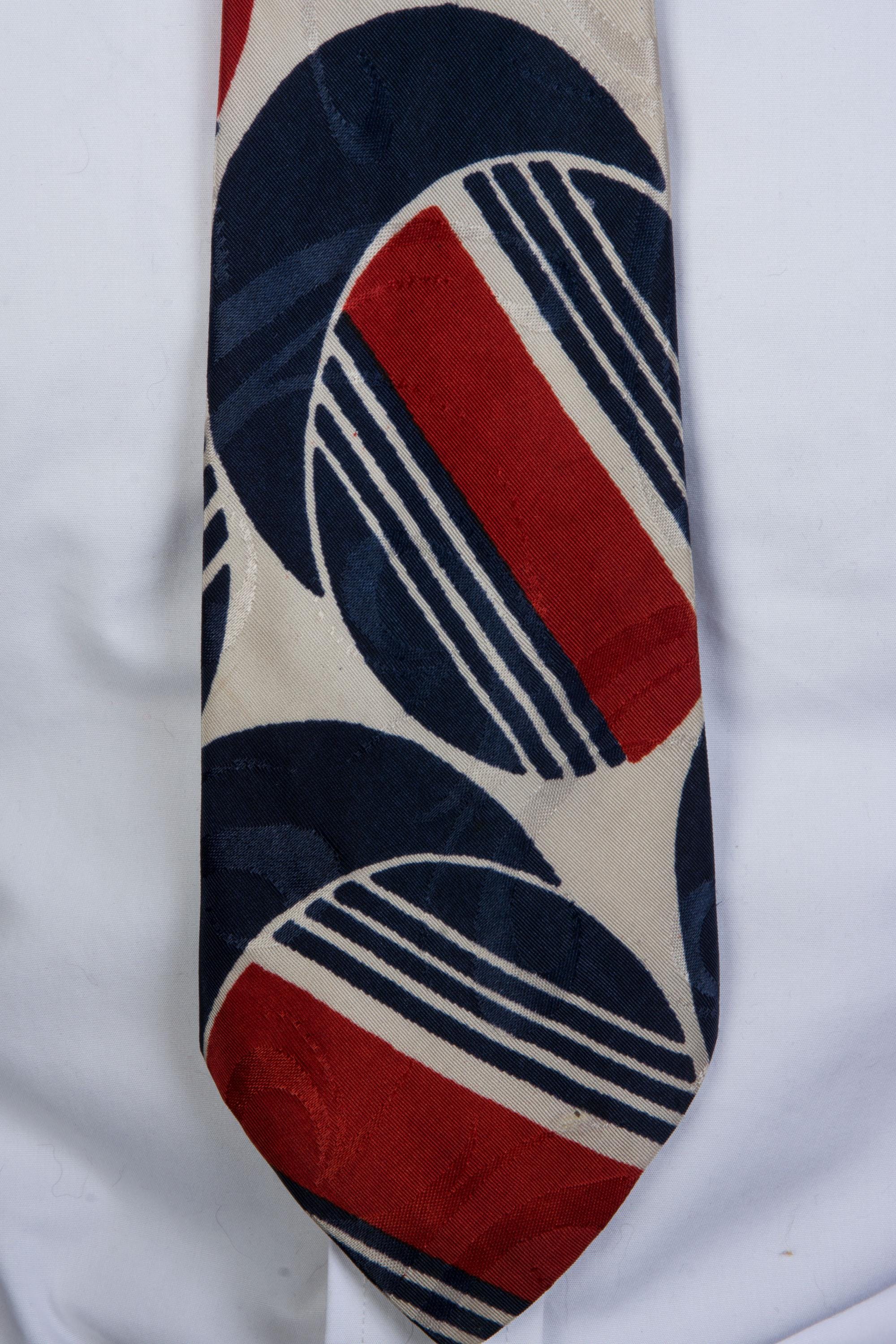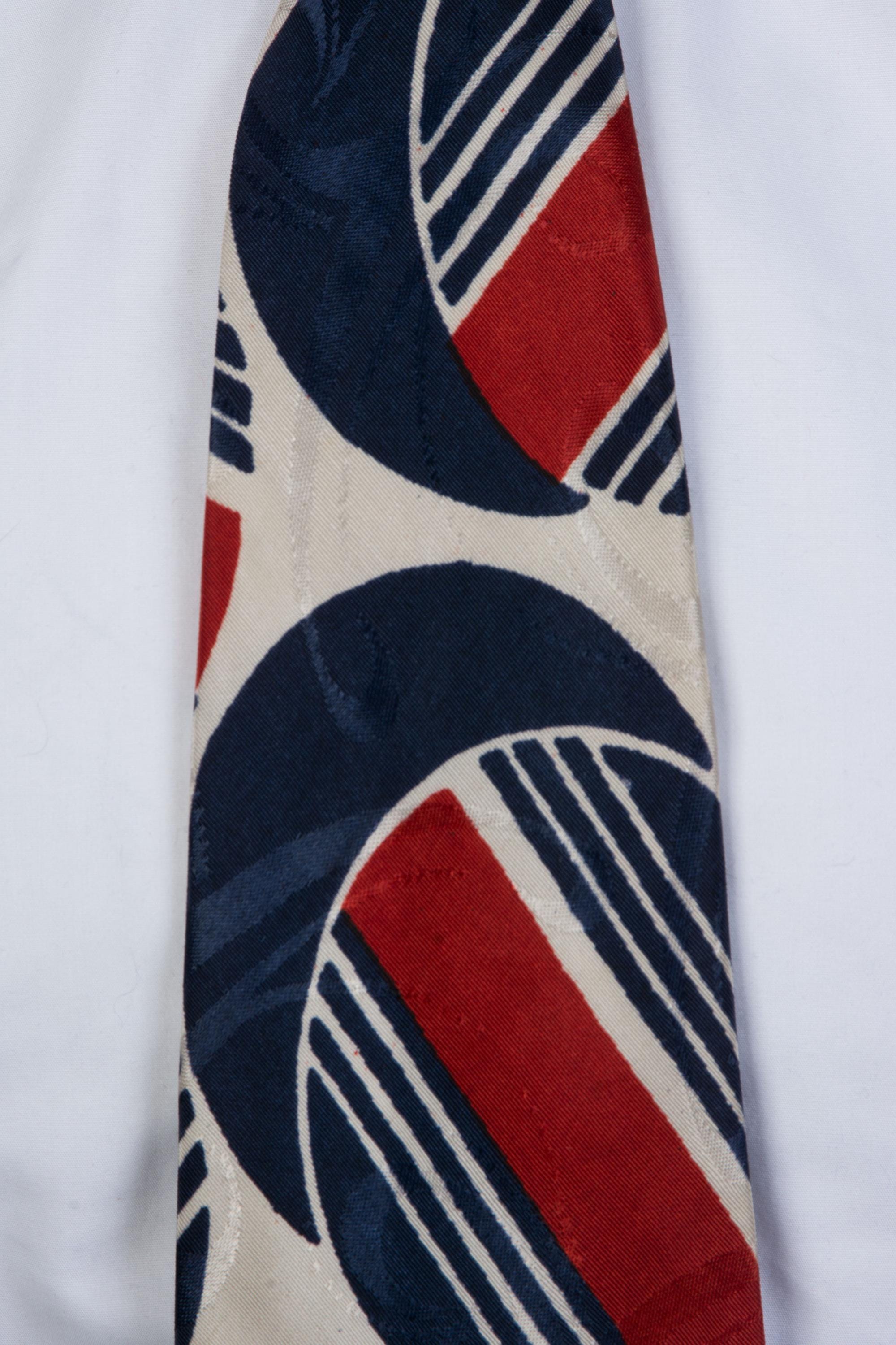 Here's a tie that says a LOT. This exceptionally bold necktie is made in a warm - but pretty bright - white, navy and red in these huge layered dots with strips. It's loud! The lustrous brocade is elongated swirls. Fully lined. There's something about this one that says "vintage airline pilot" to me. Fully lined.