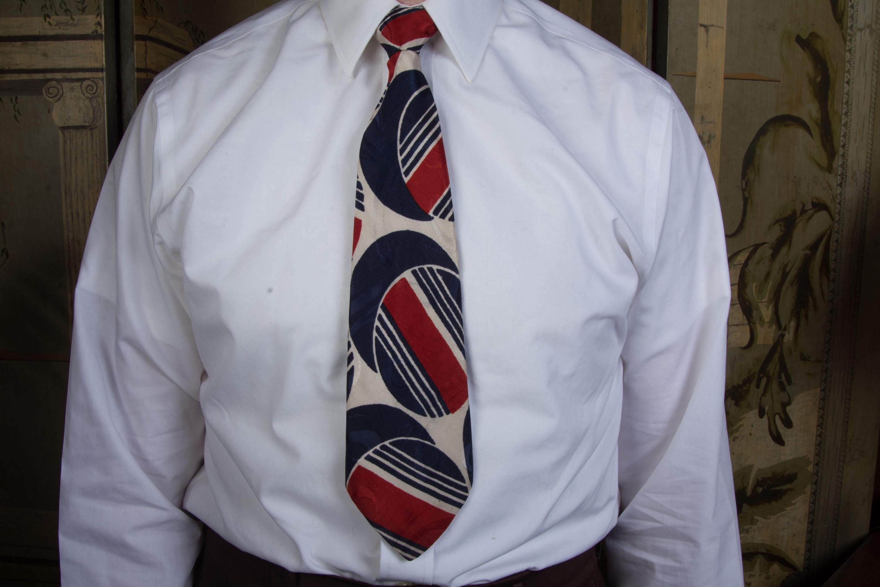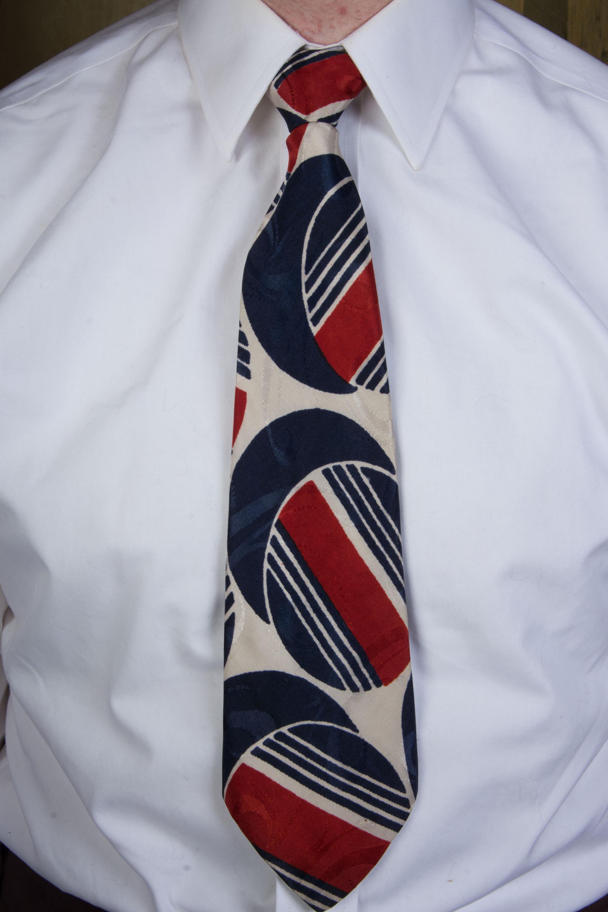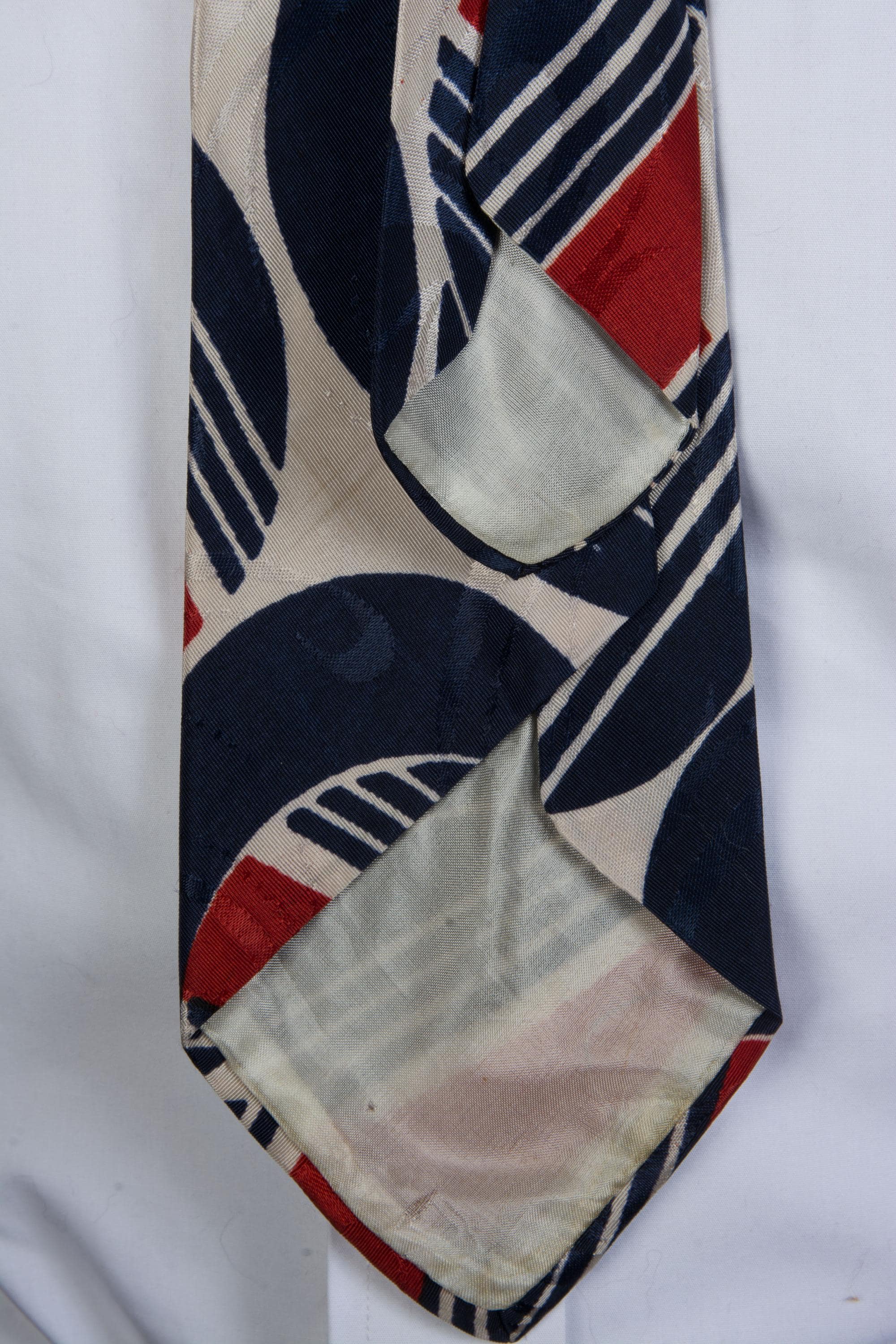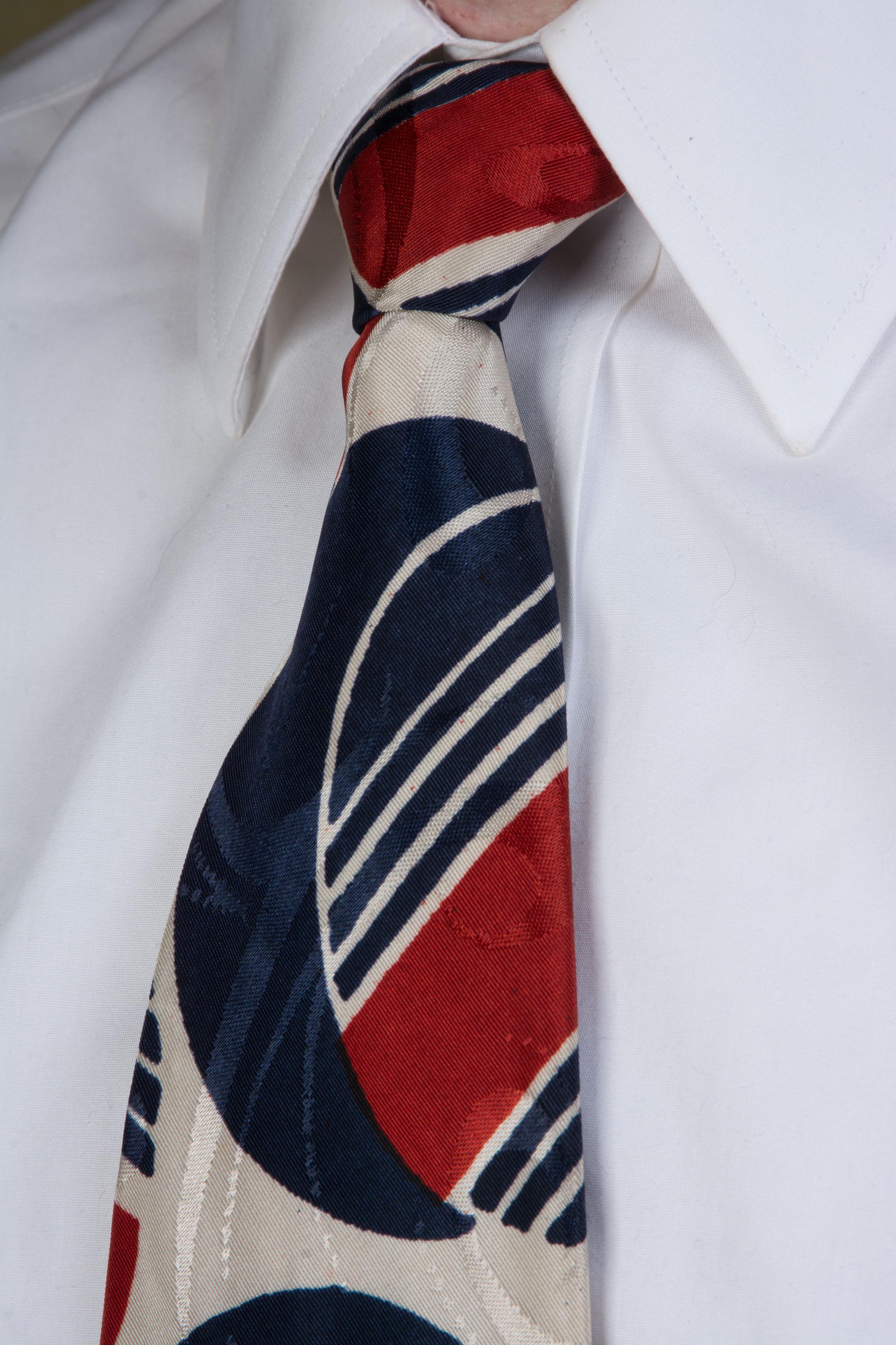 Here's a tie that says a LOT. This exceptionally bold necktie is made in a warm - but pretty bright - white, navy and red in these huge layered dots with strips. It's loud! The lustrous brocade is elongated swirls. Fully lined. There's something about this one that says "vintage airline pilot" to me. Fully lined.