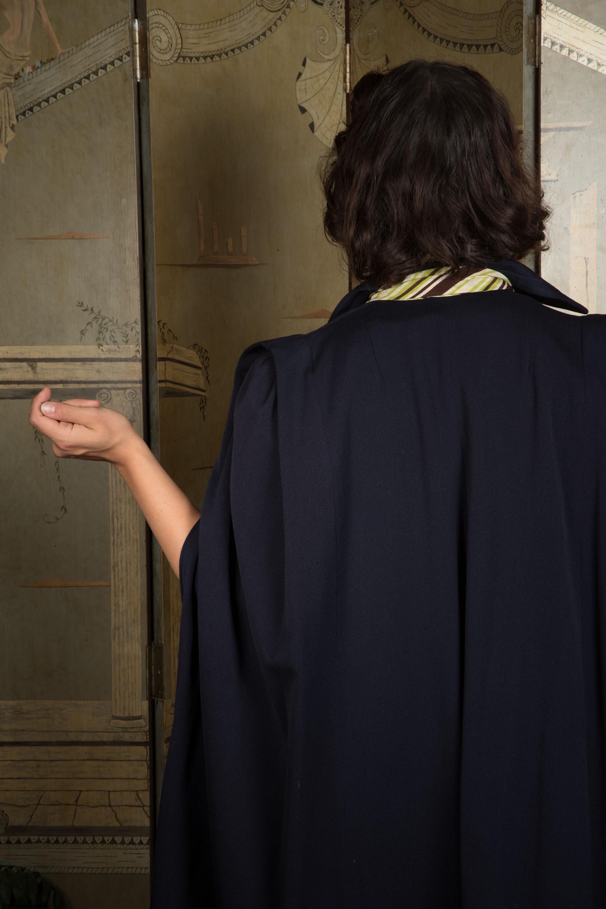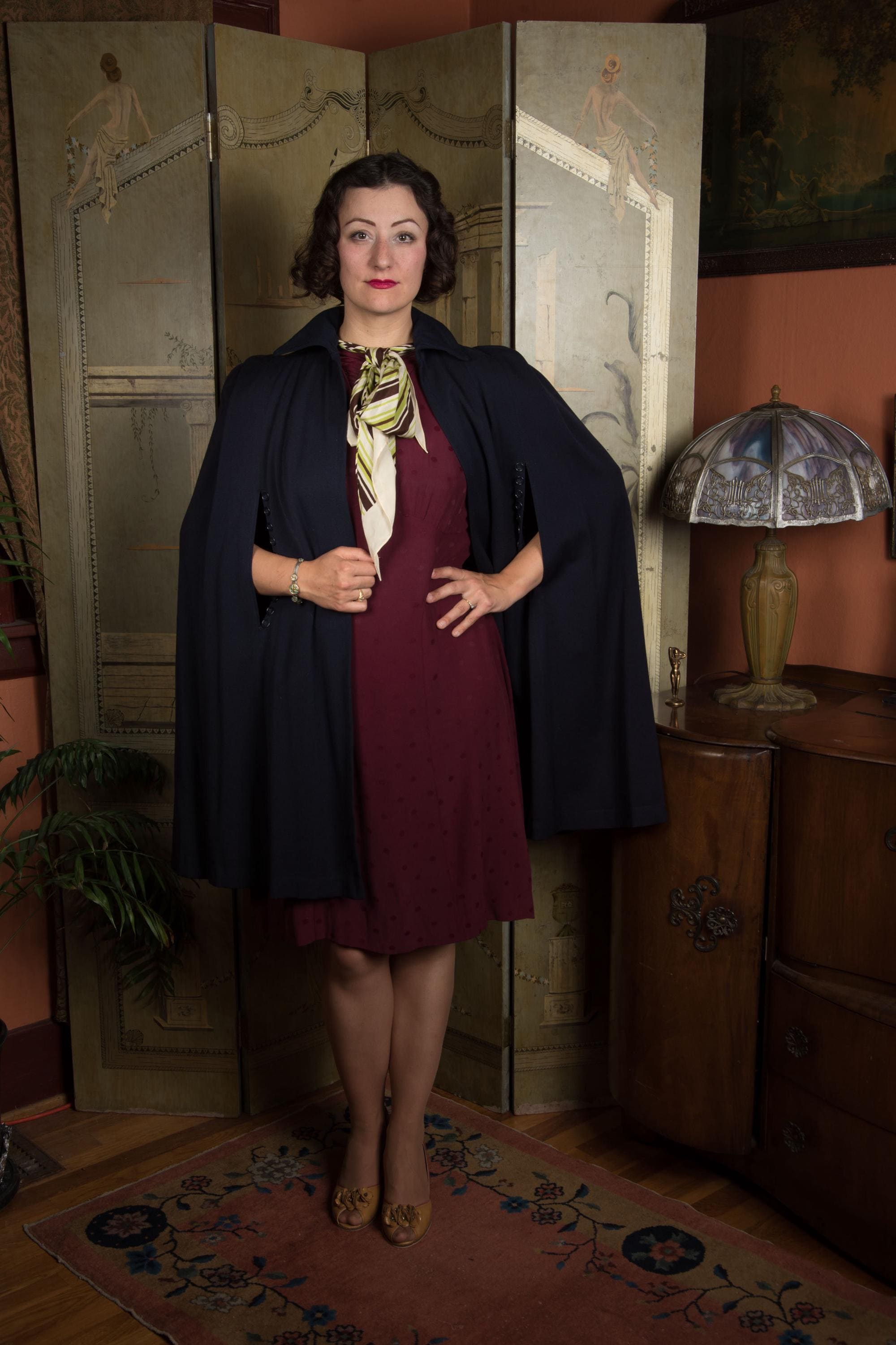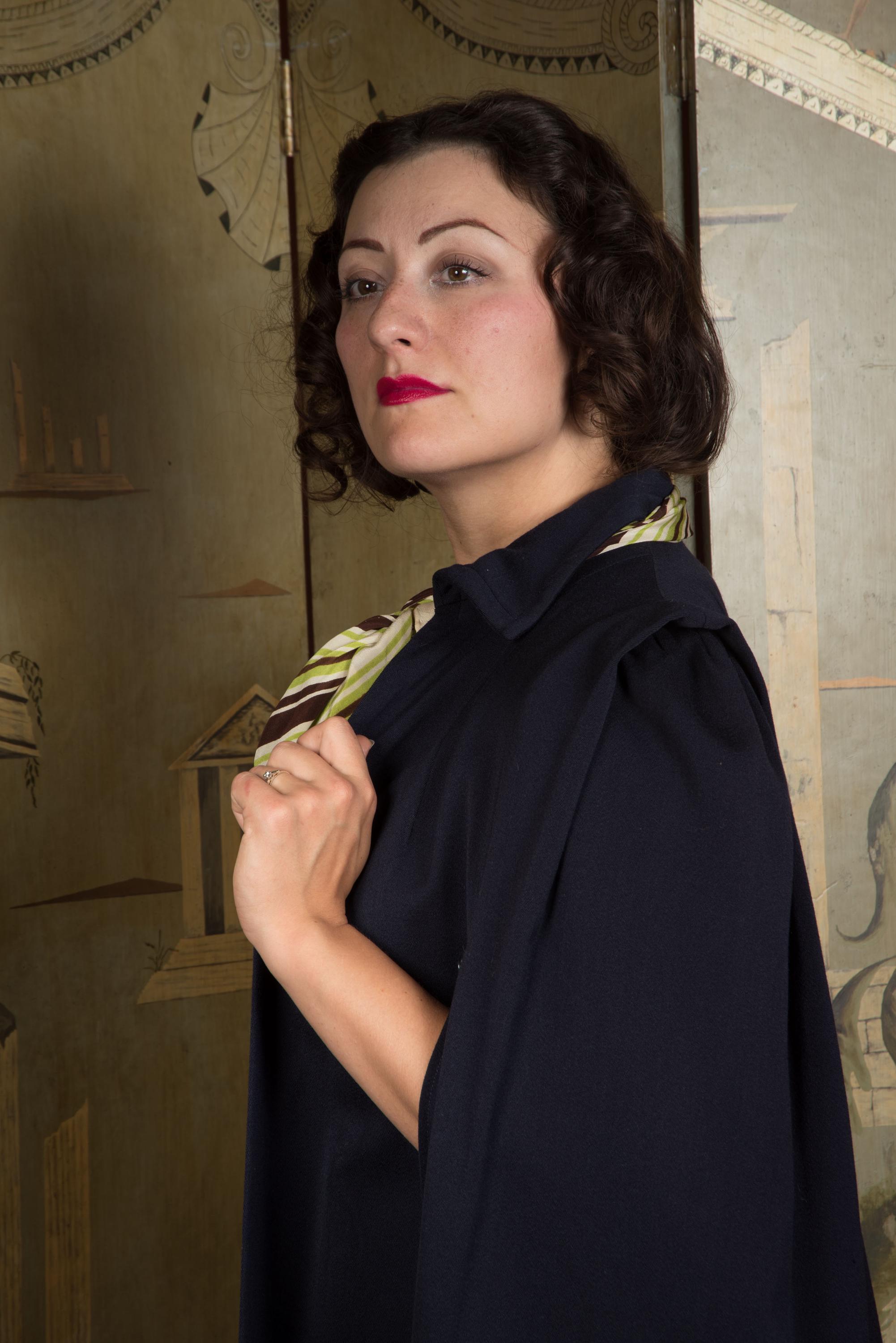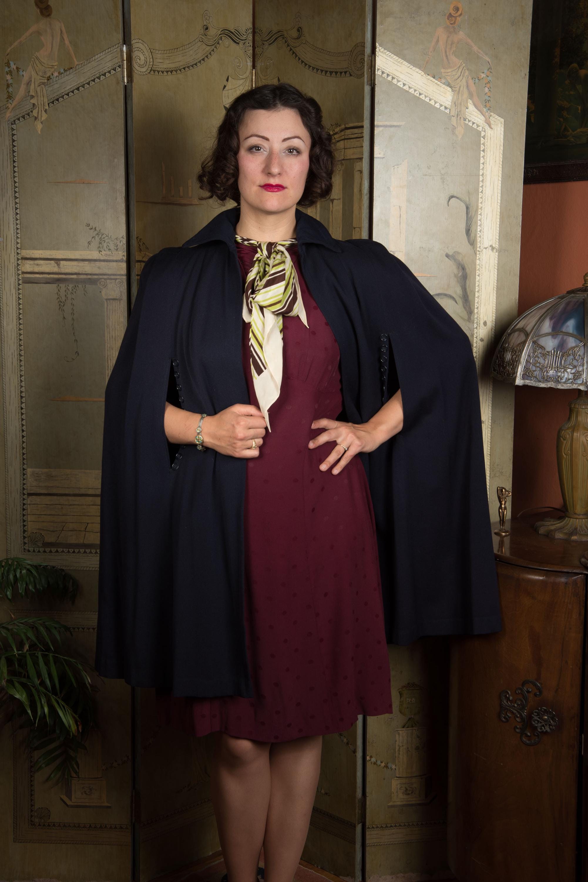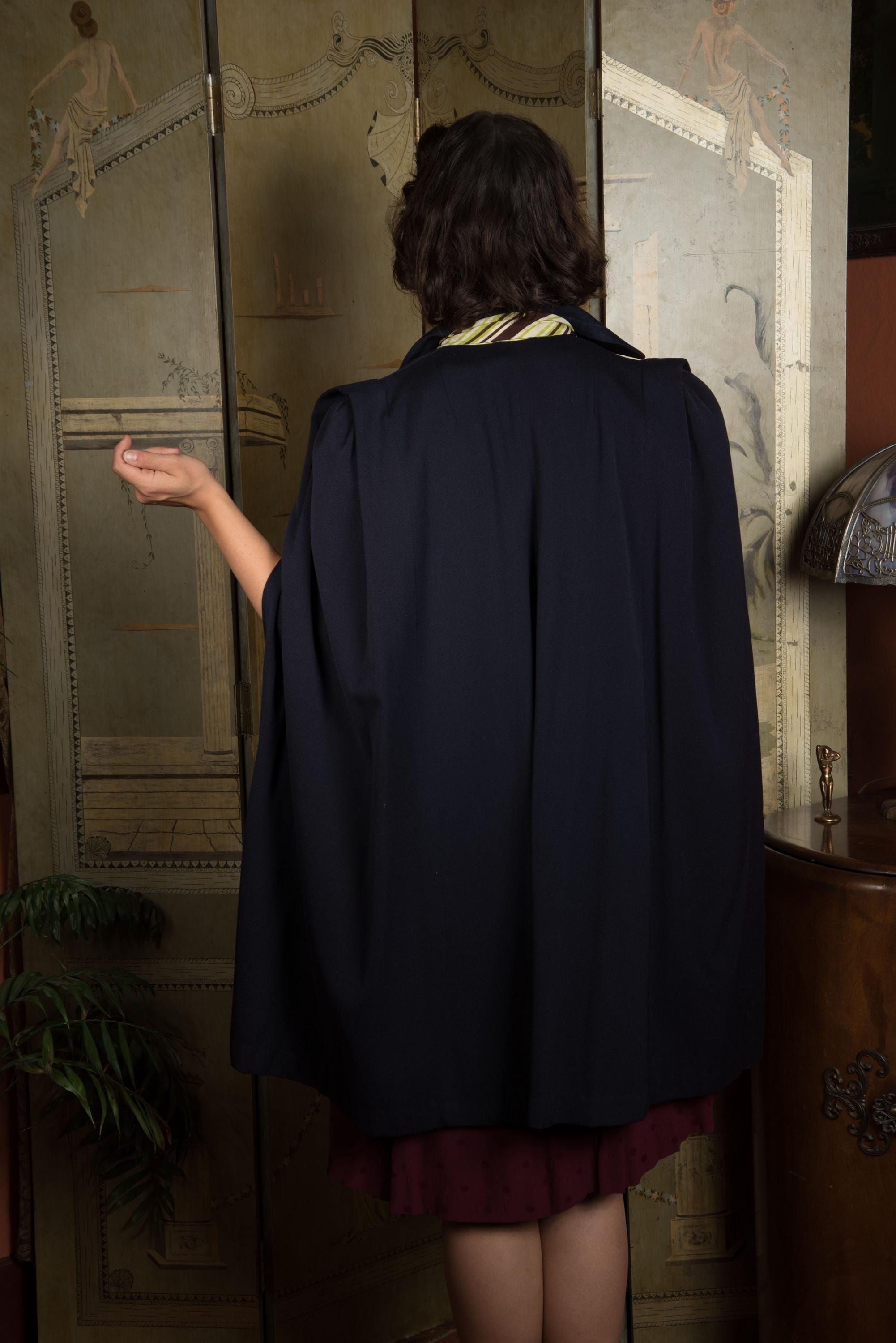 Talk about a silhouette! Here's your better-than-basic dramatic classic for the cold season. This fetching 1940s cape has deep vent pleats over the shoulders, giving it a crisp line with flattering drape. It's medium weight made of a soft wool wool, and it's lined with navy rayon. There's arm slits - which you can use or ignore, as you prefer - are edged with navy blue buttons. My favorite detail is the large button holes at each side of the neck, made for slipping an accent scarf through as a closure. (The scarf shown, obviously, doesn't match and is not included.) It's a killer piece, that I would definitely keep if it fit me better!