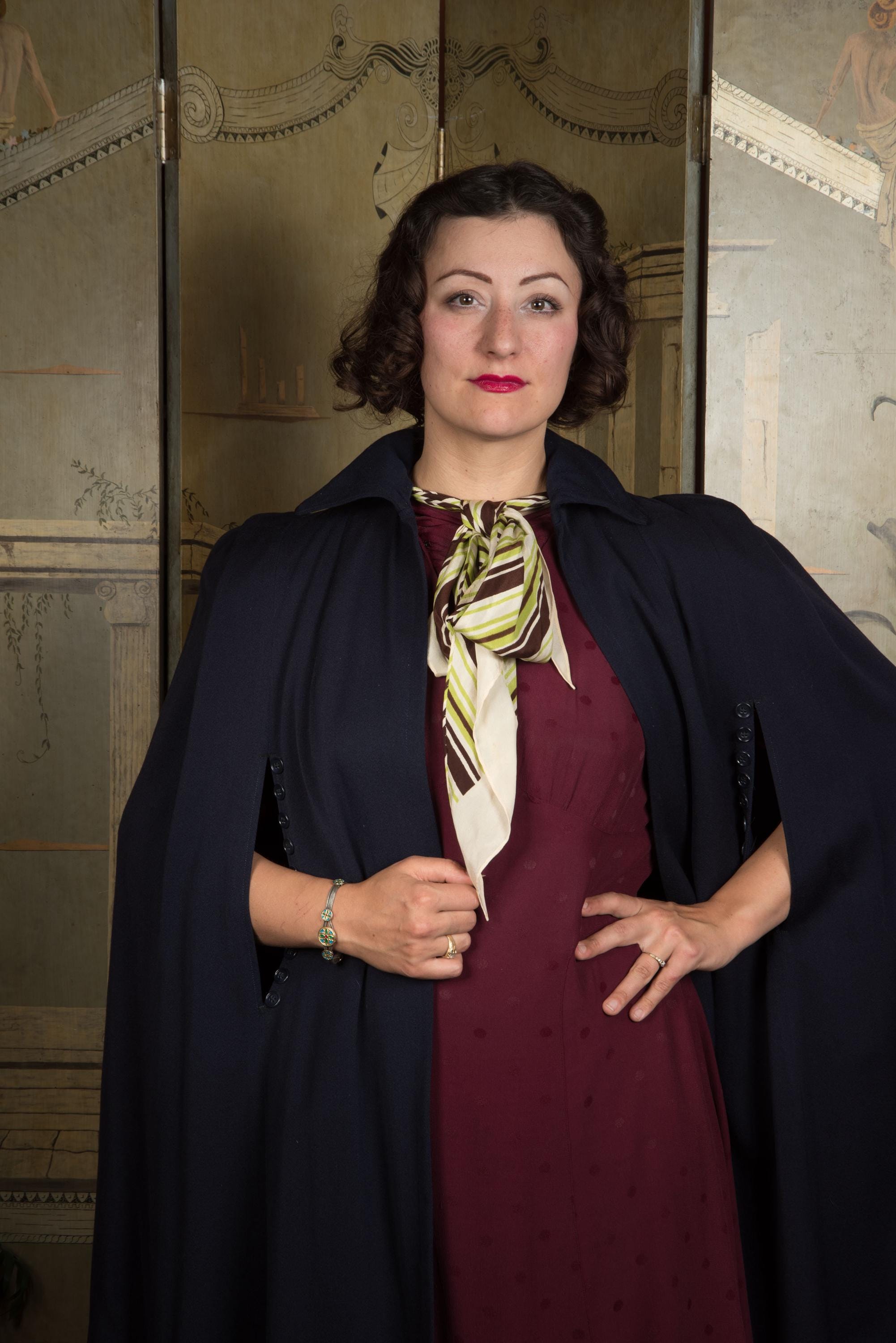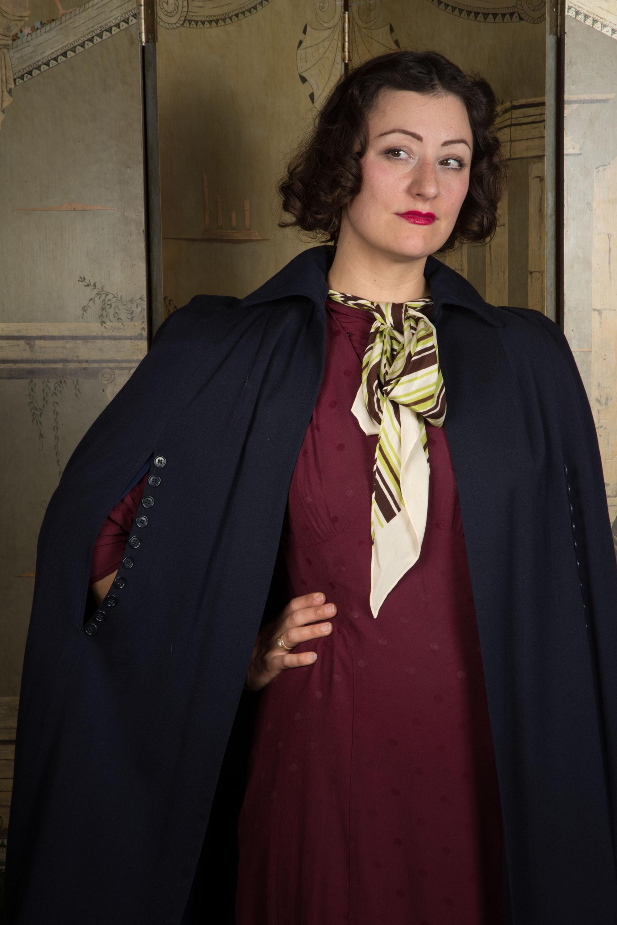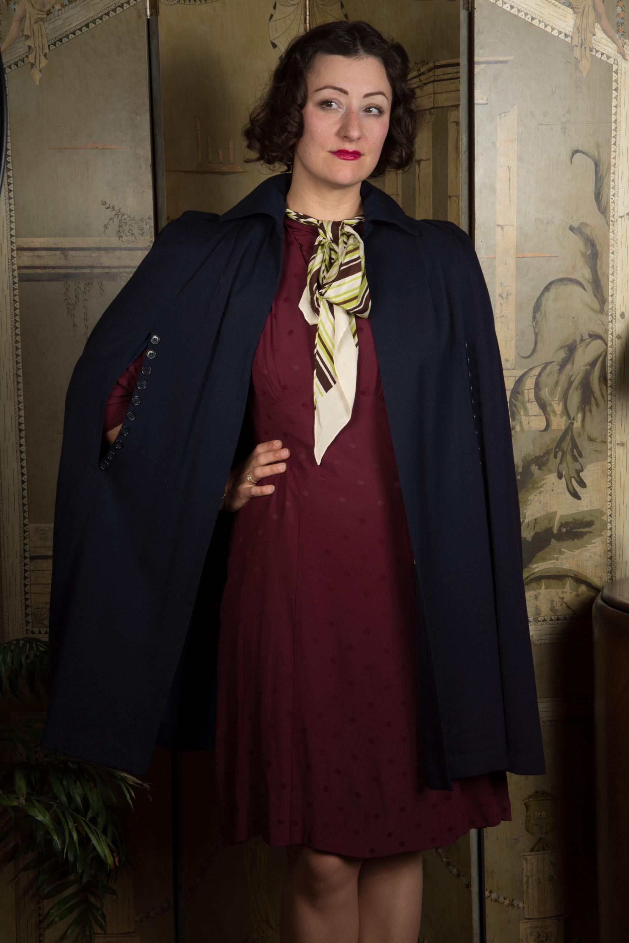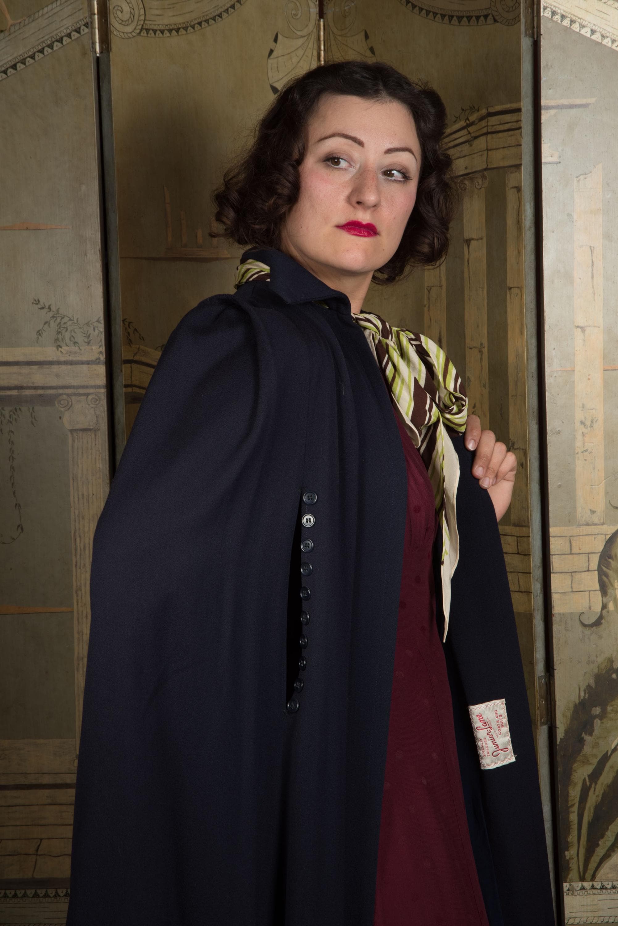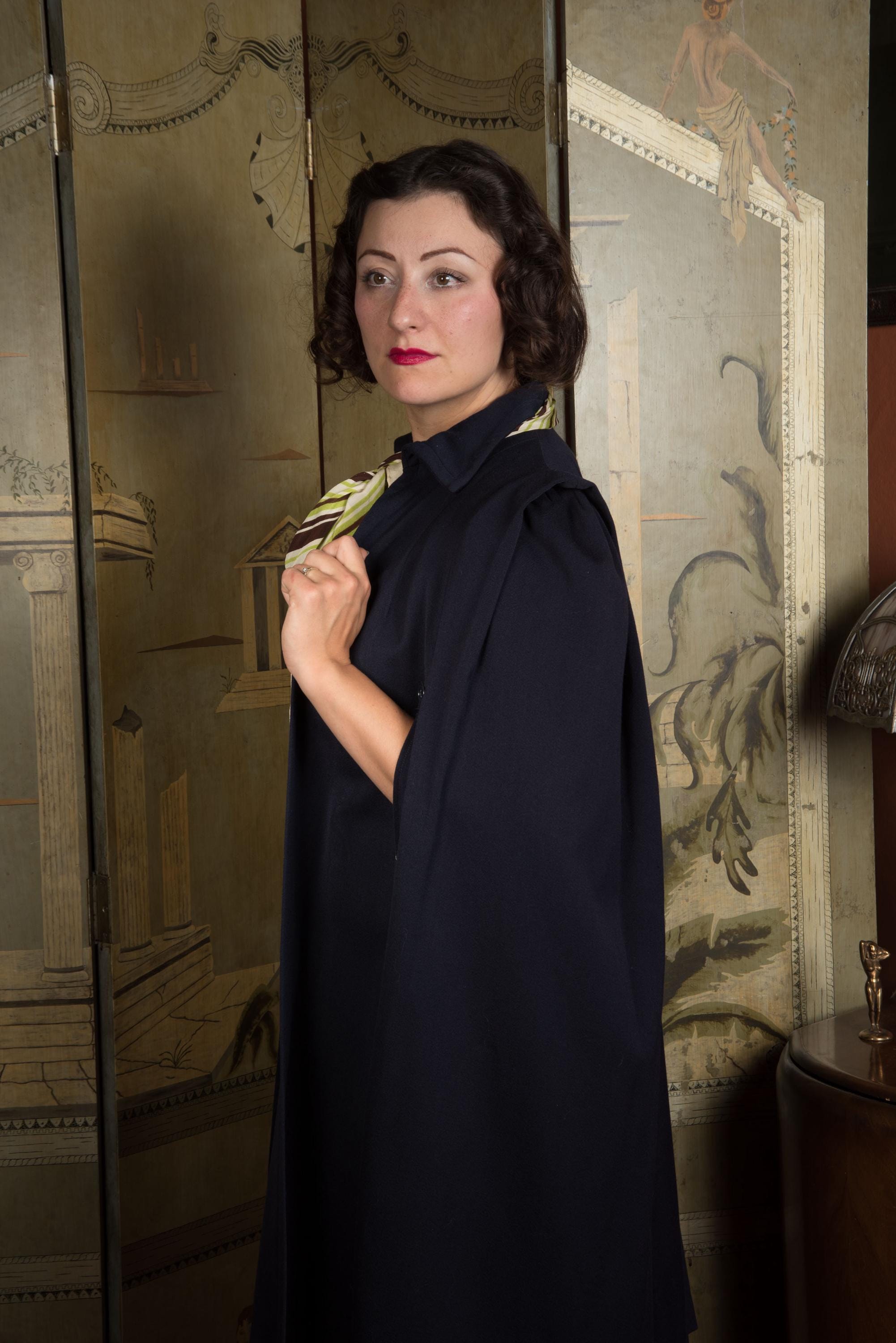 Talk about a silhouette! Here's your better-than-basic dramatic classic for the cold season. This fetching 1940s cape has deep vent pleats over the shoulders, giving it a crisp line with flattering drape. It's medium weight made of a soft wool wool, and it's lined with navy rayon. There's arm slits - which you can use or ignore, as you prefer - are edged with navy blue buttons. My favorite detail is the large button holes at each side of the neck, made for slipping an accent scarf through as a closure. (The scarf shown, obviously, doesn't match and is not included.) It's a killer piece, that I would definitely keep if it fit me better!