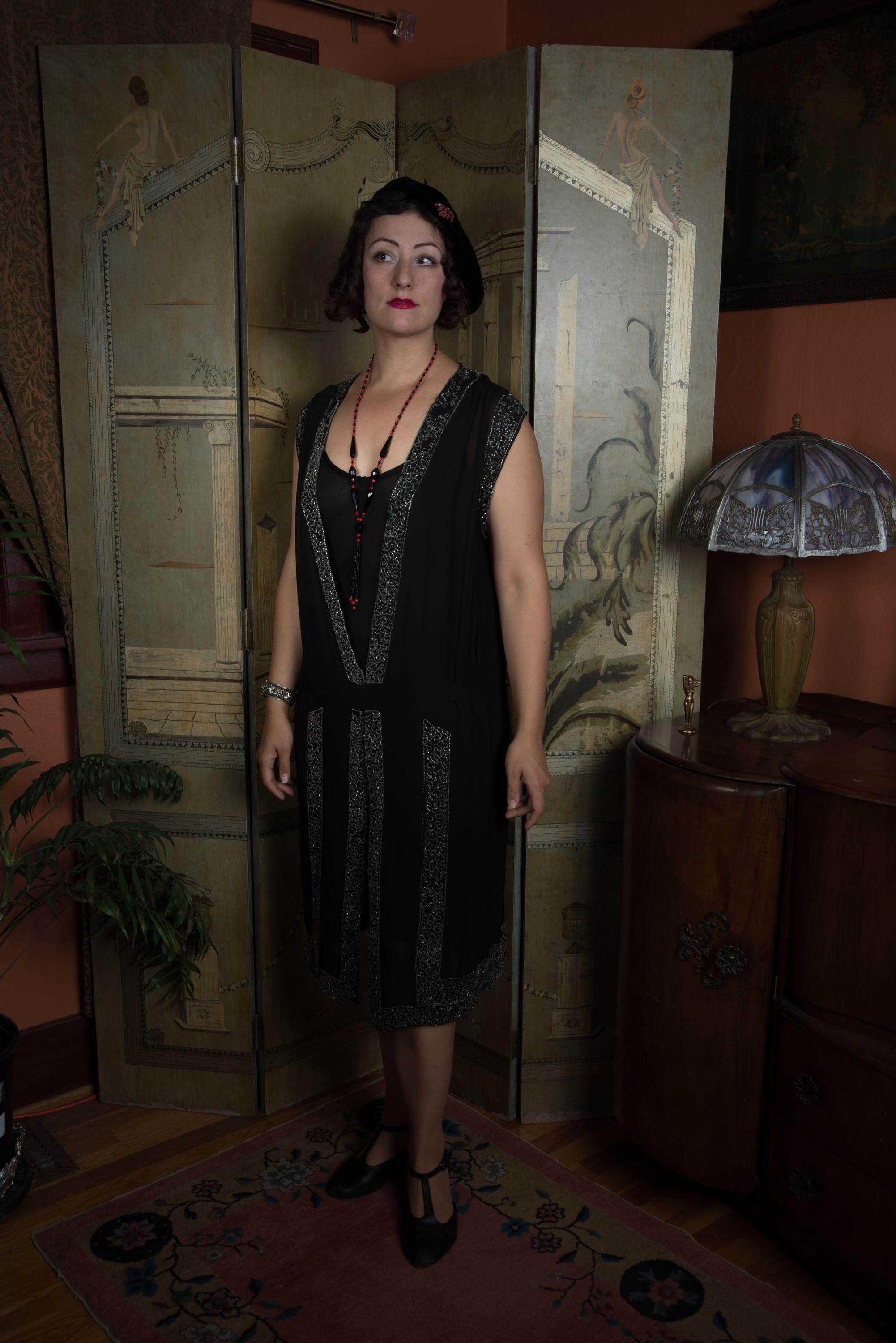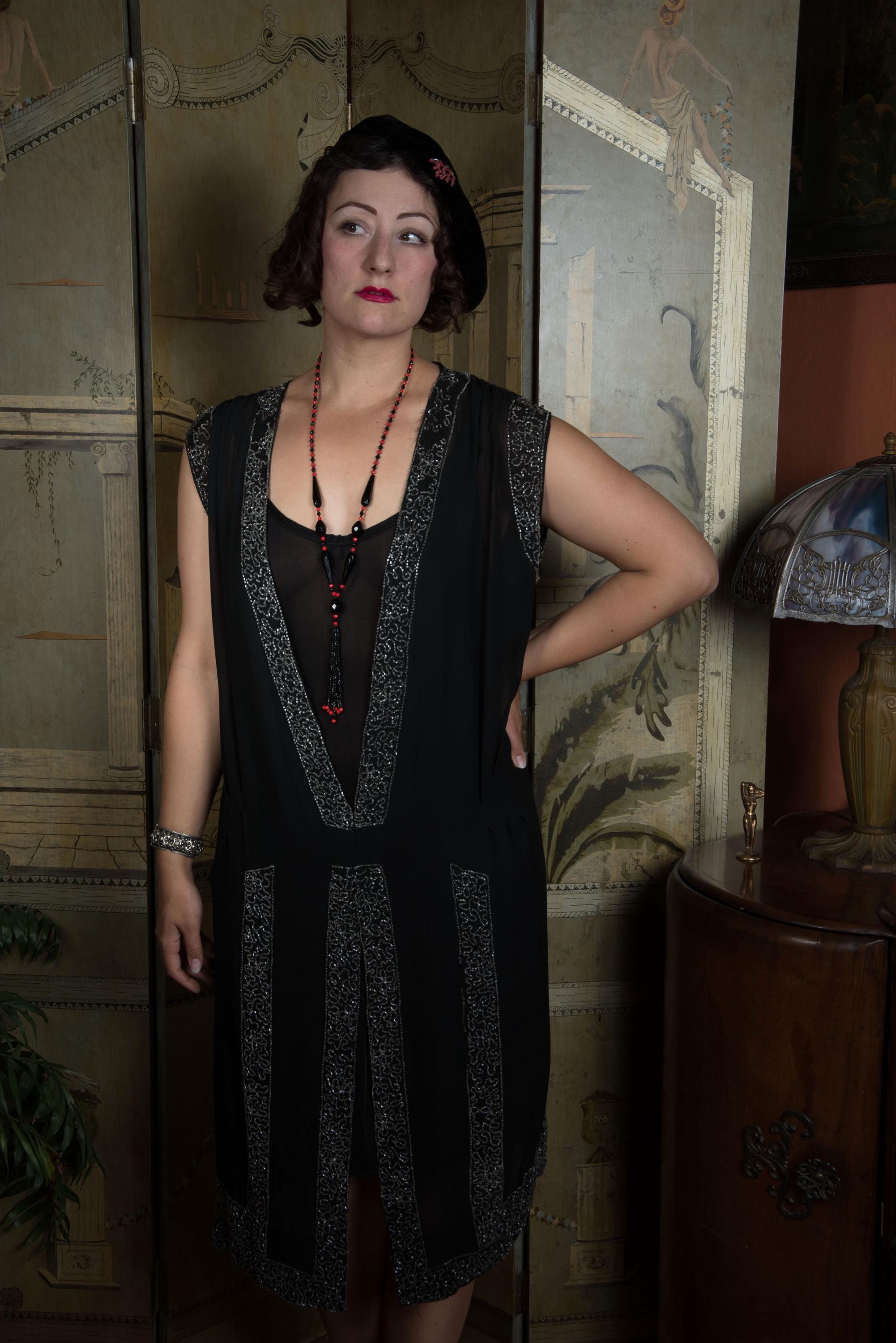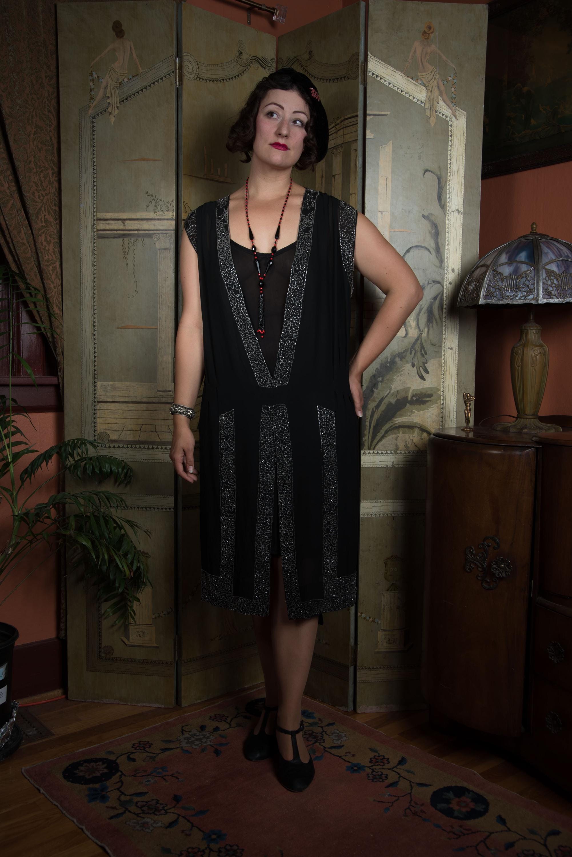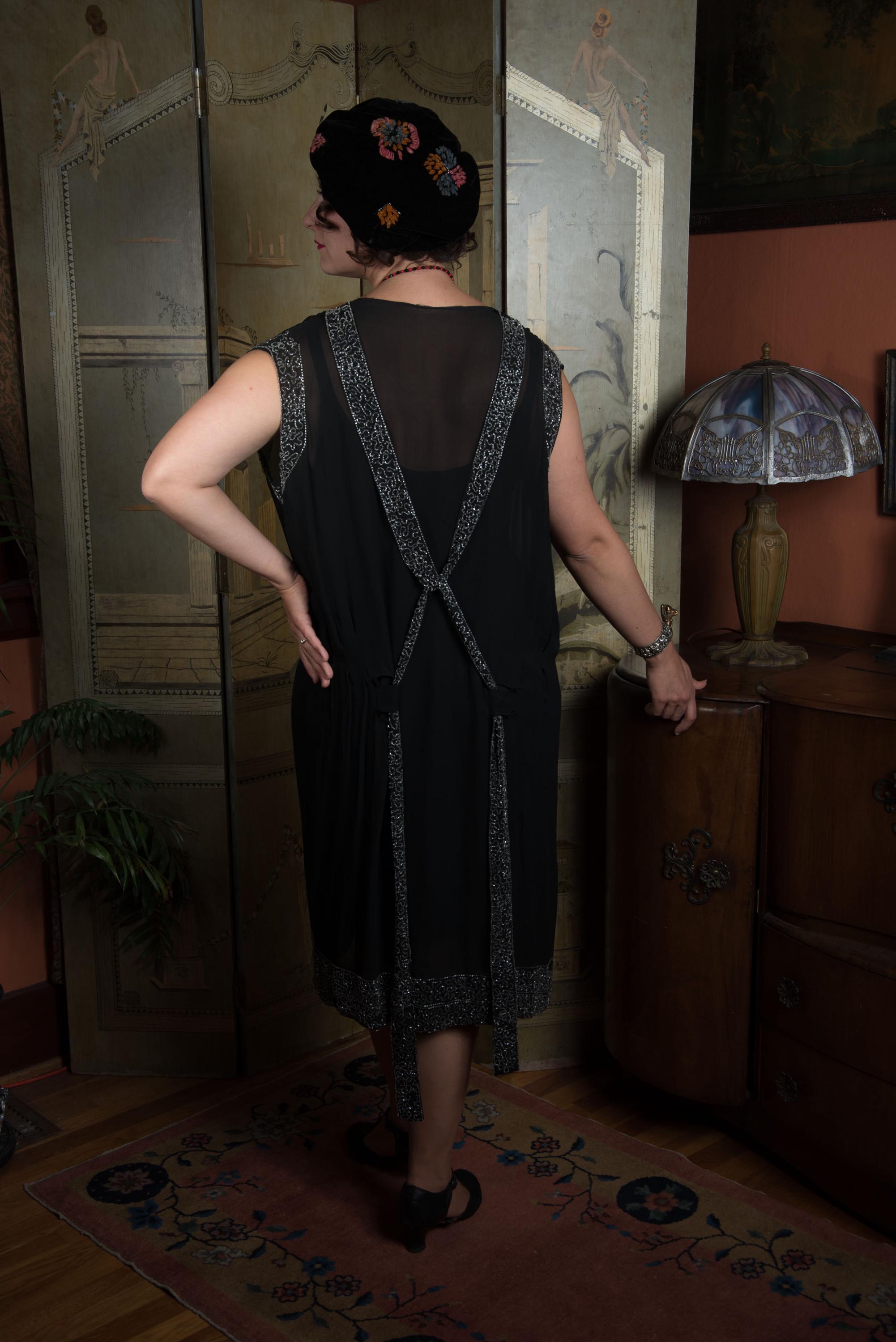 I'm adoring the combination of glittering luxury and casually relaxed style used in this piece. Not all beaded 20s dress actually vibe flapper, but this sure does.This vintage 1920s dress is as sheer as silk chiffon can be - wear it scandlous or pair with yourbest simple silk slip. This is not a tabard or redingote, but it's made to be worn over another piece - the open neckline dives to the drop waist, and the skirt vents open the same ways- only a handful of inches are actually connected at the center front, so you can get really creative with it. Beadwork runs down the front, stopping at the waist before continuing to the hem. Each armhole is outlined as well. The most creative use of beading is the long drapes at the back, which have slip-throughs at the back of the dress. You can be pretty creative with those, but I like the loop-over we've shown best, it stayed in place well. This beauty isn't perfect, but it's super wearable, and stunner that will see through a wild New Years eve or other dazzling events - and changing what's under it will change the look a lot, so it's sure to get repeated use!