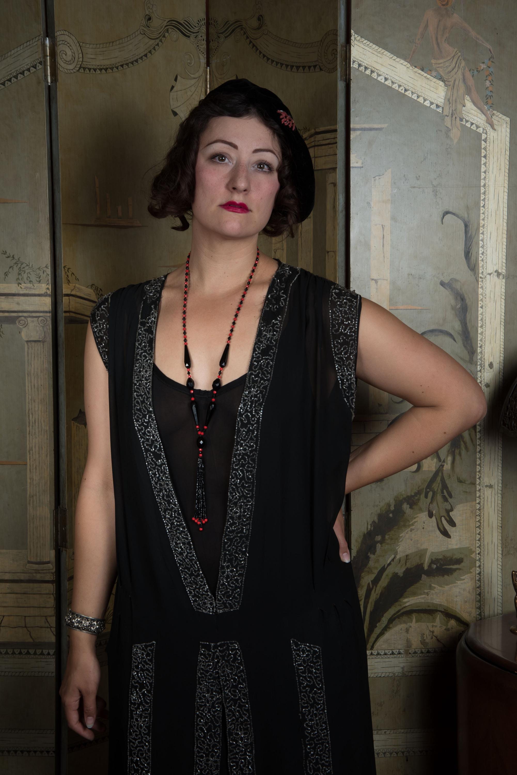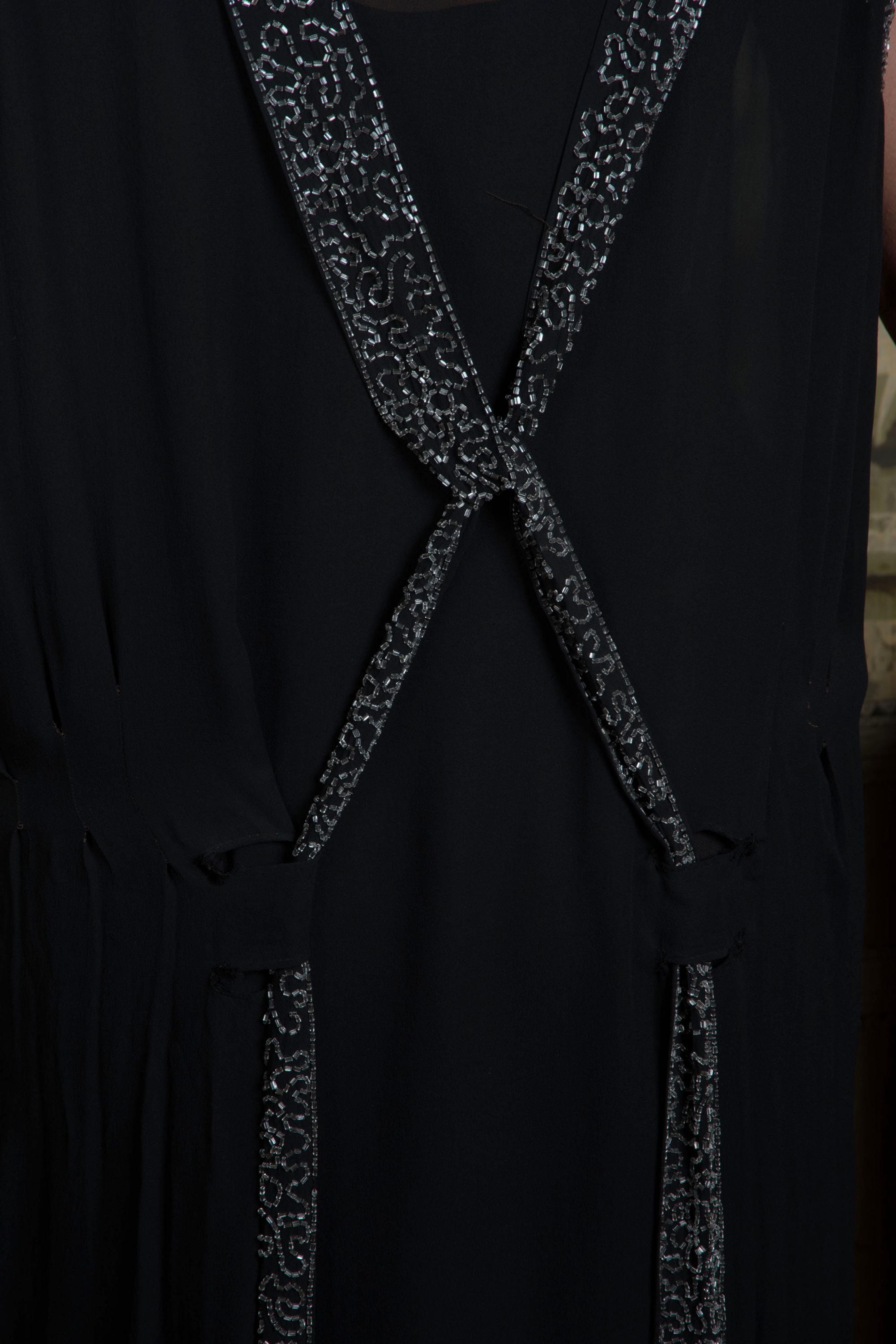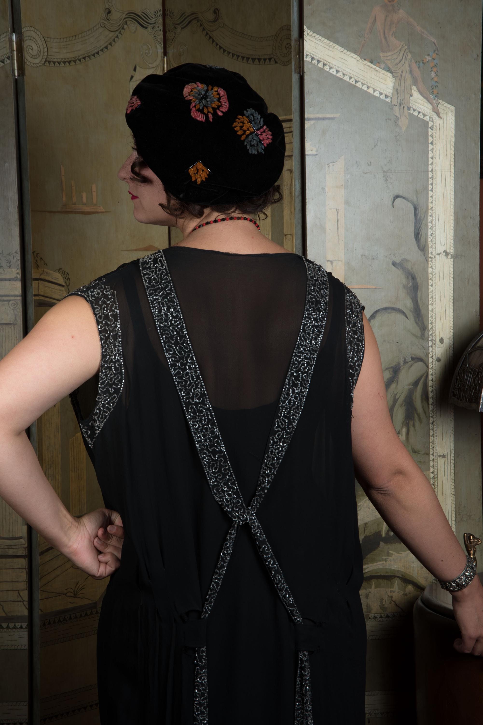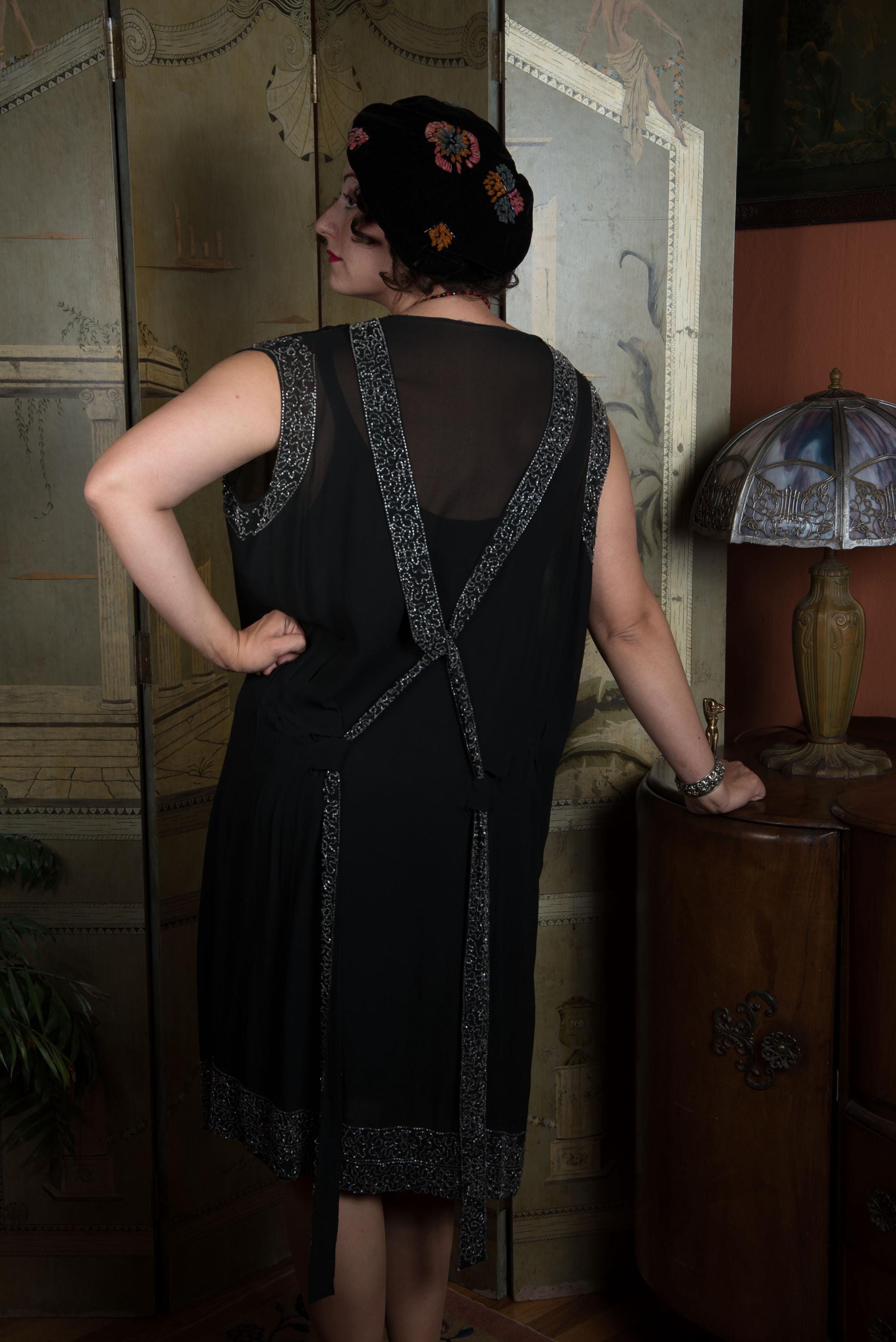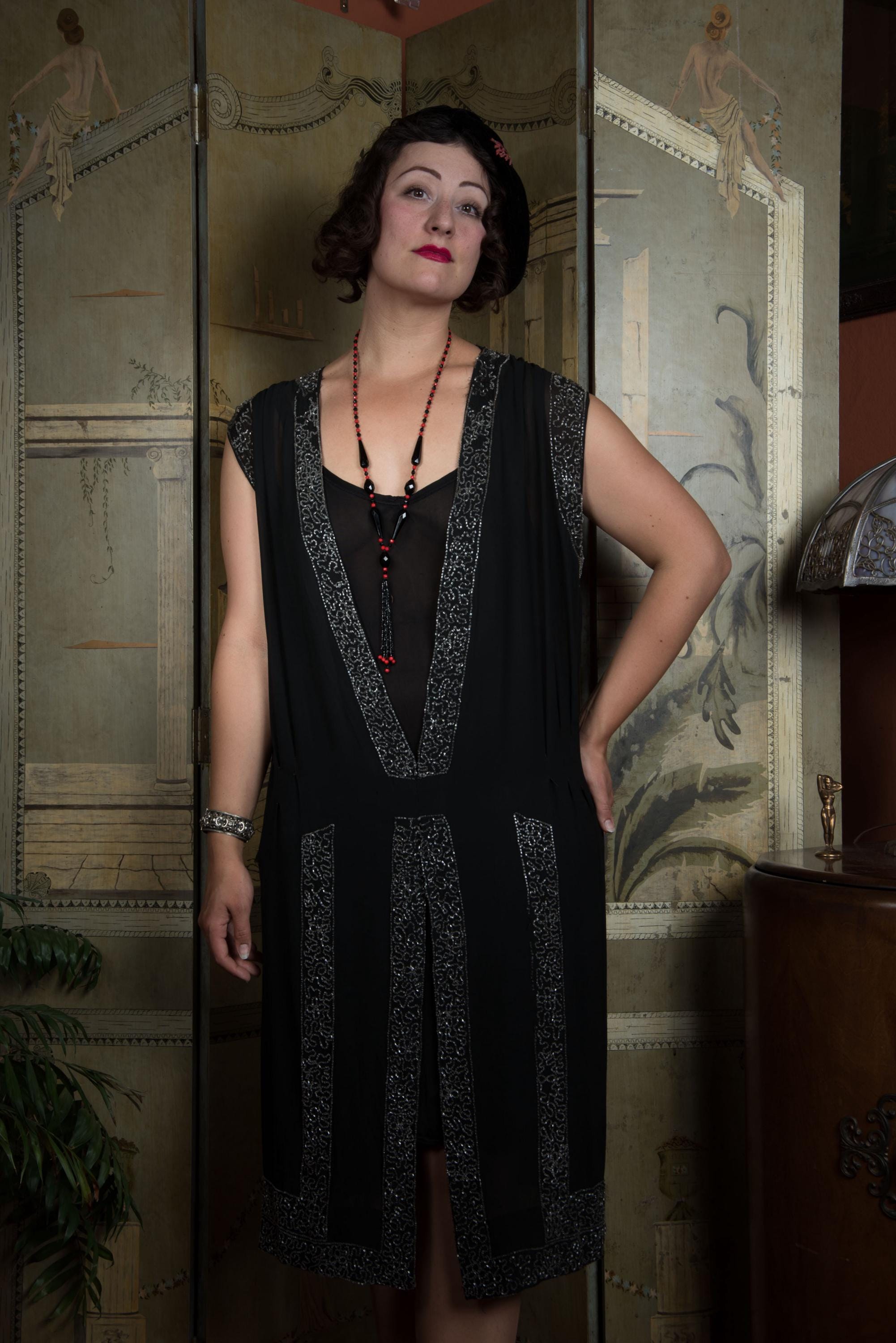 I'm adoring the combination of glittering luxury and casually relaxed style used in this piece. Not all beaded 20s dress actually vibe flapper, but this sure does.This vintage 1920s dress is as sheer as silk chiffon can be - wear it scandlous or pair with yourbest simple silk slip. This is not a tabard or redingote, but it's made to be worn over another piece - the open neckline dives to the drop waist, and the skirt vents open the same ways- only a handful of inches are actually connected at the center front, so you can get really creative with it. Beadwork runs down the front, stopping at the waist before continuing to the hem. Each armhole is outlined as well. The most creative use of beading is the long drapes at the back, which have slip-throughs at the back of the dress. You can be pretty creative with those, but I like the loop-over we've shown best, it stayed in place well. This beauty isn't perfect, but it's super wearable, and stunner that will see through a wild New Years eve or other dazzling events - and changing what's under it will change the look a lot, so it's sure to get repeated use!