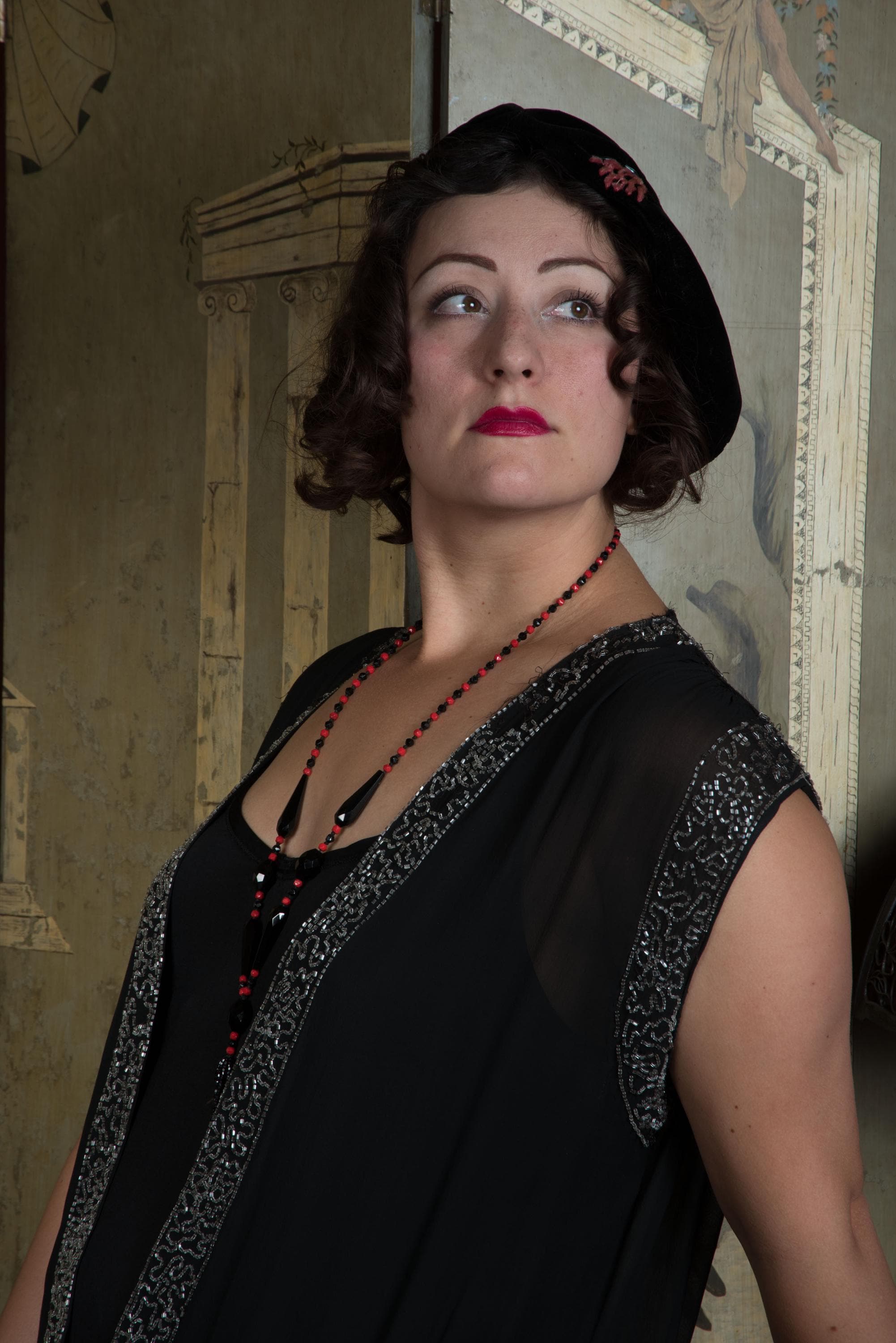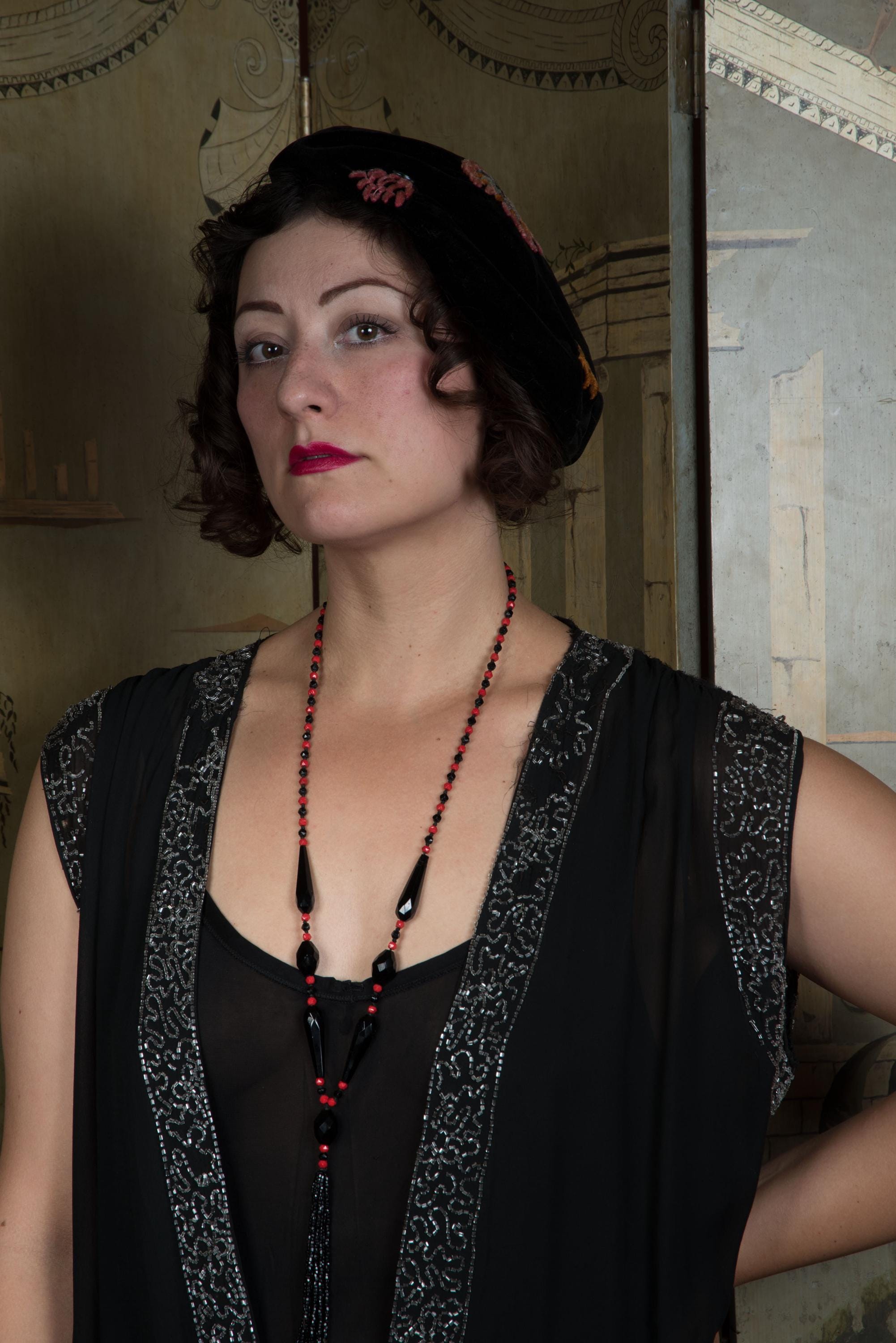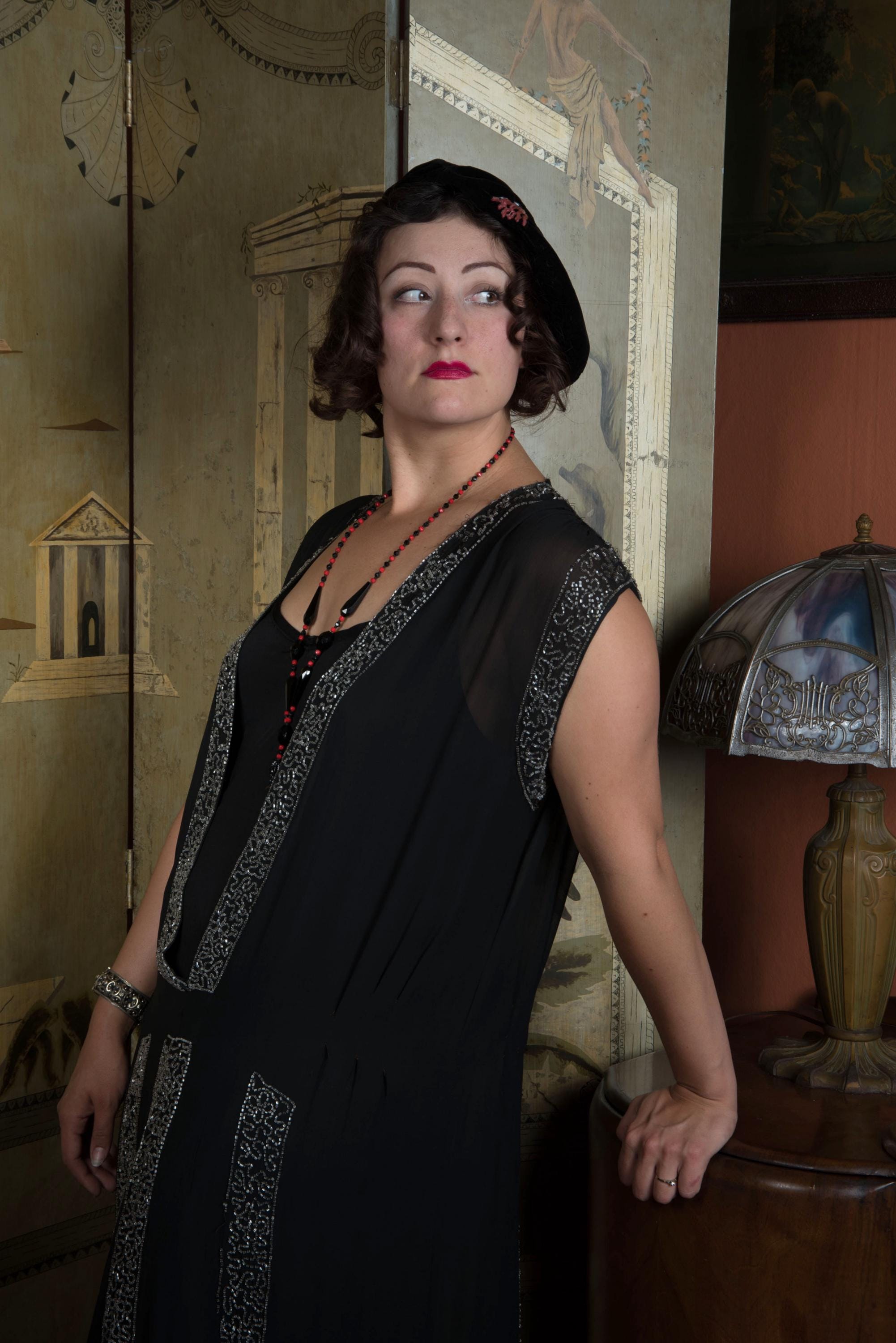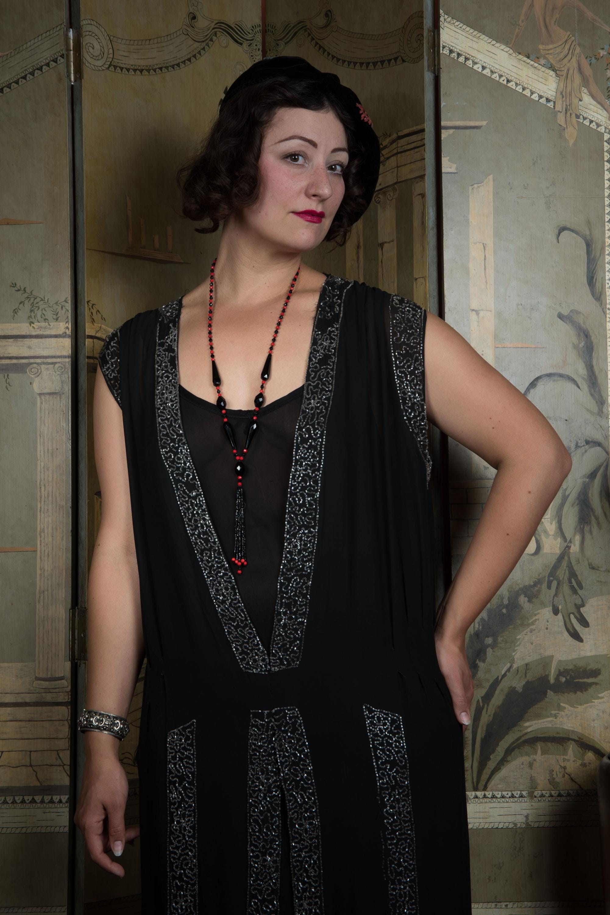 I'm adoring the combination of glittering luxury and casually relaxed style used in this piece. Not all beaded 20s dress actually vibe flapper, but this sure does.This vintage 1920s dress is as sheer as silk chiffon can be - wear it scandlous or pair with yourbest simple silk slip. This is not a tabard or redingote, but it's made to be worn over another piece - the open neckline dives to the drop waist, and the skirt vents open the same ways- only a handful of inches are actually connected at the center front, so you can get really creative with it. Beadwork runs down the front, stopping at the waist before continuing to the hem. Each armhole is outlined as well. The most creative use of beading is the long drapes at the back, which have slip-throughs at the back of the dress. You can be pretty creative with those, but I like the loop-over we've shown best, it stayed in place well. This beauty isn't perfect, but it's super wearable, and stunner that will see through a wild New Years eve or other dazzling events - and changing what's under it will change the look a lot, so it's sure to get repeated use!