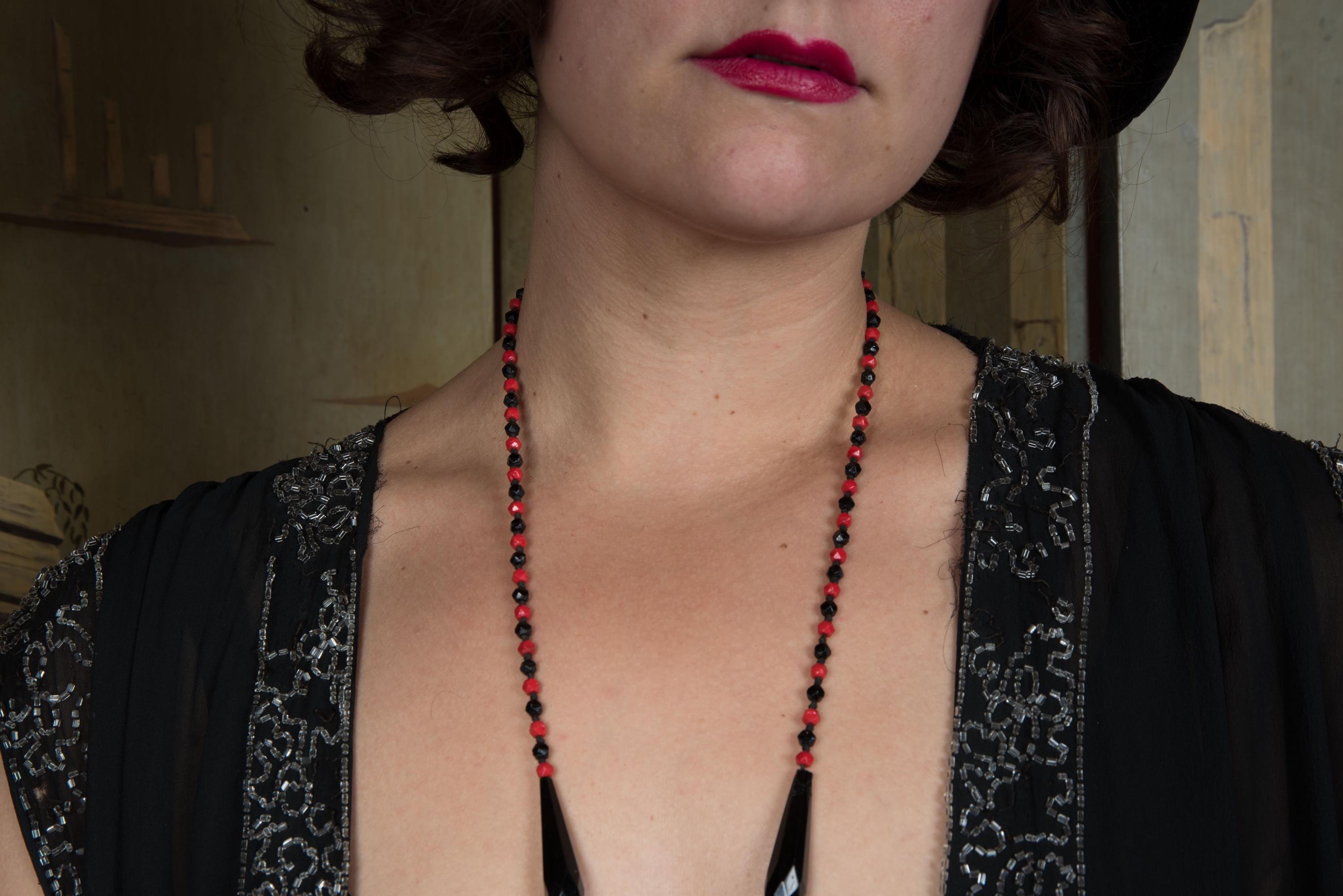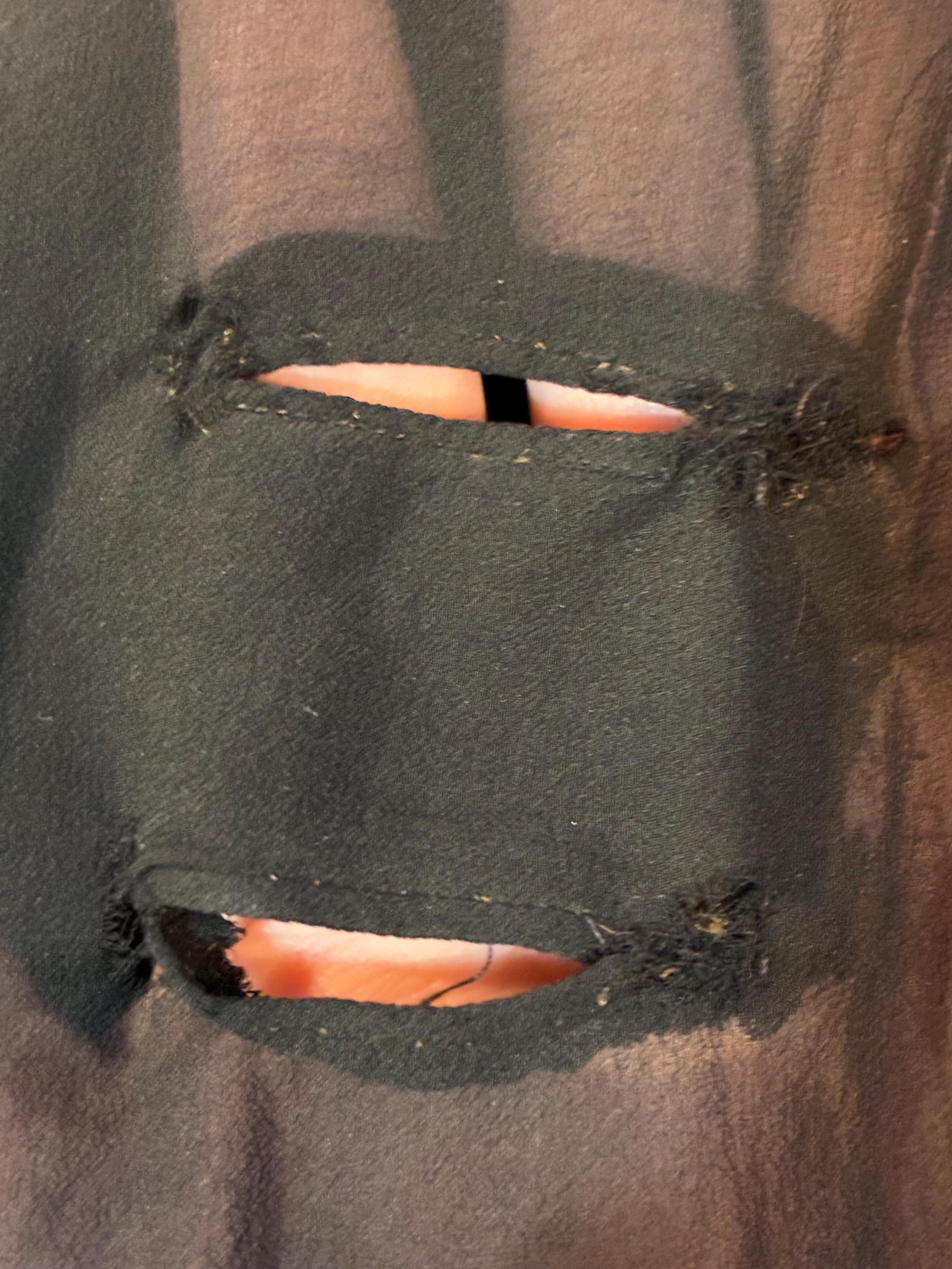 This dress has repairs and some beadloss but wears really well. Most notably, there's a repaired split a the right underarm, and reinforcement to the beaded area done in silk netting, a patch to an L shaped tear on the right hip, and some repairs around the vents at back - see photos. The most notable bead loss is to each side of the upper neckline and the edge of the shoulders, but there's a bit at the sleeves too. There is only very minimal loss by the hem on and the drapes. There's no continued shedding, it all seems to be tied down by the previous owner. I find no other issues to note!
