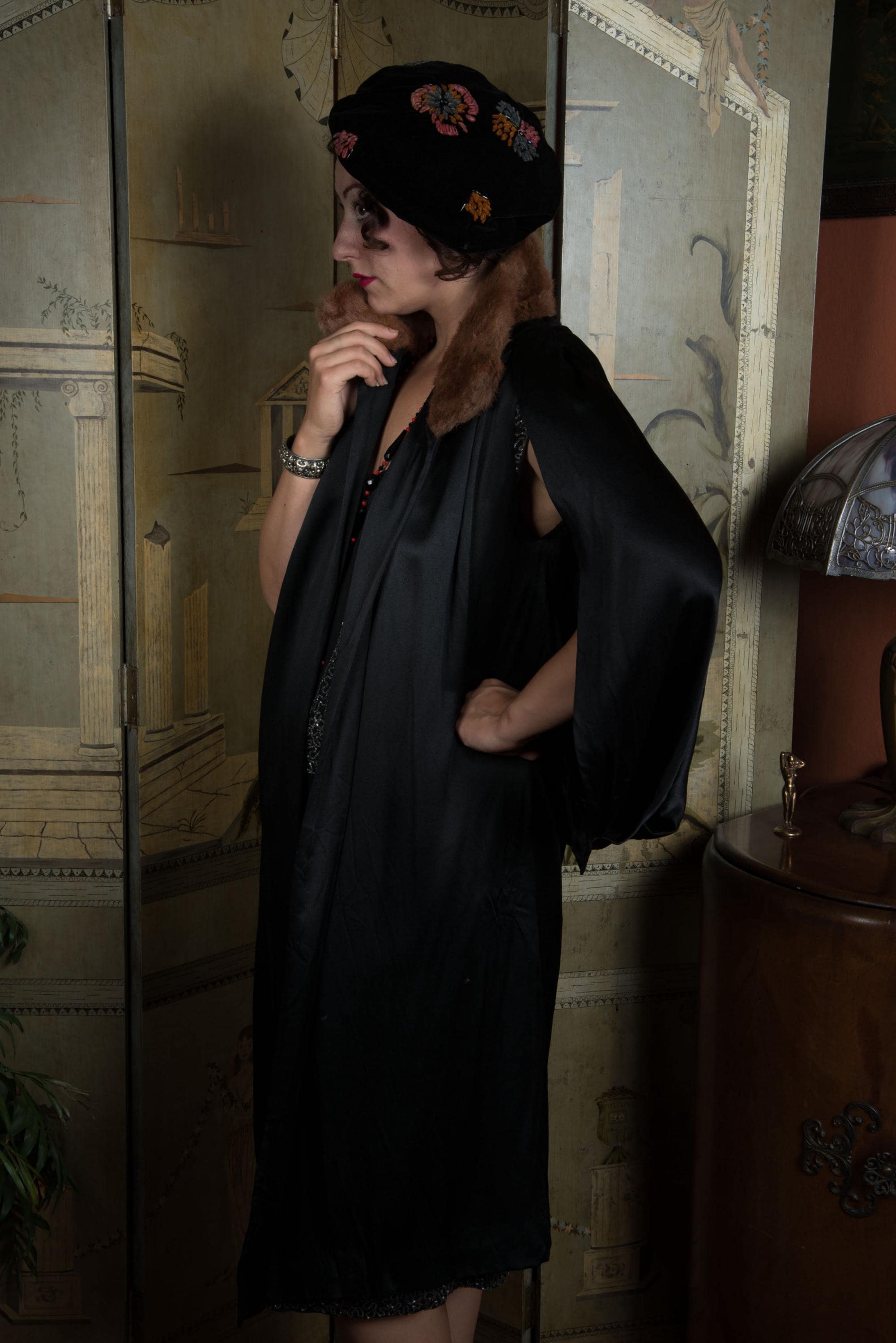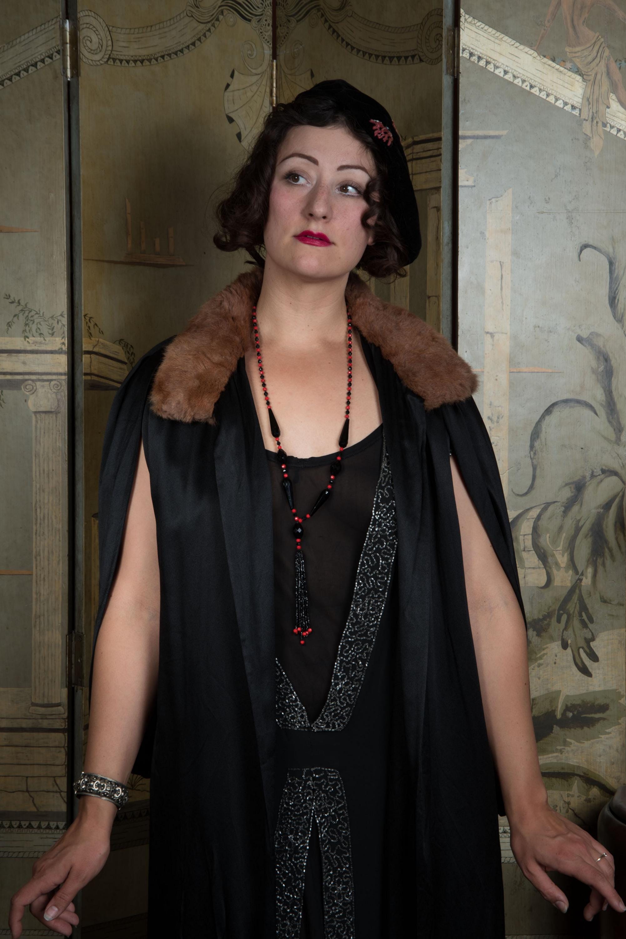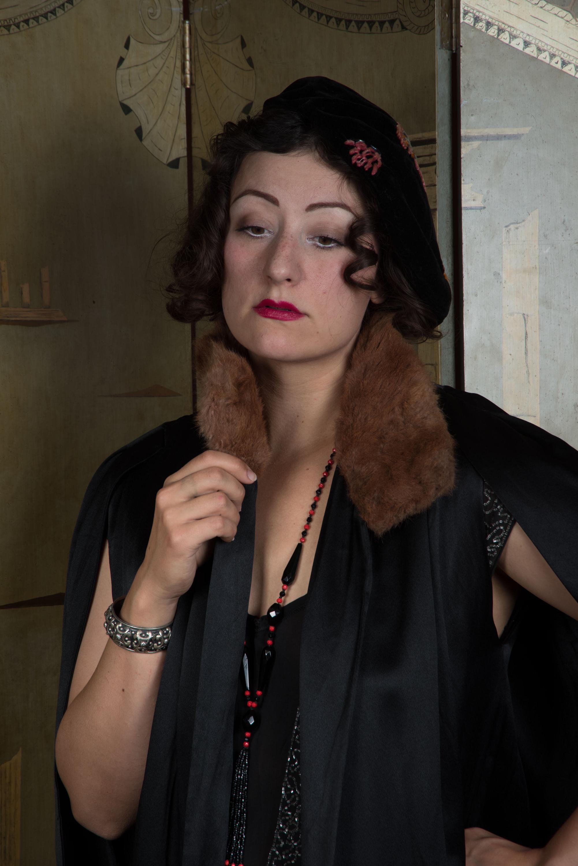 This cape has been gently hand cleaned from the shoulders down using a soaked sponge, and vinegar steamed to improve softness and gleam. The charmeuse is sleek and supple - not a hint of dryness. The crepe de chine lining has a light water line from where I had to stop, to preserve the fur collar, and is slightly dry, but still strong, not at risk for breaking - it just tends to hold wrinkles. I find no other issues to note!